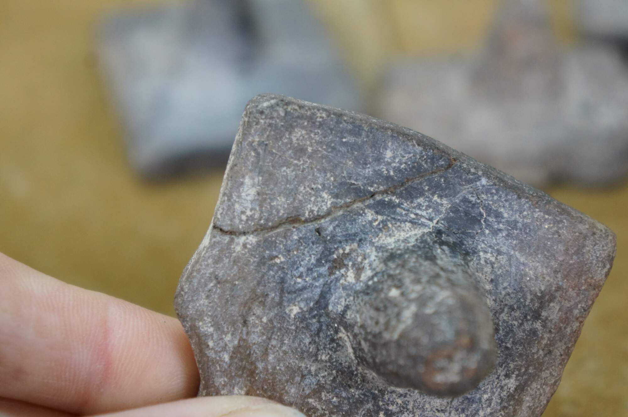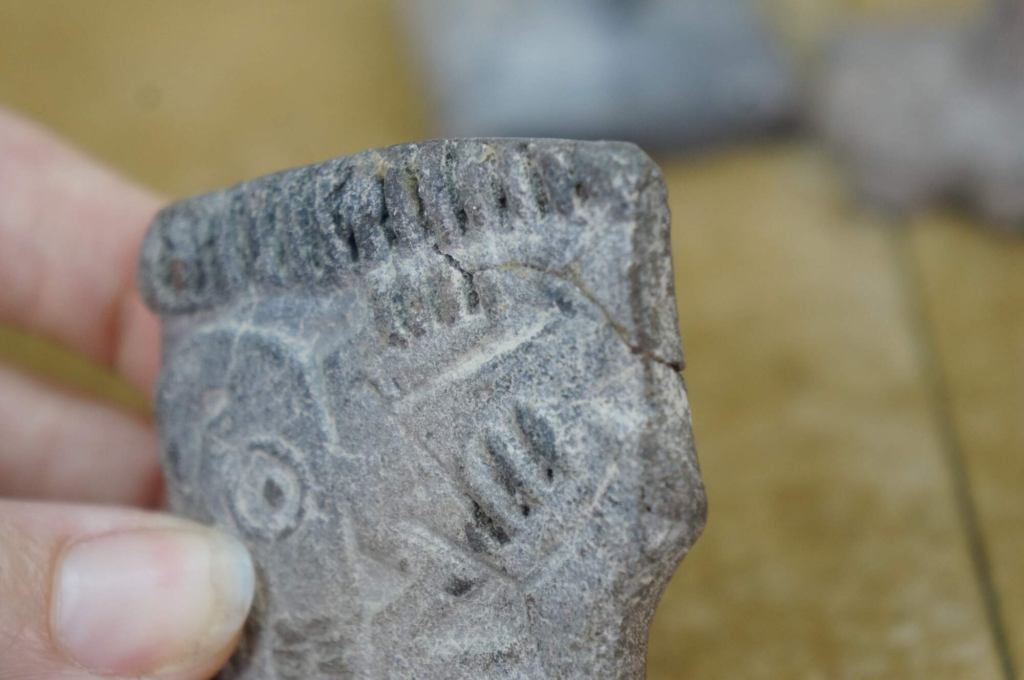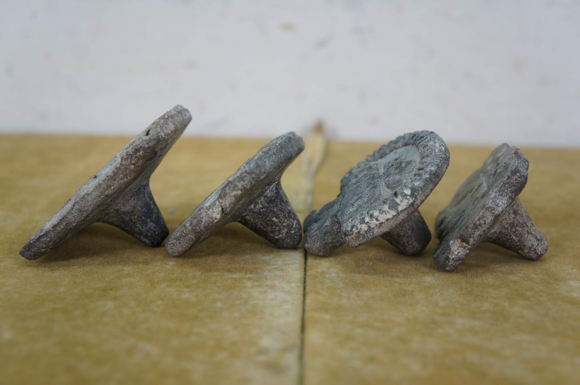 Set of four Pre-Columbian carved stone / terracotta pictoral seals or stamps. Several shapes showing a variety of Aztec / Mayan folk art figures, with handle on reverse.