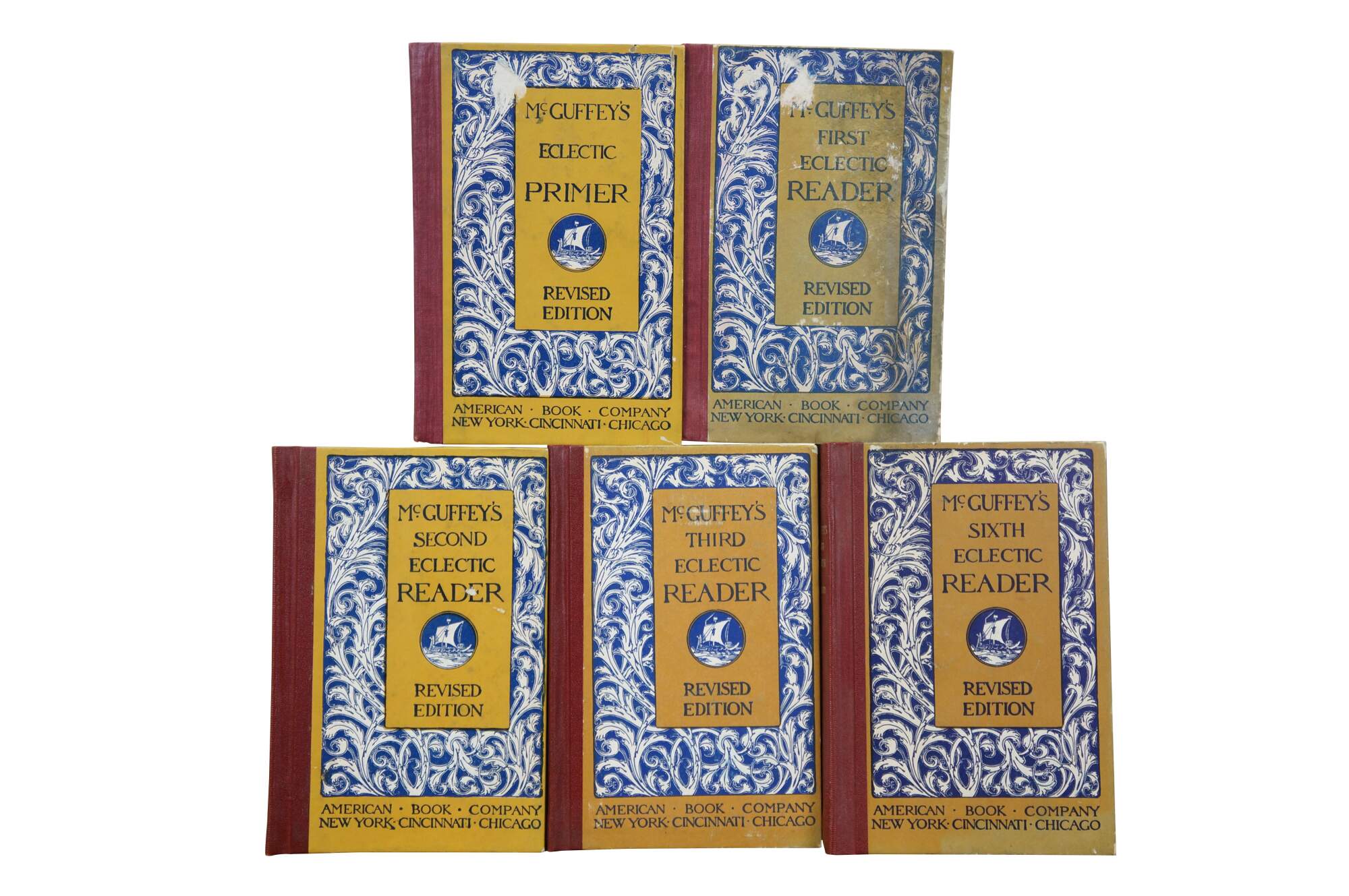 Set of five early 20th century McGuffey's Eclectic Readers, Revised Edition. Includes McGuffey's Eclectic Primer and First, Second, Third and Sixth Readers. Eclectic Educational Series. Published by the American Book Company (New York, Cincinnati, Chicago). Copyrights: 1879, 1881 by Van Antwerp, Bragg & Co. 1896 by American Book Company. 1907, 1909, 1920, 1921 by Henry H. Vail. Hard back / hard cover; blue and yellow paper bound boards; red bonded leather spine.