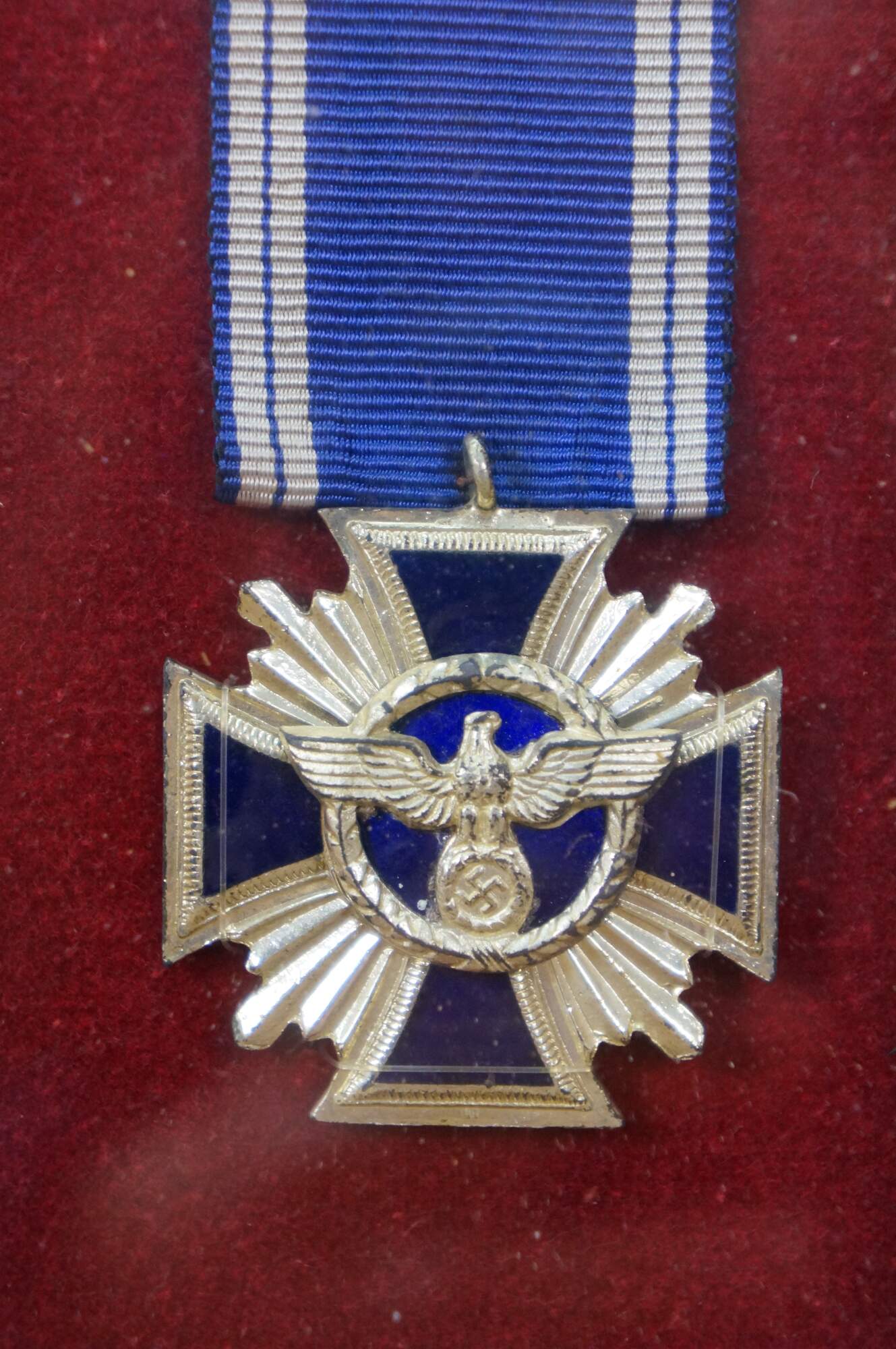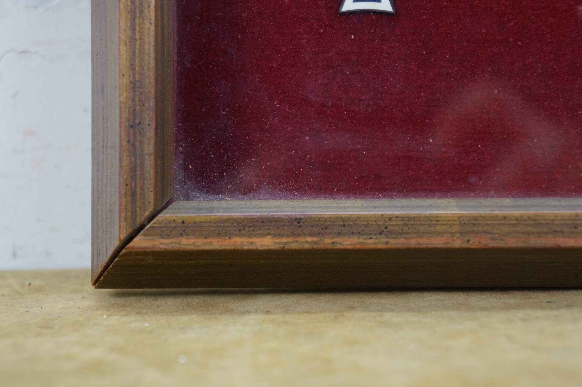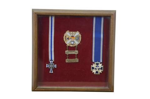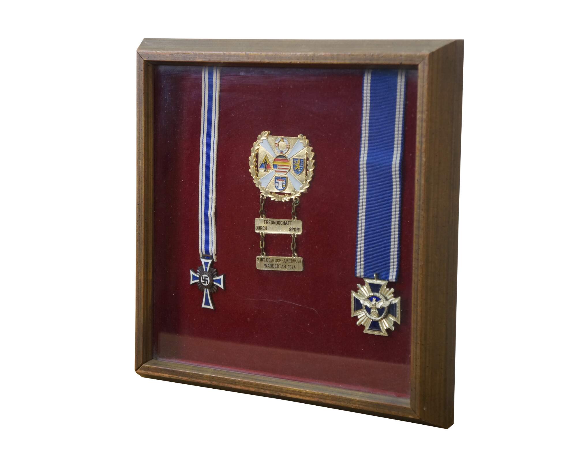 Set of three framed German medals. Right: Bronze Cross of Honour of the German Mother (German: Ehrenkreuz der Deutschen Mutter), referred to colloquially as the Mutterehrenkreuz (Mother's Cross of Honour) or simply Mutterkreuz (Mother's Cross) - a state decoration conferredbetween 1939-1945 by the government of Nazi Germany to honour a German-citizen mother for exceptional merit to the German nation. Center: Gold tone badge commemorating the 2. Int. Deutsch-Amerikan Wandertag 1974 (2nd International German-American Hiking Day 1974) - motto reads Freundschaft Durch Sport (Friendship Through Sport). Left: NSDAP Silver Second Class / 15 Years of Service Award, issued in 1939. Beveled wood shadowbox, red velvet interior, glass front. Framed in 1974.