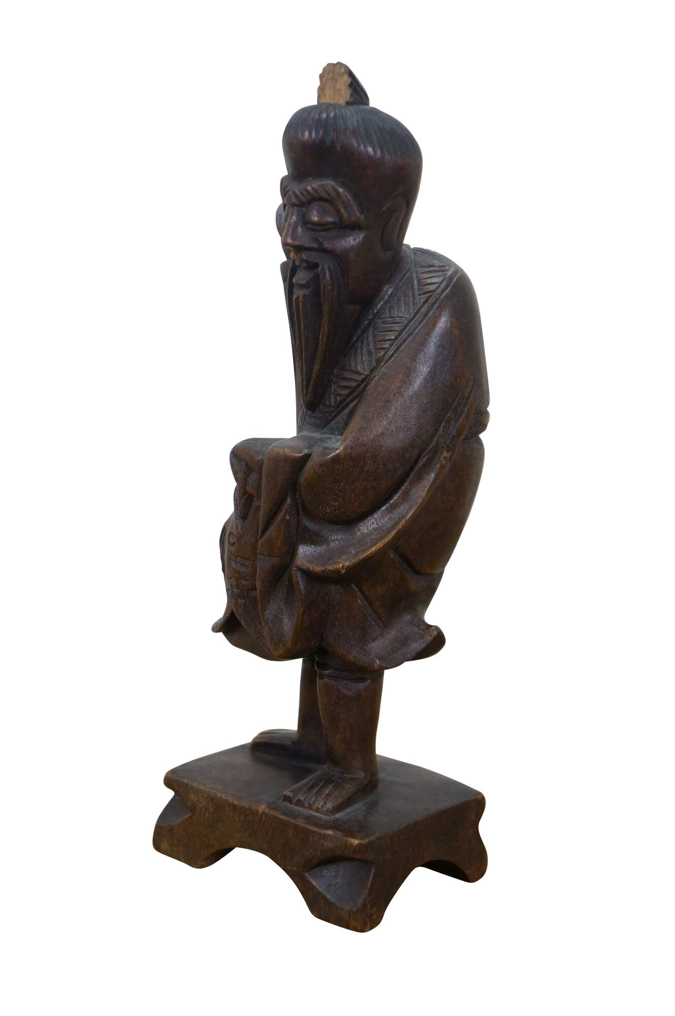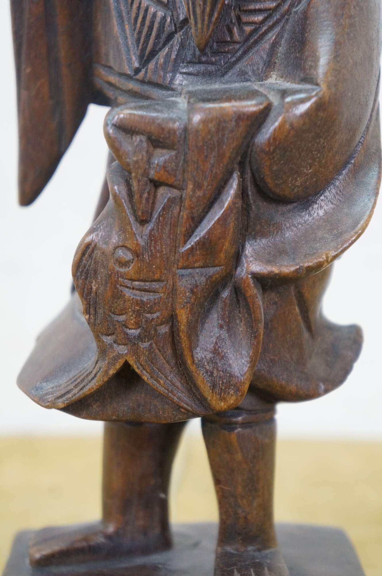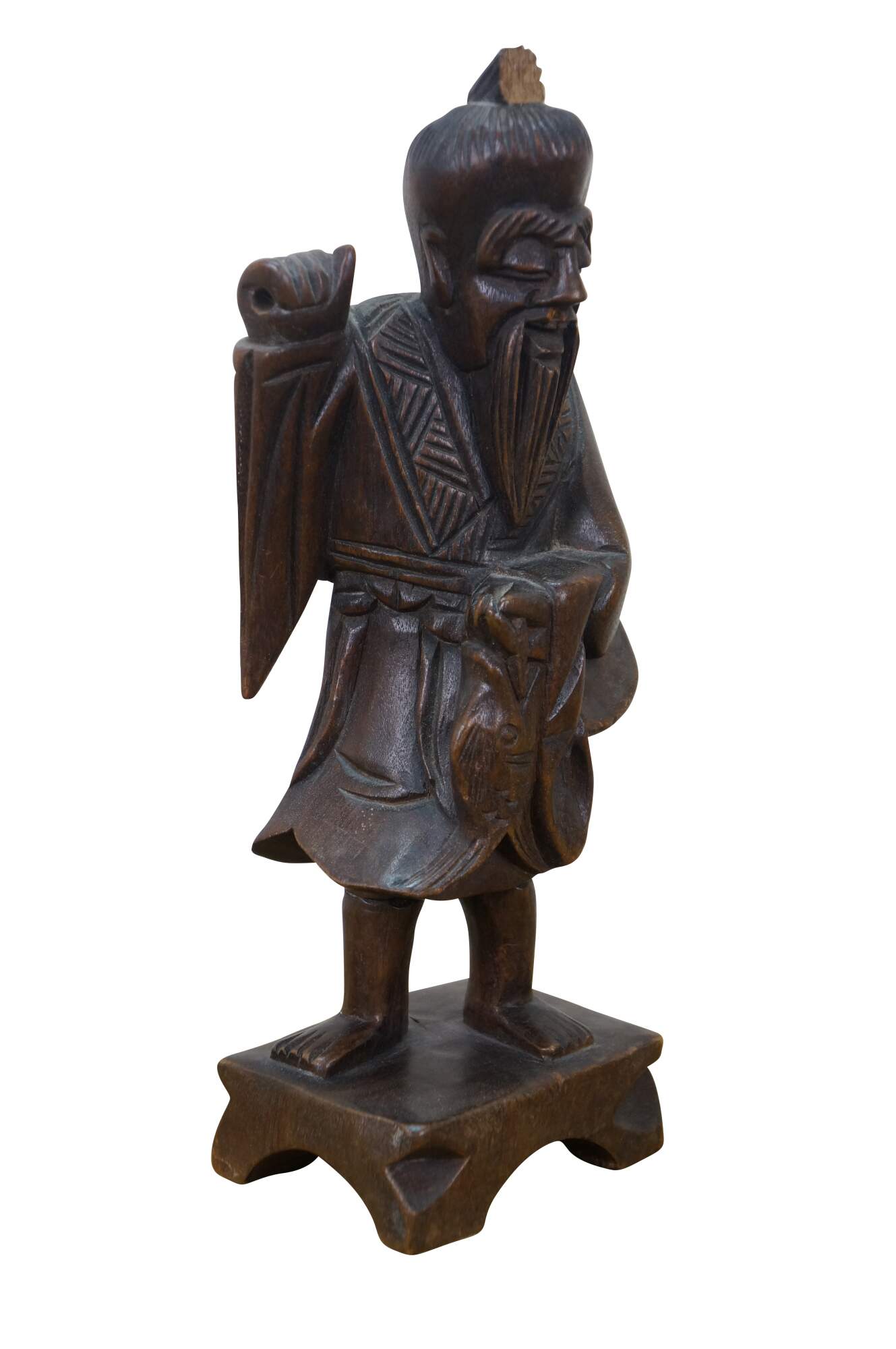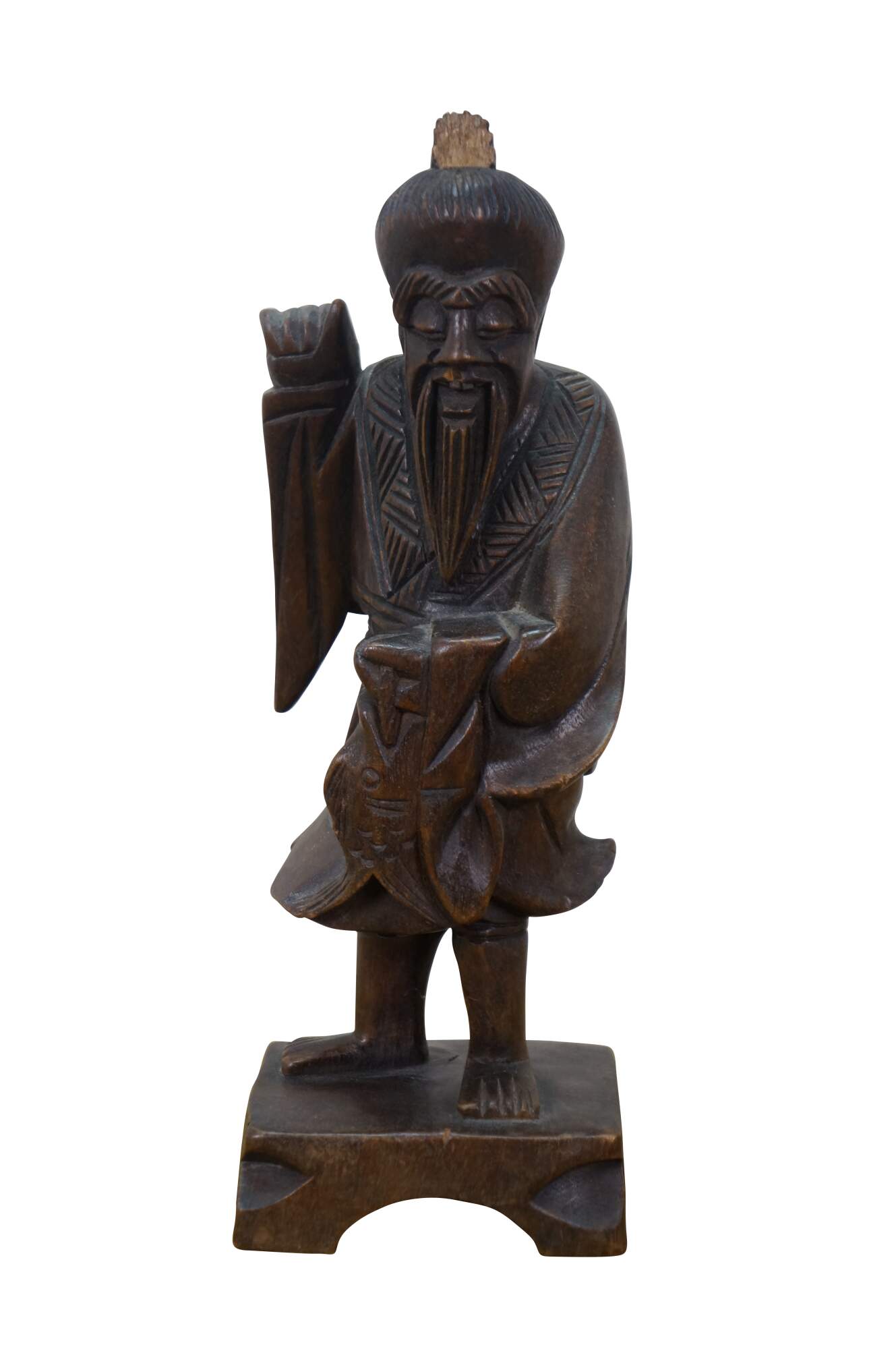 Vintage 20th century hand carved Chinese wooden figurine in the shape of a fisherman carrying a fish, standing on a rectangular plinth. One hand raised to lean a fishing pole across his shoulders (pole missing).