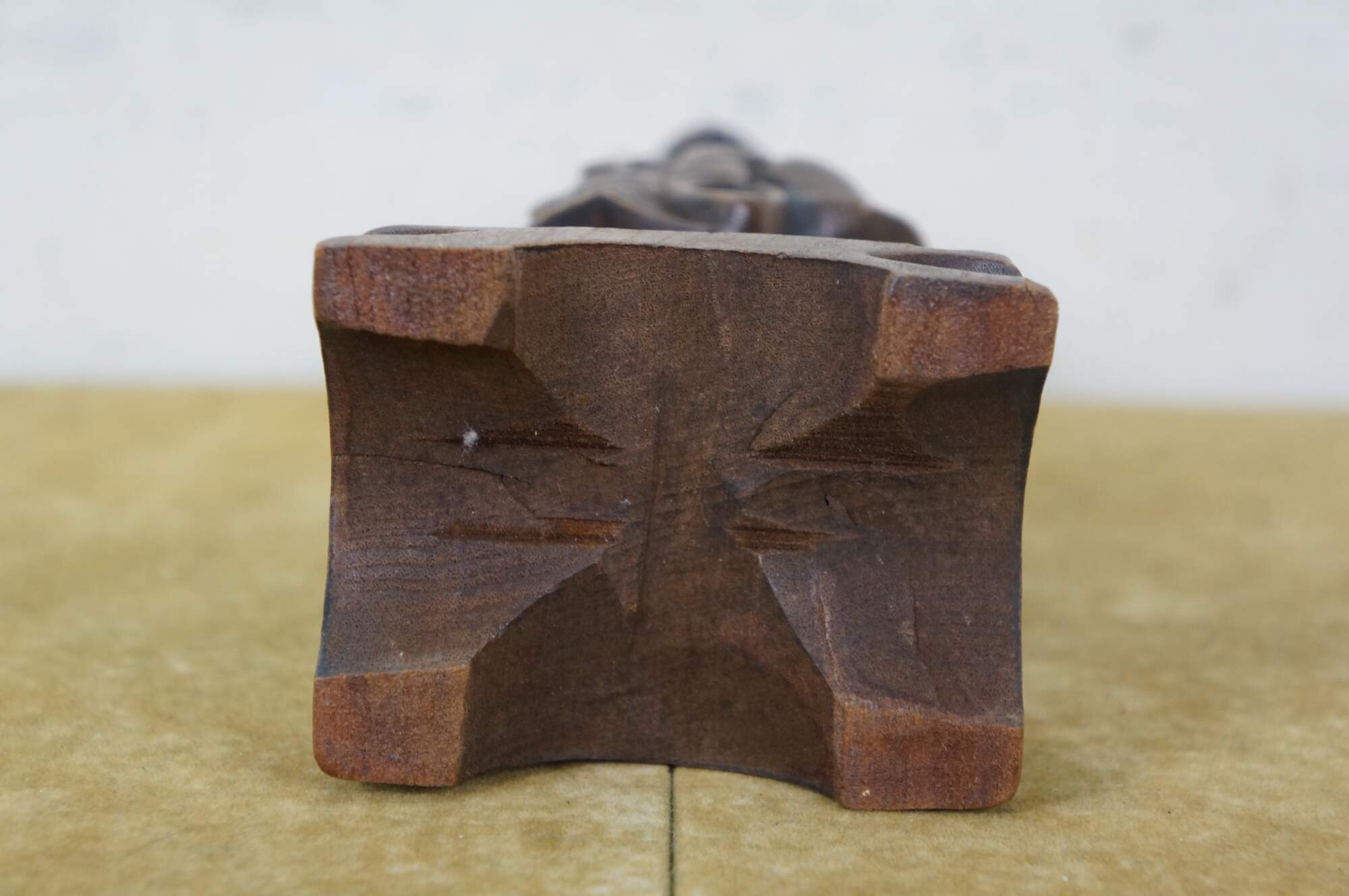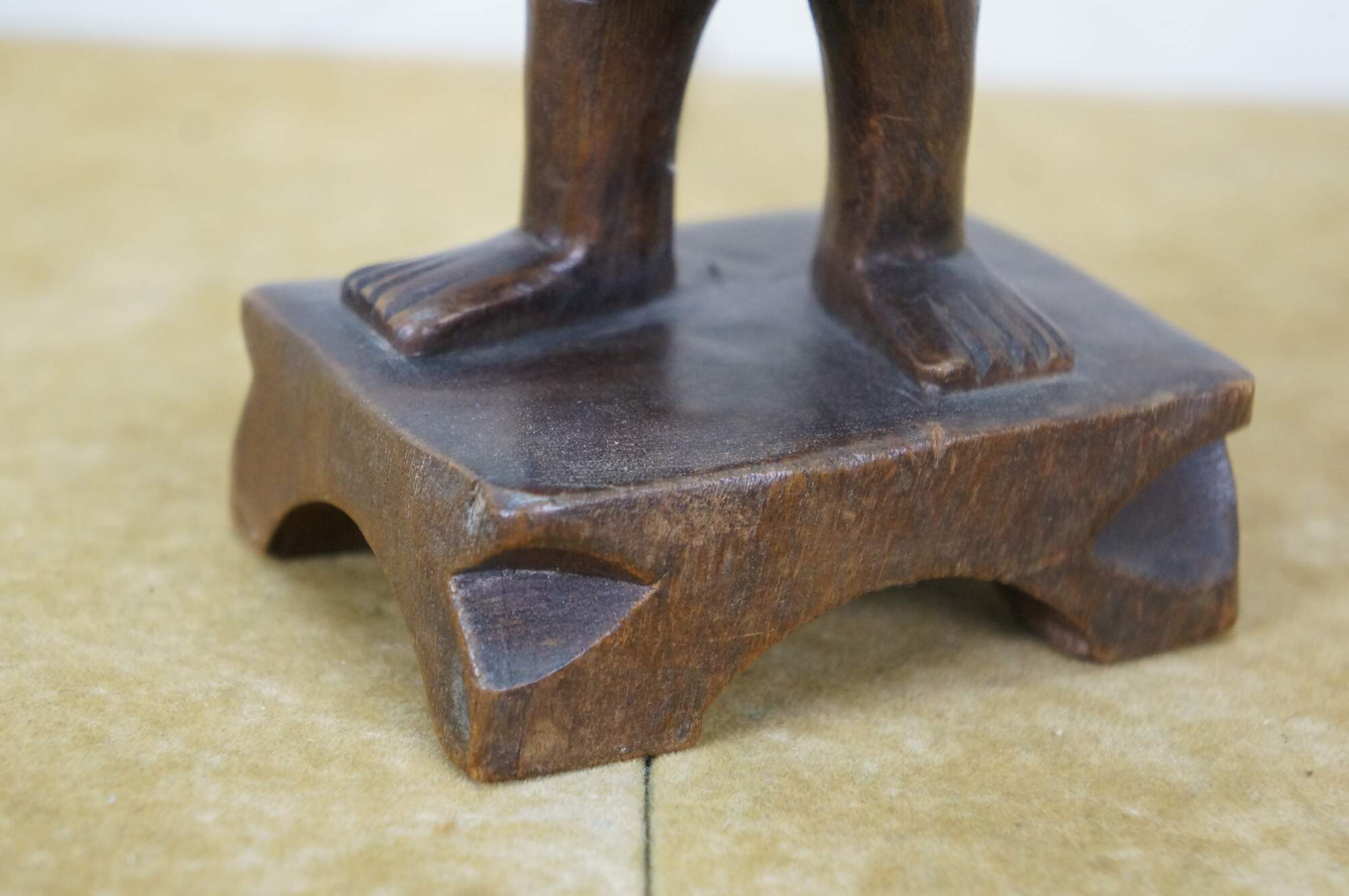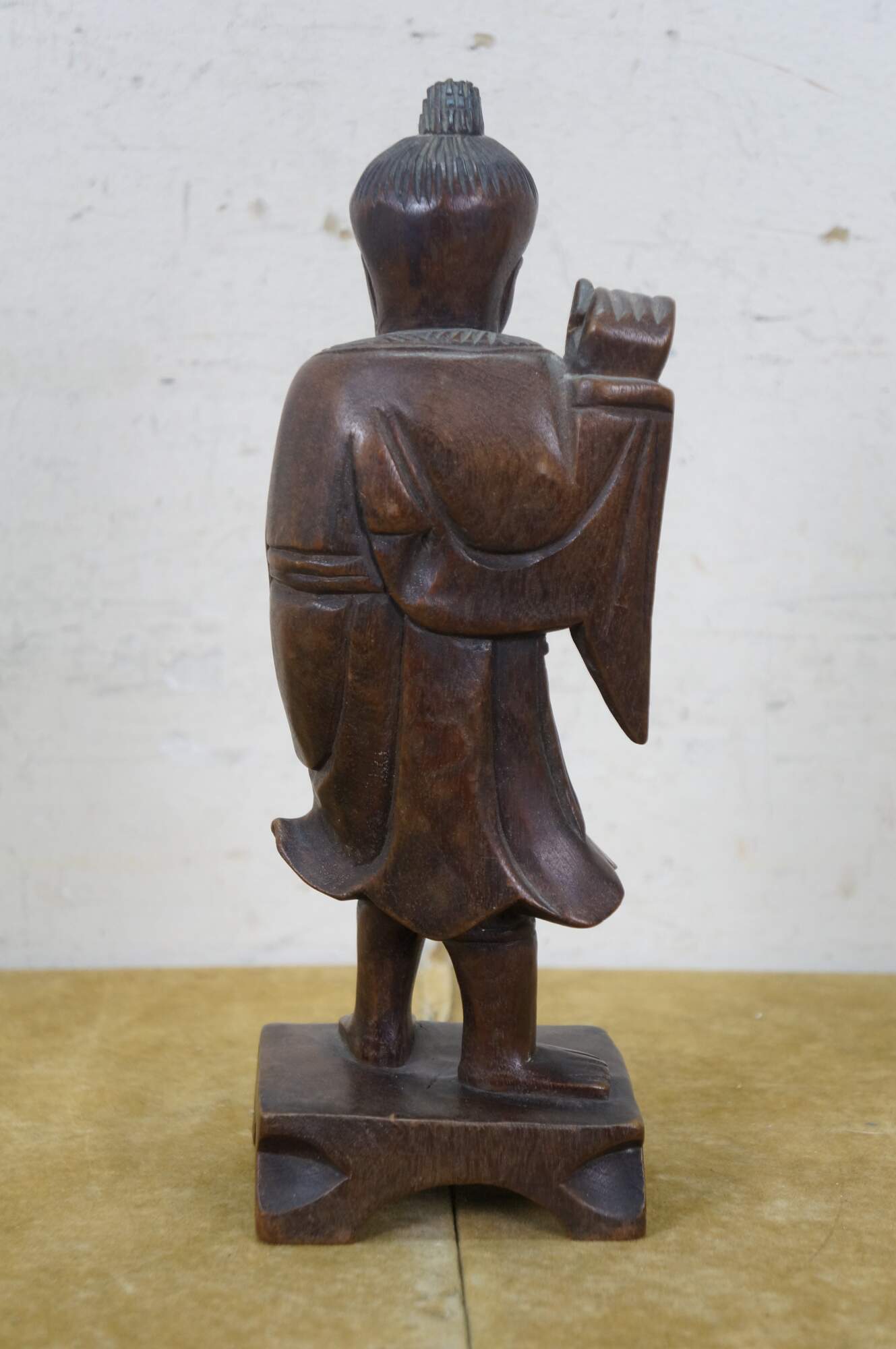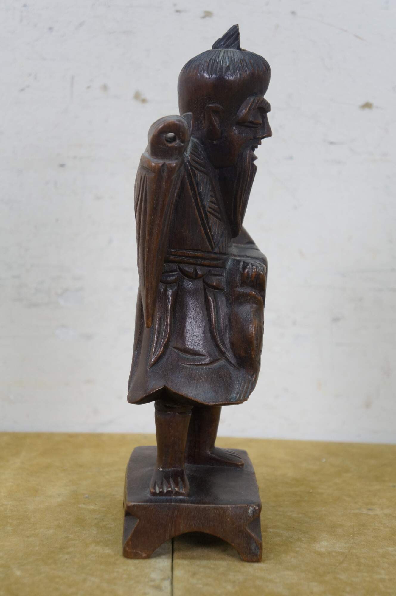 Vintage 20th century hand carved Chinese wooden figurine in the shape of a fisherman carrying a fish, standing on a rectangular plinth. One hand raised to lean a fishing pole across his shoulders (pole missing).