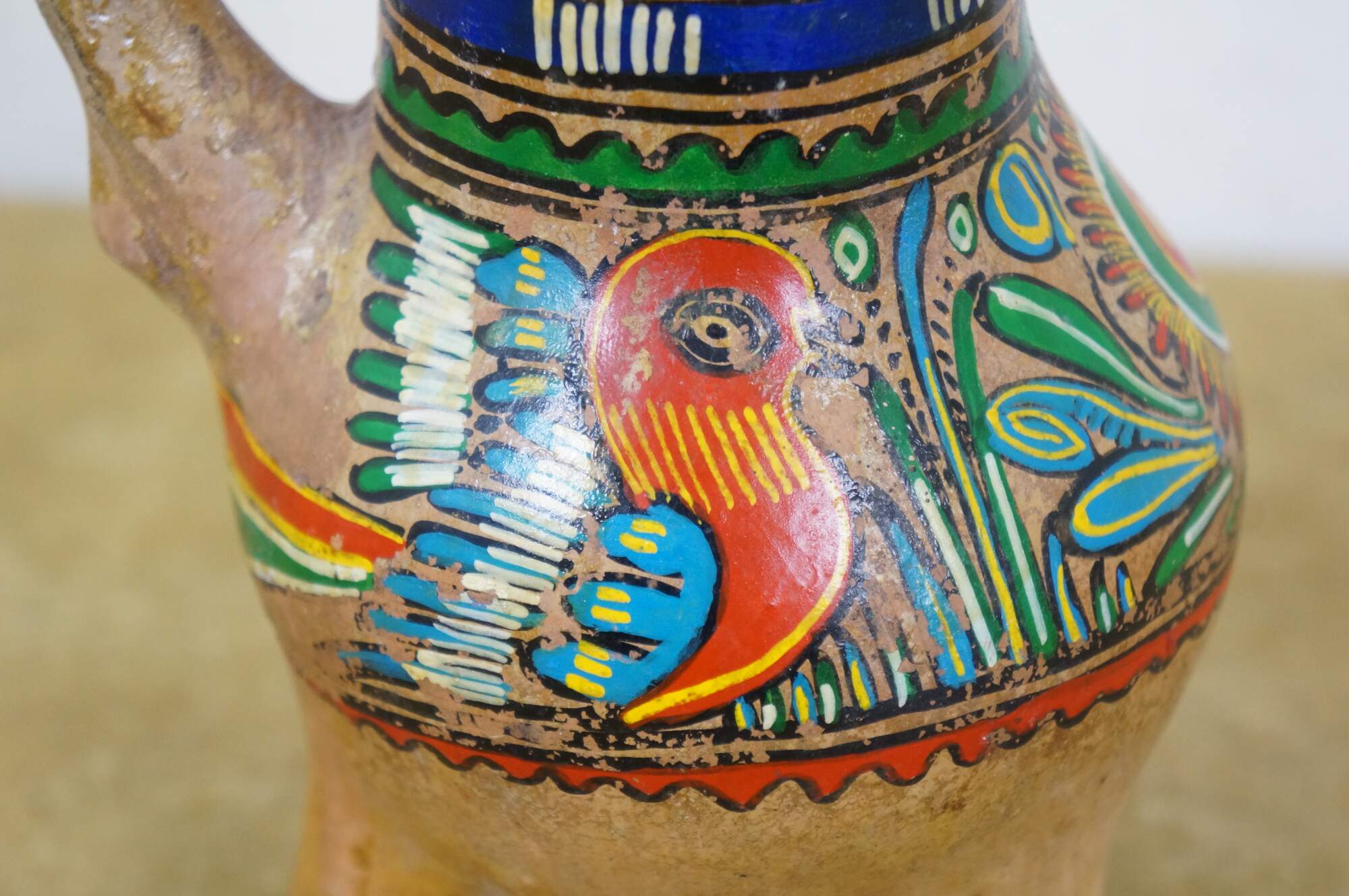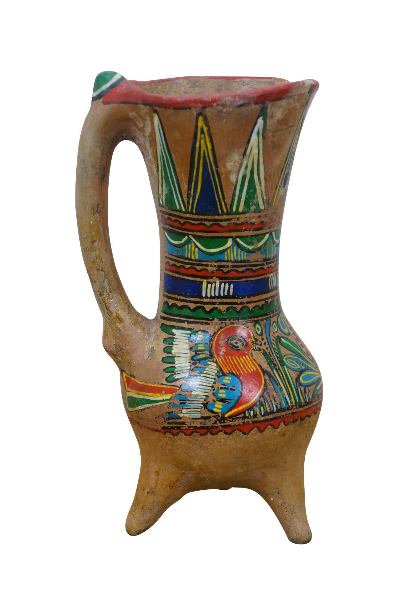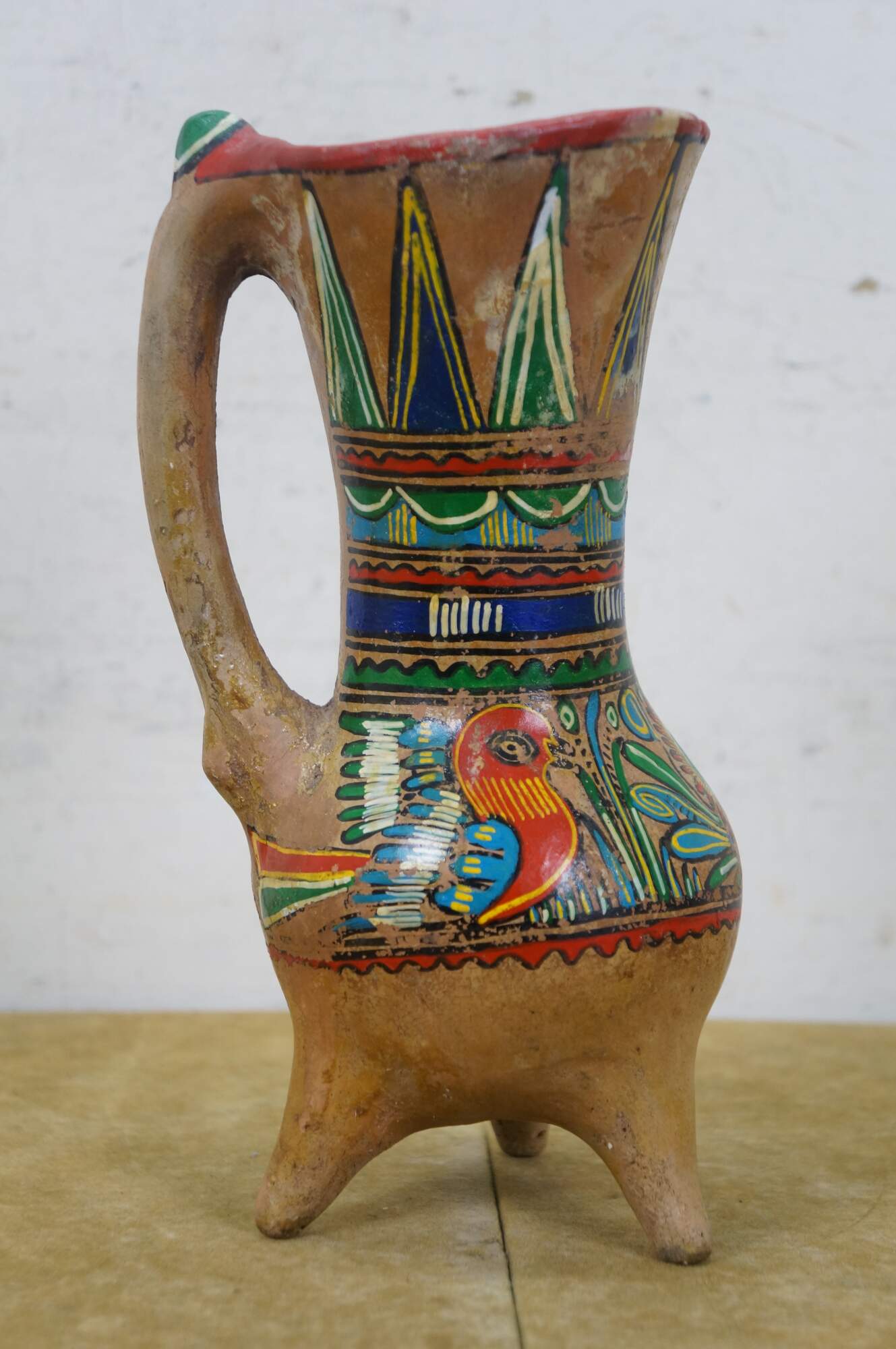 Vintage 20th century Mexican folk art style pulque agave pitcher / water jug. Brown terracotta earthenware pottery with tripod footed base and long handle, hand painted with polychrome birds and geometric patterns.