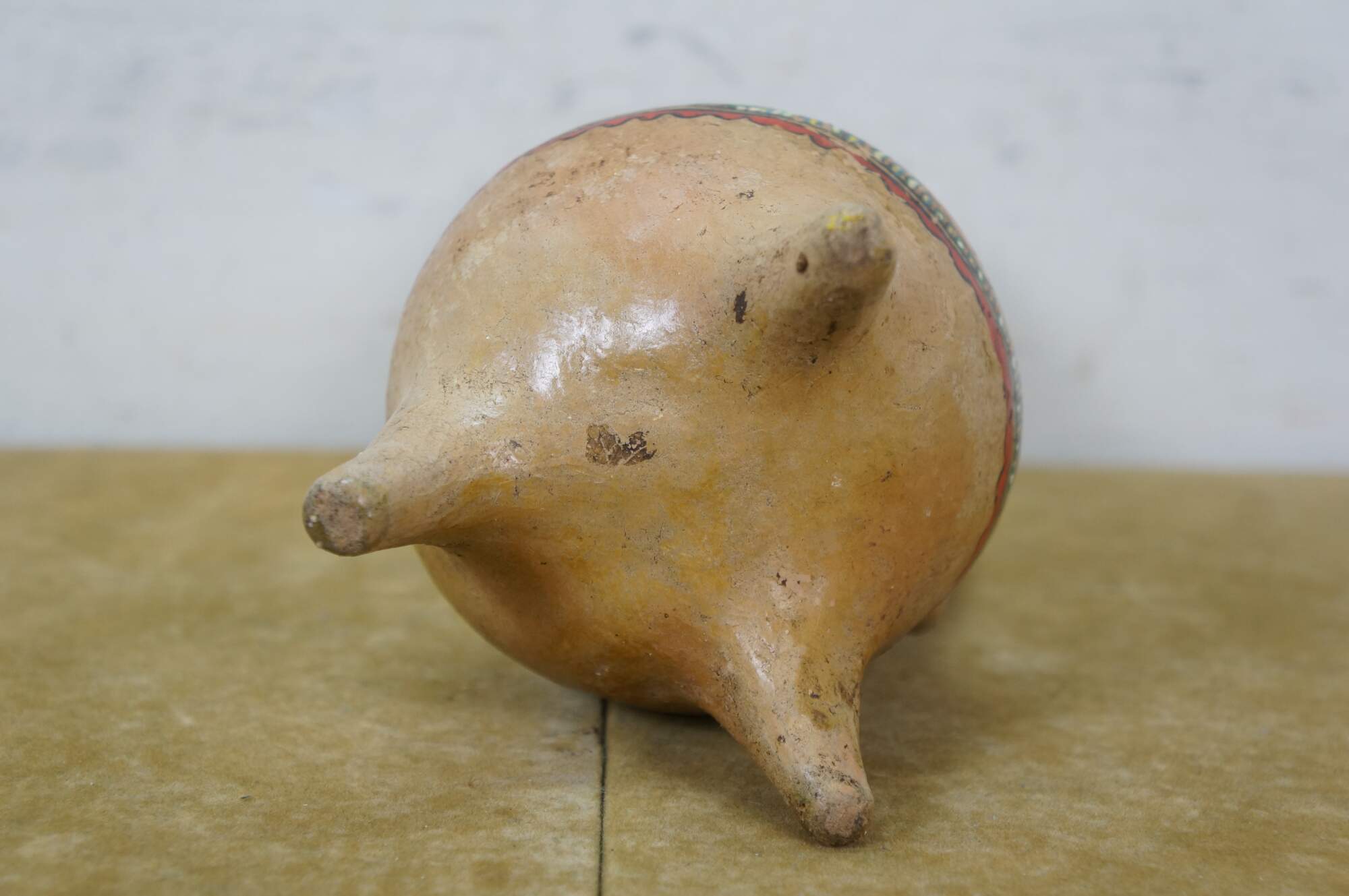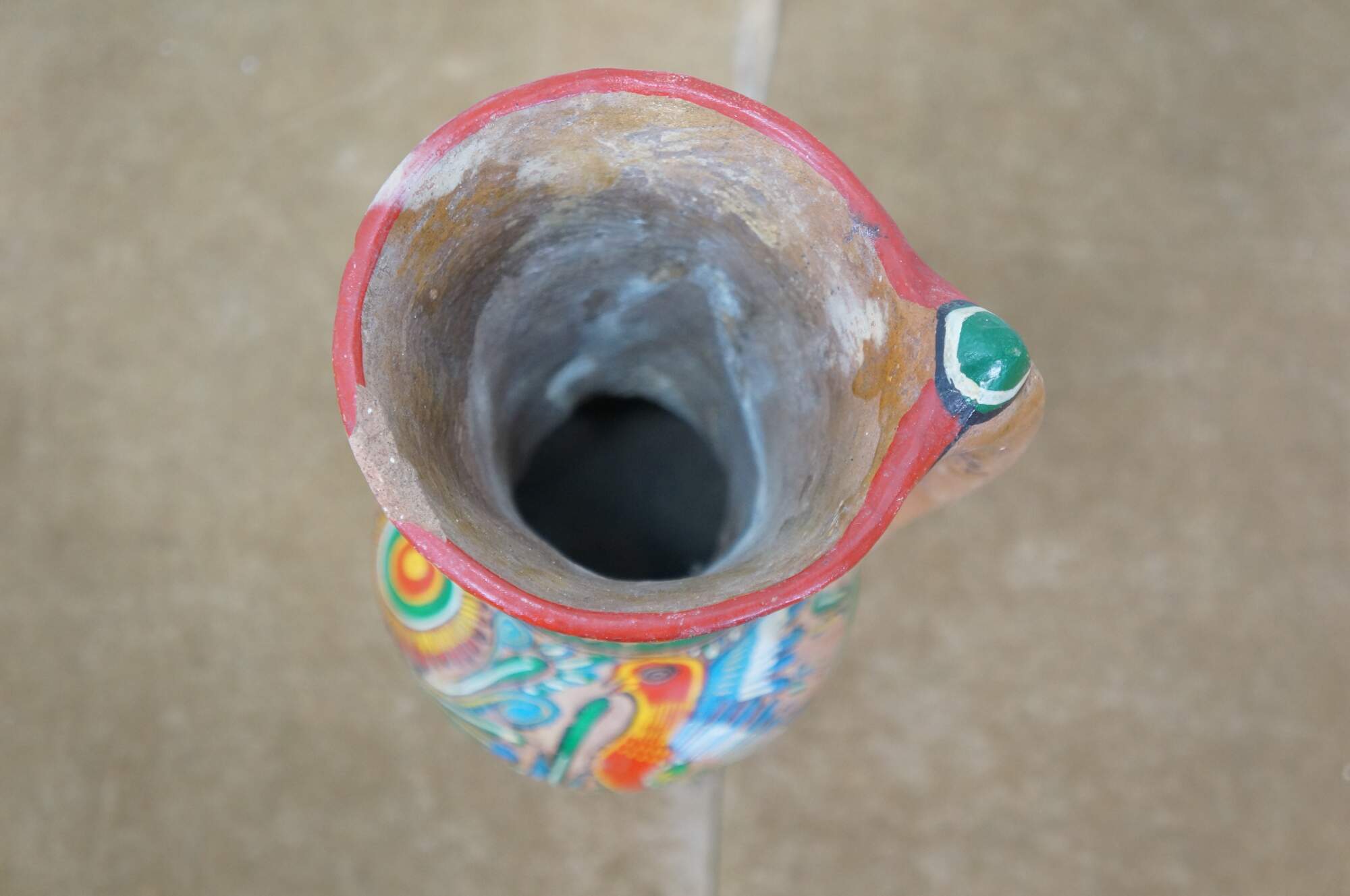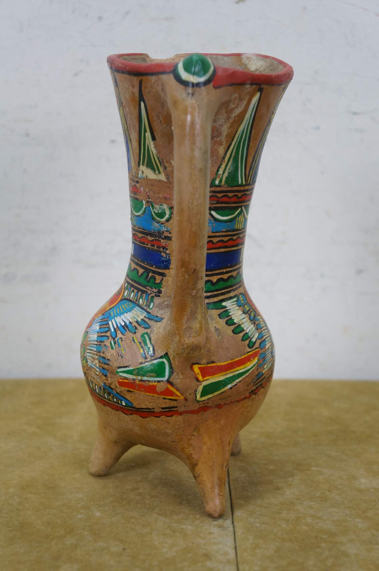 Vintage 20th century Mexican folk art style pulque agave pitcher / water jug. Brown terracotta earthenware pottery with tripod footed base and long handle, hand painted with polychrome birds and geometric patterns.