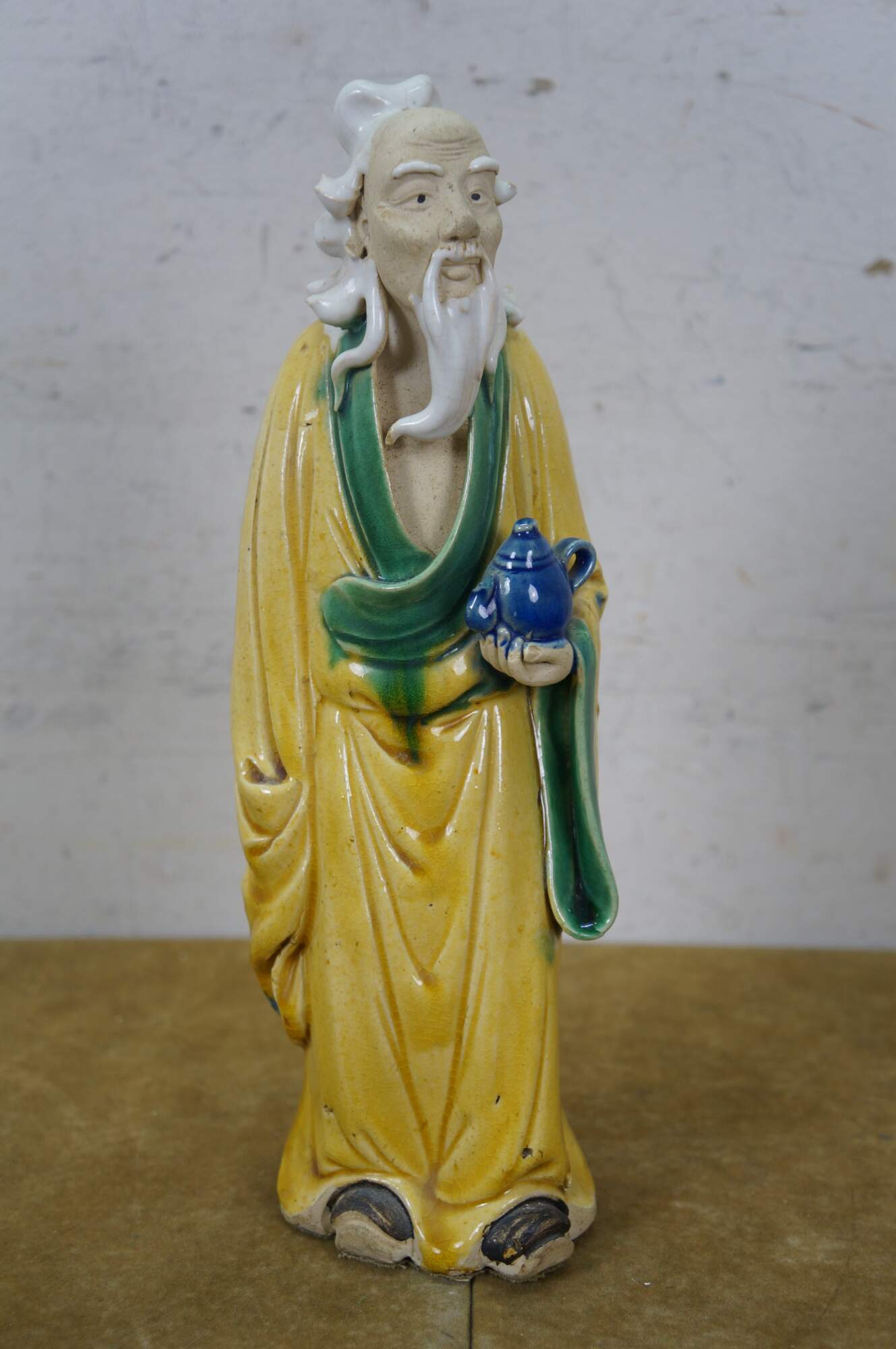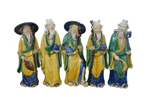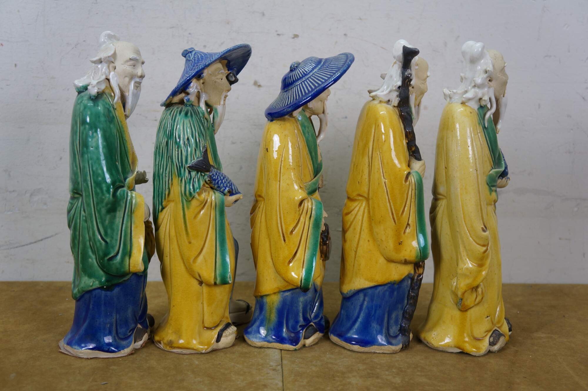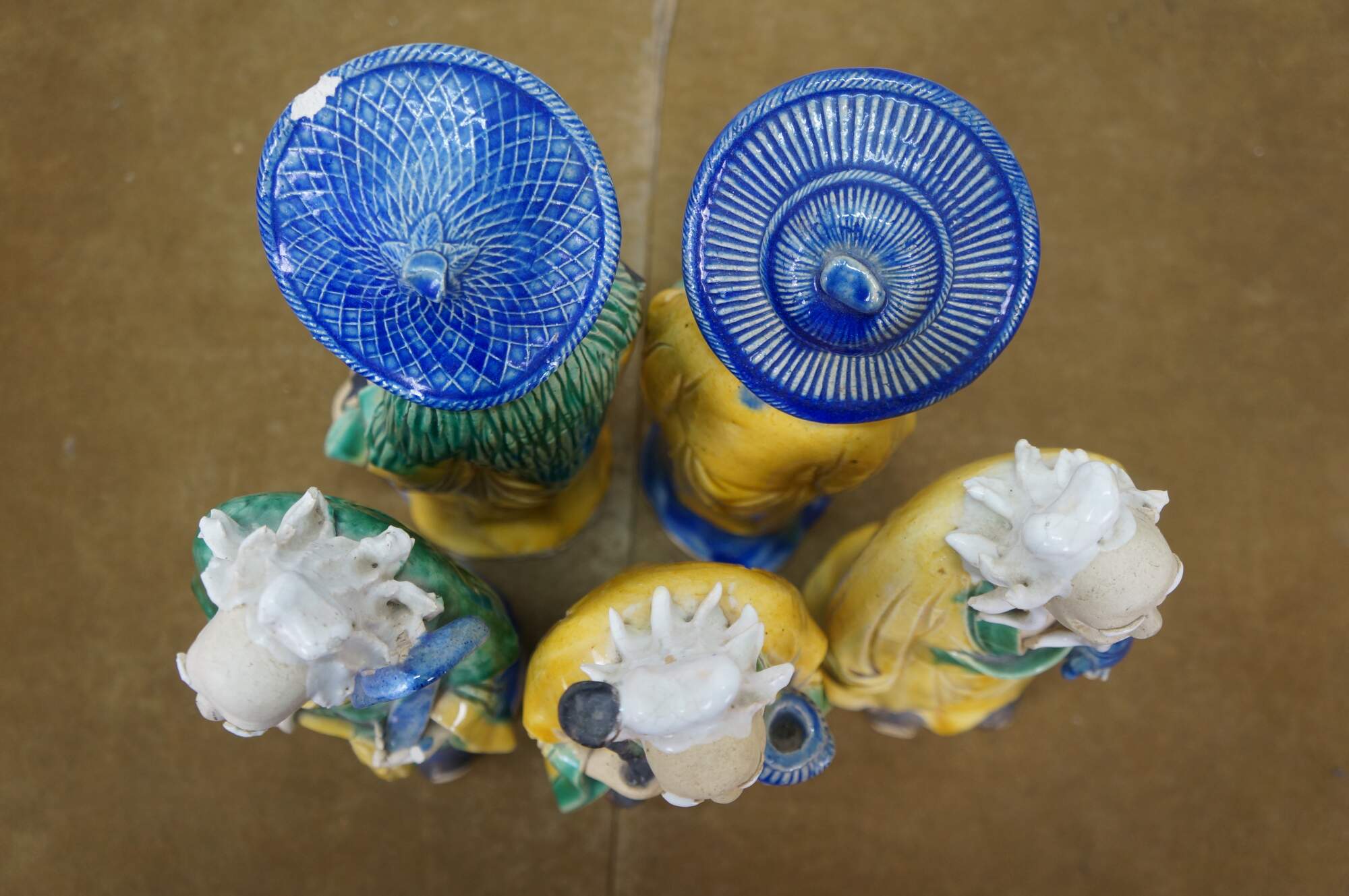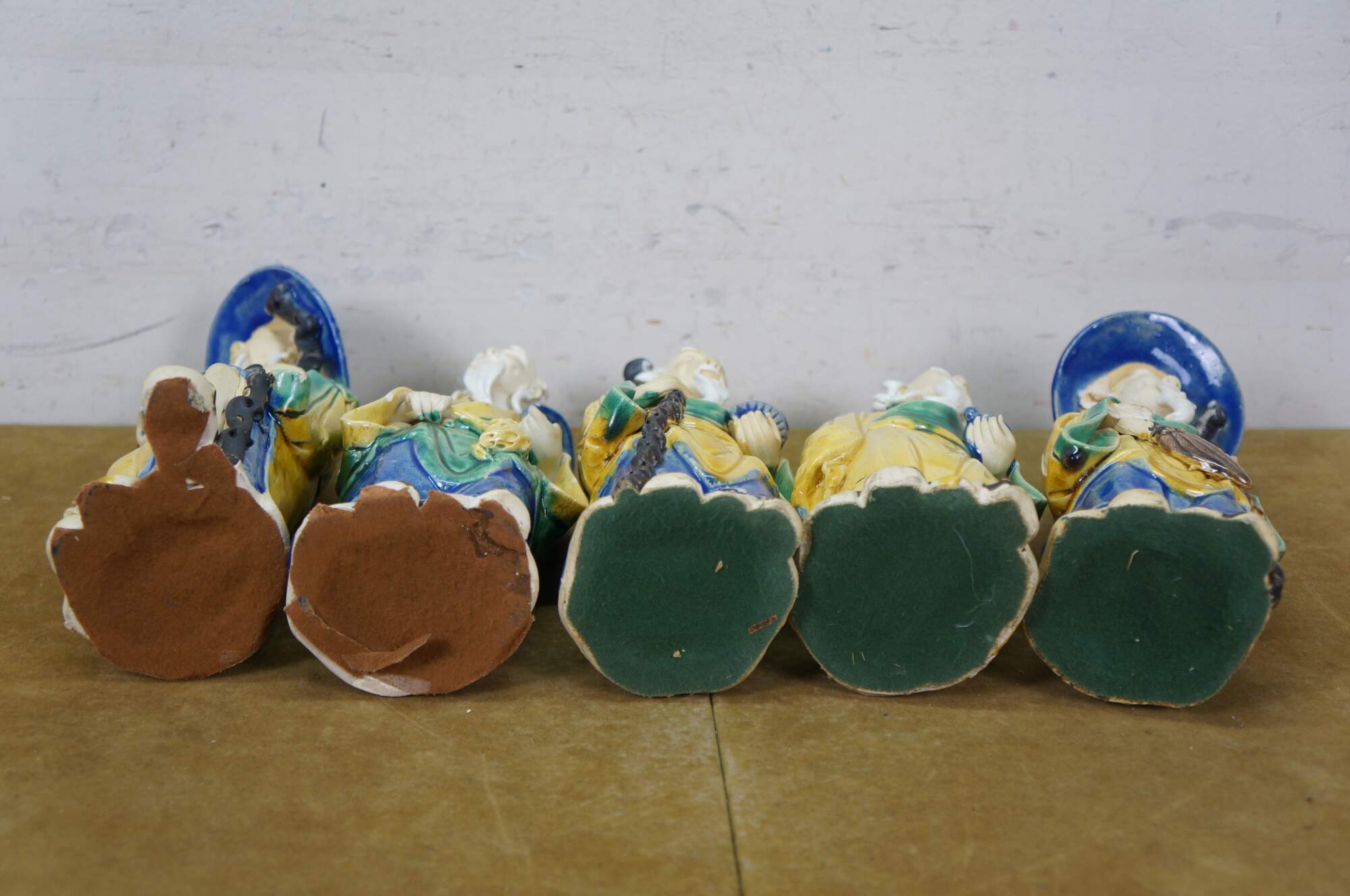 Set of 5 vintage 20th century Chinese ceramic "mud man" figurines. Wise looking men with long white hair, dressed in yellow, green, and blue glazed robes and hats, holding a variety of objects including staffs, a fan, pottery, and a fish.