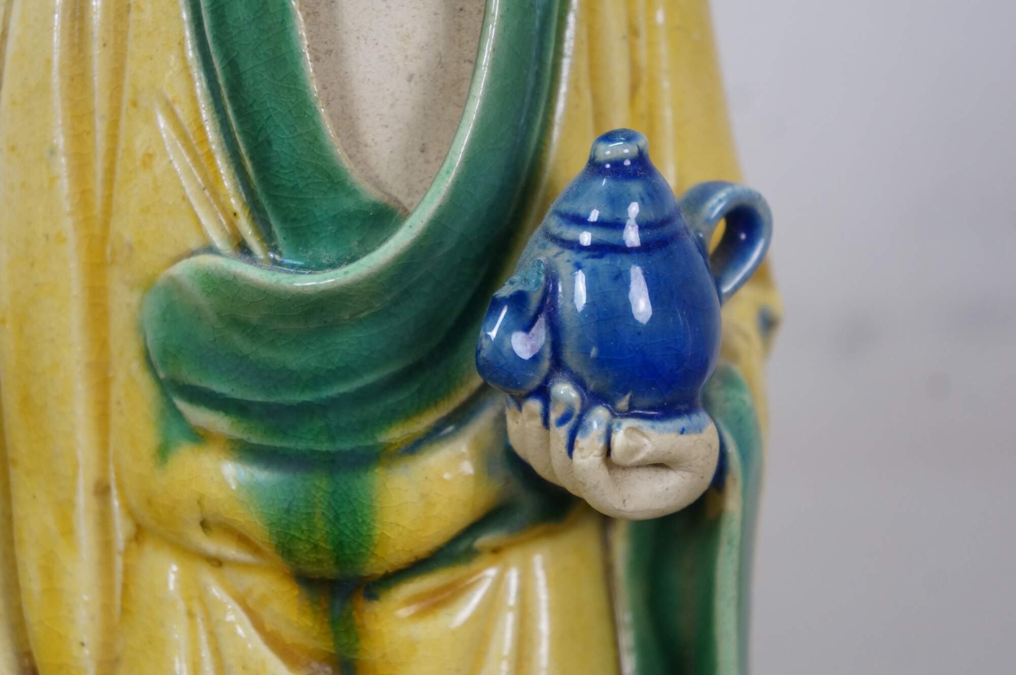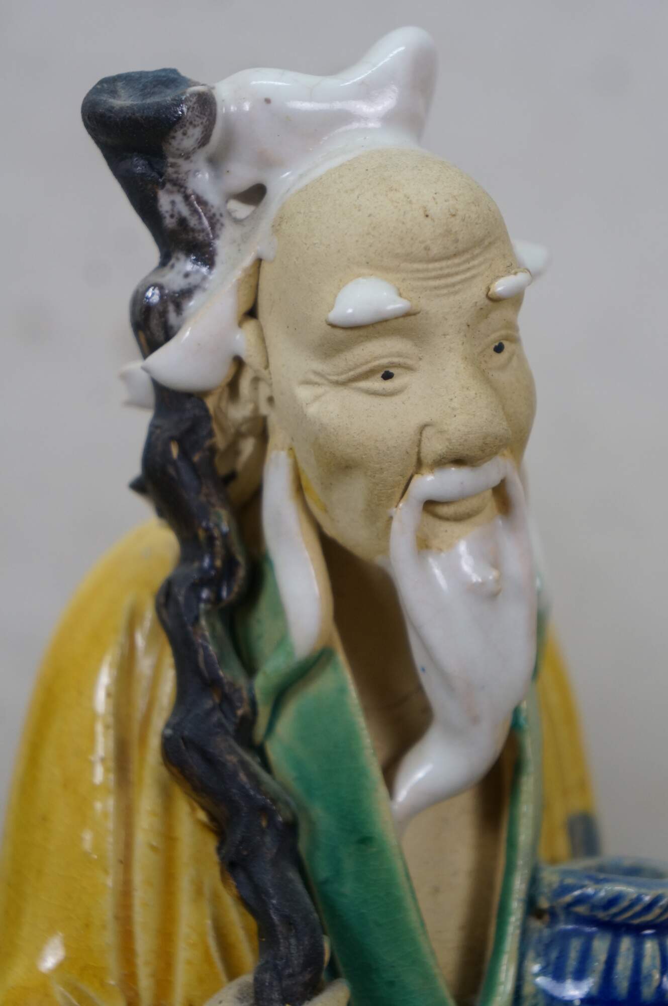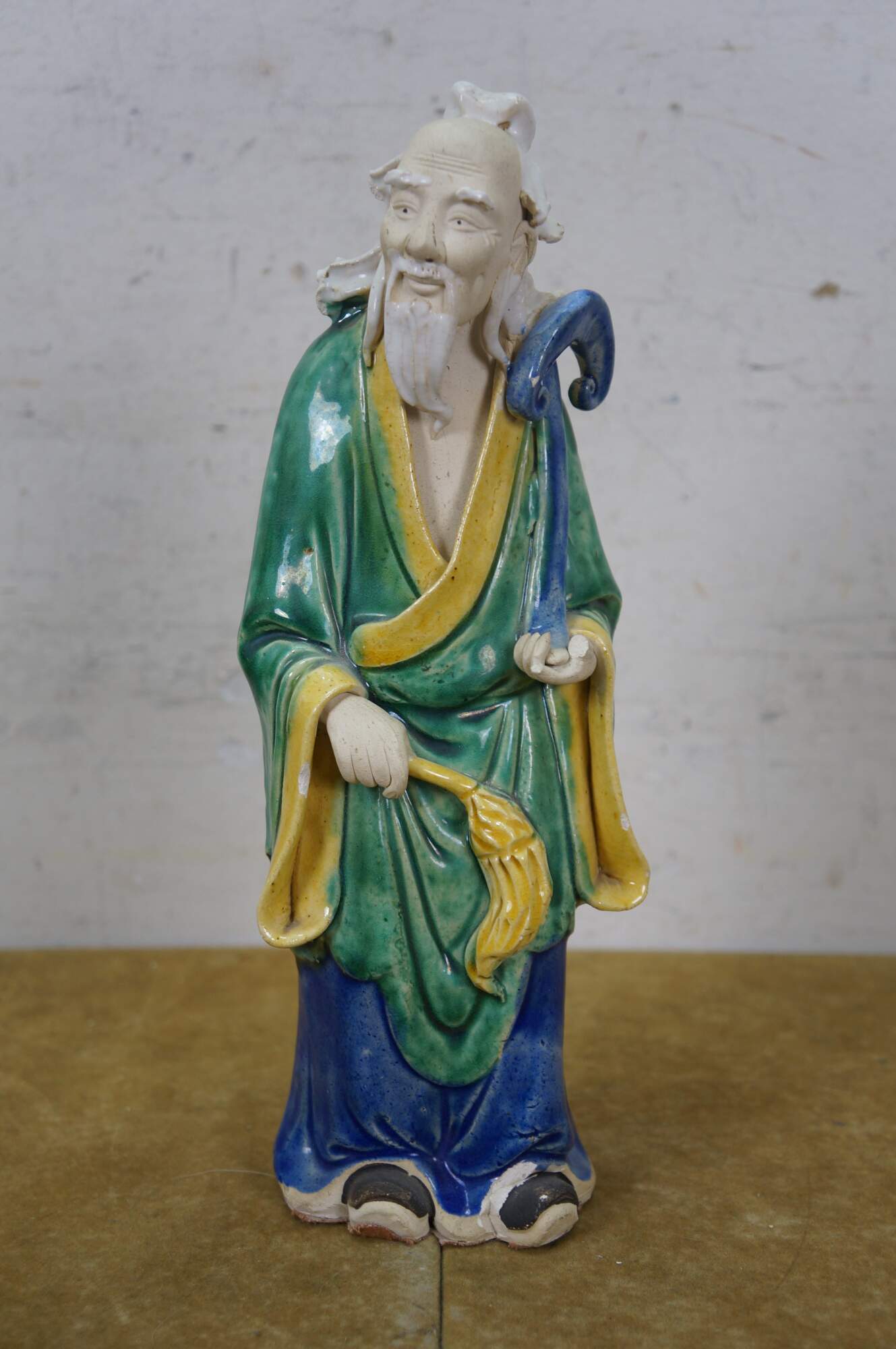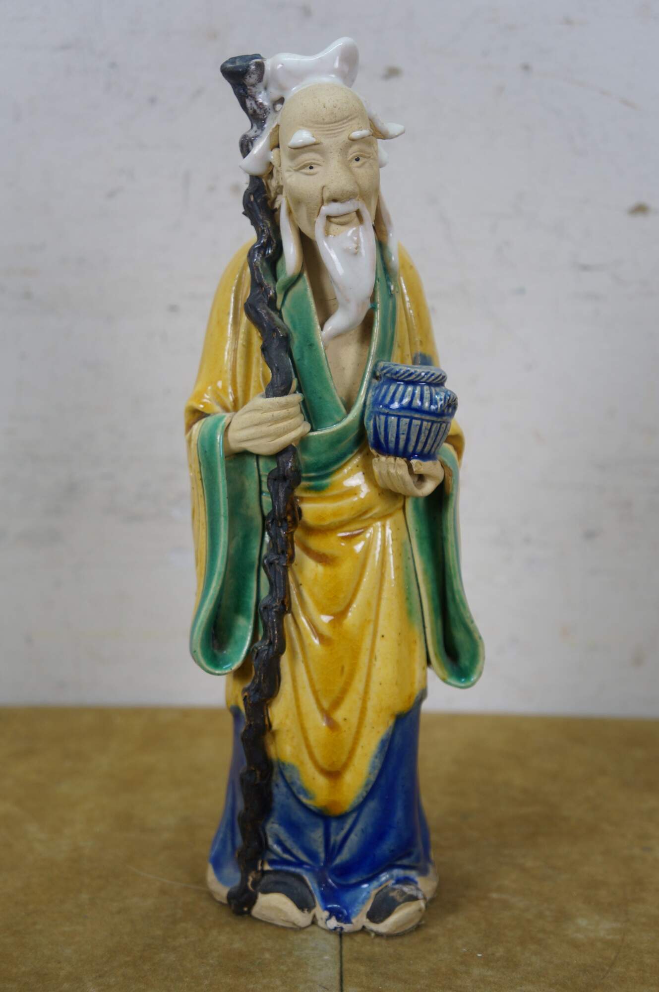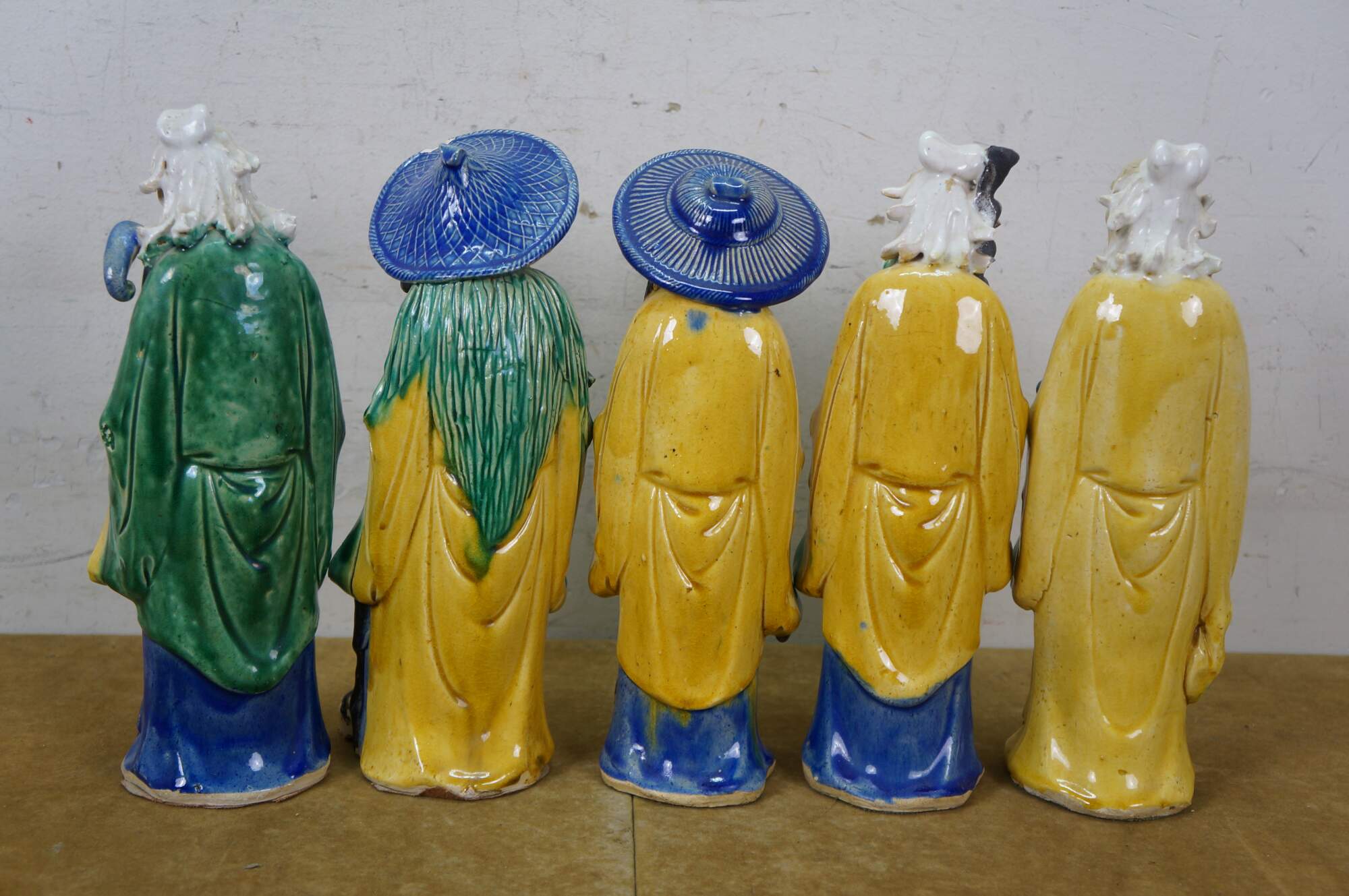 Set of 5 vintage 20th century Chinese ceramic "mud man" figurines. Wise looking men with long white hair, dressed in yellow, green, and blue glazed robes and hats, holding a variety of objects including staffs, a fan, pottery, and a fish.