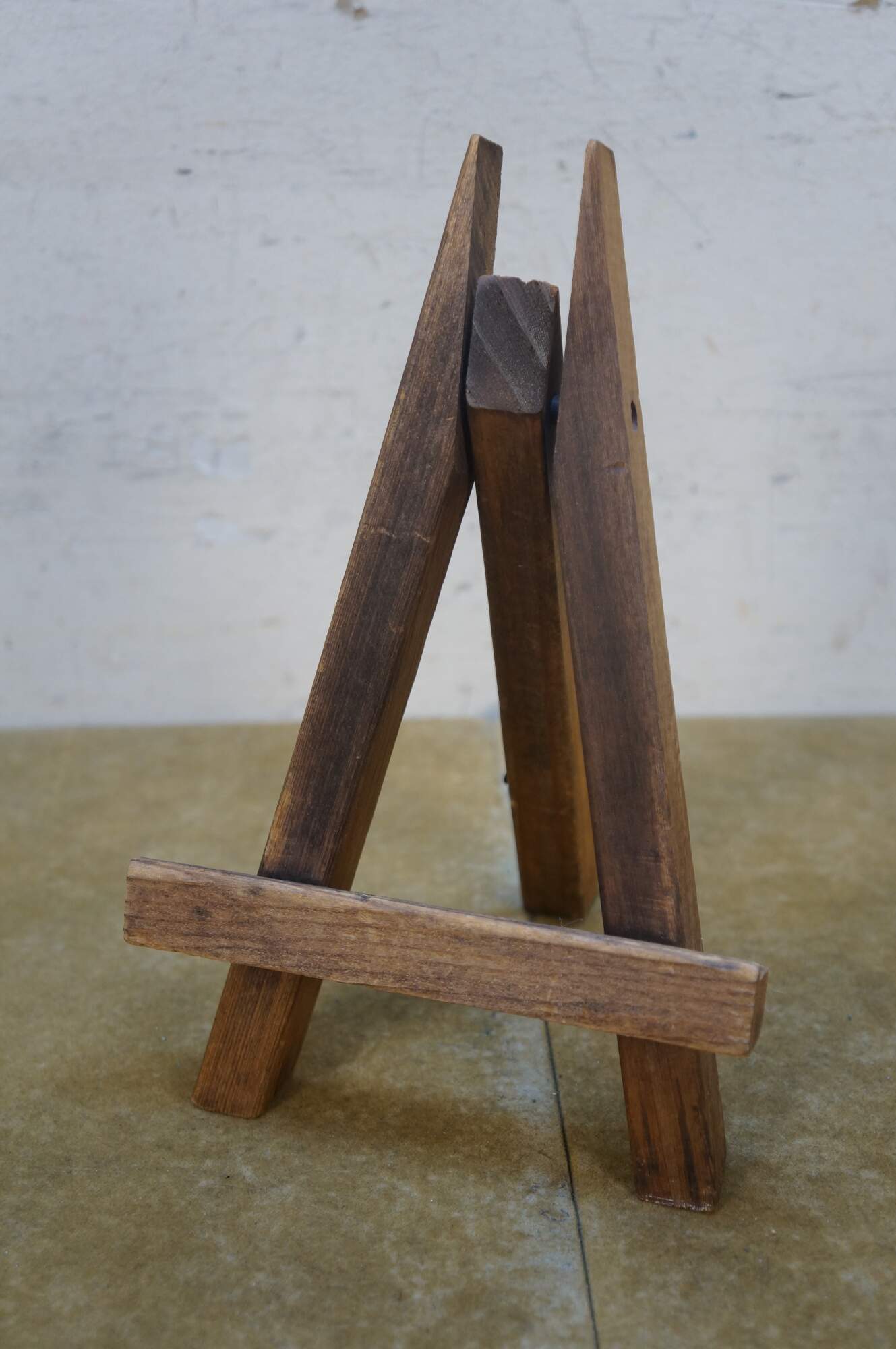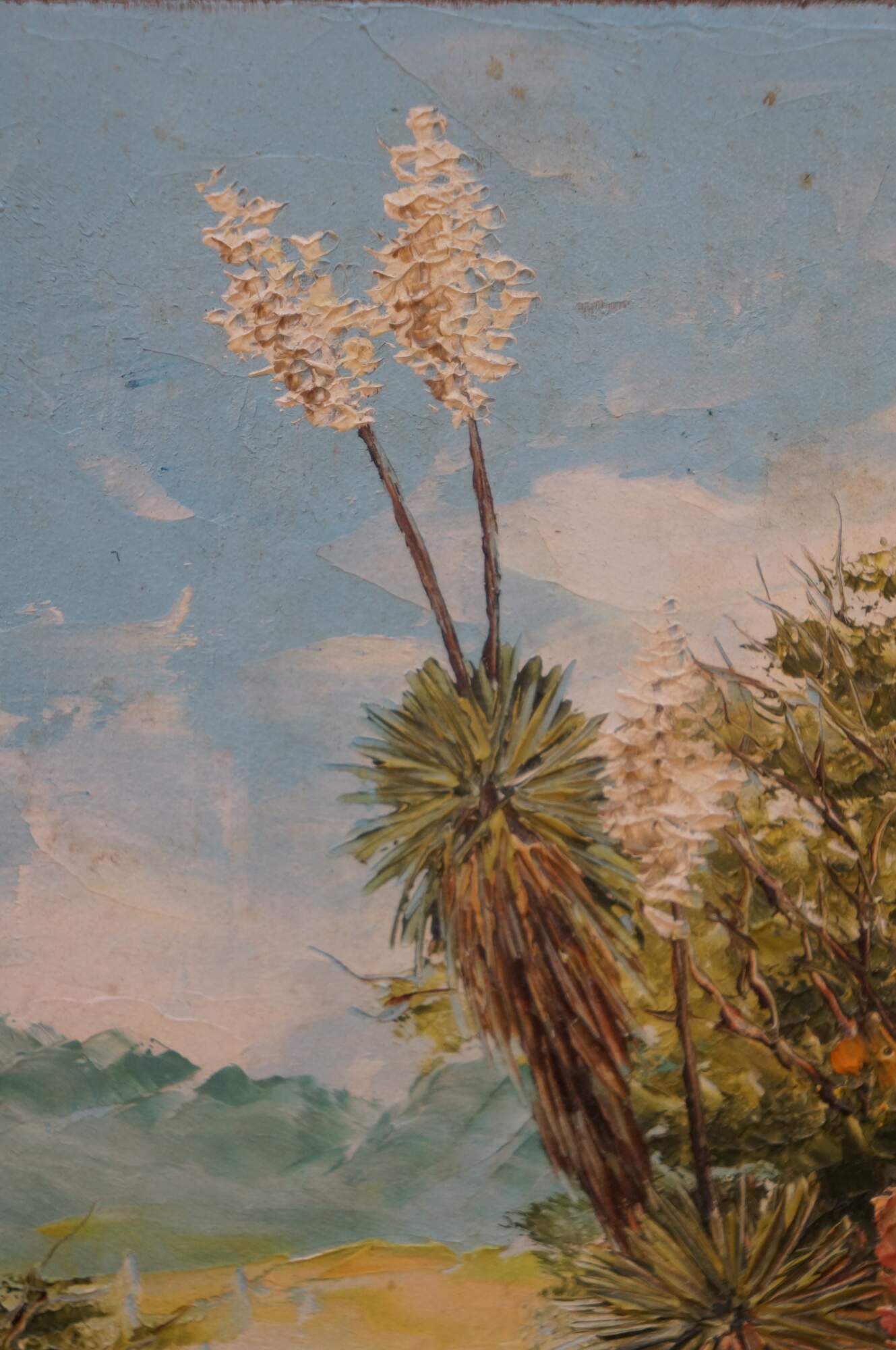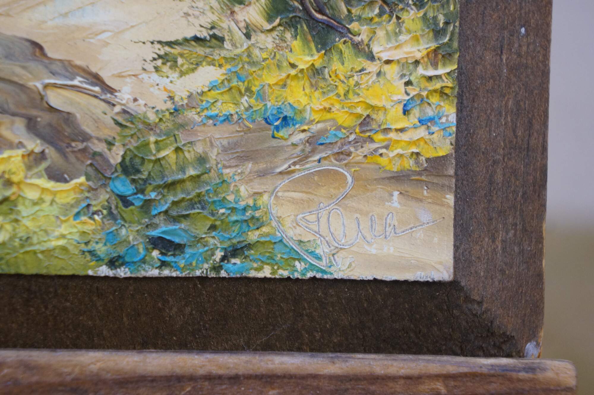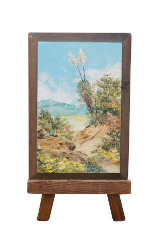 Late 20th century miniature desktop masterpiece landscape oil painting on board and easel showing a view of desert plants and mountains. Signed Reva, lower right.
