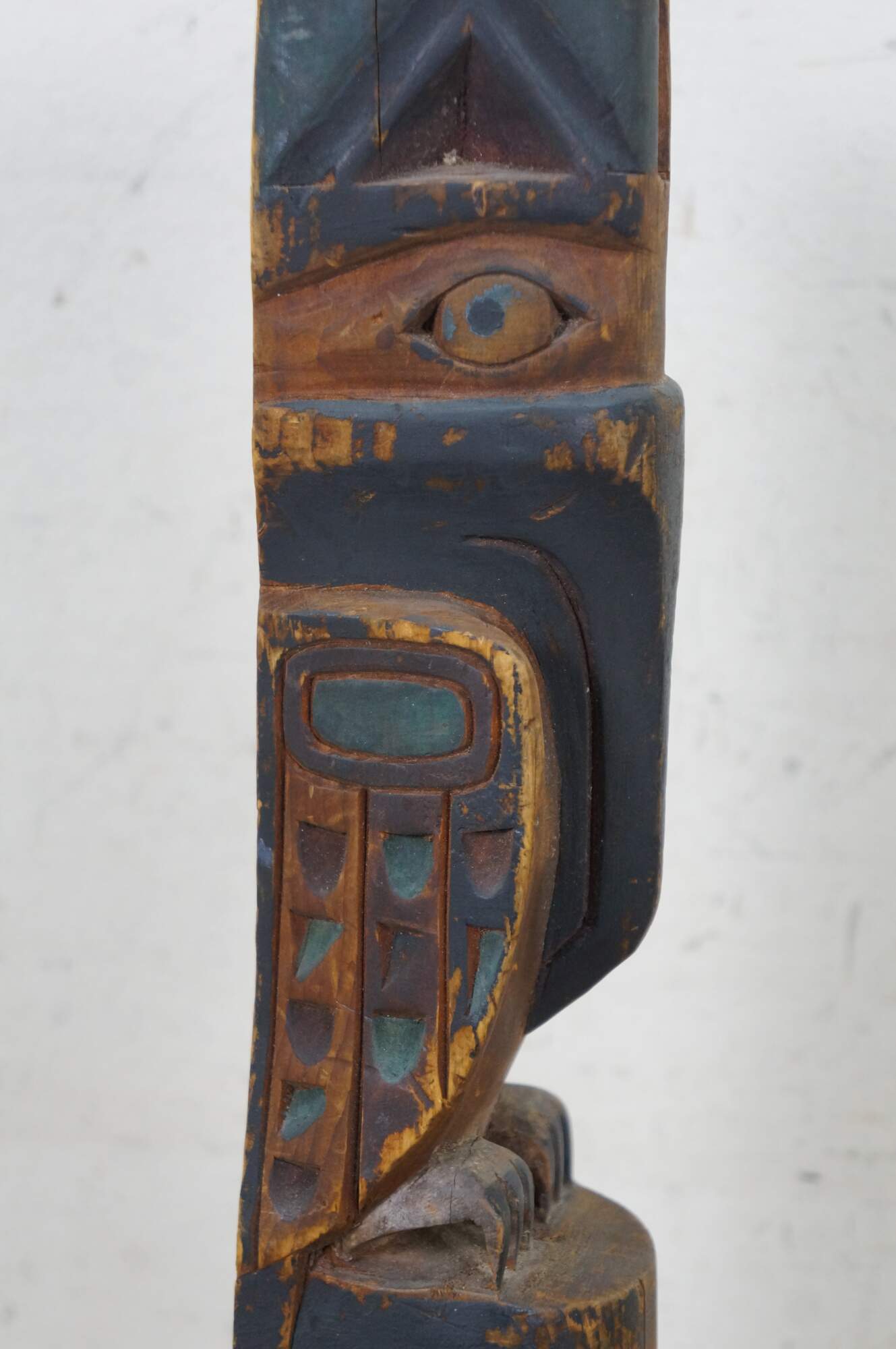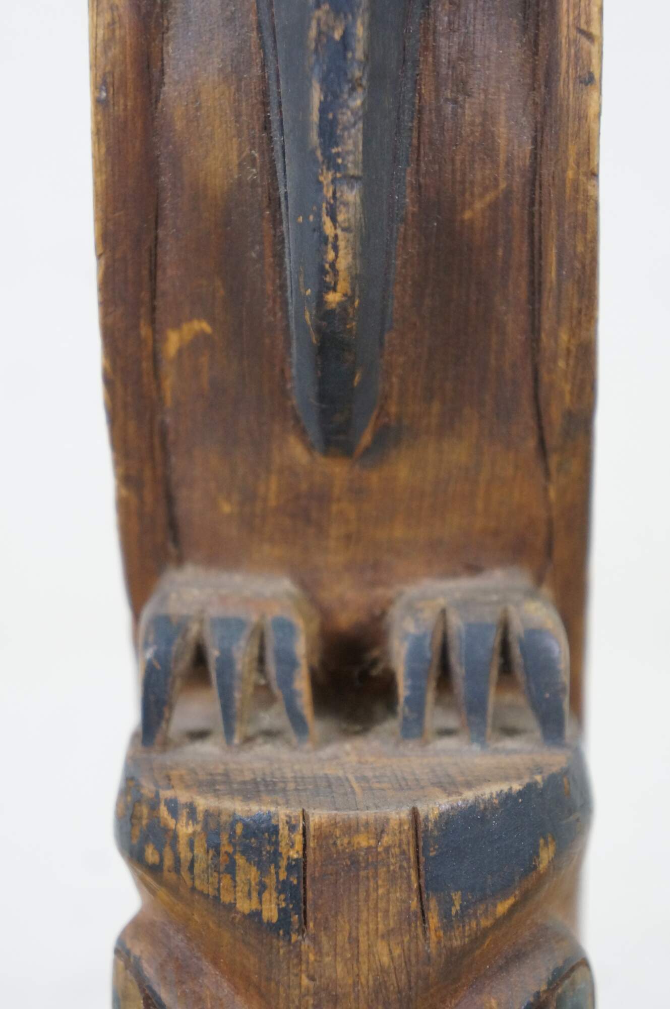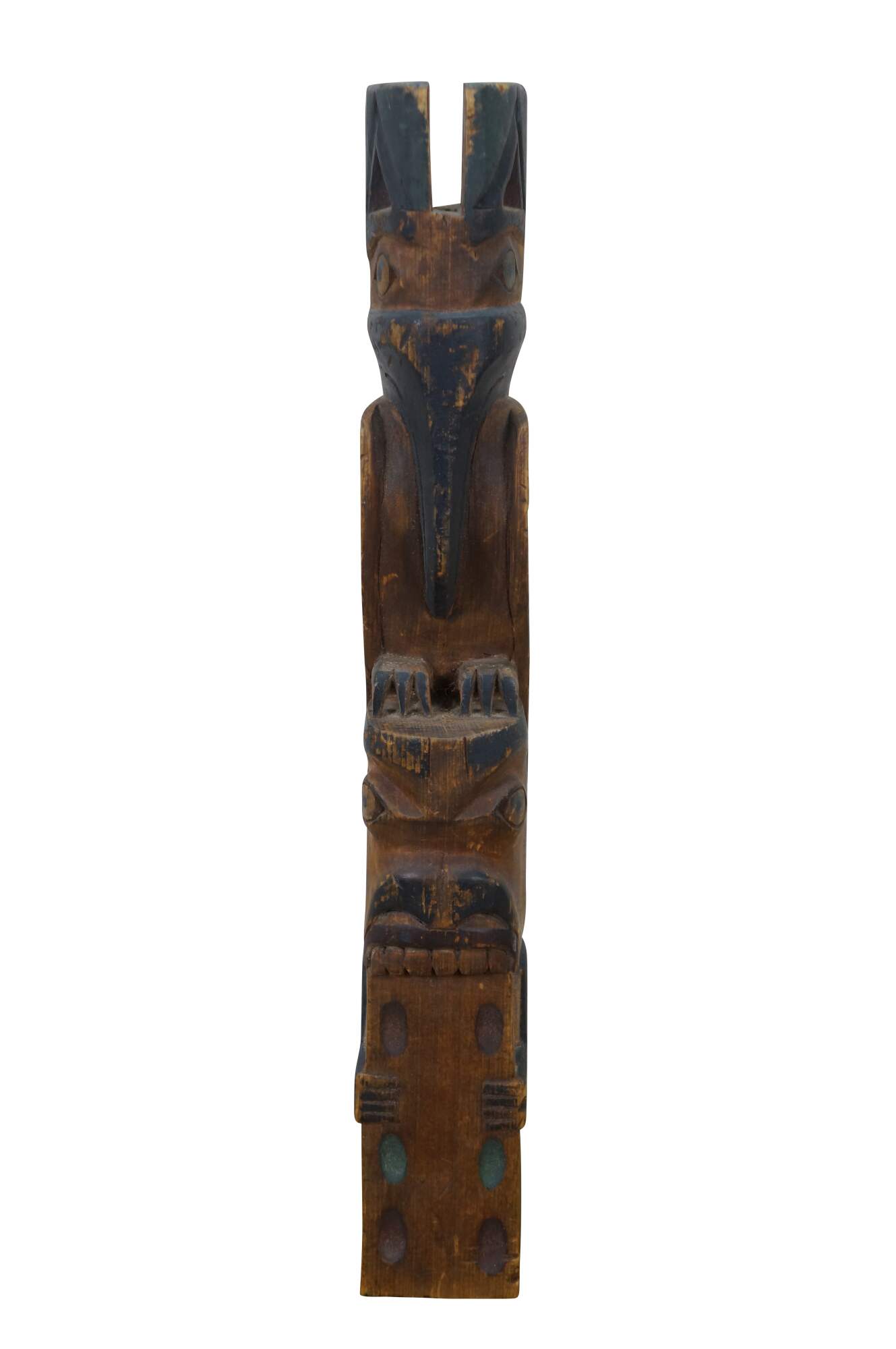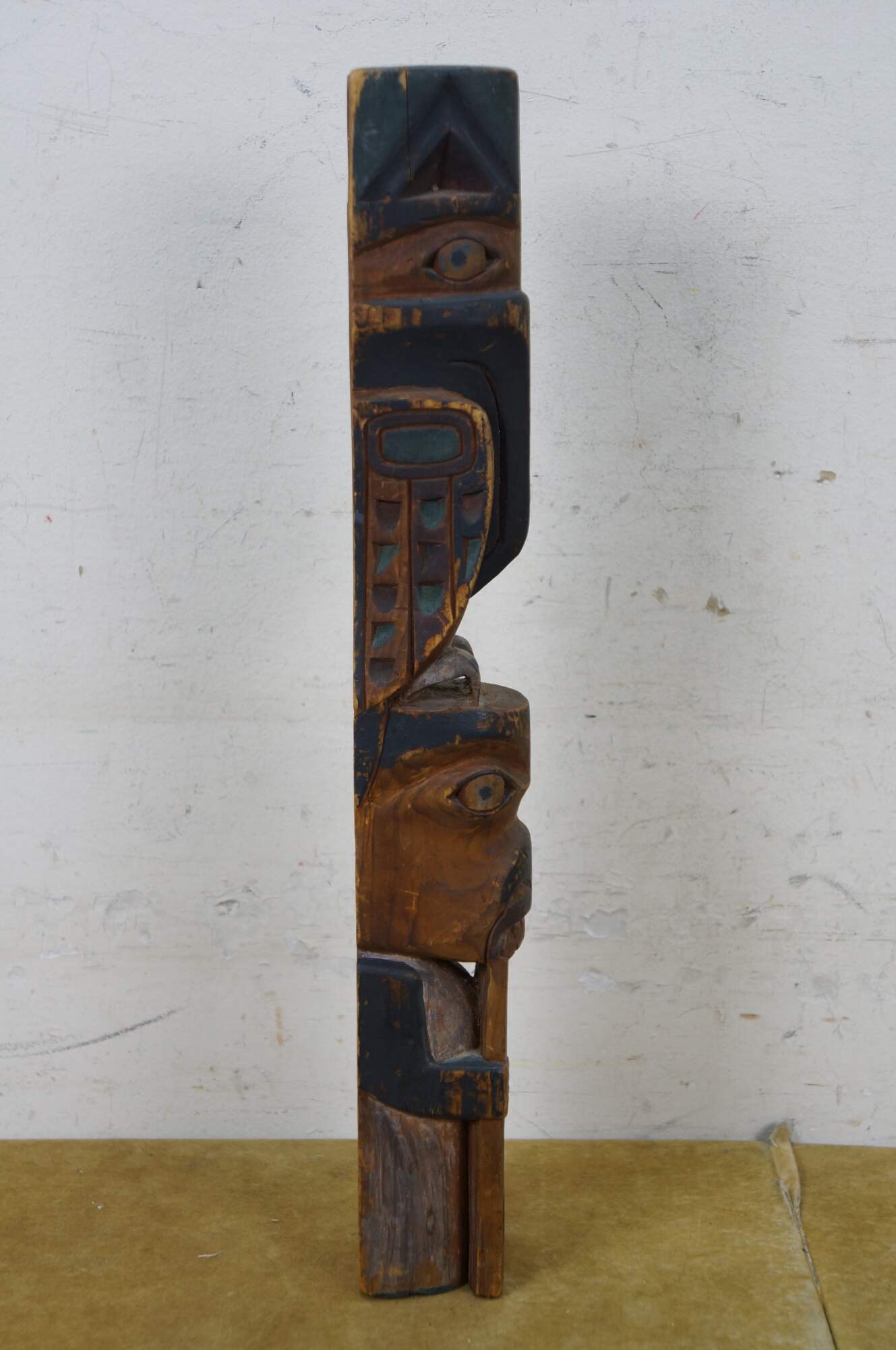 Old vintage hand carved and painted Northwest Coast Native american / Haida souvenir totem pole. Features two figure - a Raven like bird and a humanoid or beaver-like creature that appears to be chewing on a domino.