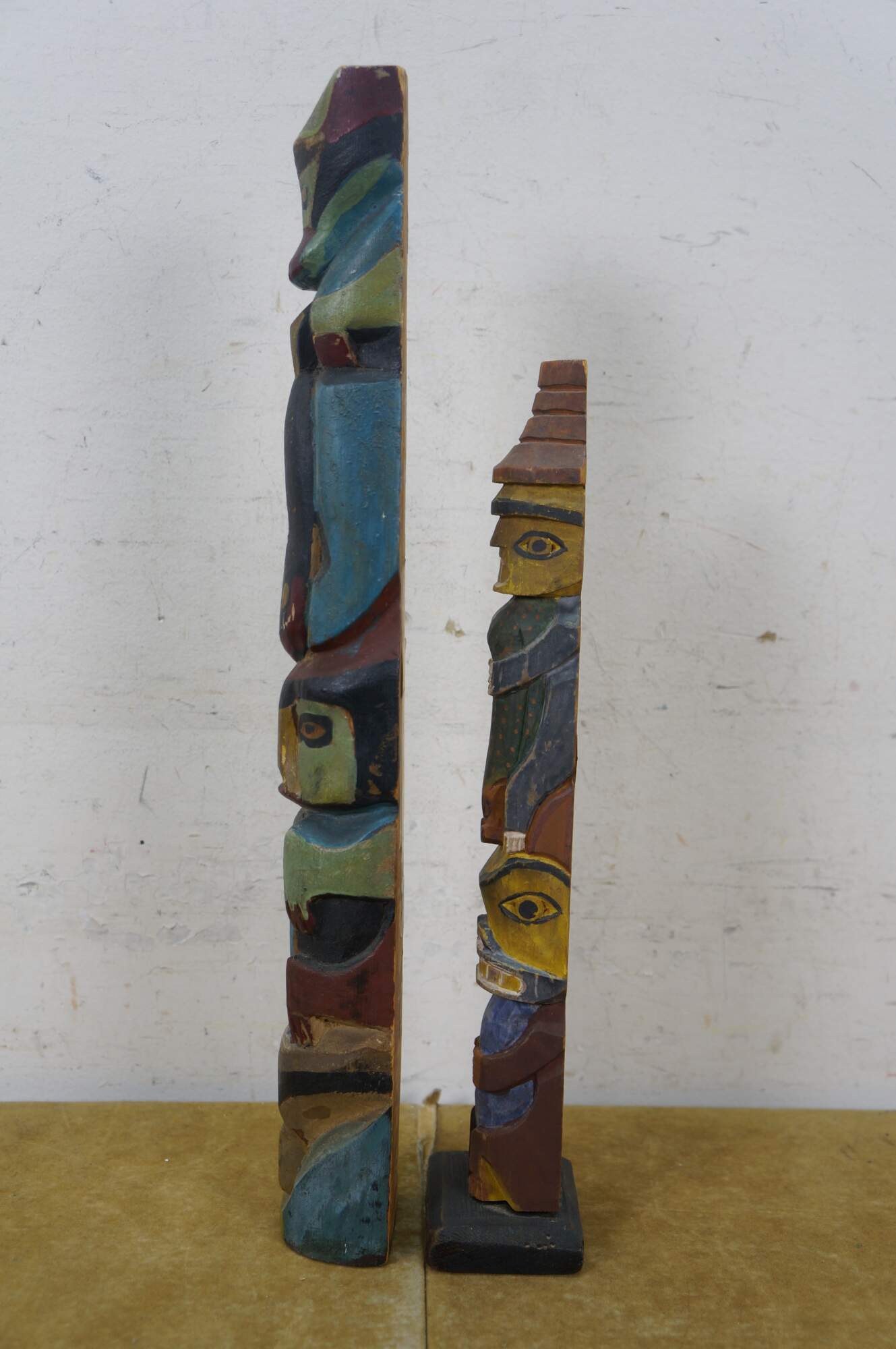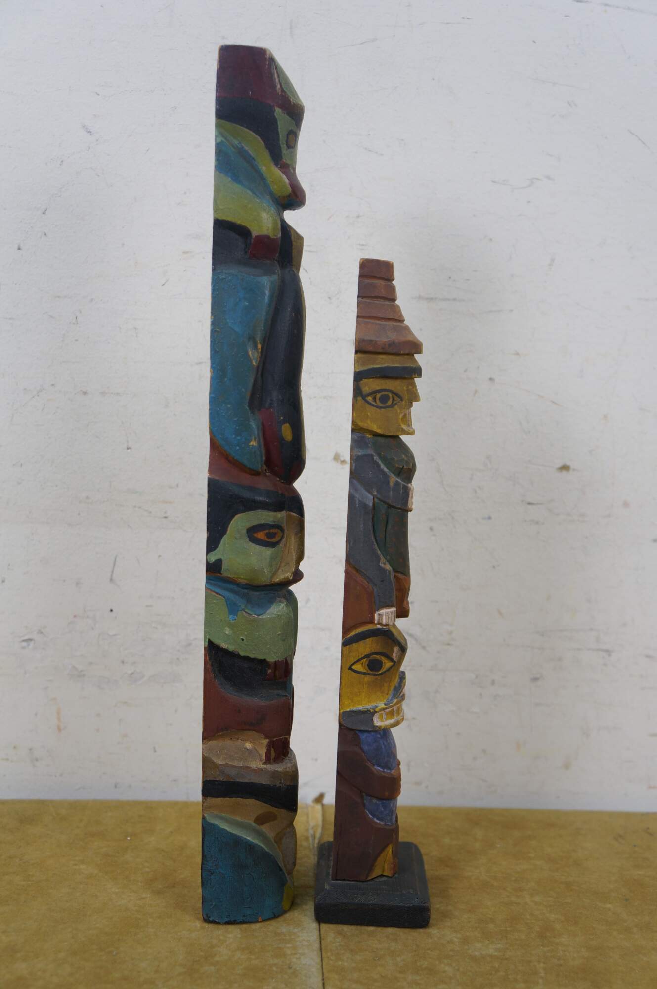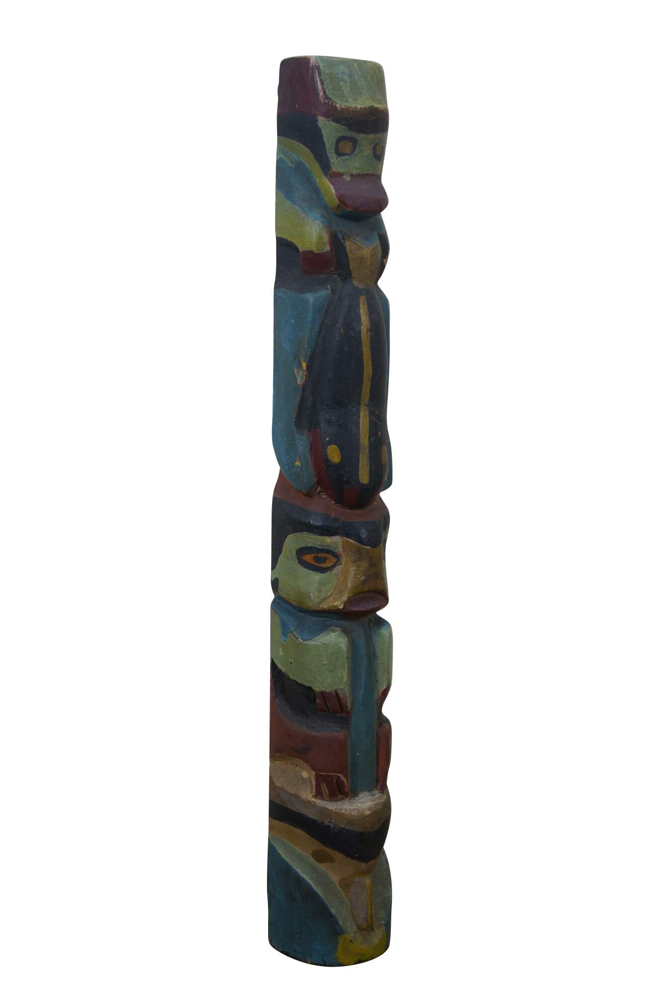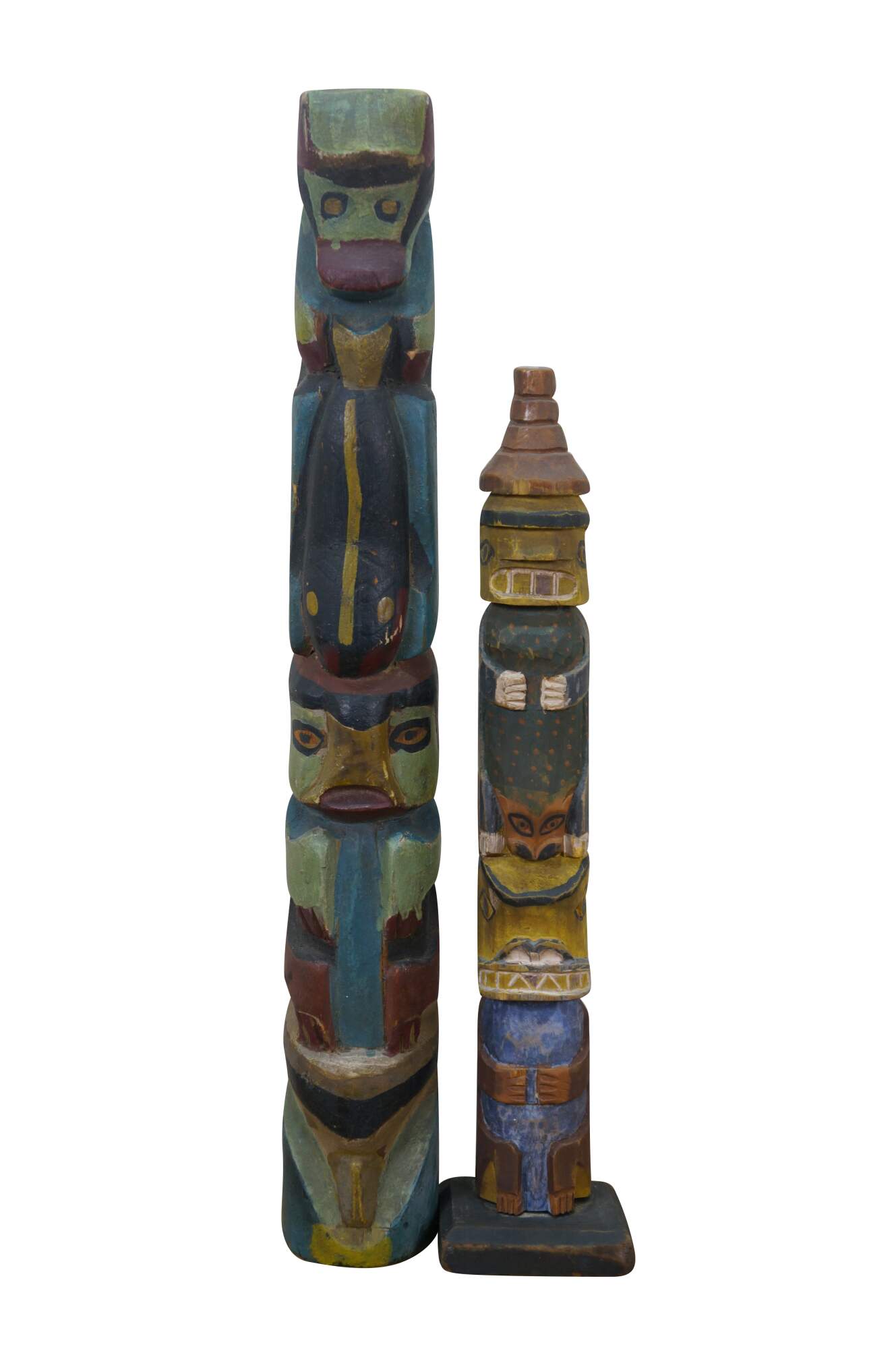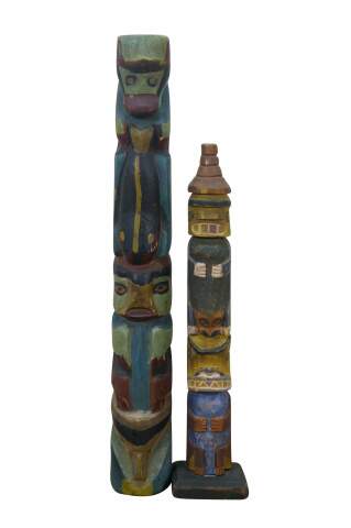 Mid to early 20th century hand carved and painted Pacific Northwest Native American folk art totem pole sculptures / figurines. Produced for the Hudson Bay Fur Company circa 1950s.