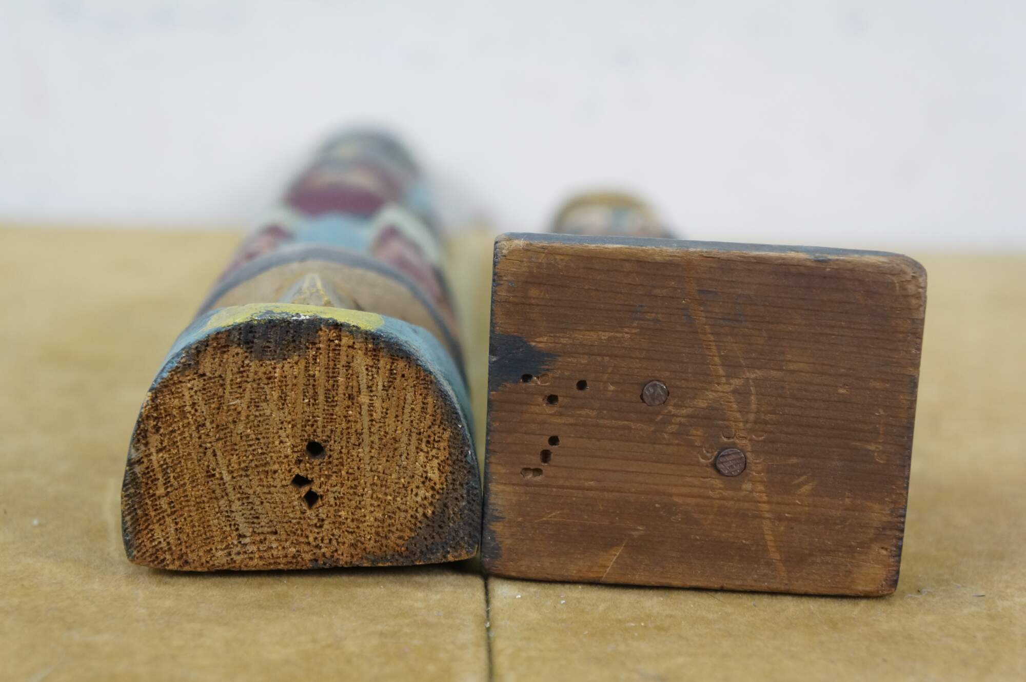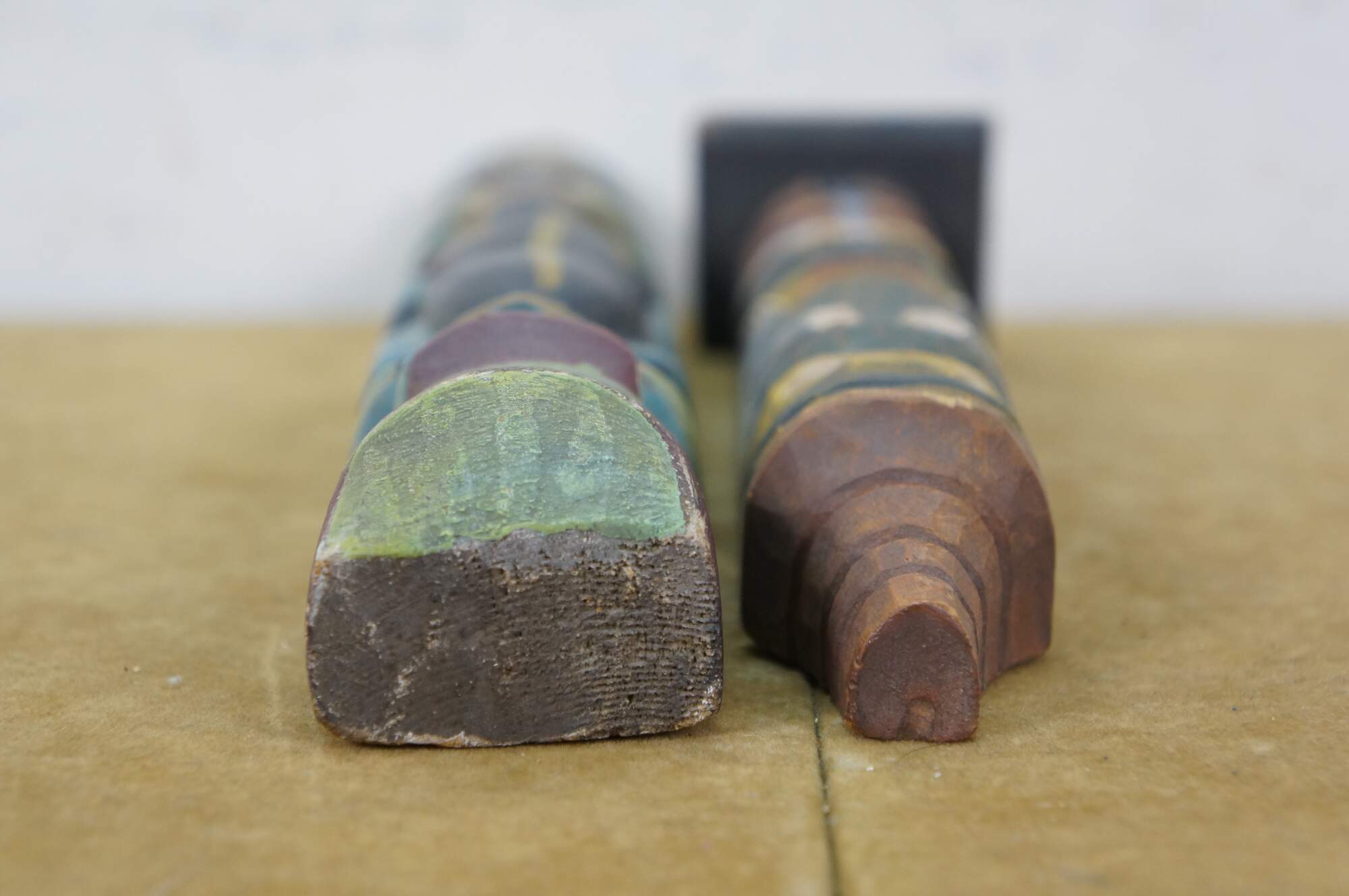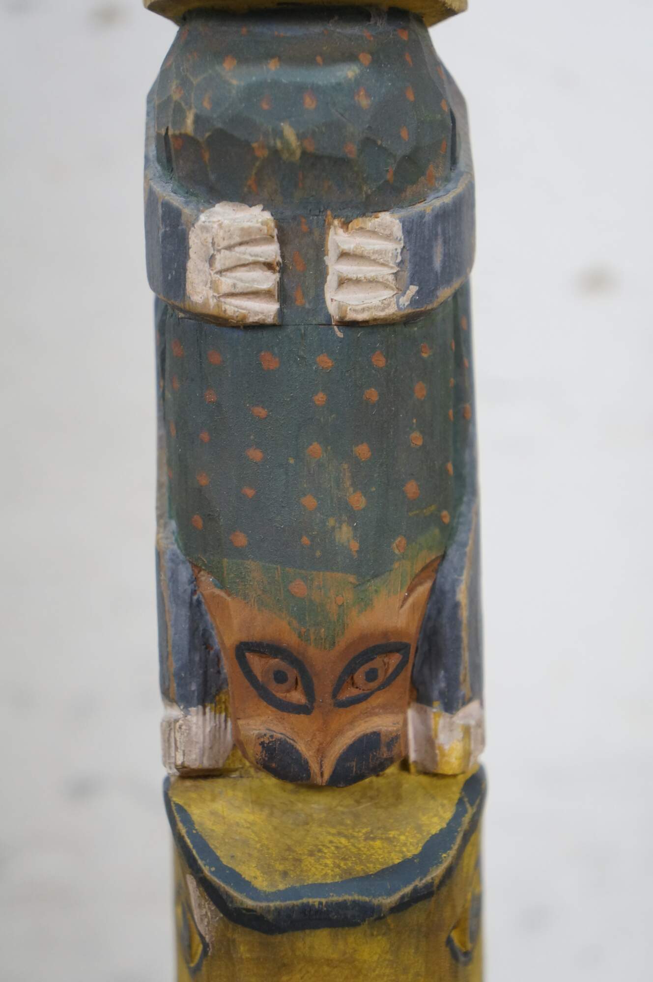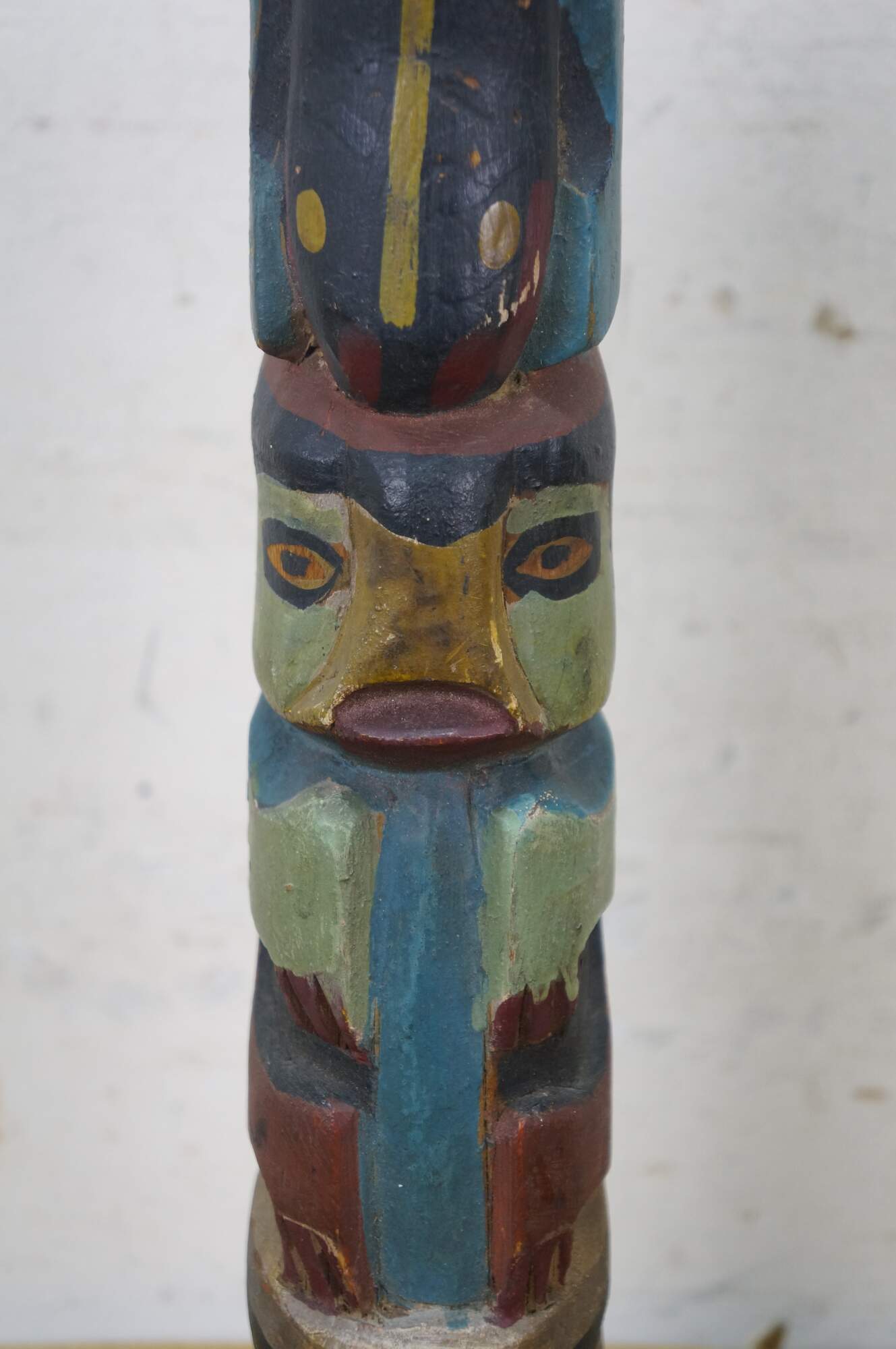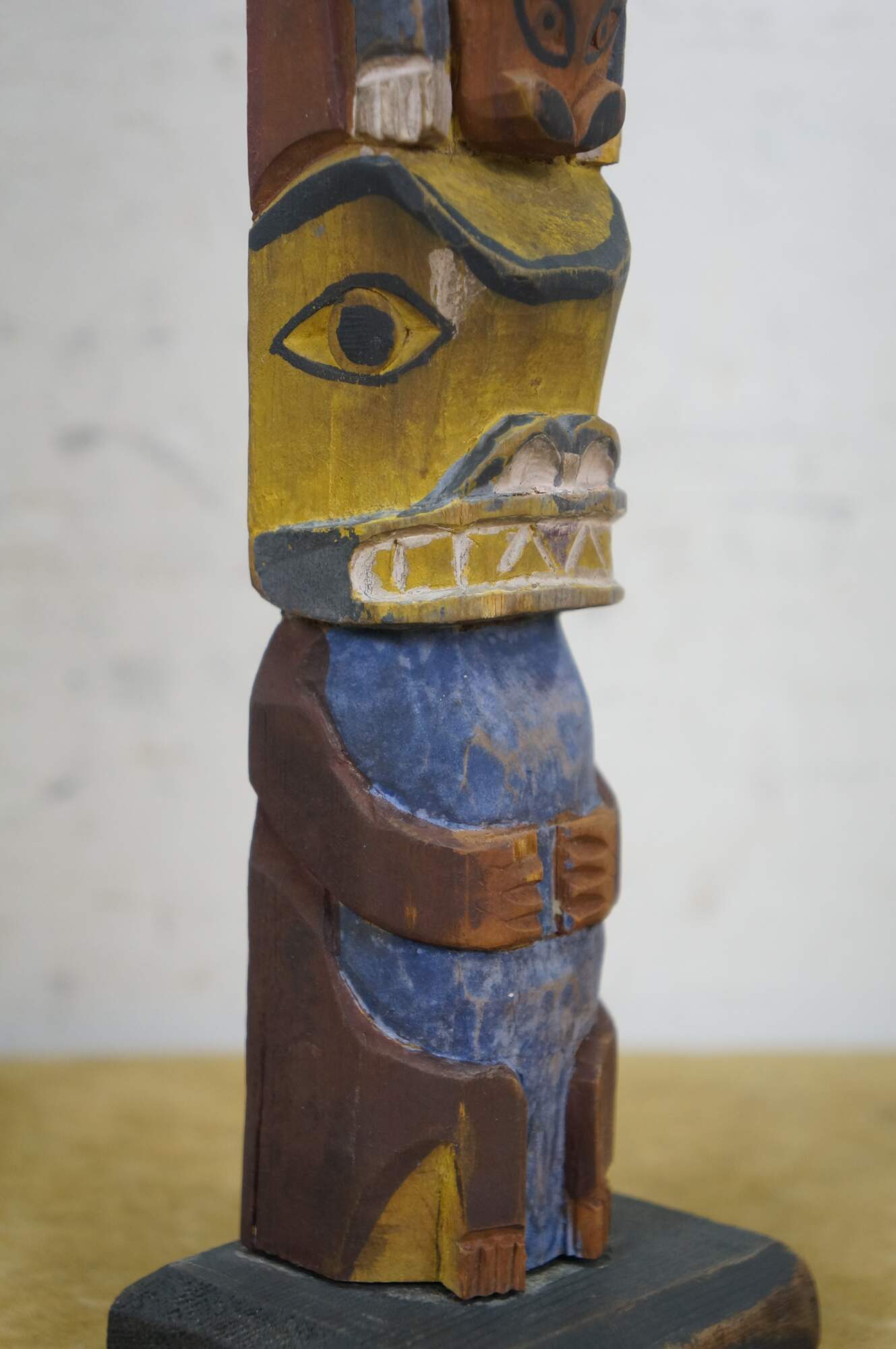 Mid to early 20th century hand carved and painted Pacific Northwest Native American folk art totem pole sculptures / figurines. Produced for the Hudson Bay Fur Company circa 1950s.