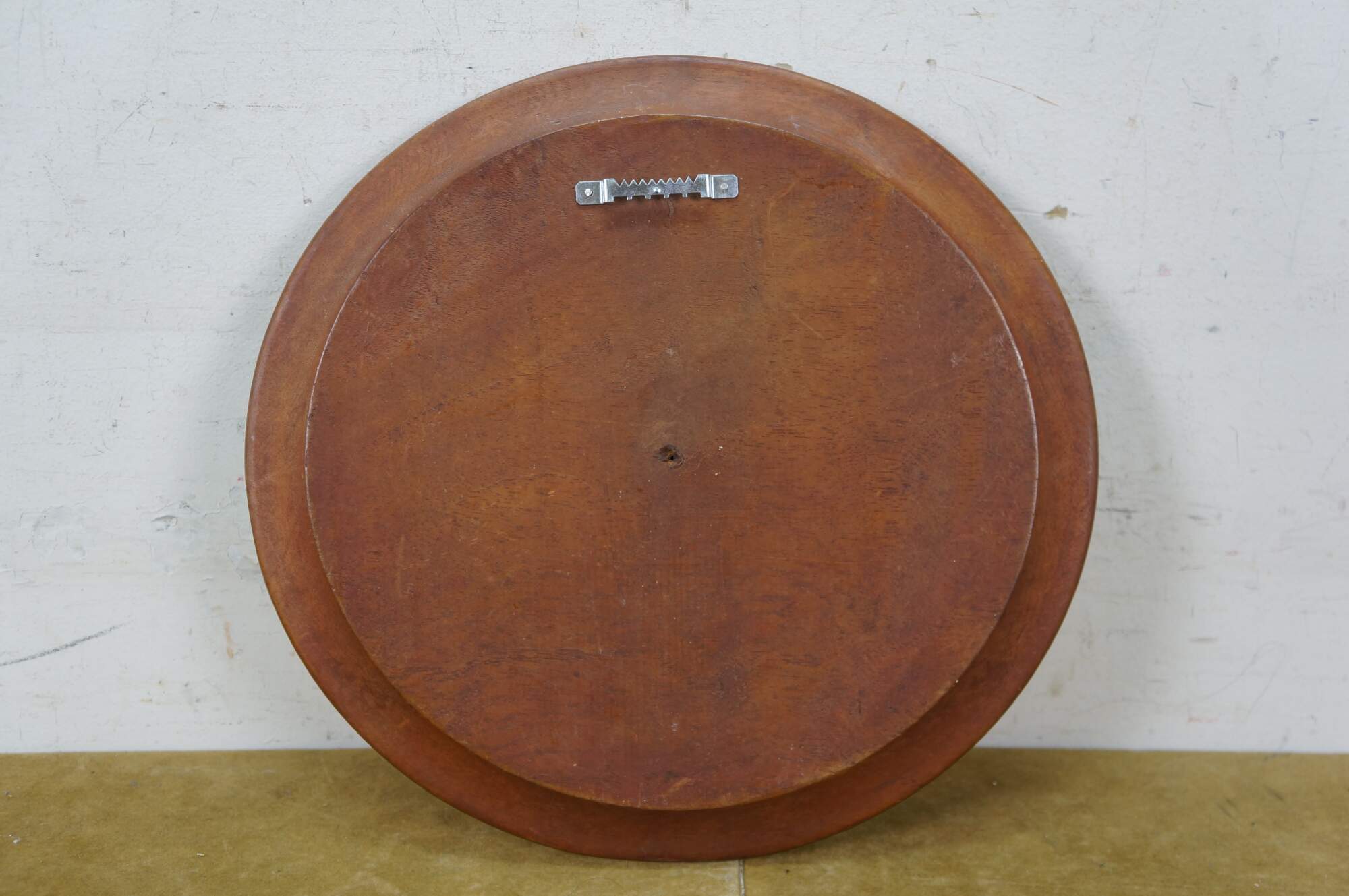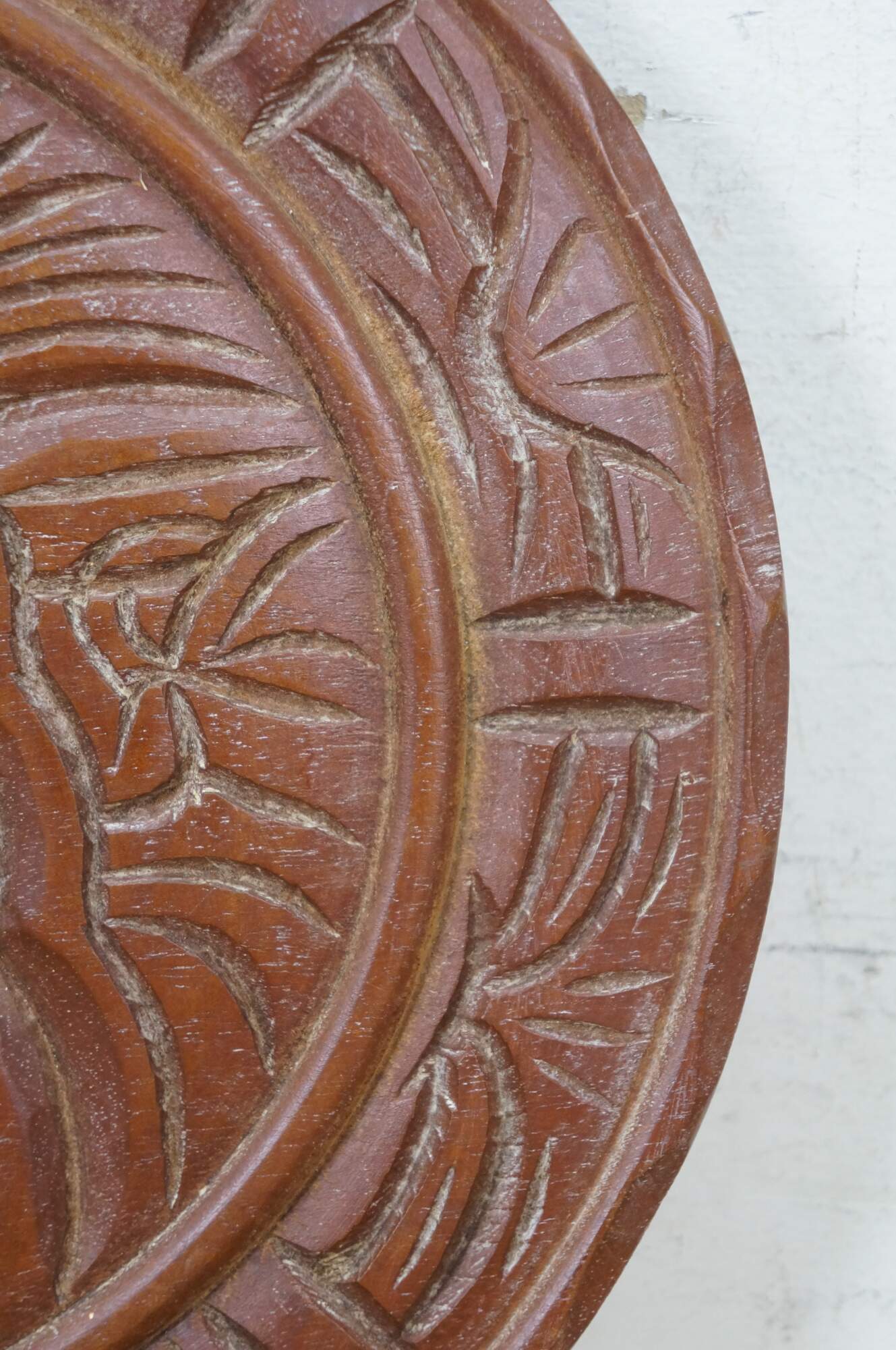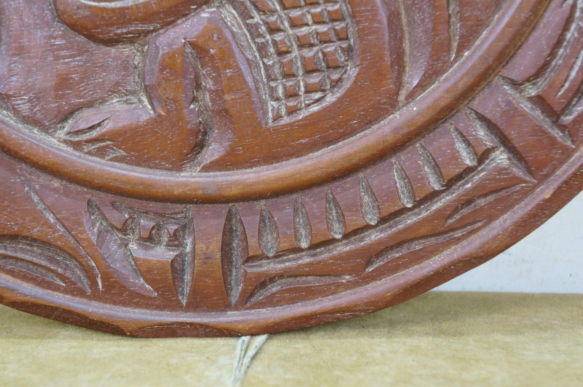 Vintage 20th century Mayan / Aztec style South American folk art carved wood wall hanging plate. Geometric border around a seated Indian Chief figure.