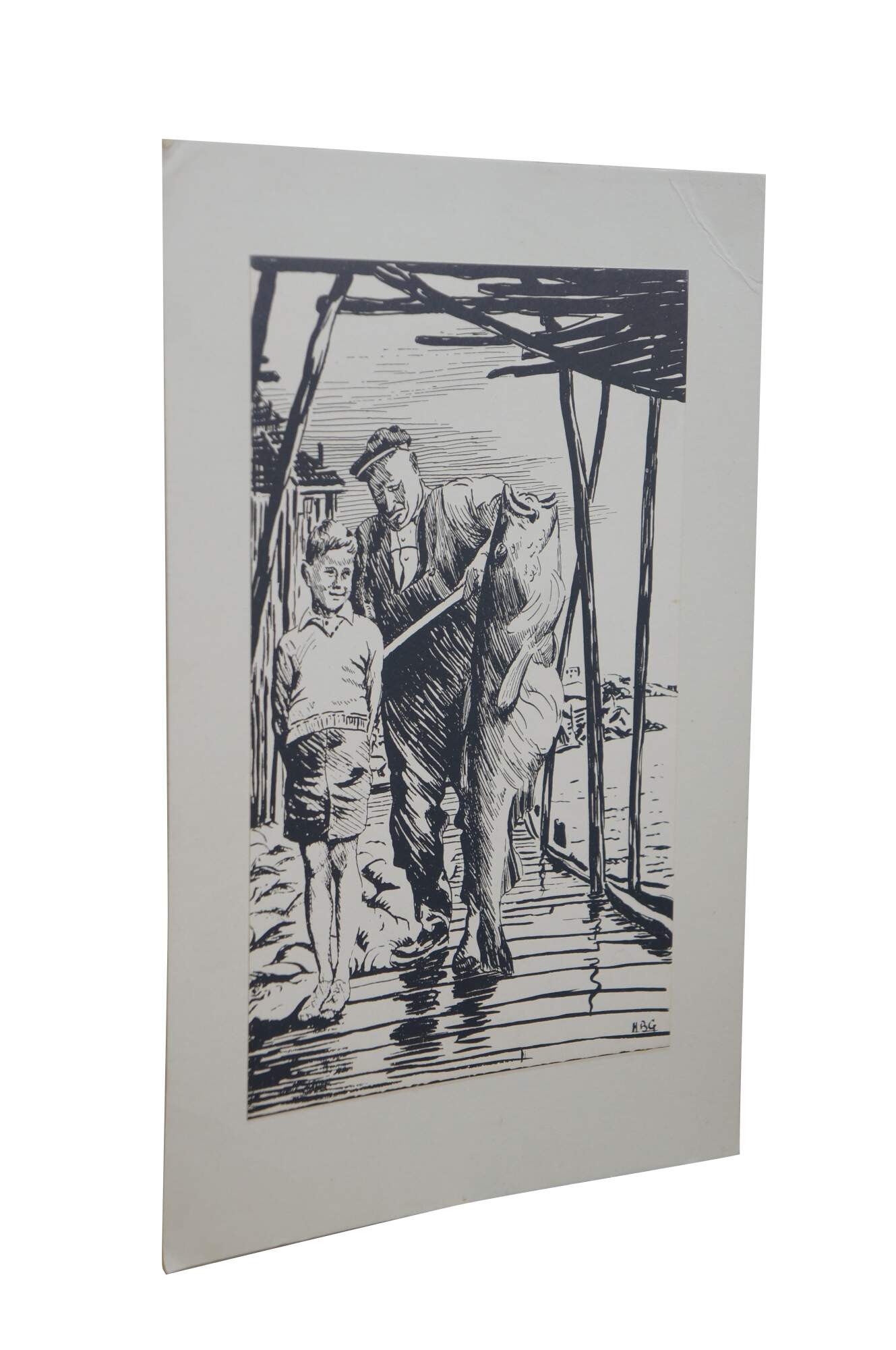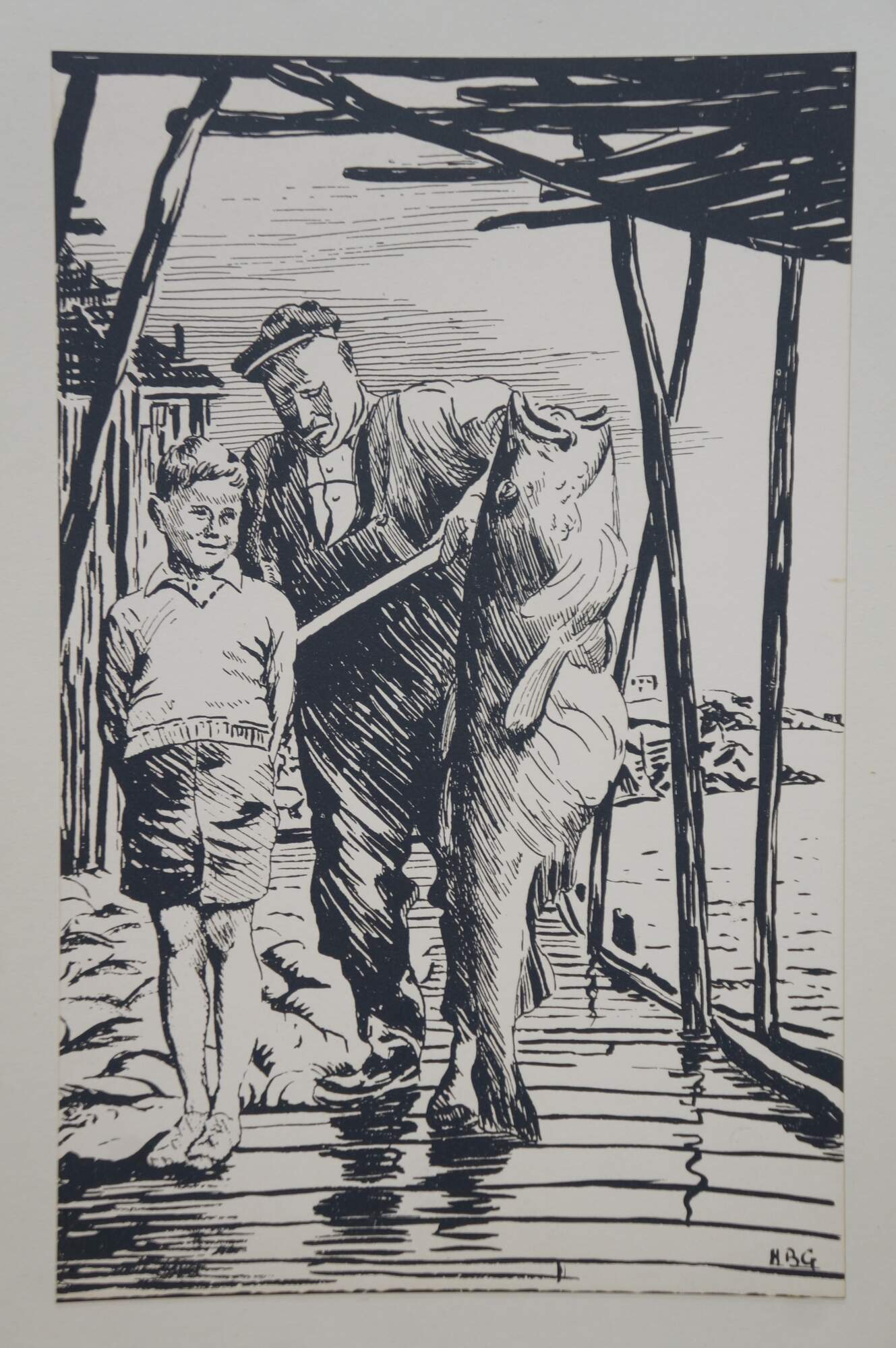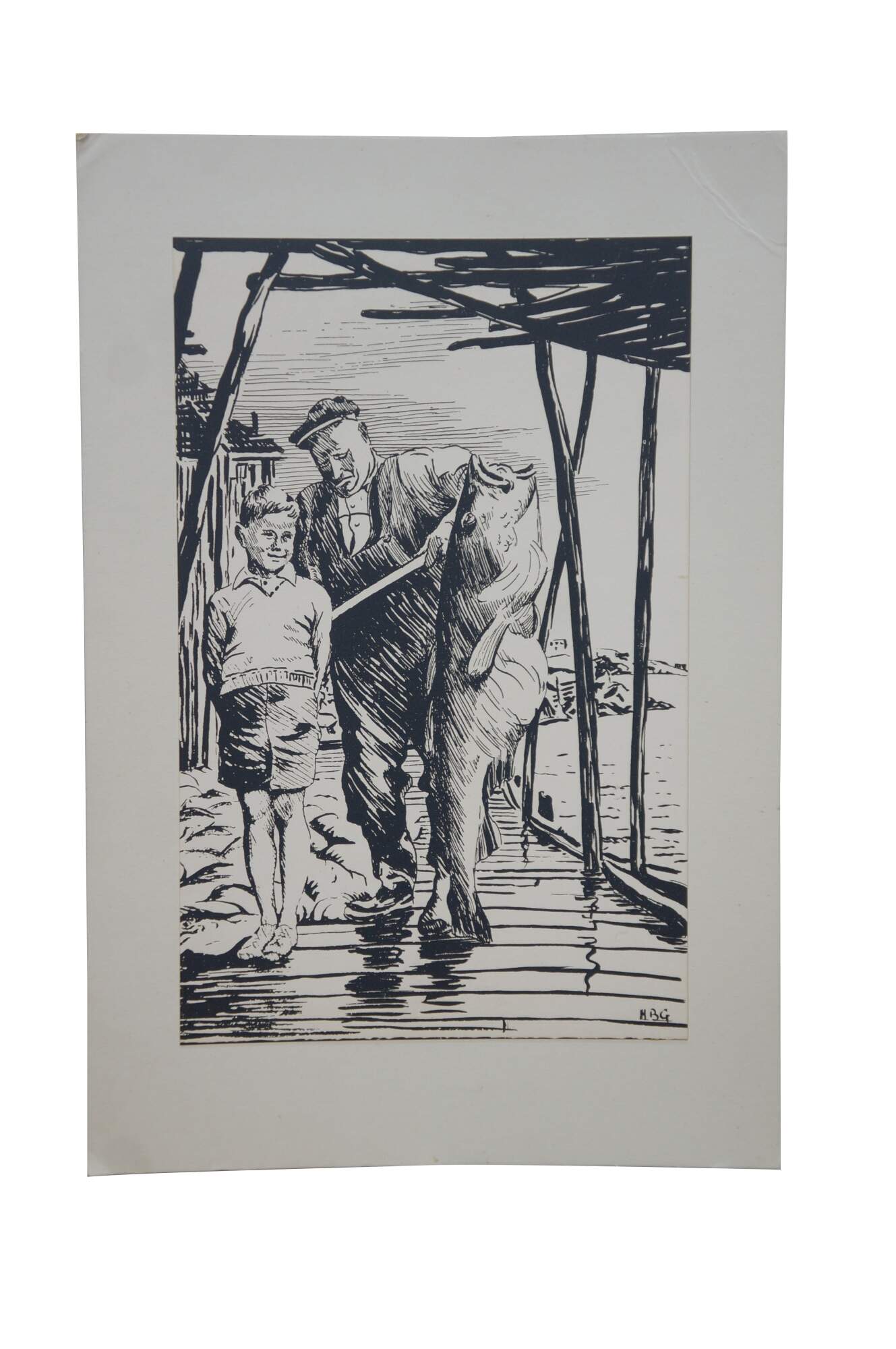 Mid to late 20th century print by Harold B. Goodridge. Shows a young boy and an older fisherman with an enormous fish, standing together on a Newfoundland dock. Printed and distributed by Goodridge as on of his many custom Christmas cards to friends and family. Mounted on cardstock. Portion of interior of card preserved on the back.