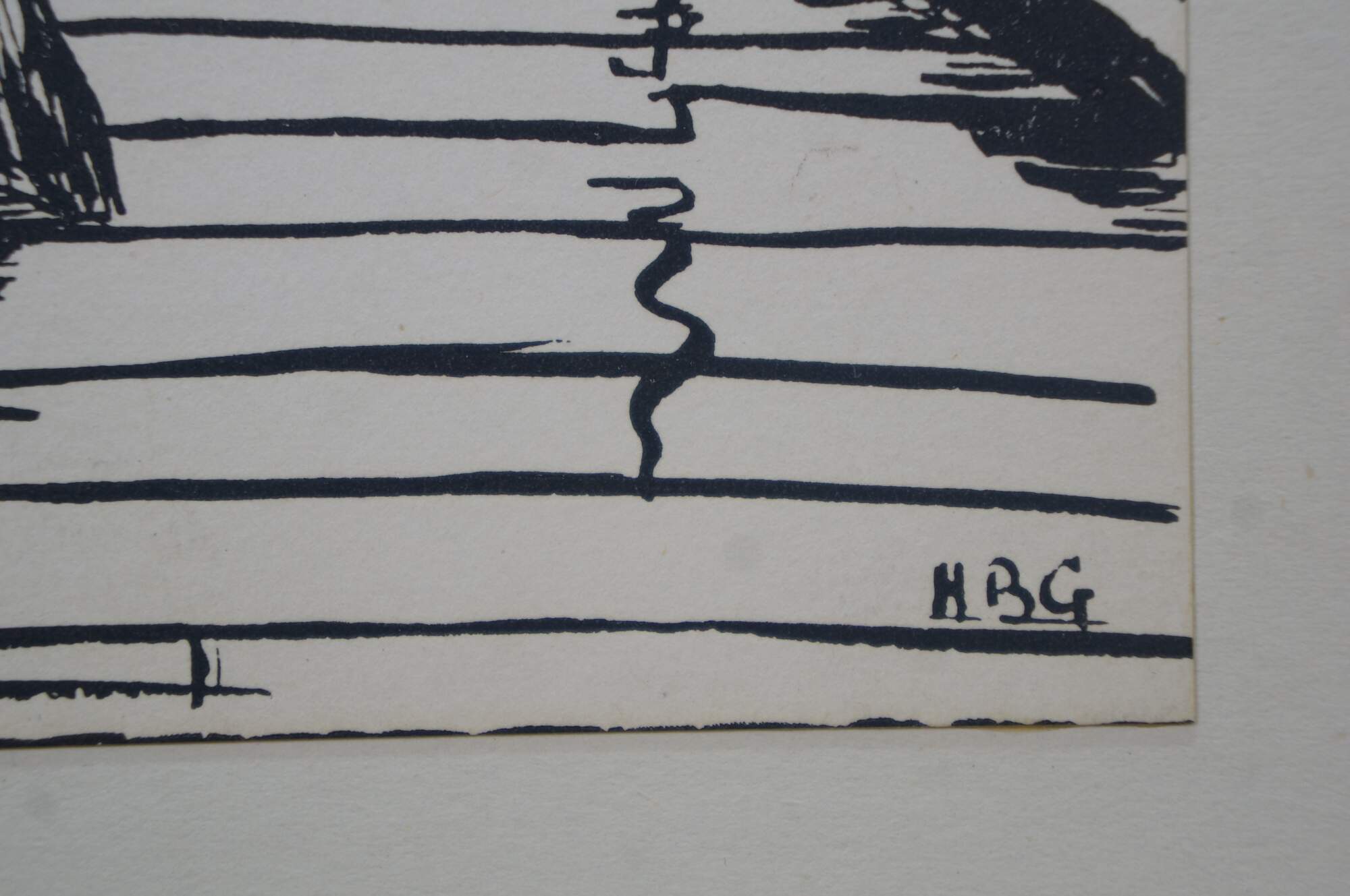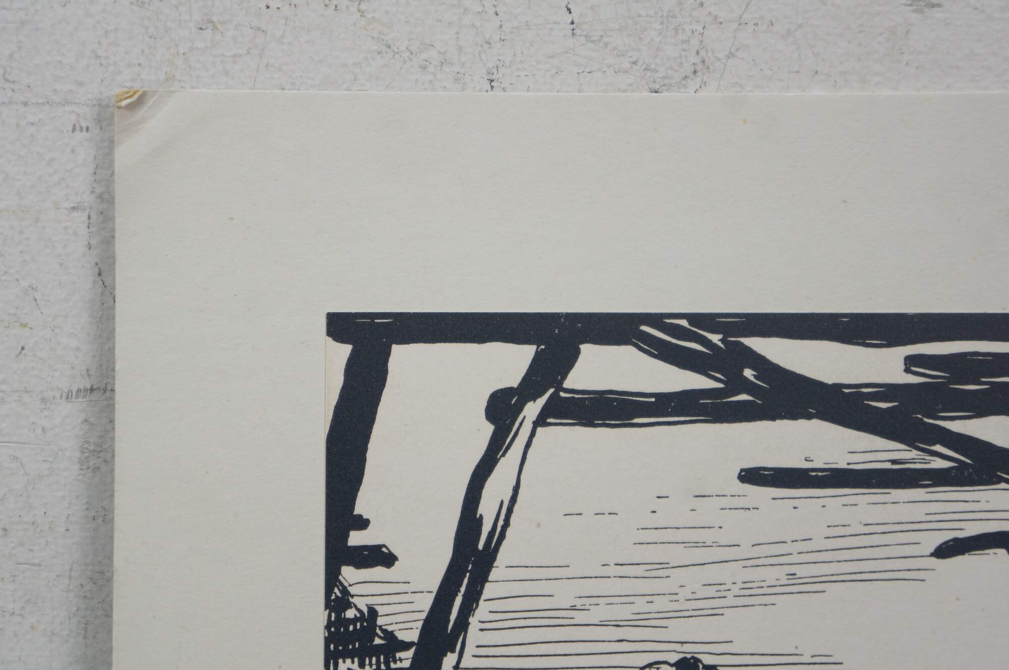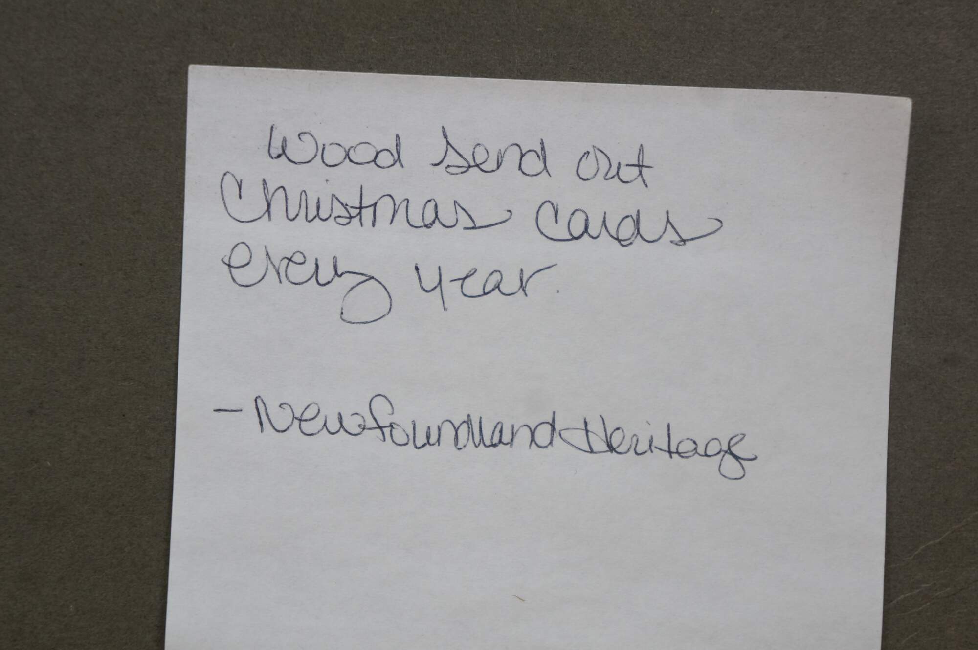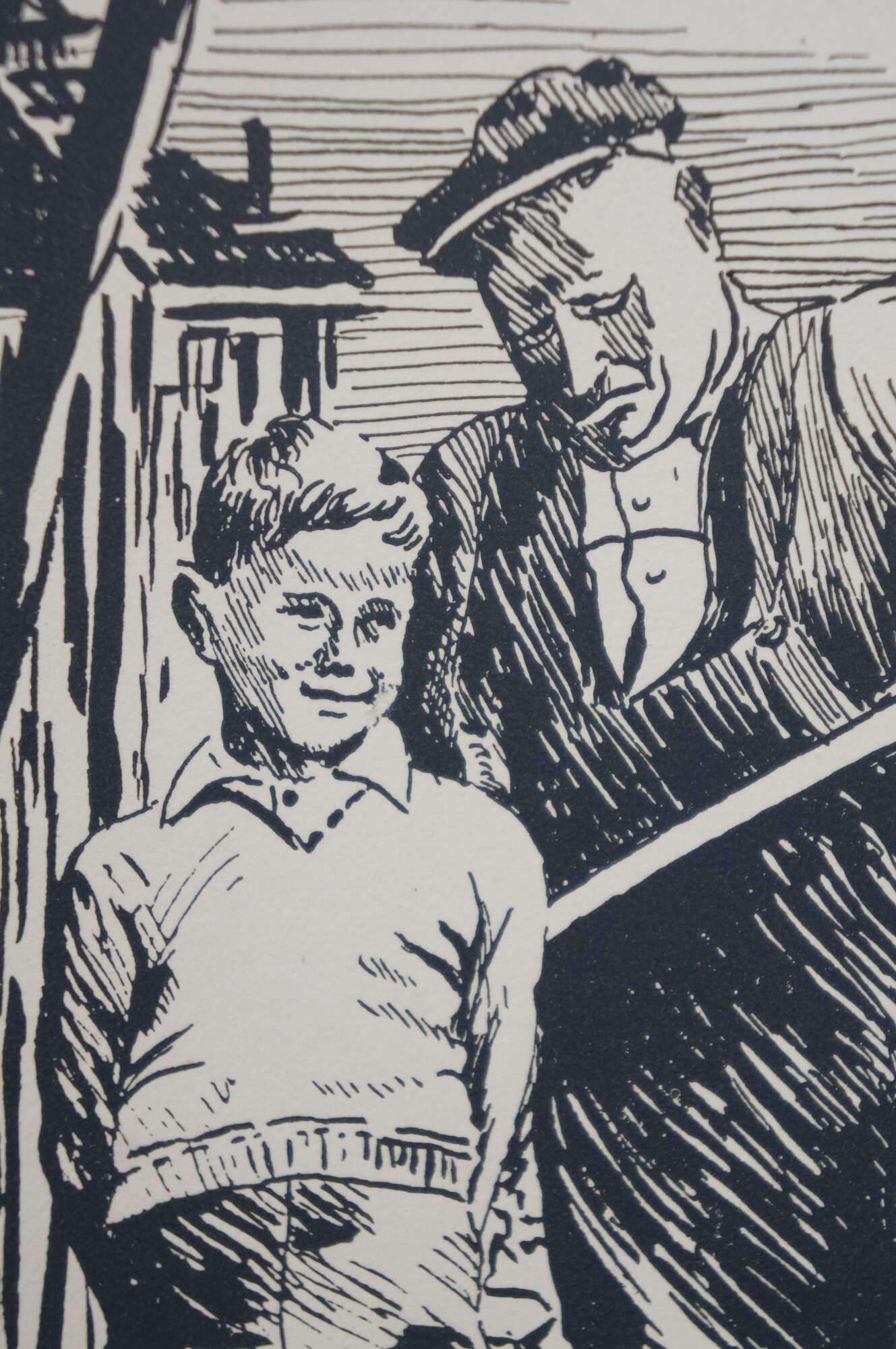 Mid to late 20th century print by Harold B. Goodridge. Shows a young boy and an older fisherman with an enormous fish, standing together on a Newfoundland dock. Printed and distributed by Goodridge as on of his many custom Christmas cards to friends and family. Mounted on cardstock. Portion of interior of card preserved on the back.