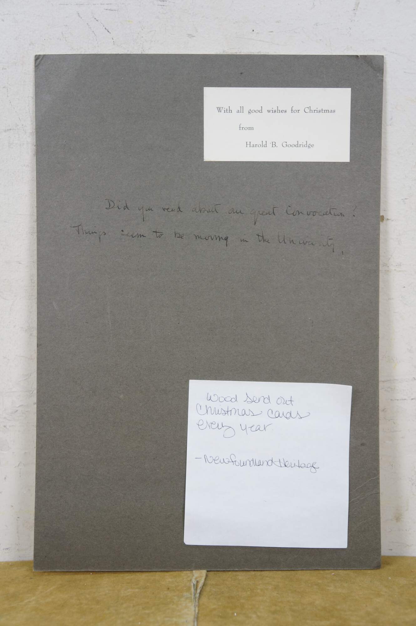 "Harold Berwick Goodridge was born in St. John's on Feb. 23, 1901, the son of Anne and Richard Goodridge. He was educated at Bishop Feild College in St. John's and at Bedford School and Cambridge University in England. In 1924 he began teaching in England and spent four years as head of the Department of Geography at Birkenhead School before leaving for India in 1934. There he served as master and acting principal at Daly College for Indian Princes at Indore. During 1942 he served with the Royal Indian Navy as artist and reporter. Goodridge returned to Newfoundland in 1944 and after two years as private secretary to Gov. Sir Humphrey Walwyn, he joined the faculty of Memorial University College, where he established the Department of Geography and served as its head for 14 years. In 1960 Goodridge retired from teaching to devote himself full-time to painting. He had no formal artistic training; he had first become interested in painting while in India and had received his first commissions there. After his return to Newfoundland he painted a large mural of John Cabot about to depart from Bristol at the beginning of his voyage of discovery, as part of the 450th anniversary of Cabot's voyage. It was subsequently used as the frontispiece for the 1949 Canadian Year Book, the first issue in which Newfoundland was included as a province. In the late 1950s the Newfoundland government commissioned the mural of Newfoundland history which now hangs in the lobby at Confederation Building. His work can be found in many public and private collections the world over. In 1977 he was awarded an honorary degree by Memorial for his contribution to the university and to art. Goodridge continued to paint until his death in April 1989. Harold Goodridge believed in sharing his art with as many people as possible. Each year he would design a Christmas card which contained one his drawings as the cover image; he would have these printed and sent to his friends. The subjects varied from the historic (Sir Humphrey Gilbert taking possession of Newfoundland for Queen Elizabeth I), to the contemporary (Bowring Park, the Anglican Cathedral), the religious (the adoration of the Magi) to the scenic (seagulls over cliffs)." (Heritage Newfoundland & Labrador)