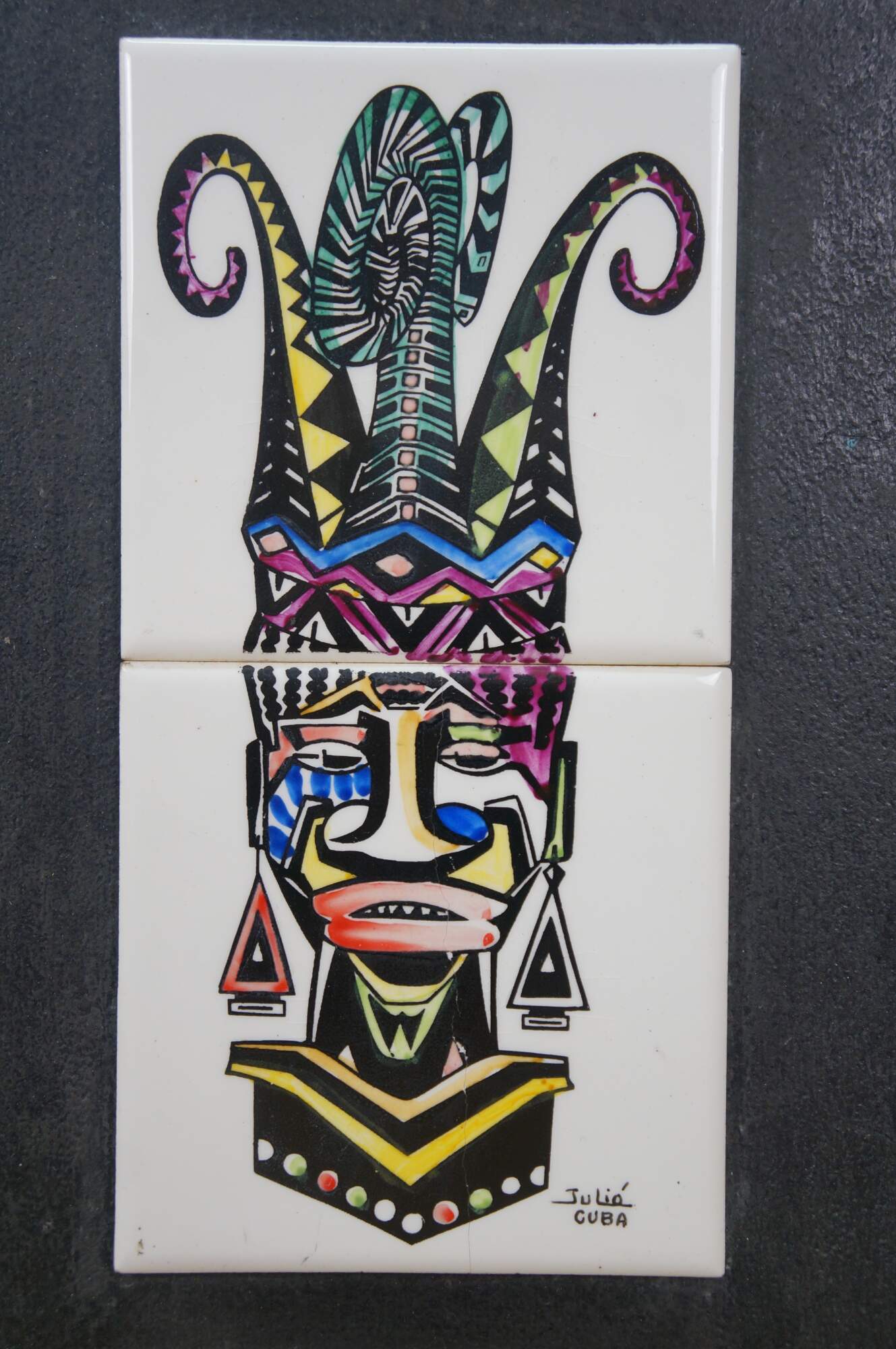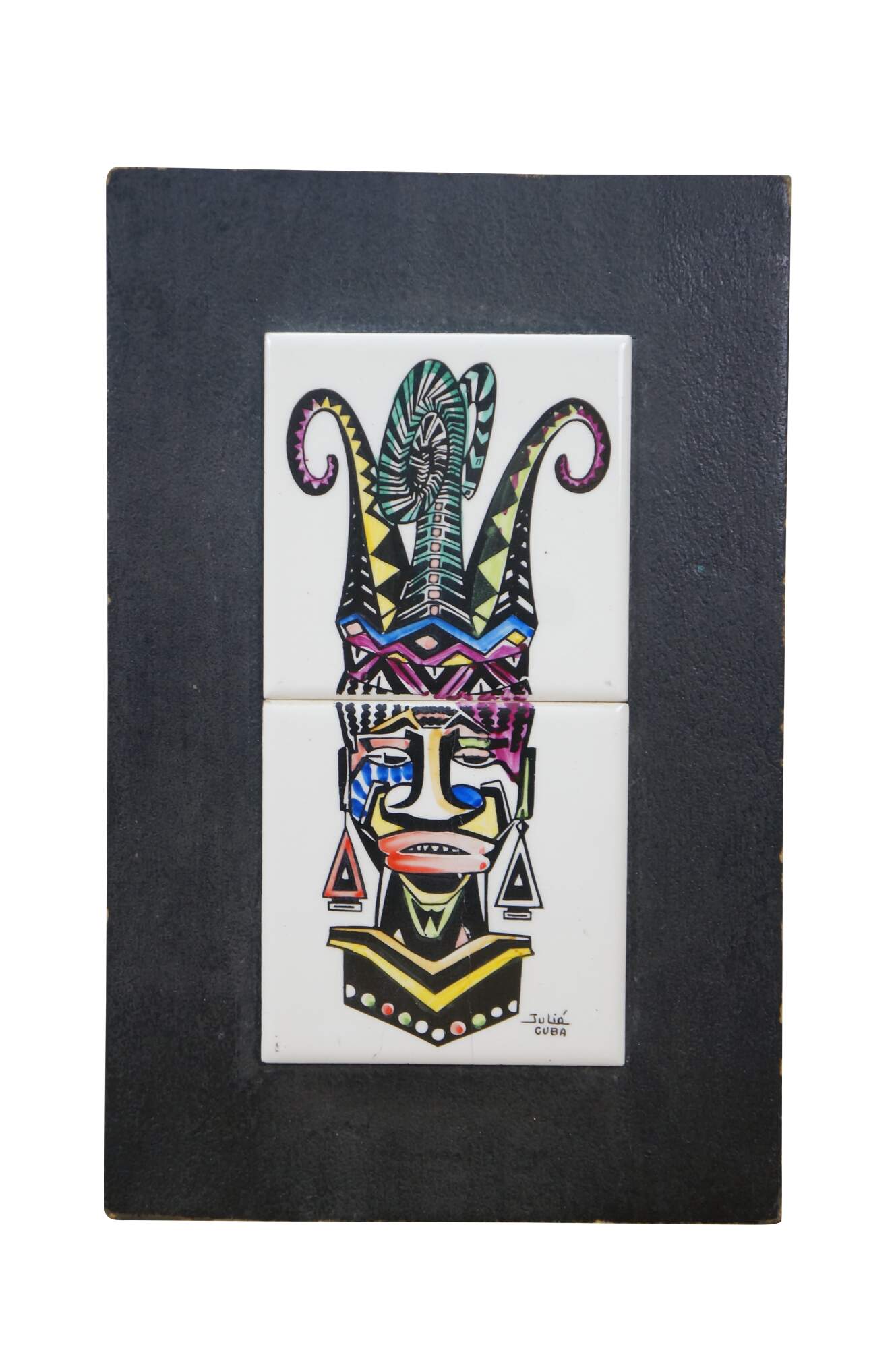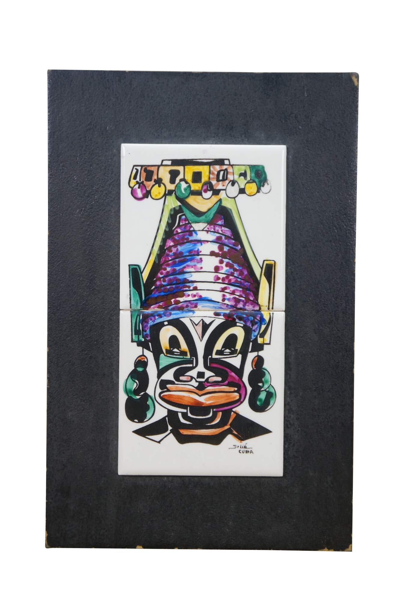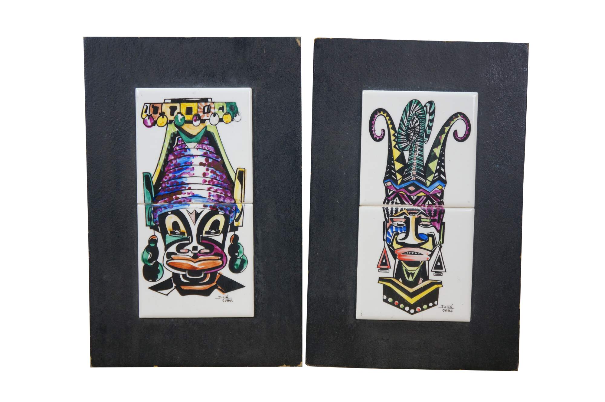 Pair of vintage 20th century works of art on porcelain tiles. Shows a pair of brightly colored faces / masks with exaggerated features, jewelry, and elaborate headdresses. Signed Julio Cuba in lower right. Mounted on black cardstock.