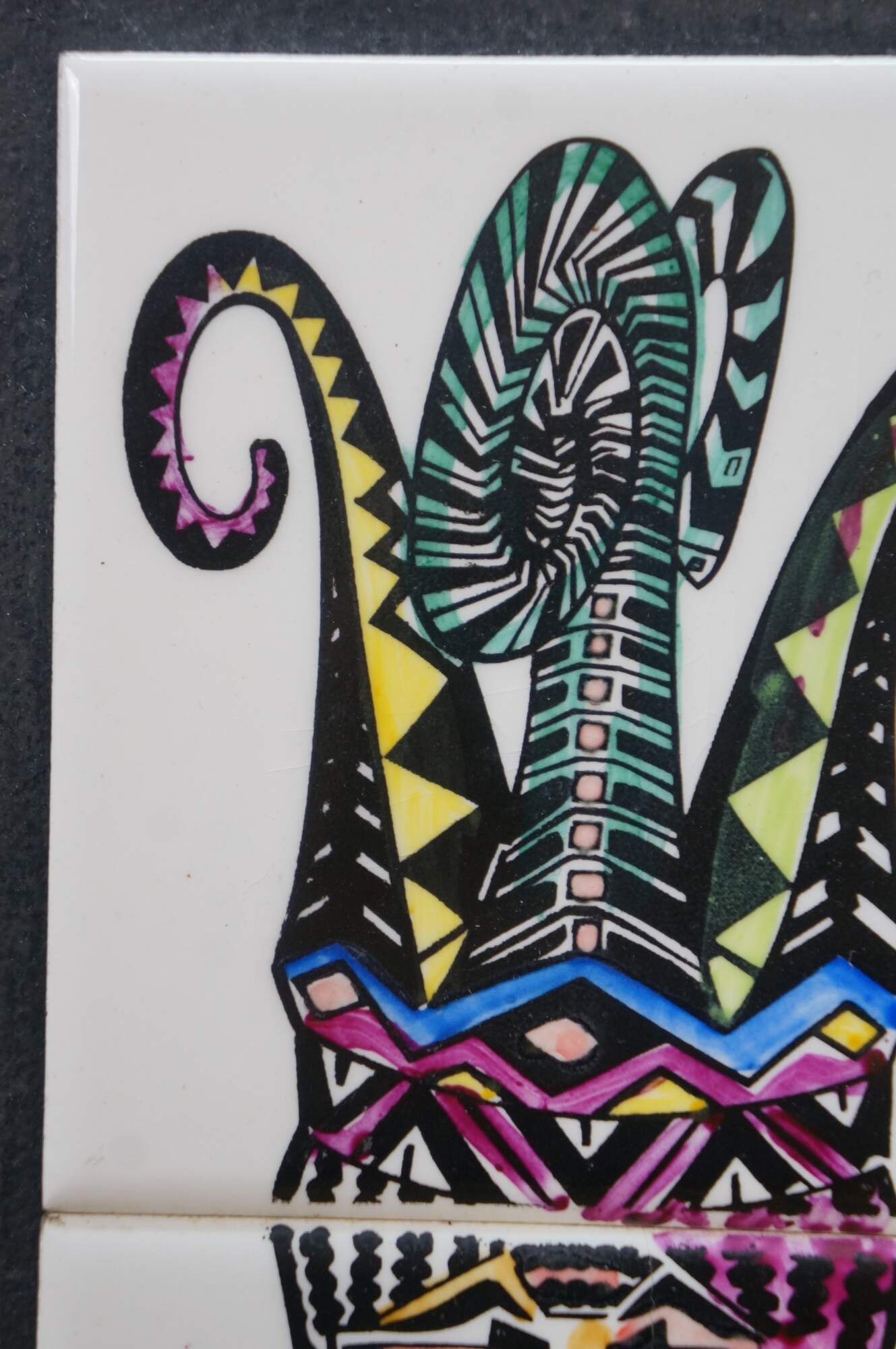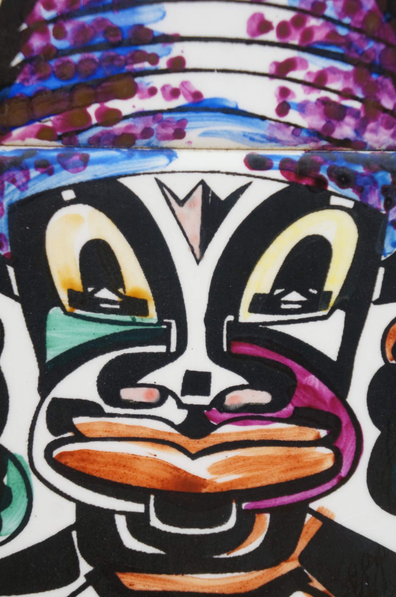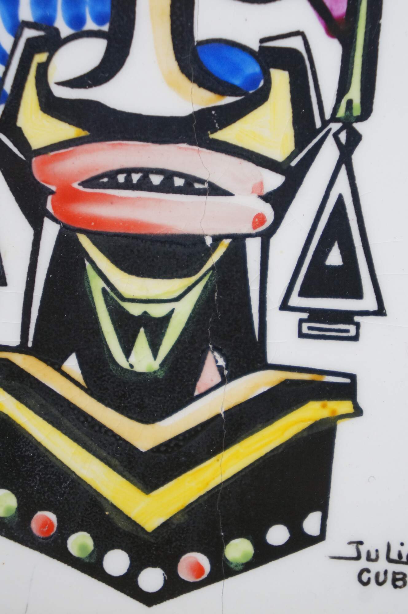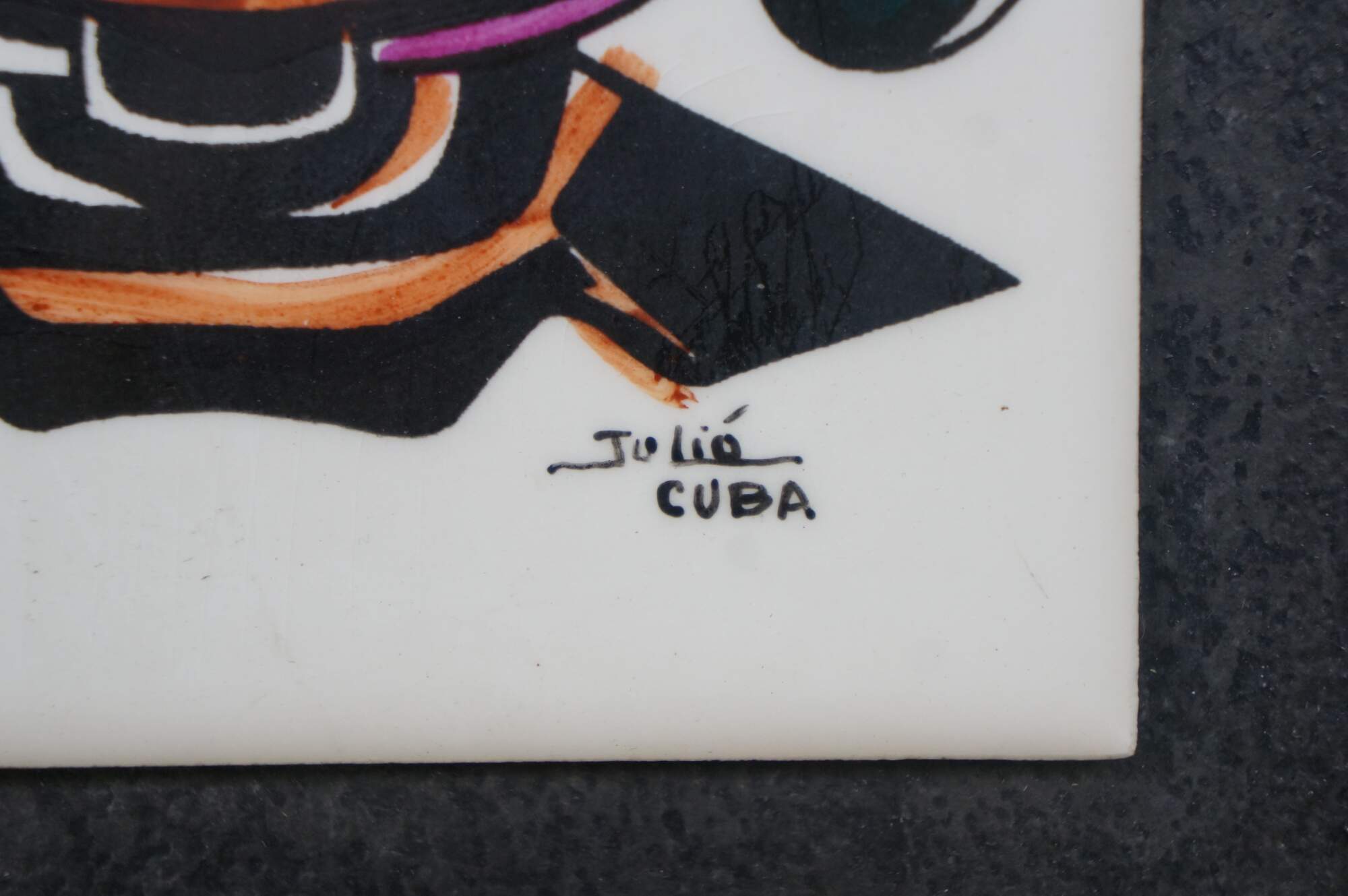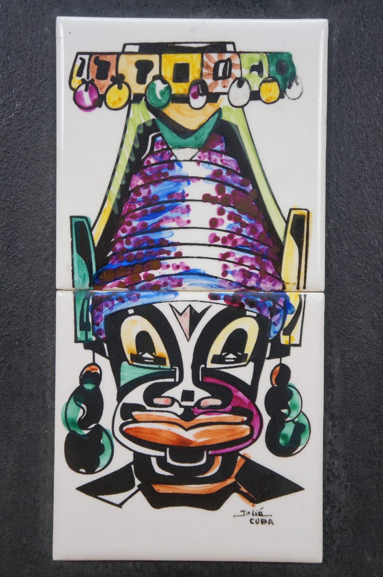 Pair of vintage 20th century works of art on porcelain tiles. Shows a pair of brightly colored faces / masks with exaggerated features, jewelry, and elaborate headdresses. Signed Julio Cuba in lower right. Mounted on black cardstock.