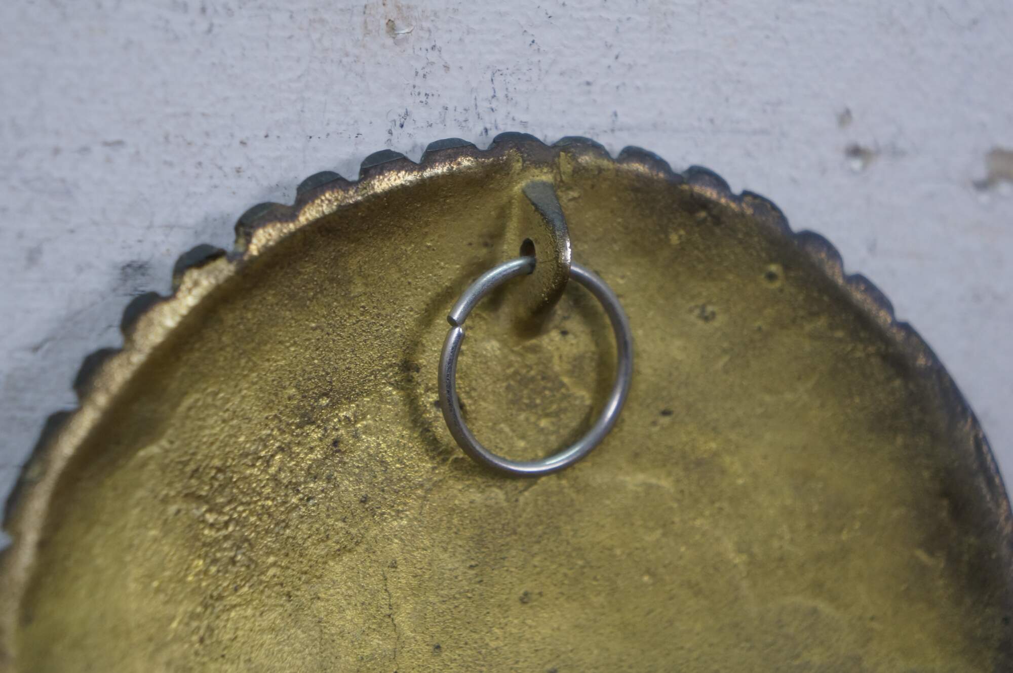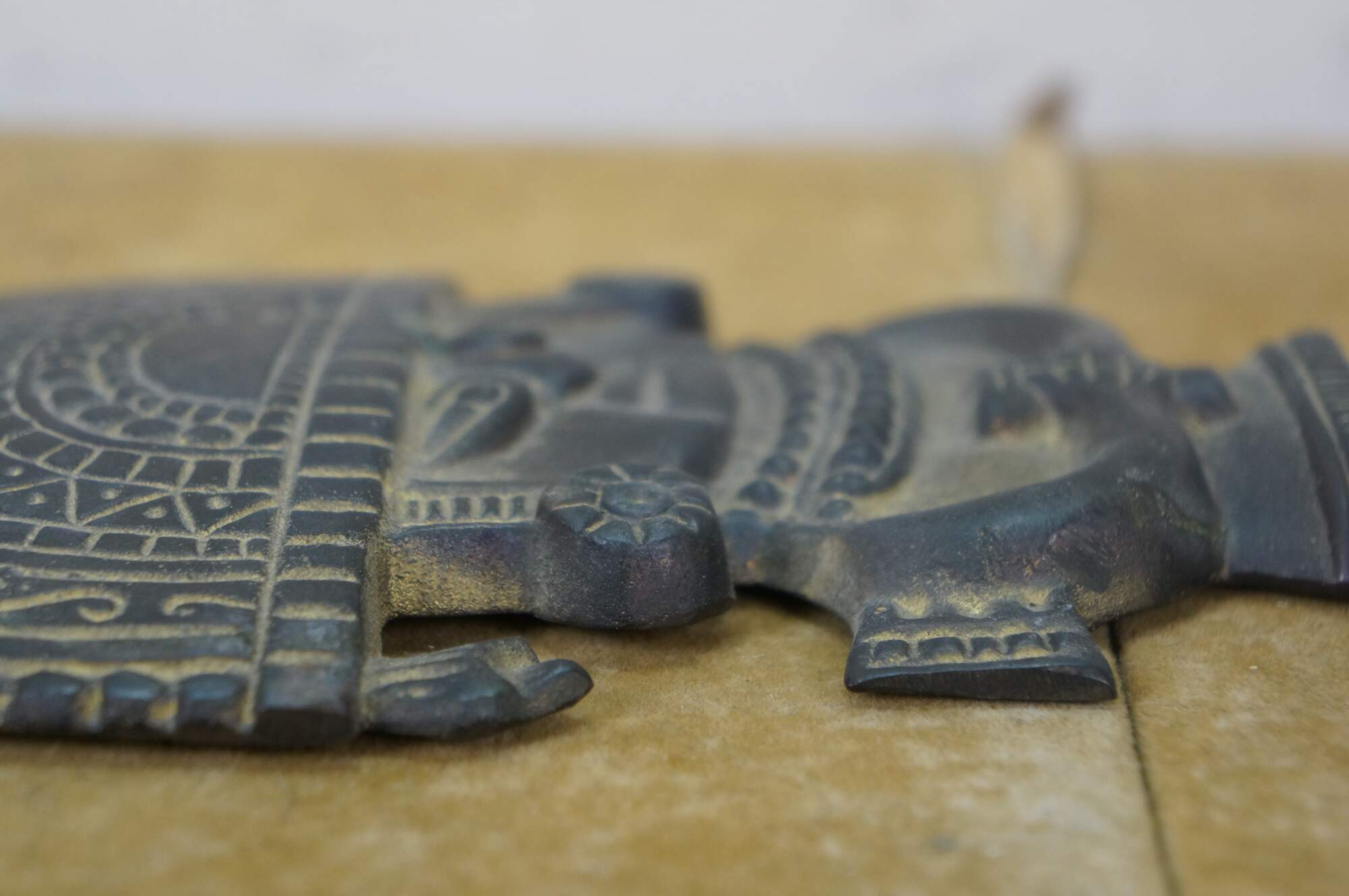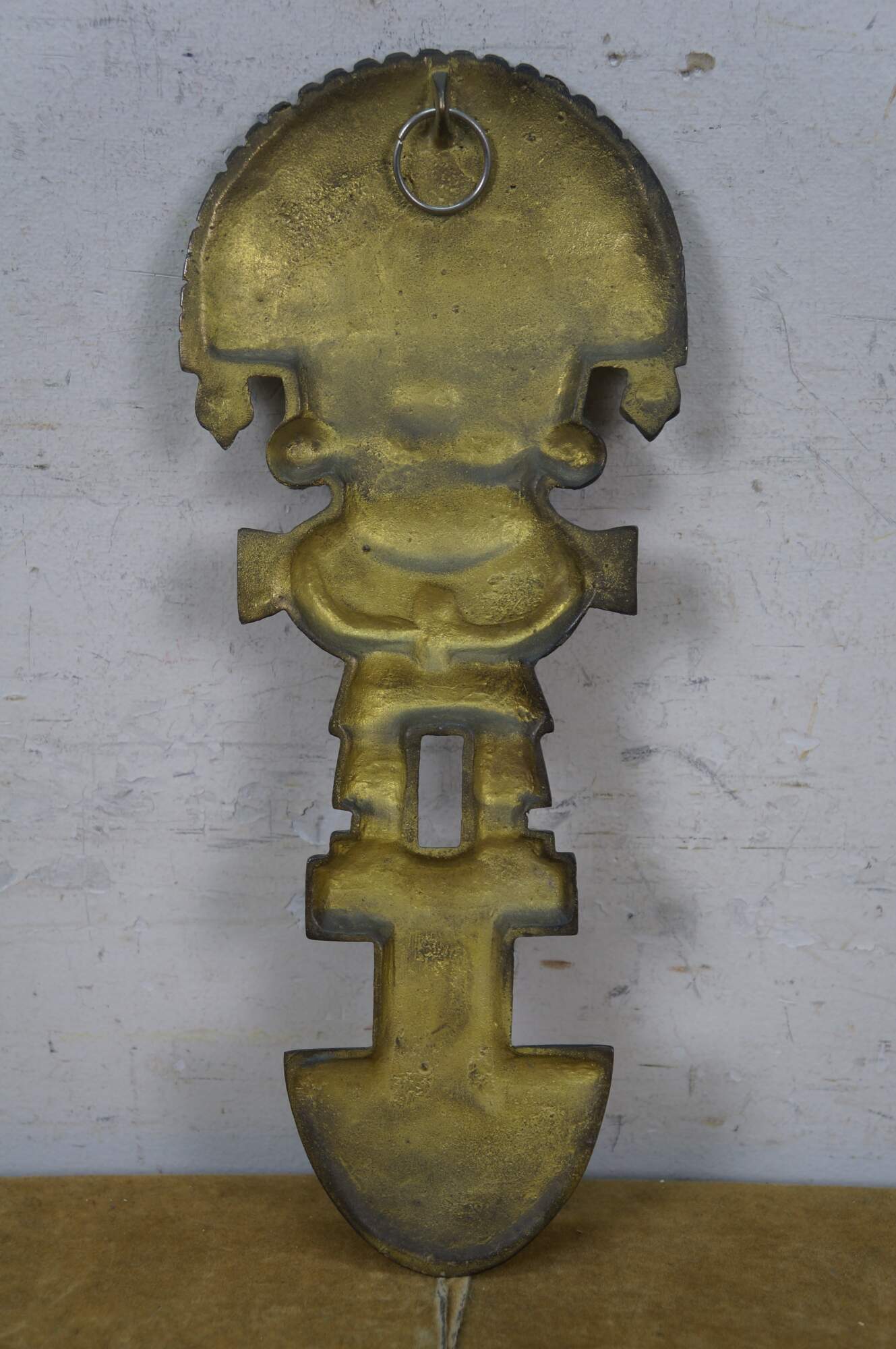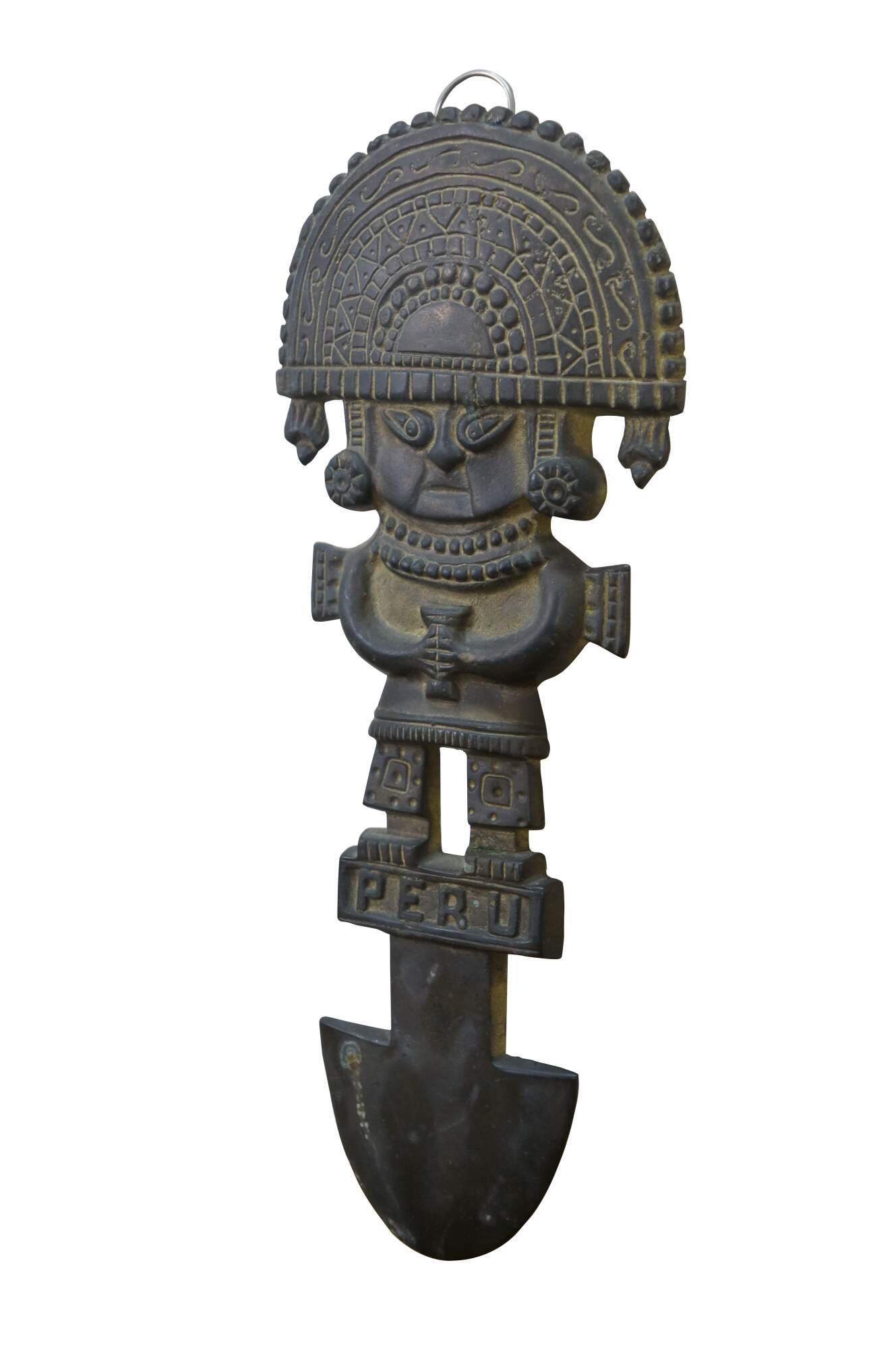 Vintage 20th century brass wall hanging tumi - a tumi is a type Peruvian ceremonial knife now recreated as souvenir items and a symbol of Peru, often hung on the wall for good luck and protection. Features the figure of an Incan / Aztec warrior god in eleaborate headdress and jewelry holding a cup, standing above a crescent shaped axe blade, marked with the word Peru.