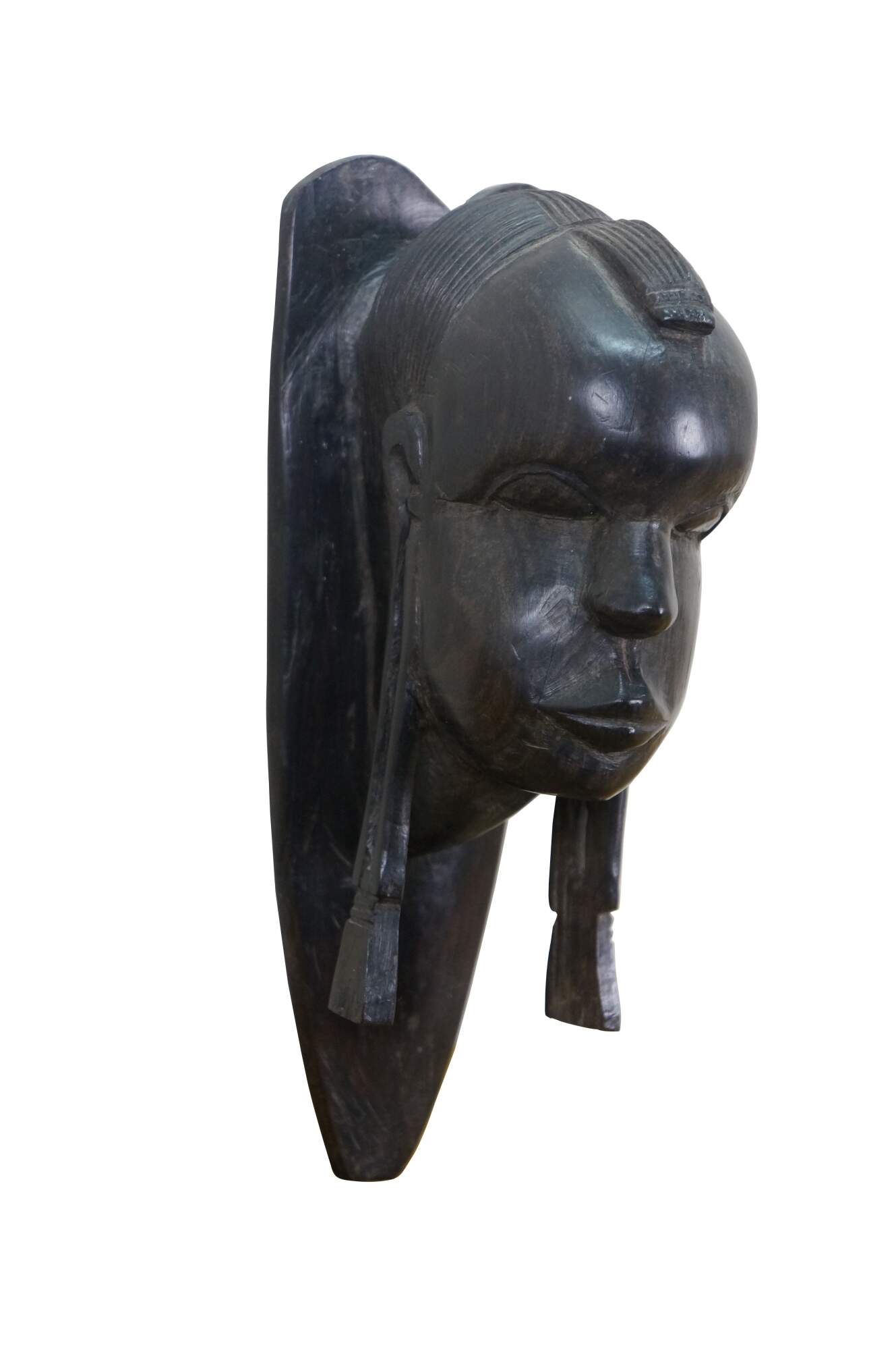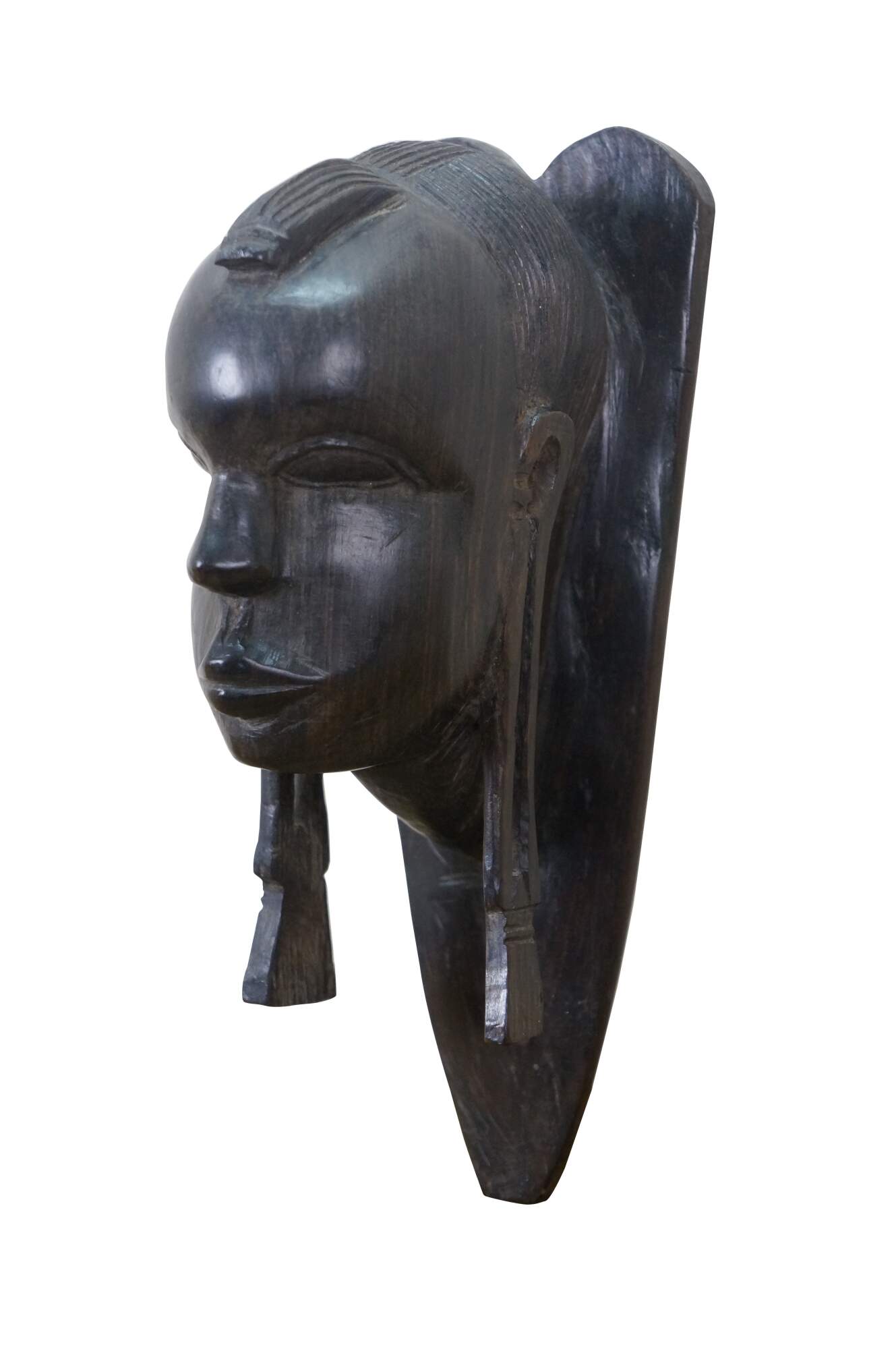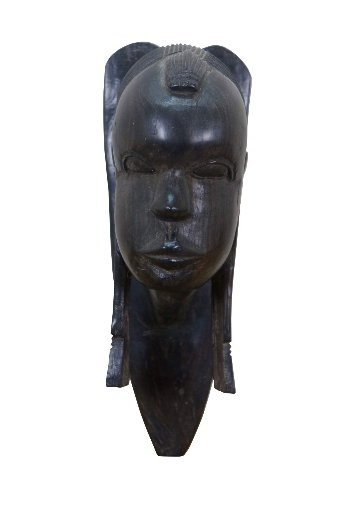 Vintage 20th century hand carved blackwood wall hanging bust - African folk art figure of a face with traditional hair style.