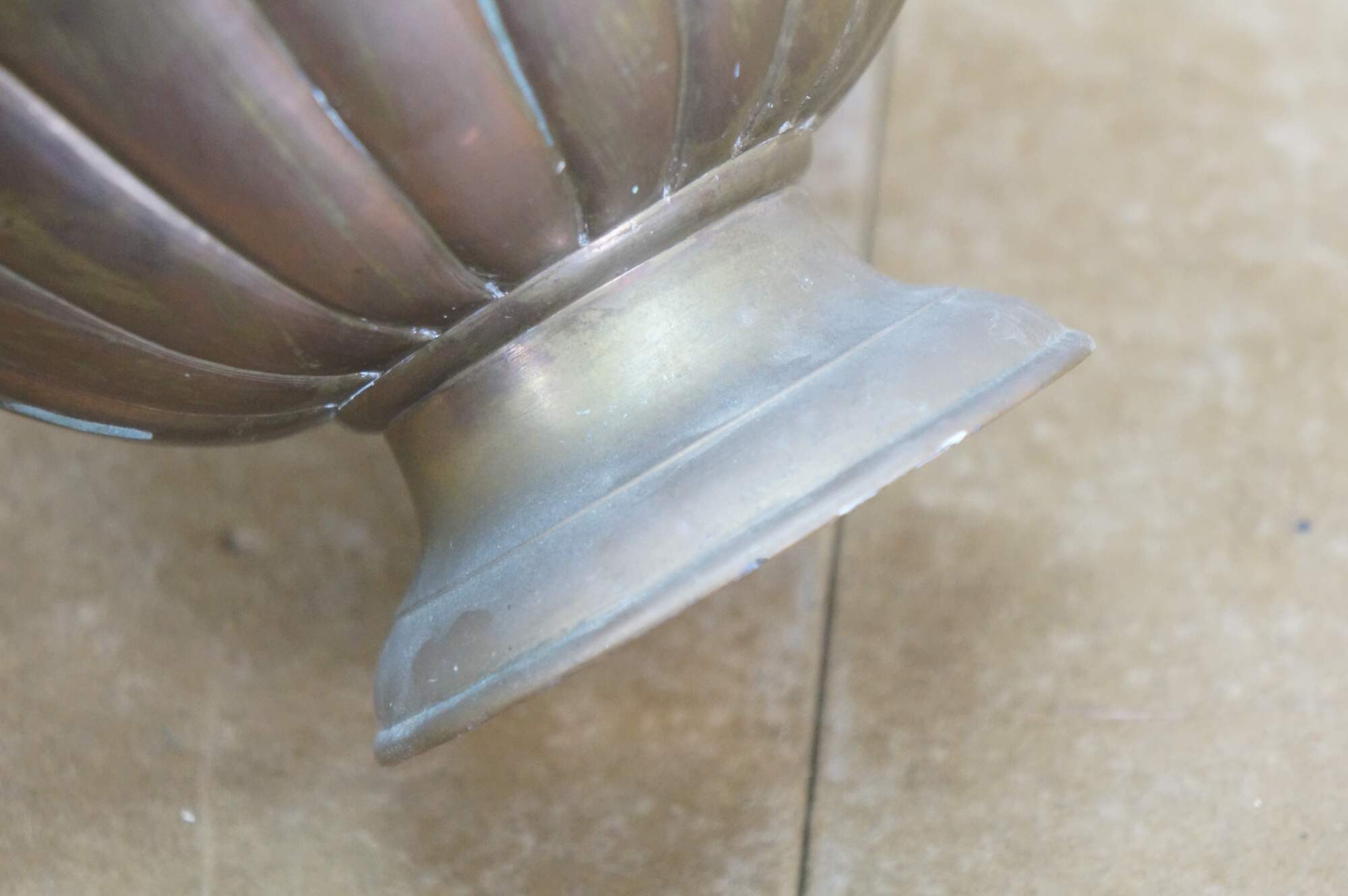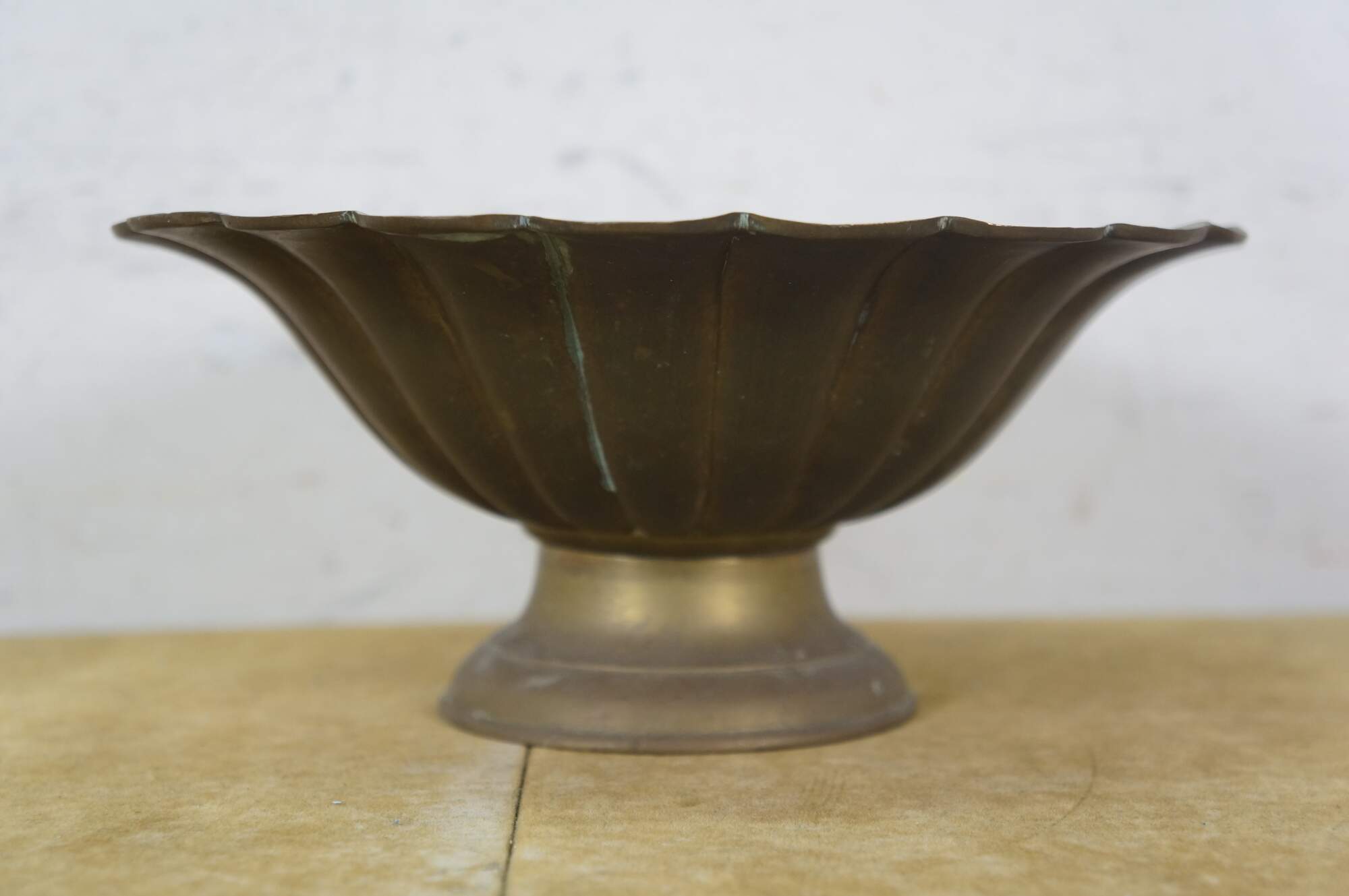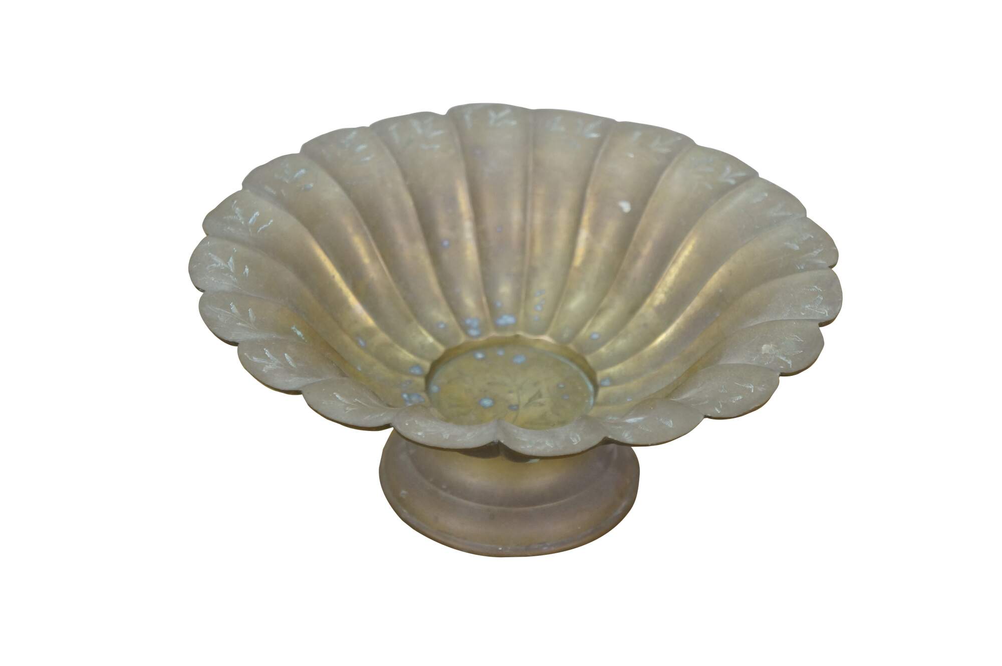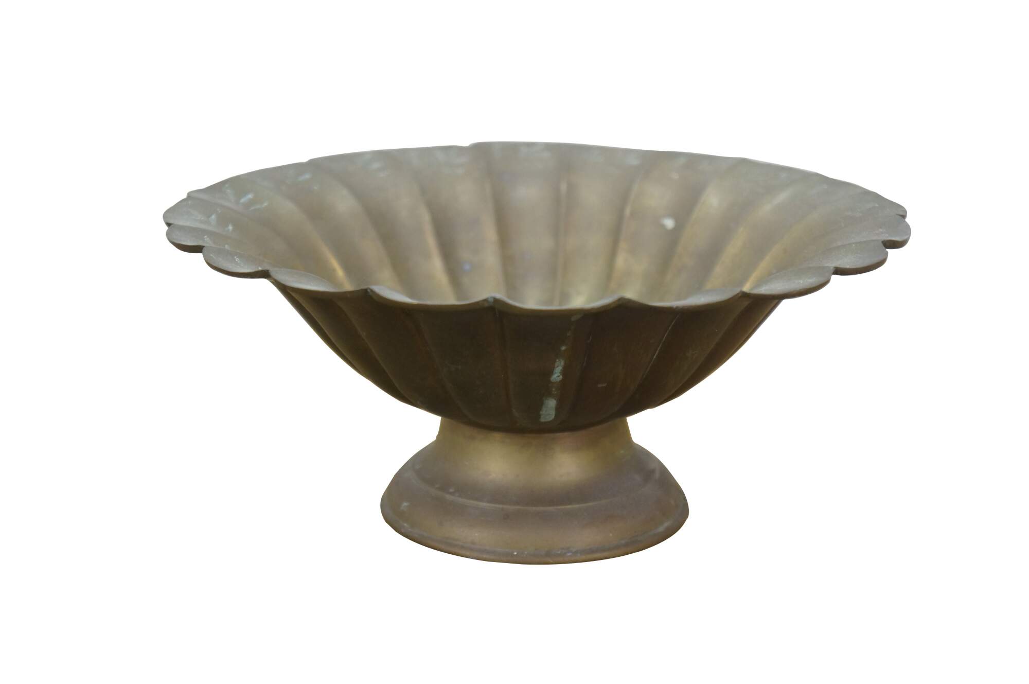 Late 20th century brass footed compote / dish - scalloped edge, fluted, flower shaped bowl with leaf etched edges and center with round pedestal base. Made in India.