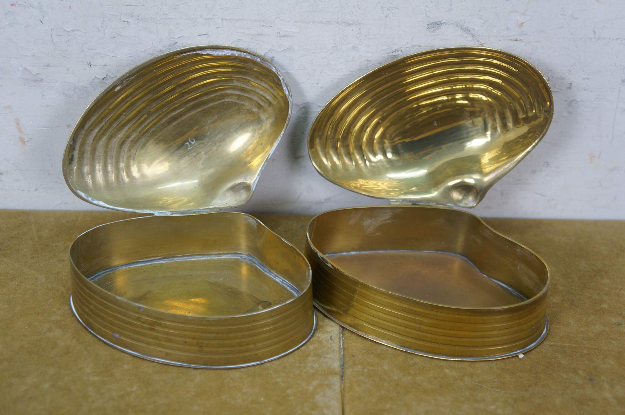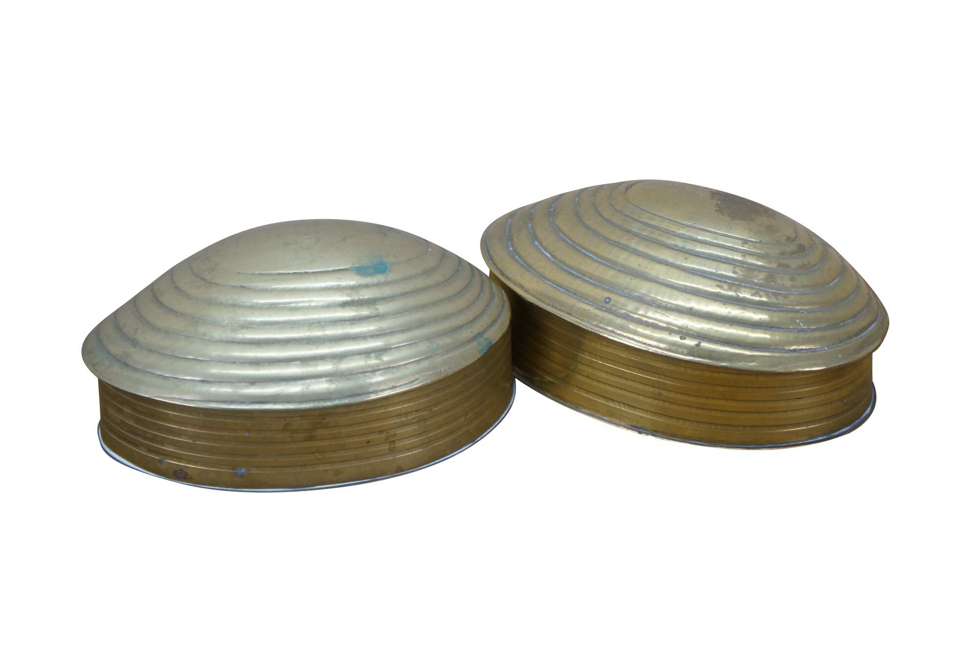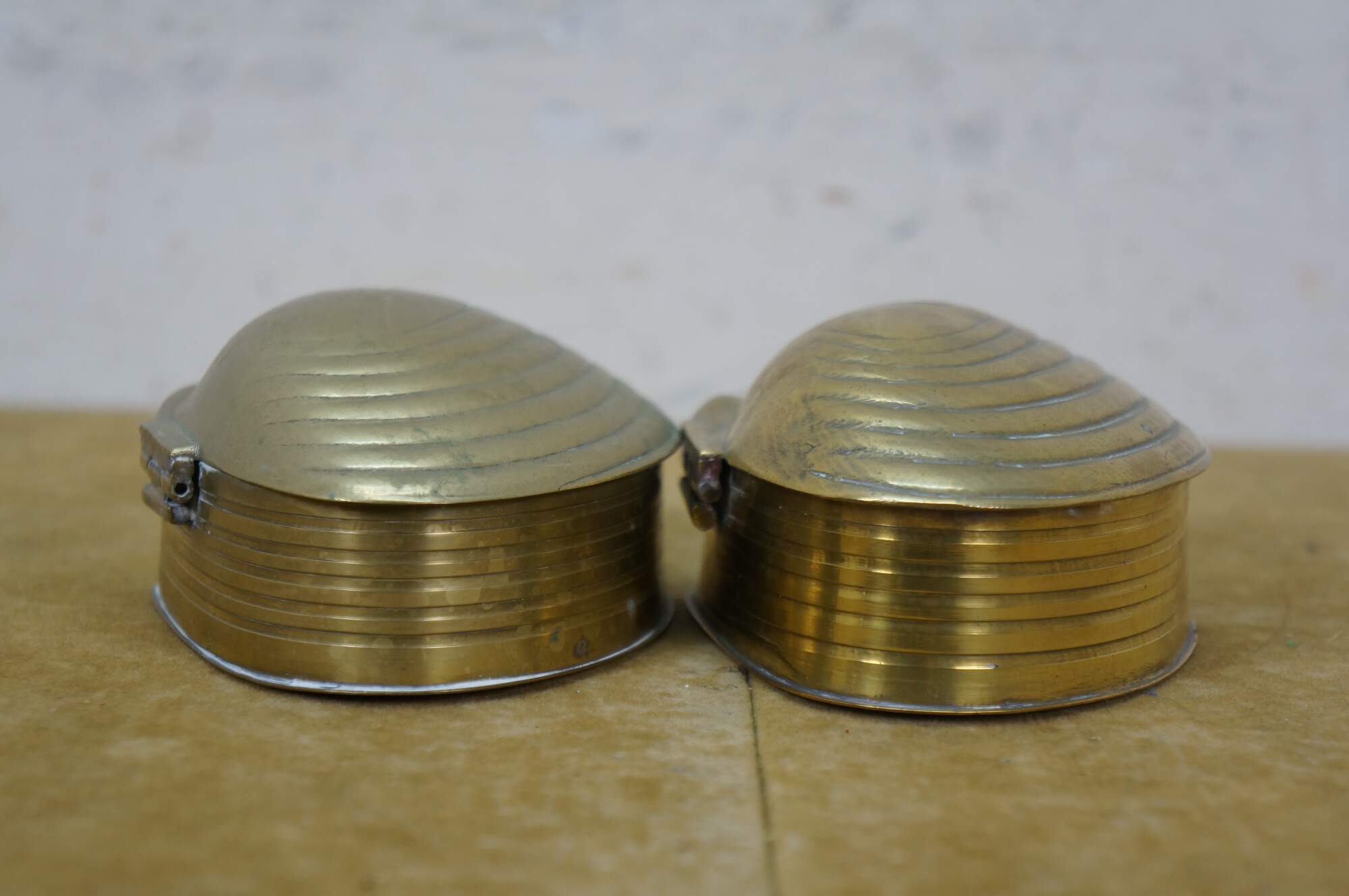 Pair of mid to late 20th century brass trinket / keepsake boxes with clamshell shaped flip top lid. Made in India.