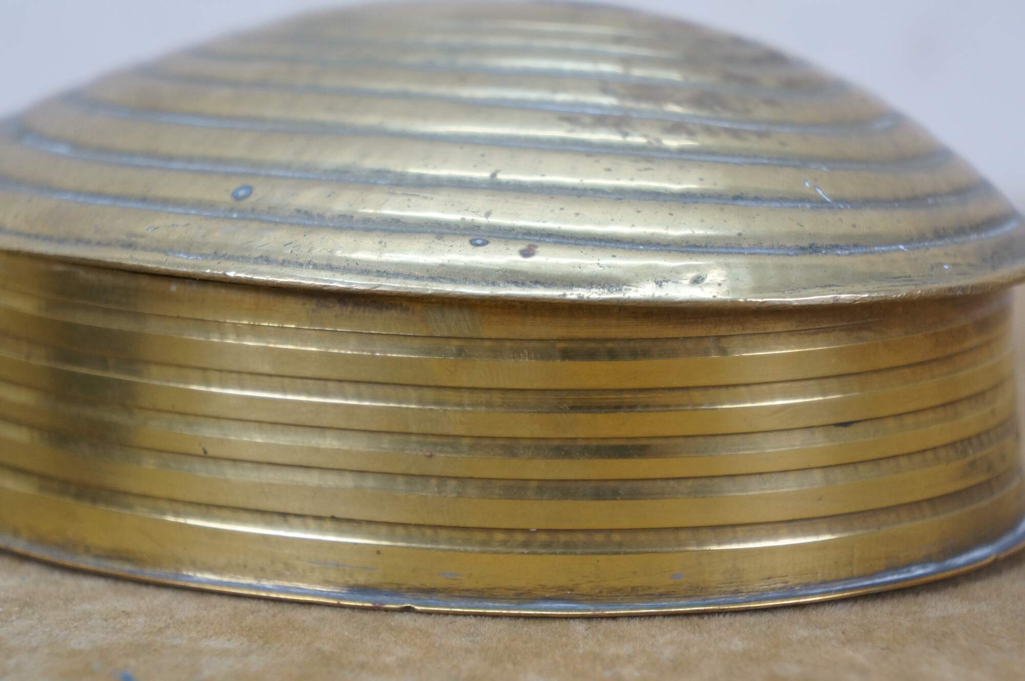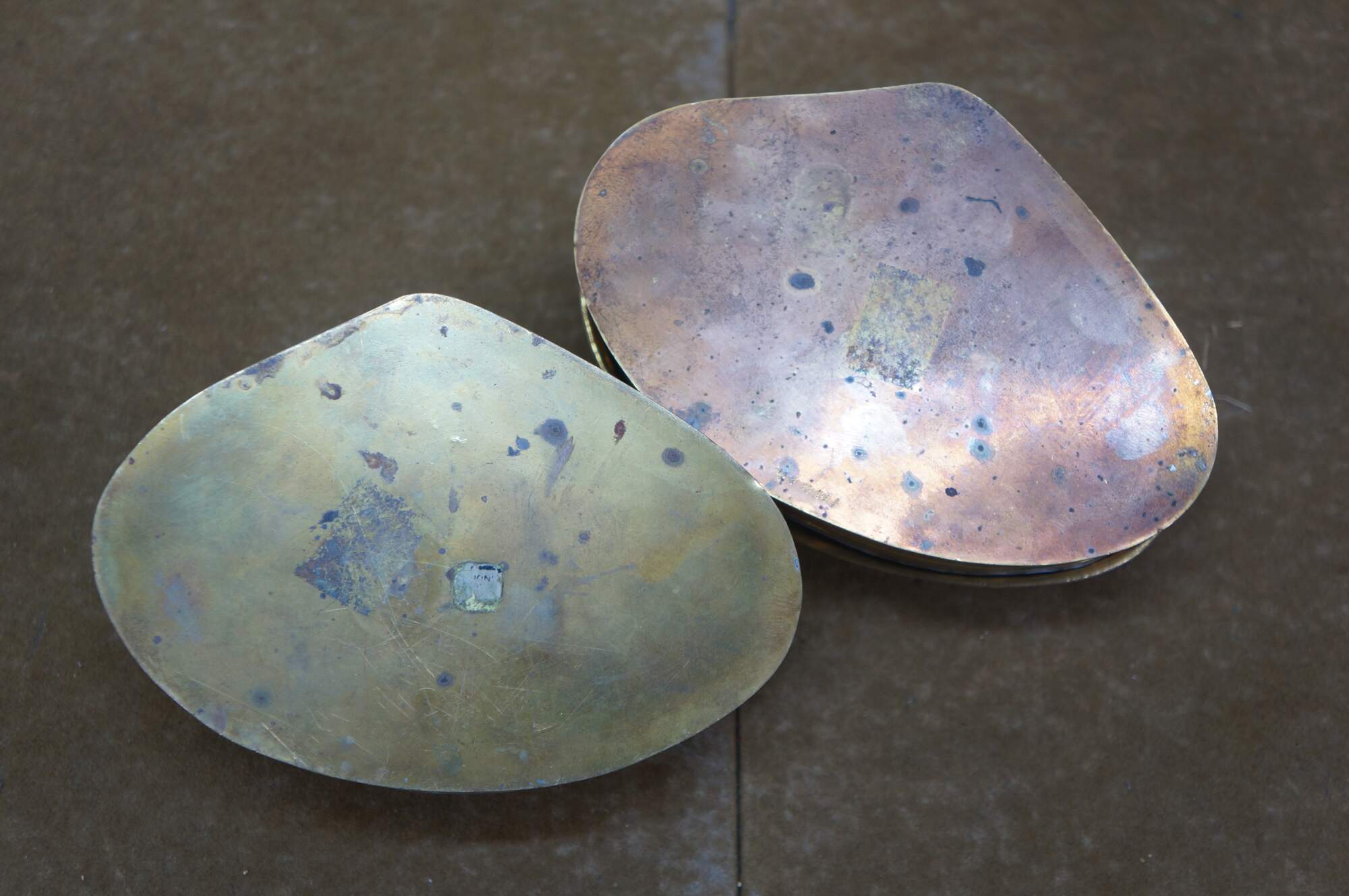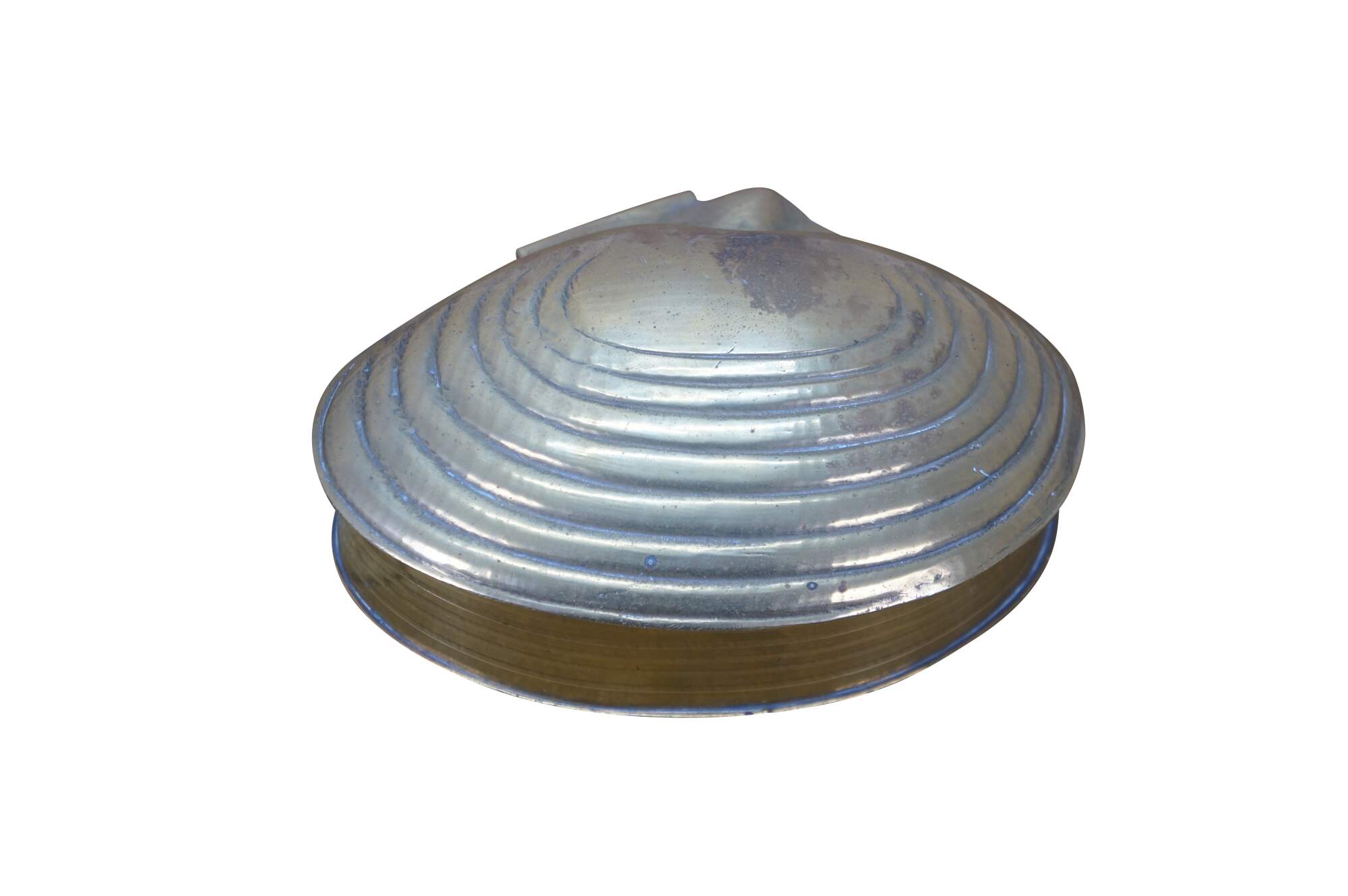 Pair of mid to late 20th century brass trinket / keepsake boxes with clamshell shaped flip top lid. Made in India.