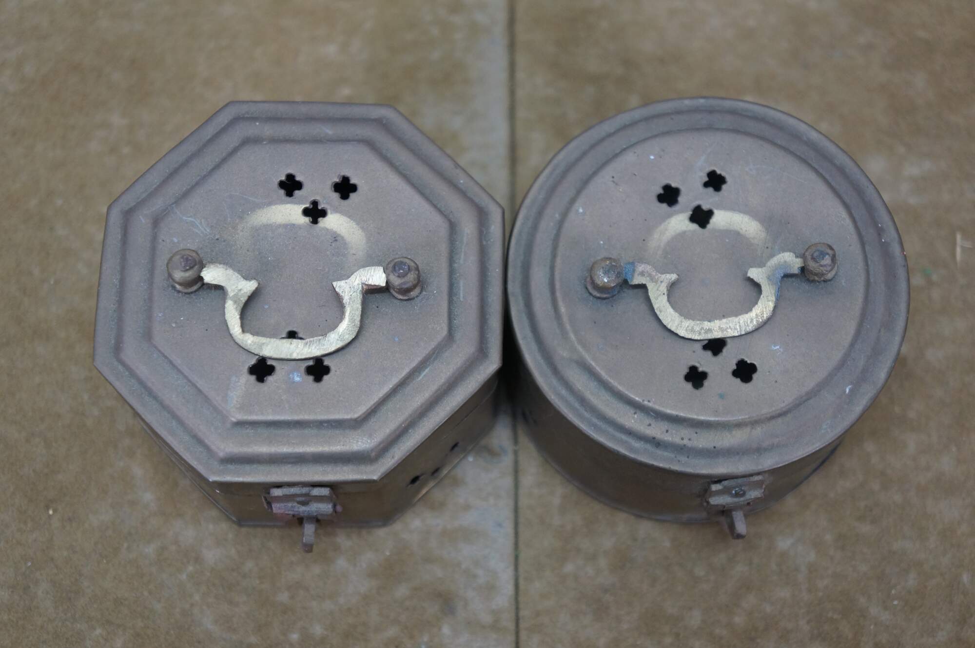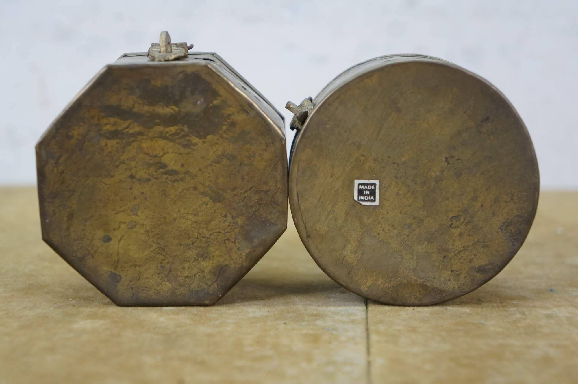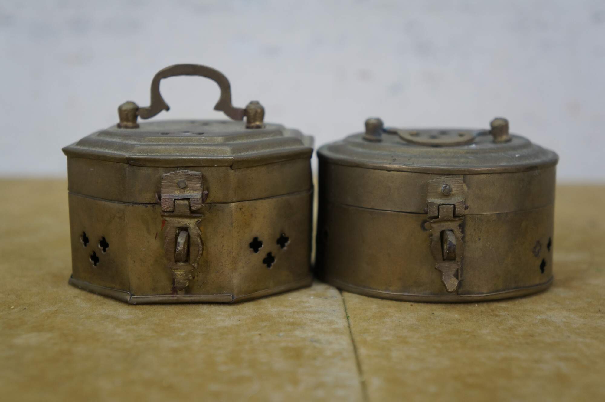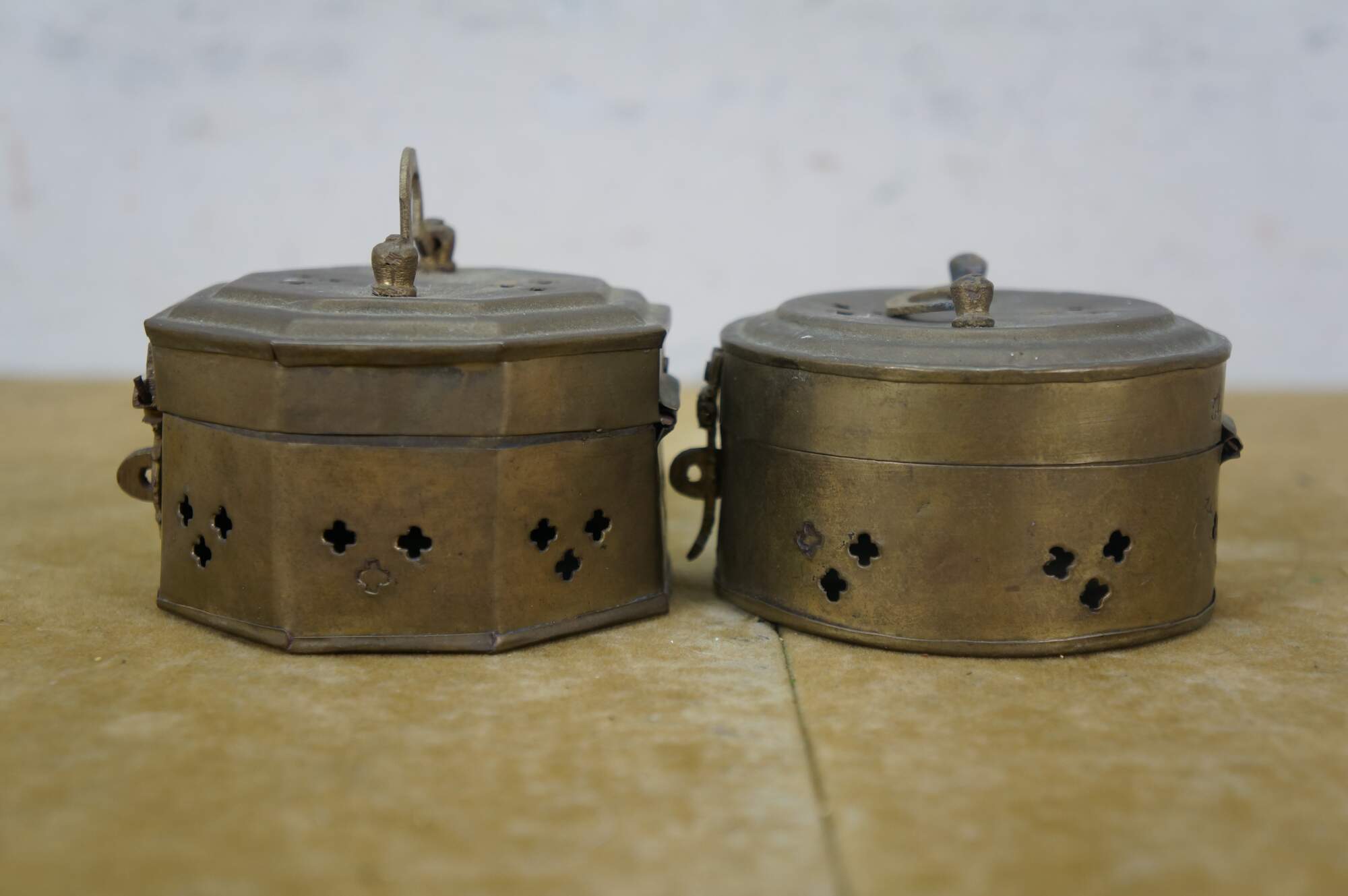 Pair of mid to late 20th century Indian brass cricket / trinket boxes. One round and one octagonal with pierced details, lockable hasp closure and rotating bail handles on top.