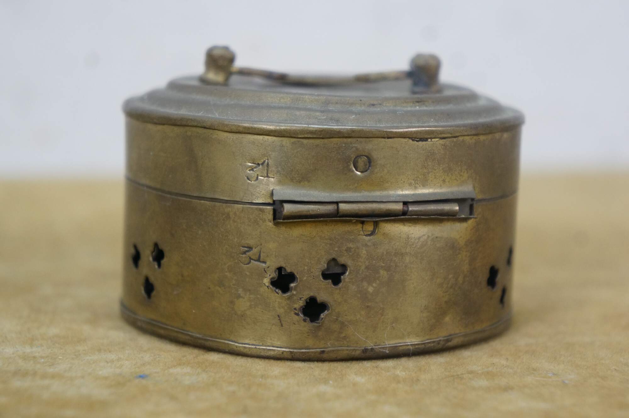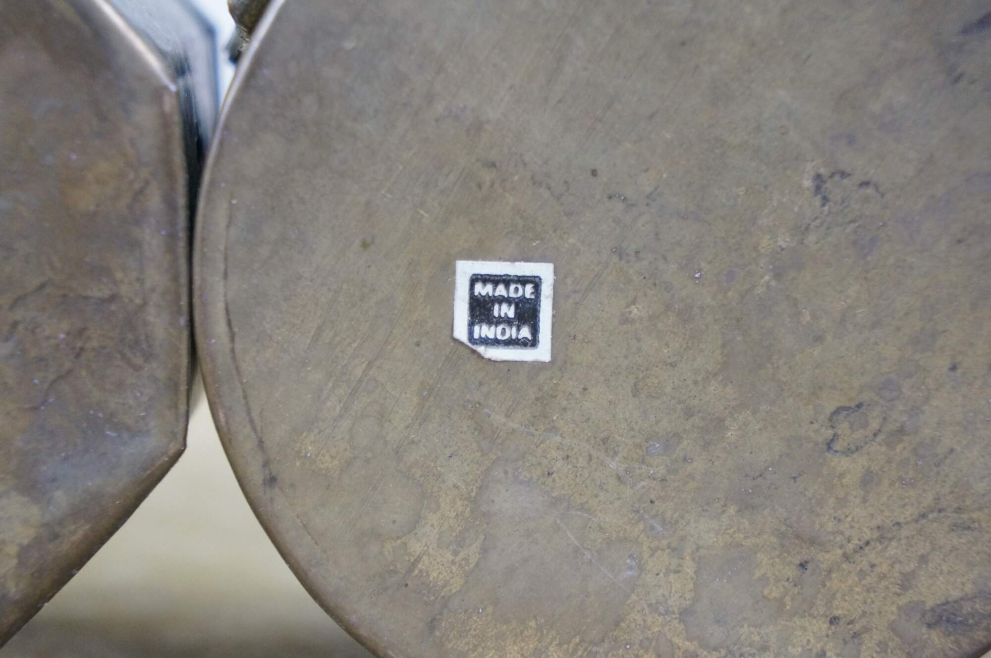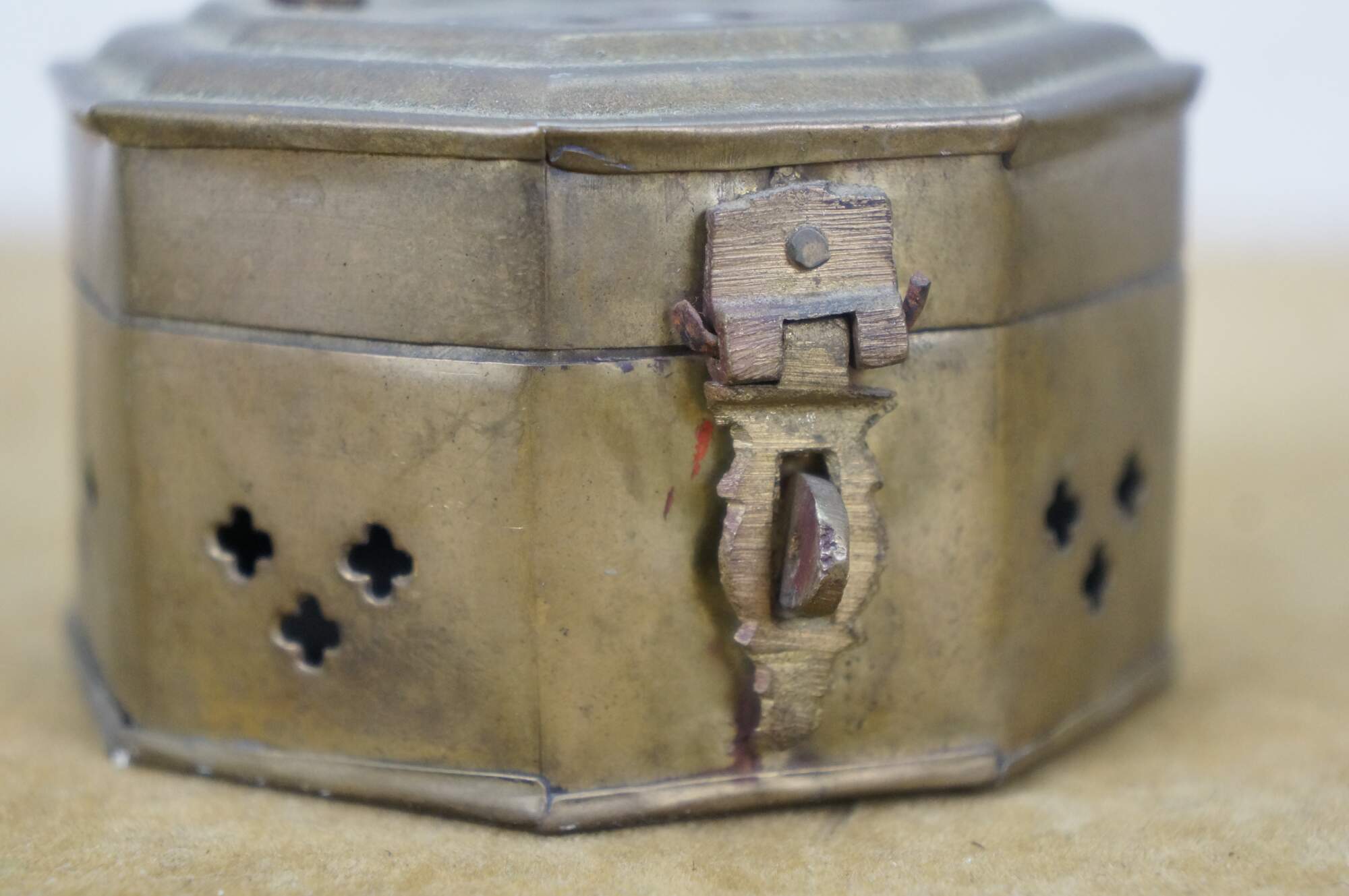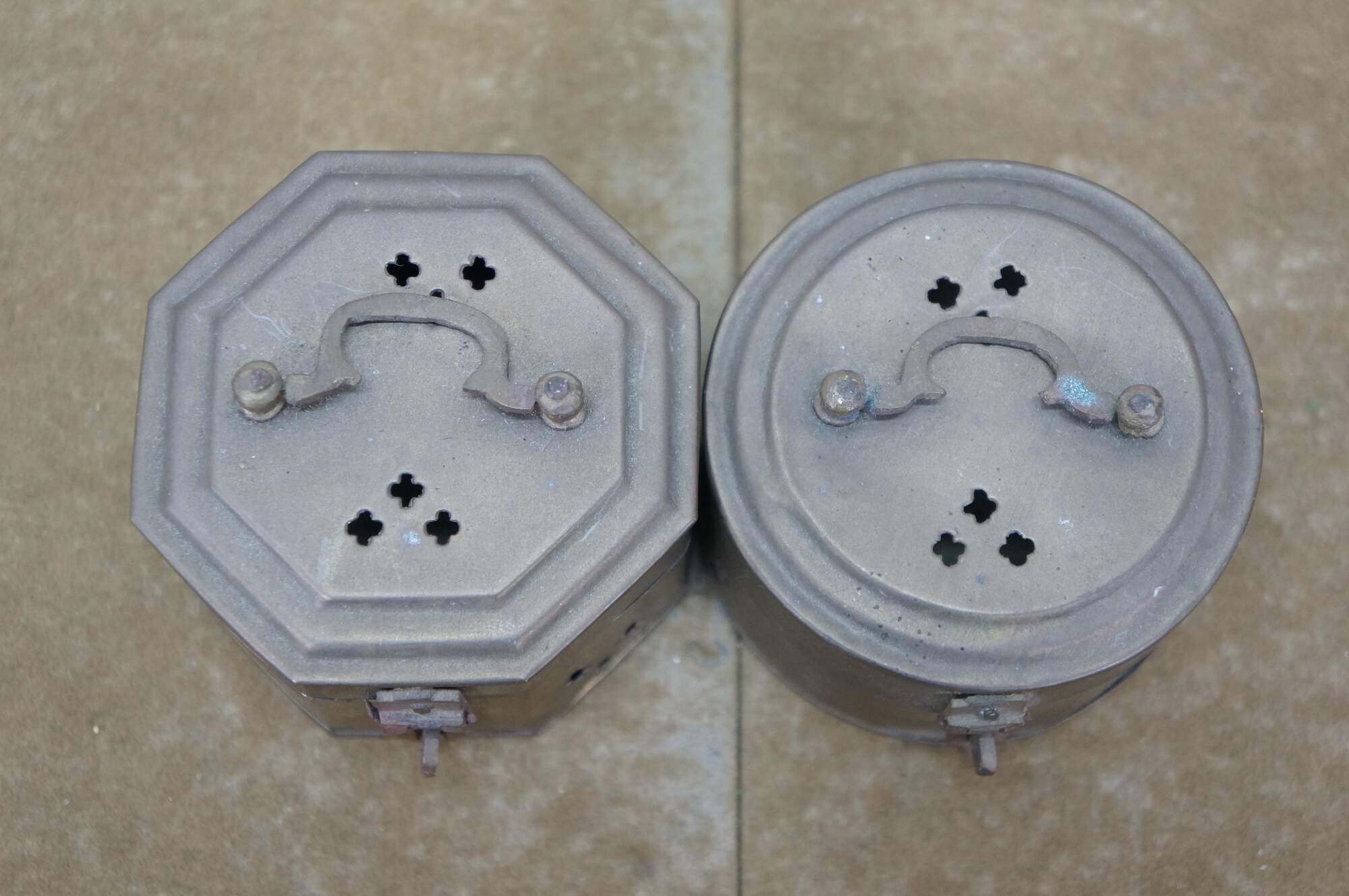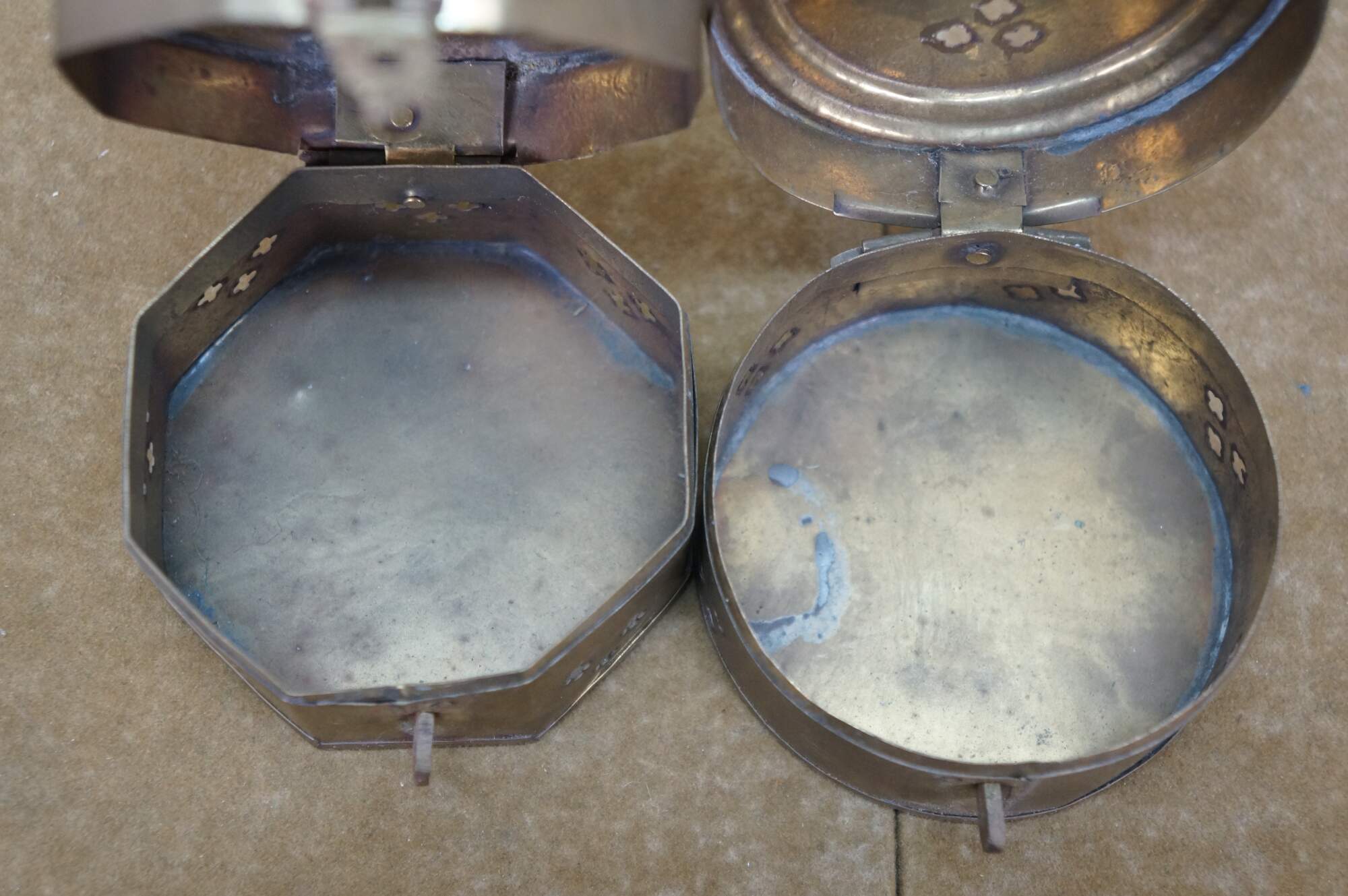 Pair of mid to late 20th century Indian brass cricket / trinket boxes. One round and one octagonal with pierced details, lockable hasp closure and rotating bail handles on top.