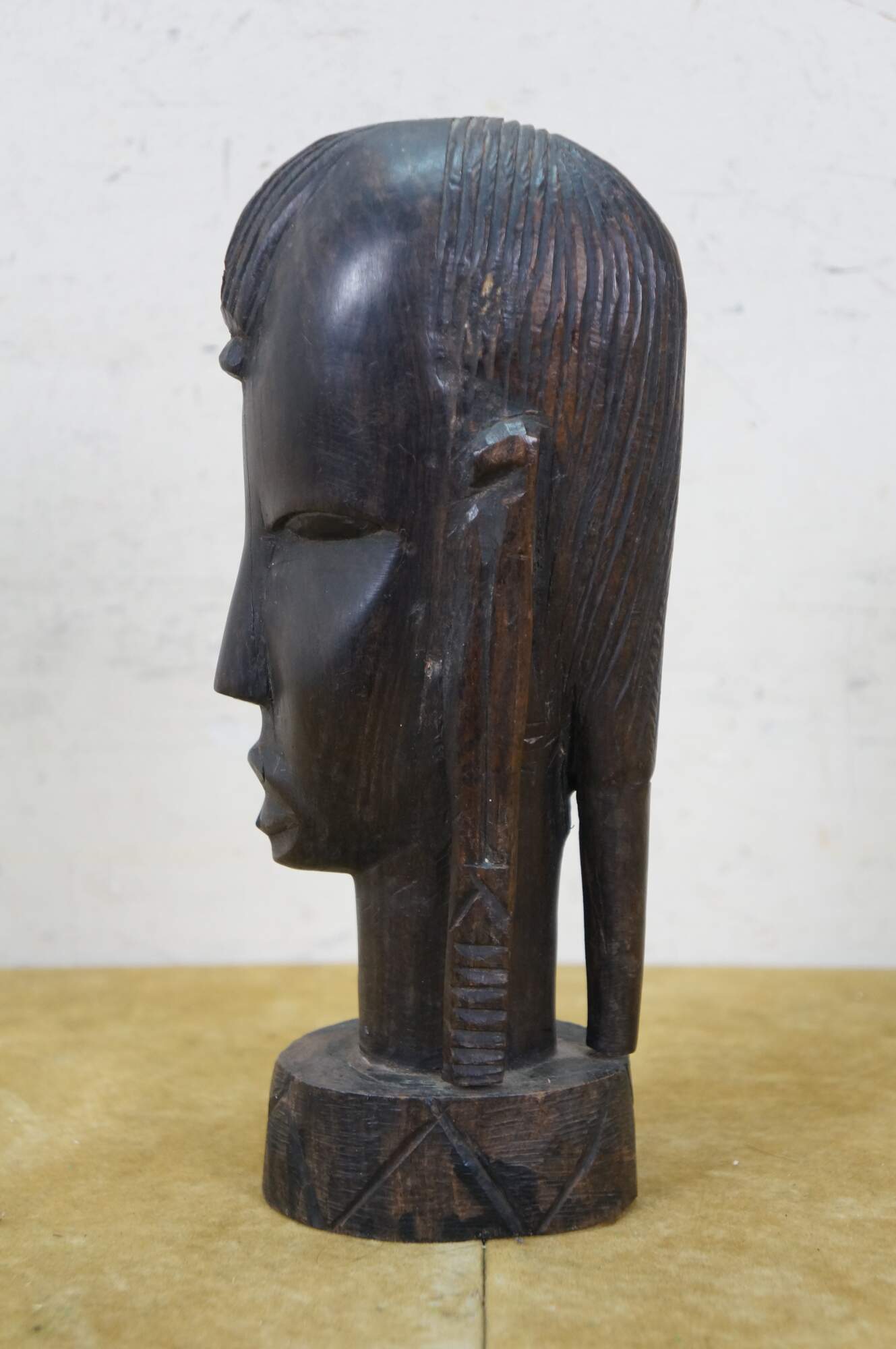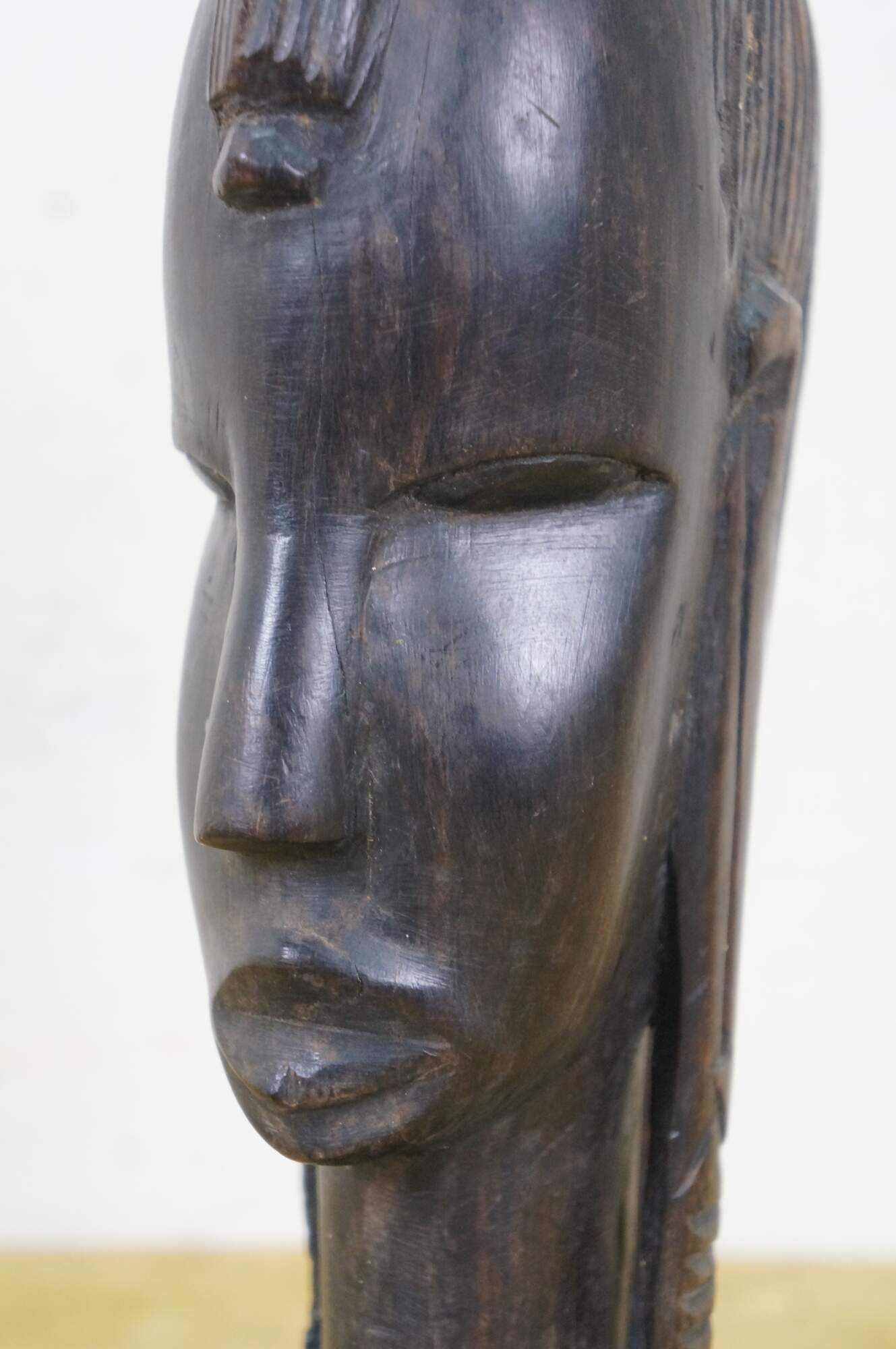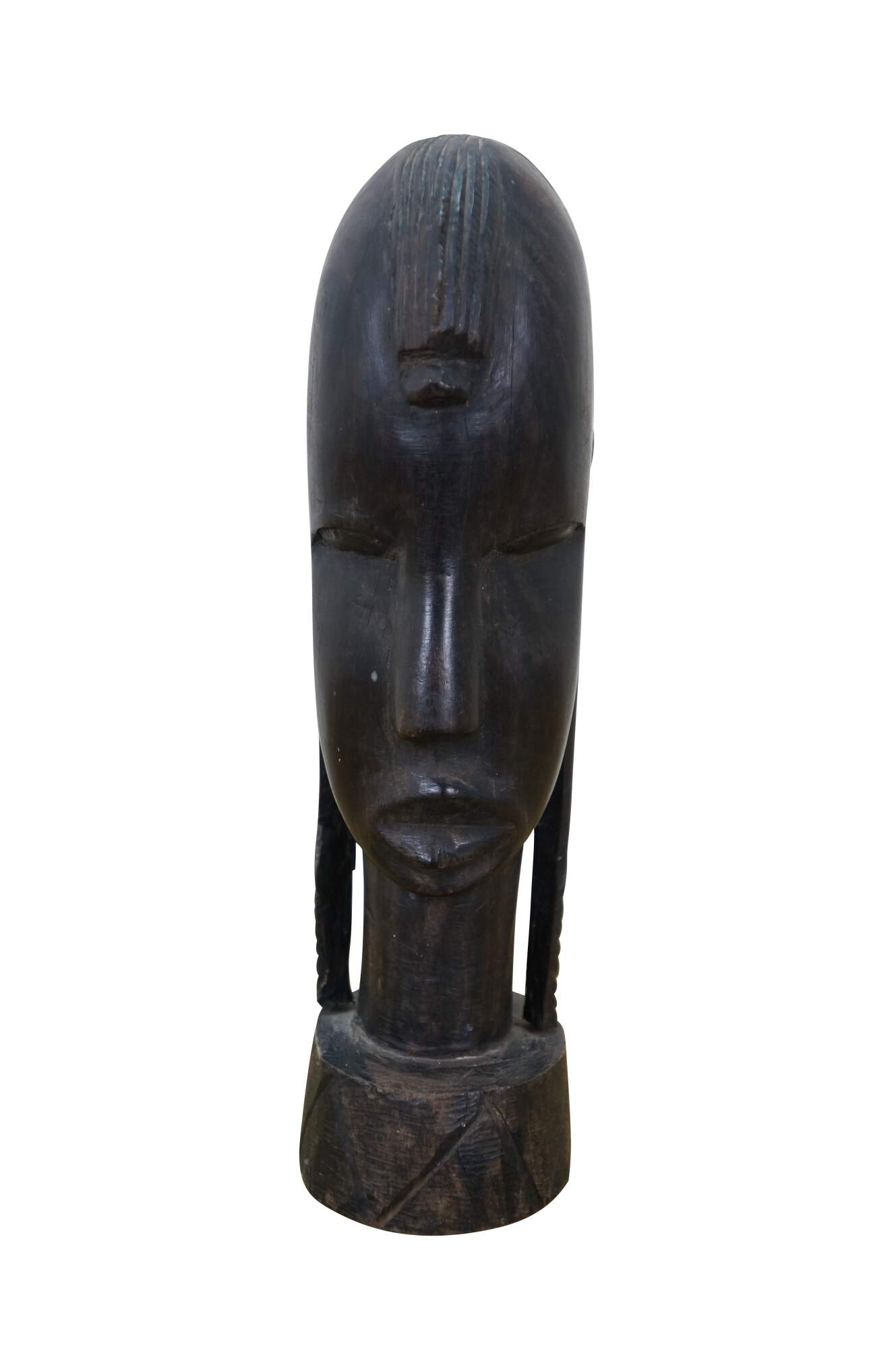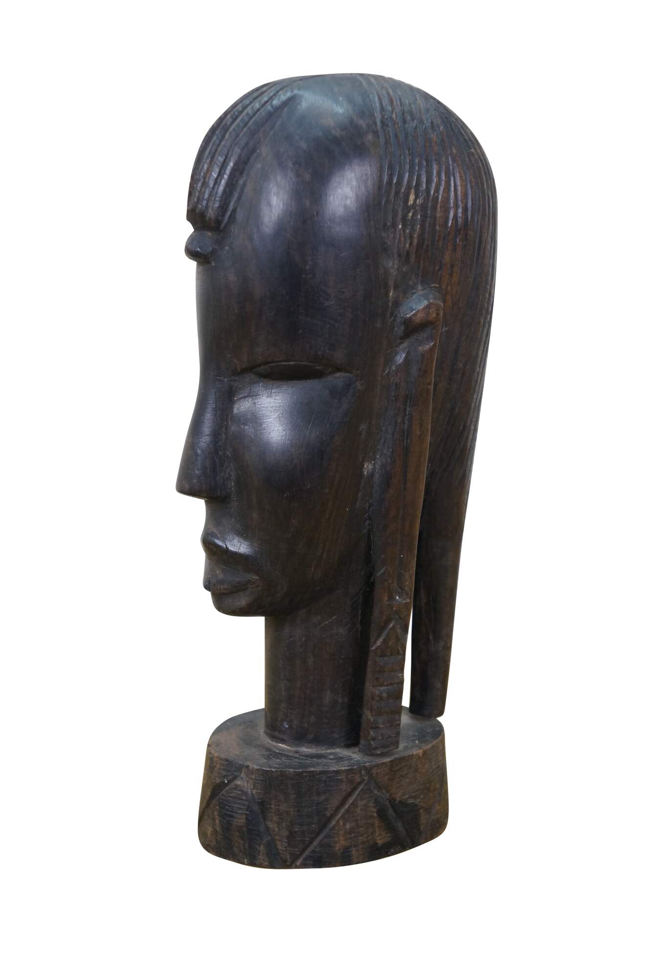 Vintage 20th century hand carved Blackwood statue sculpture - African folk art style warrior face with elongated features, rectangular earrings and chevron pattern collar.