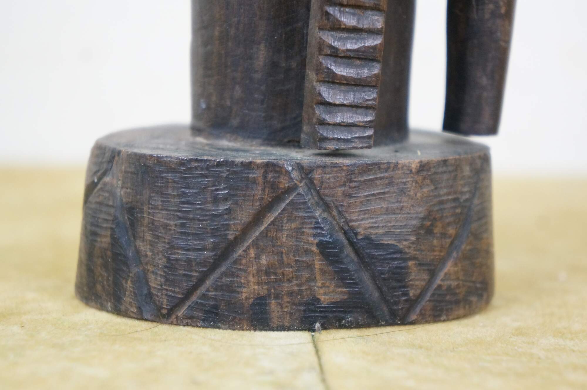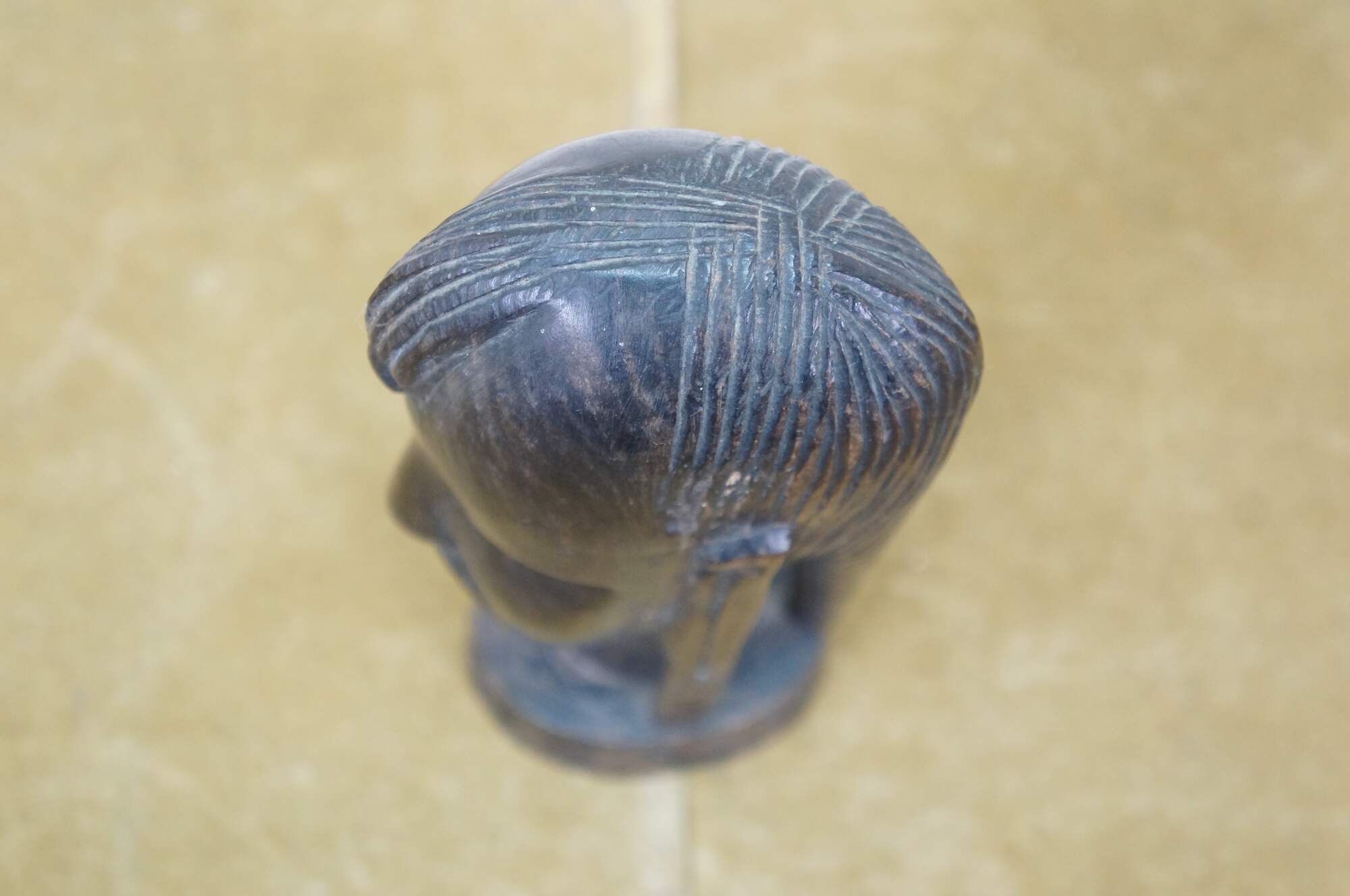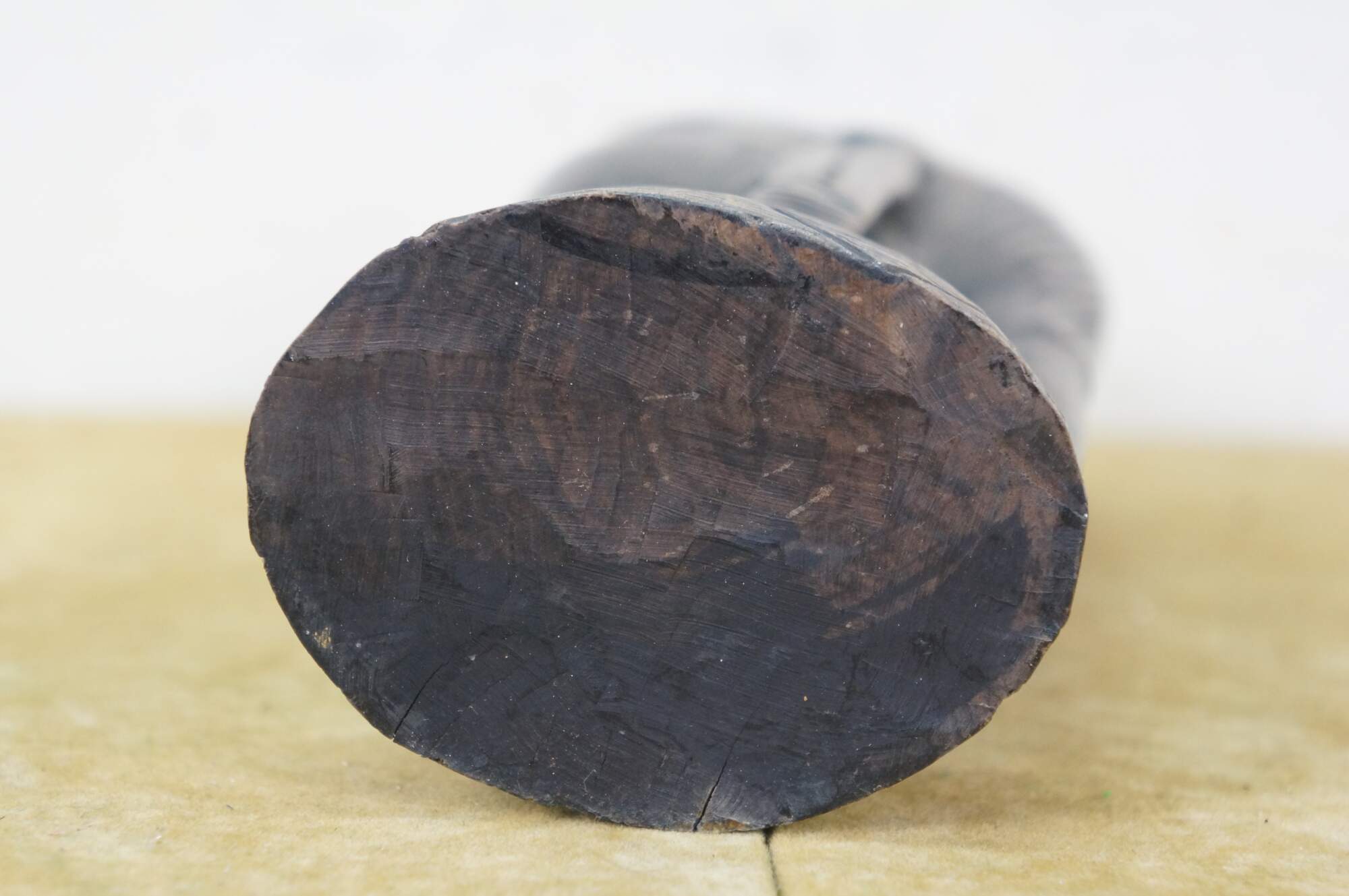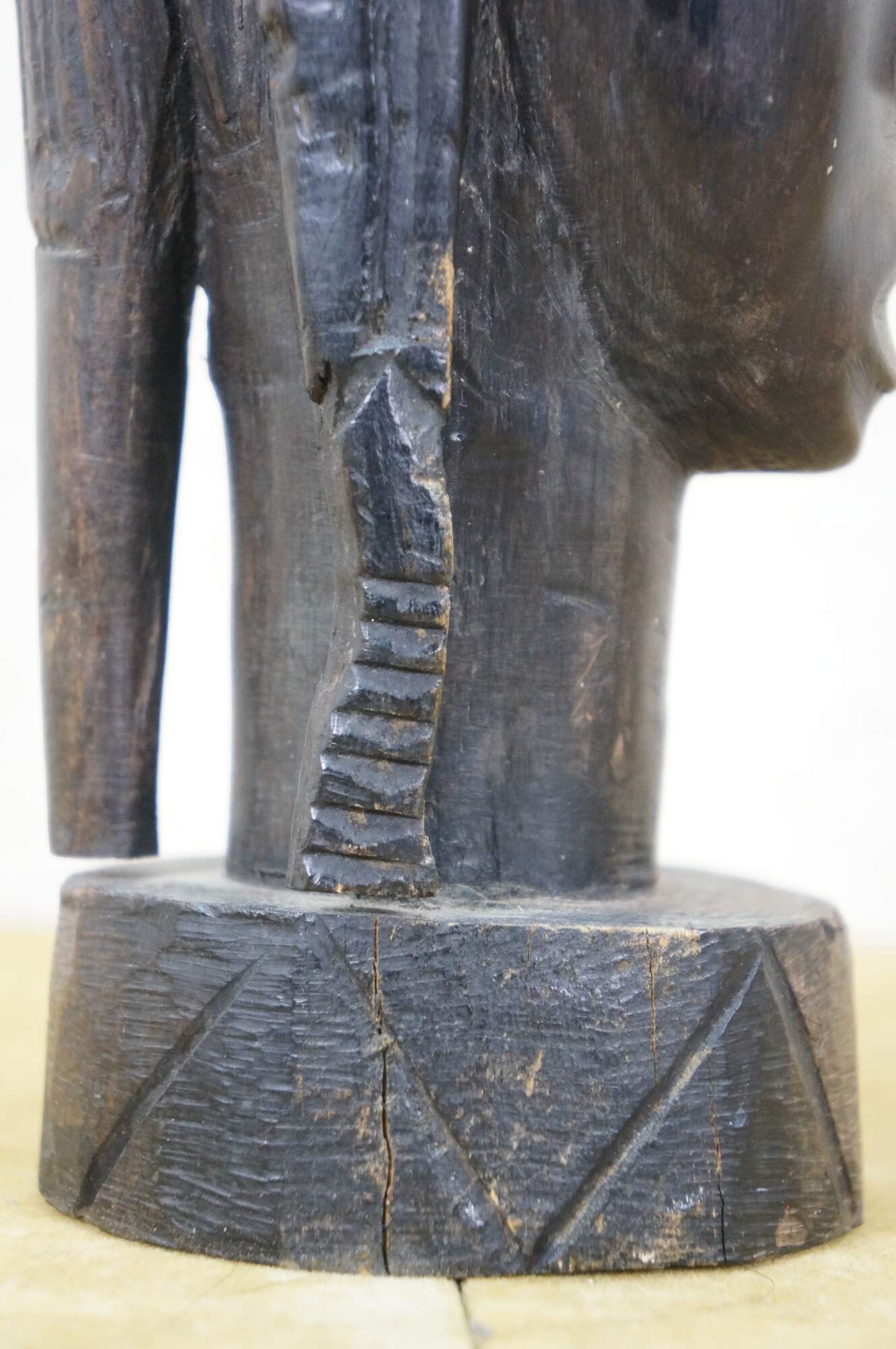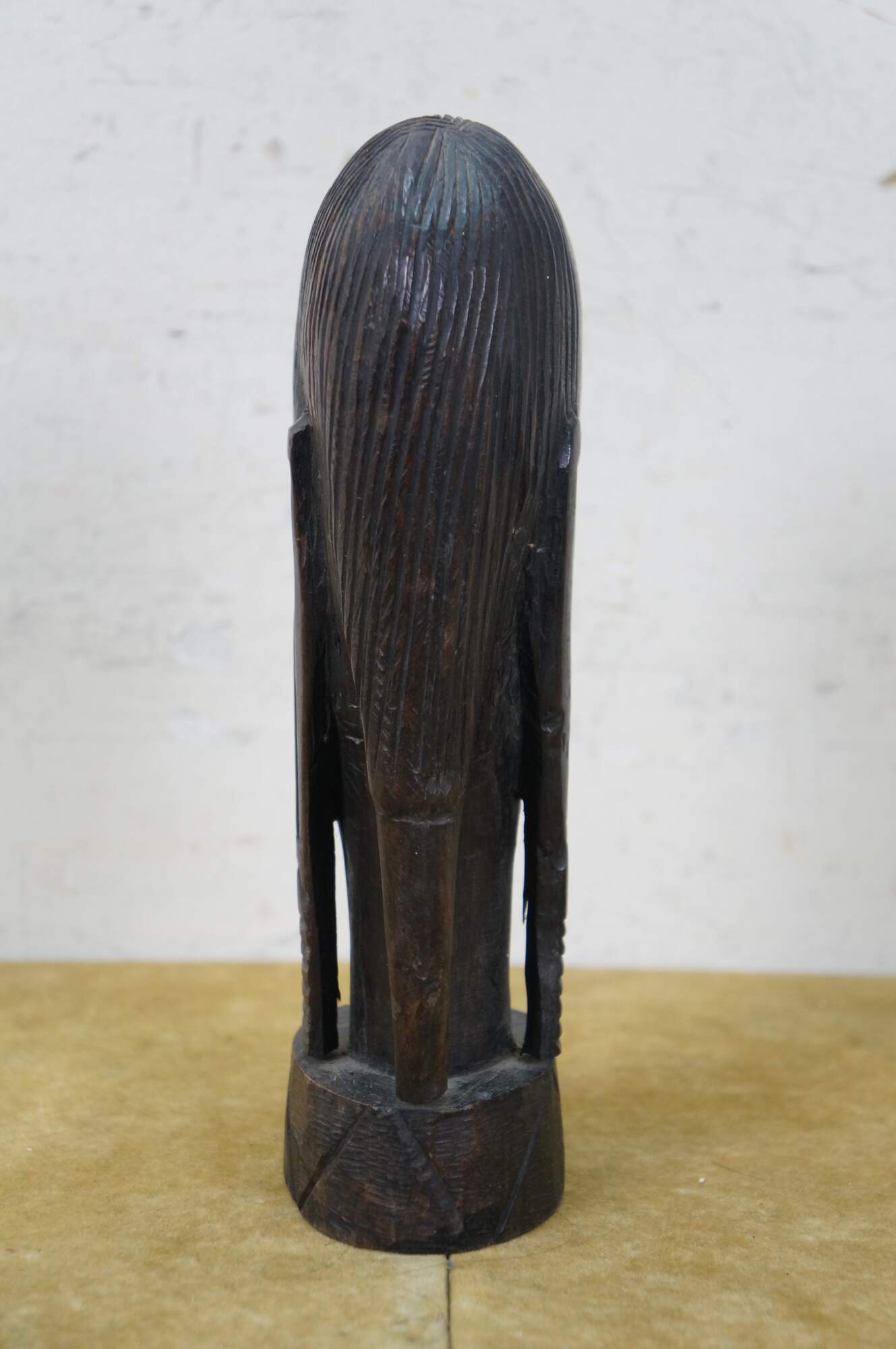 Vintage 20th century hand carved Blackwood statue sculpture - African folk art style warrior face with elongated features, rectangular earrings and chevron pattern collar.