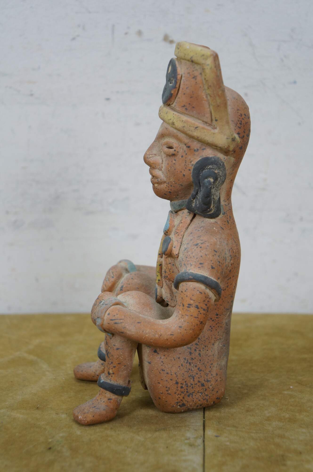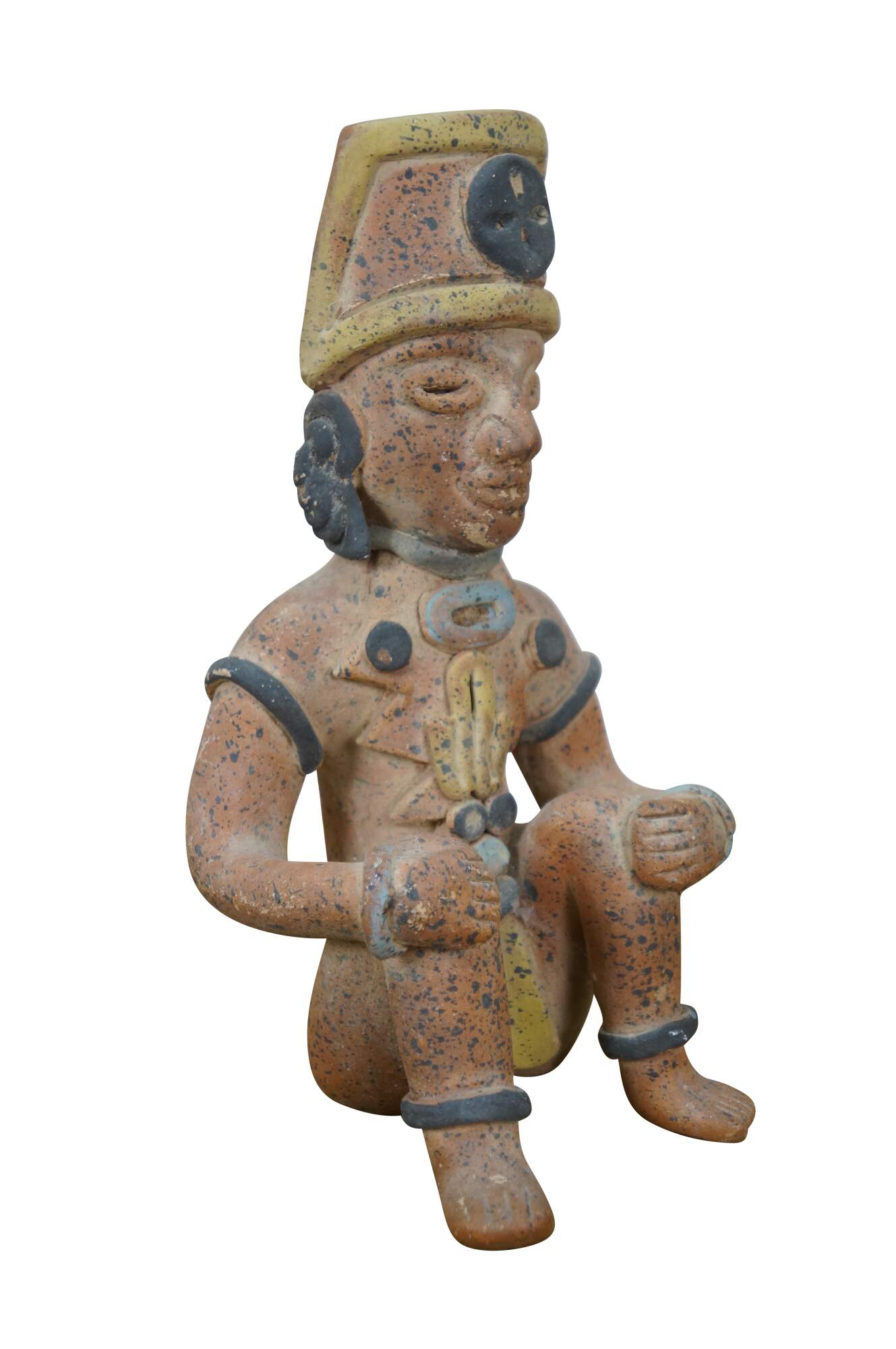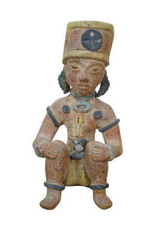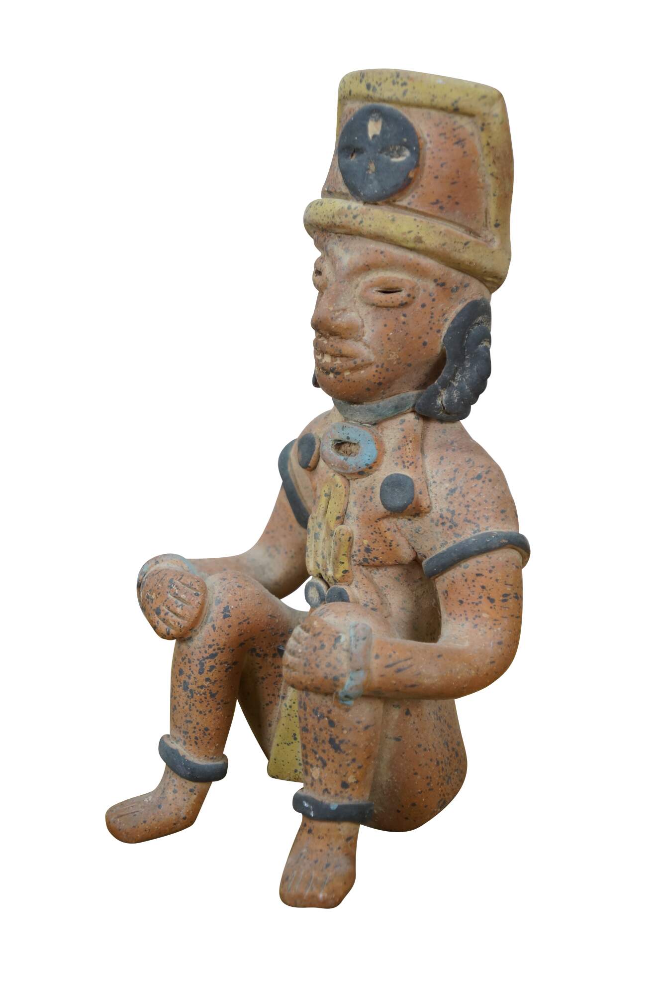 Vintage 20th century terracotta figurine / sculpture in the shape of an Aztec / Mayan style person in a seated position with hands on raised knees, dressed in yellow loin cloth, jewelry and headdress.