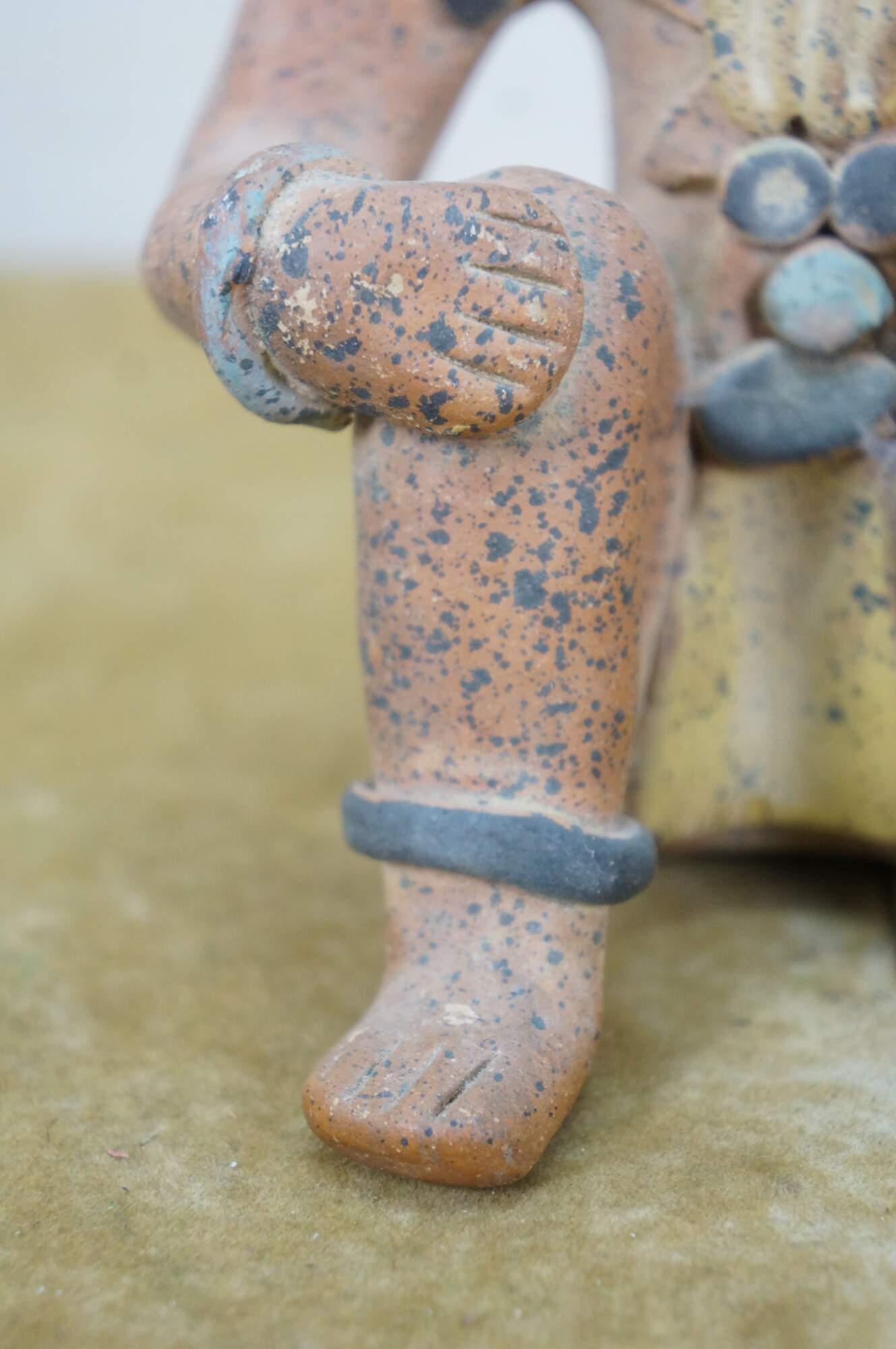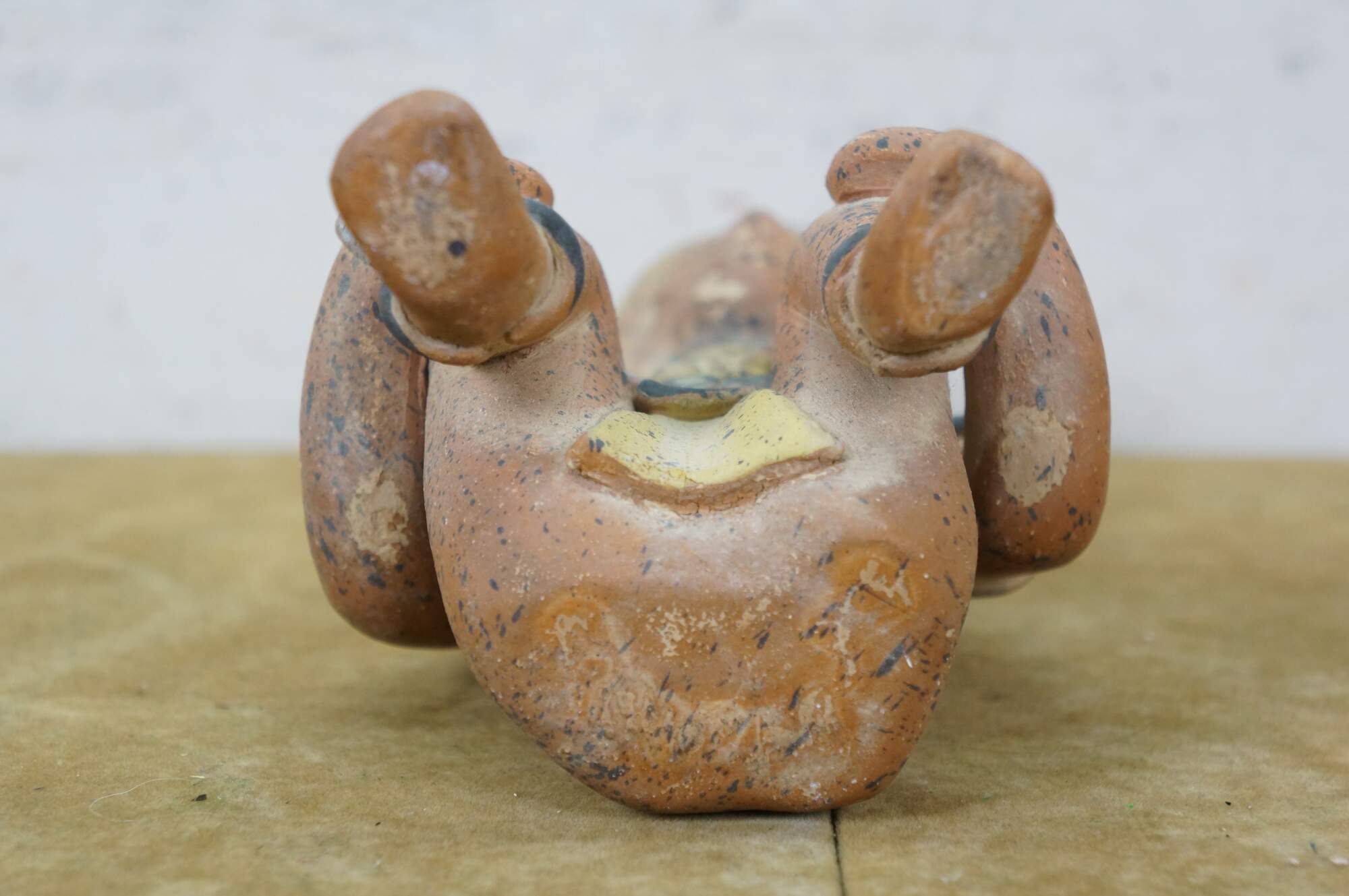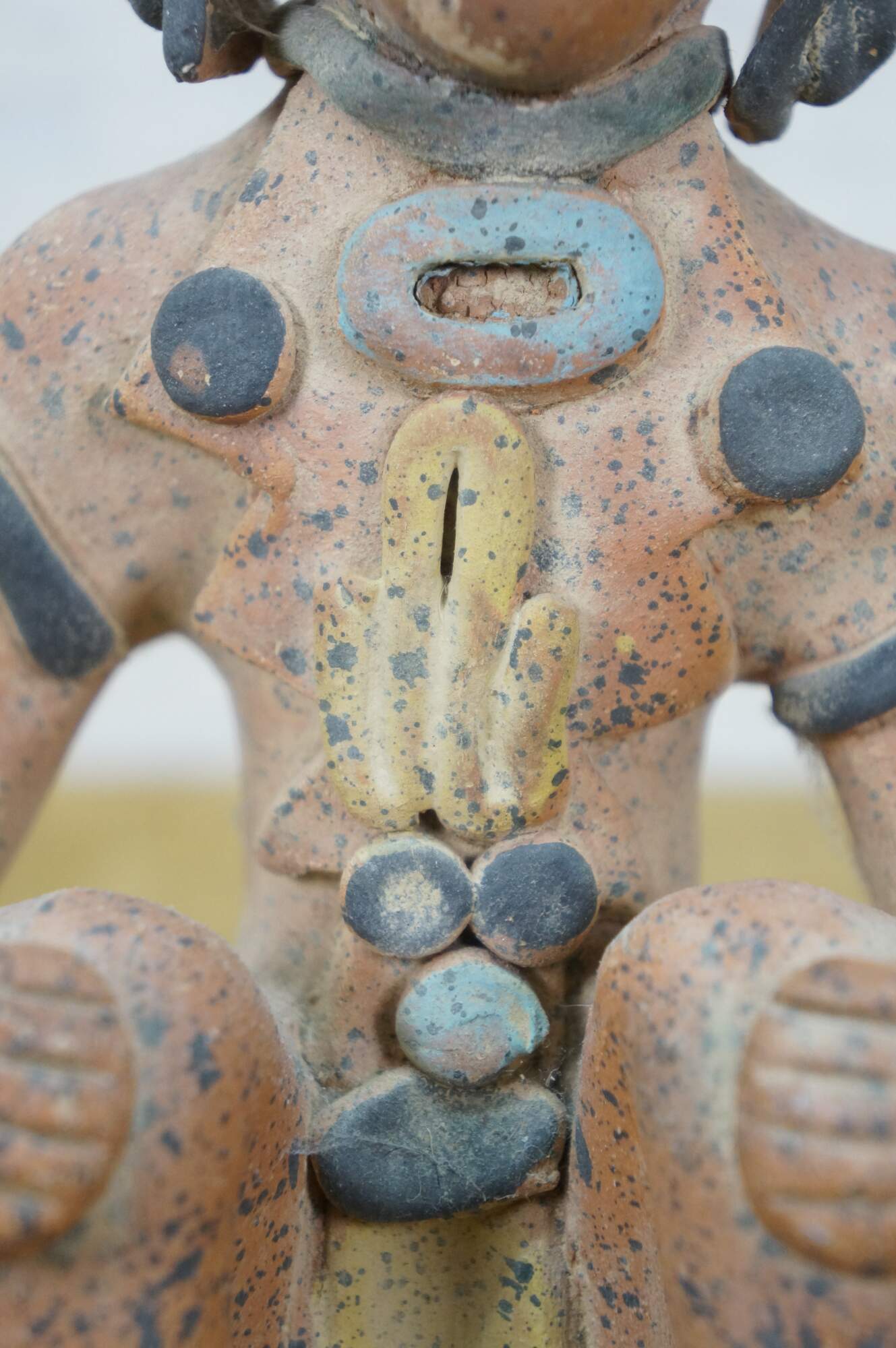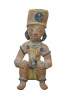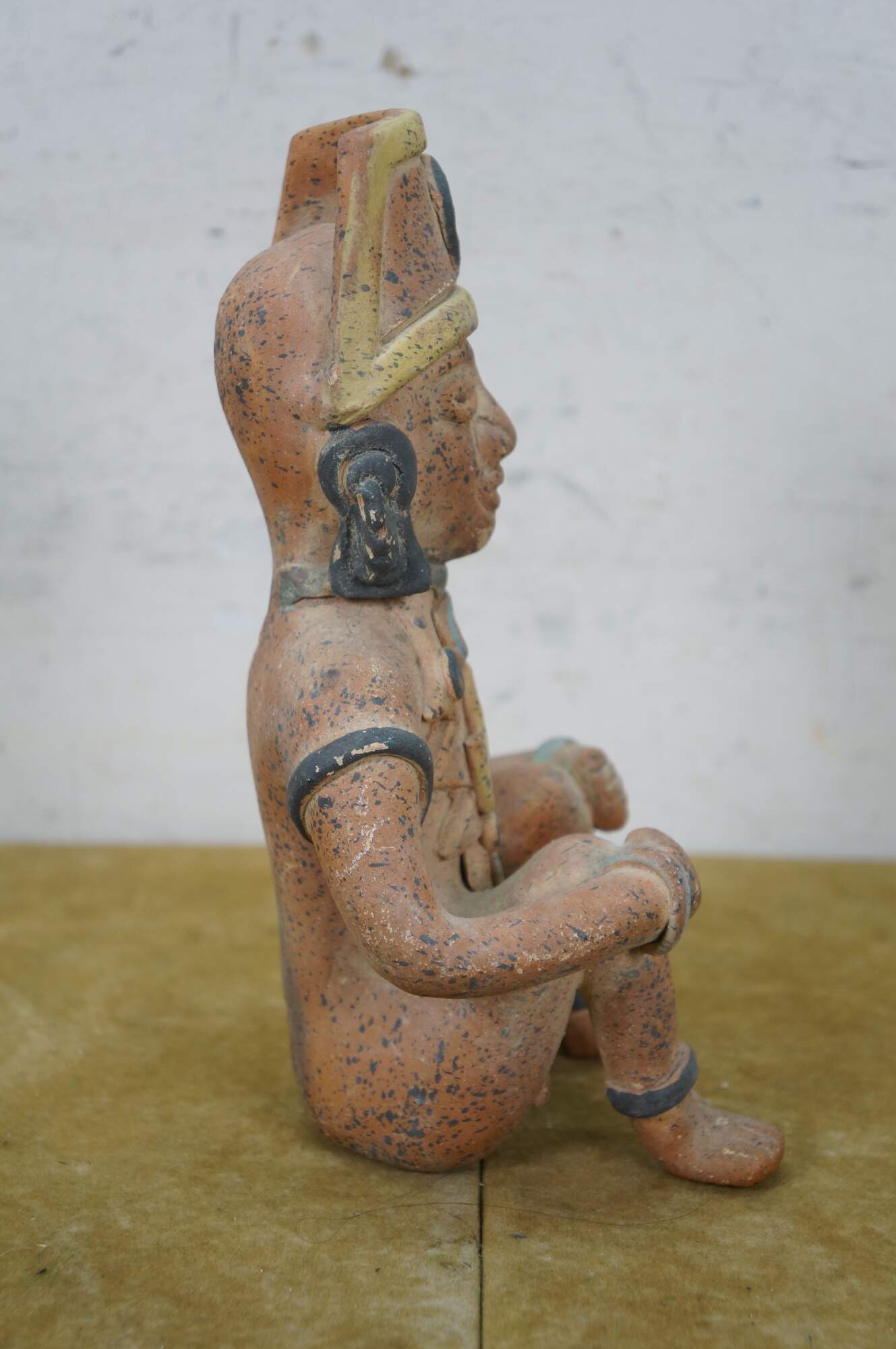 Vintage 20th century terracotta figurine / sculpture in the shape of an Aztec / Mayan style person in a seated position with hands on raised knees, dressed in yellow loin cloth, jewelry and headdress.