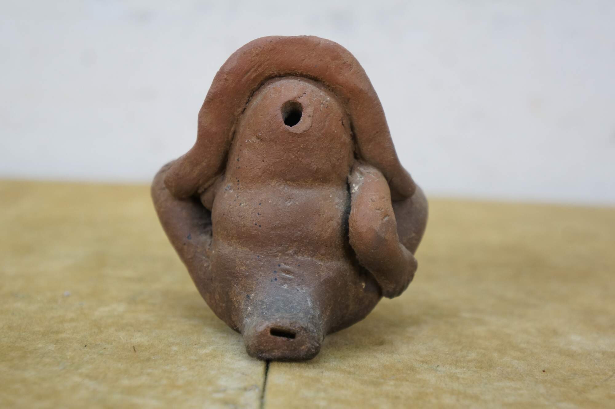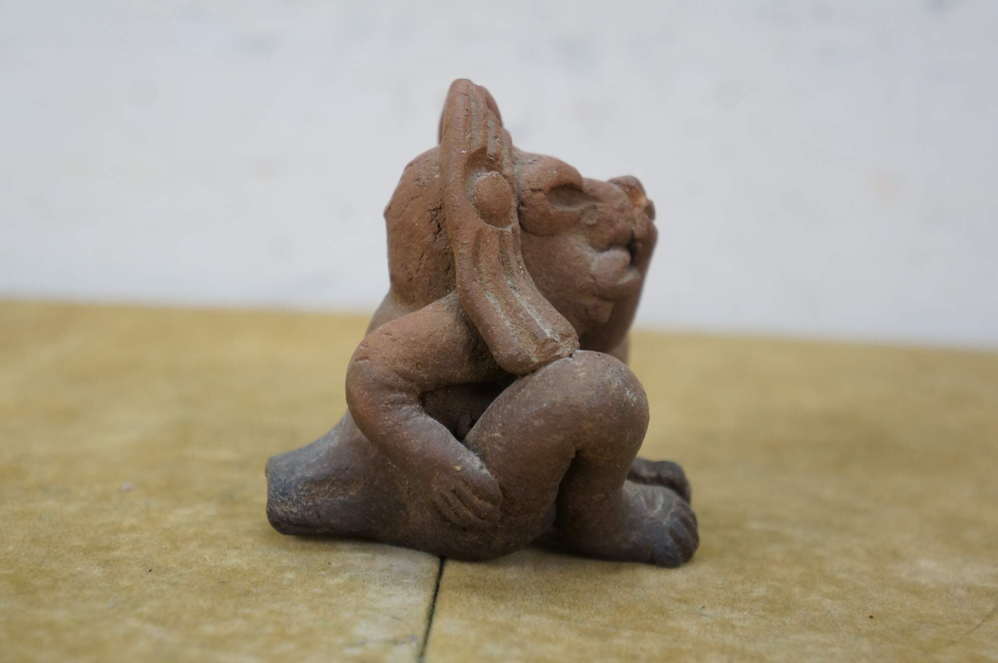 Vintage folk art style red earthenware whistle in the shape of a Mayan / Aztec inspired figure in a headdress, seated with one hand on his nose and the other on his backside.