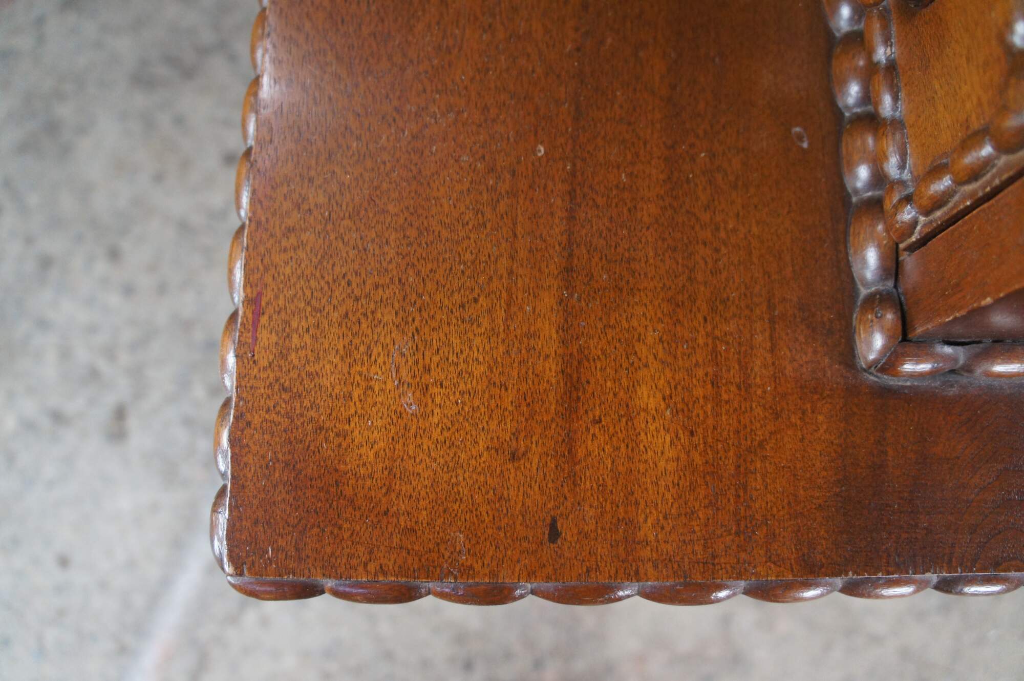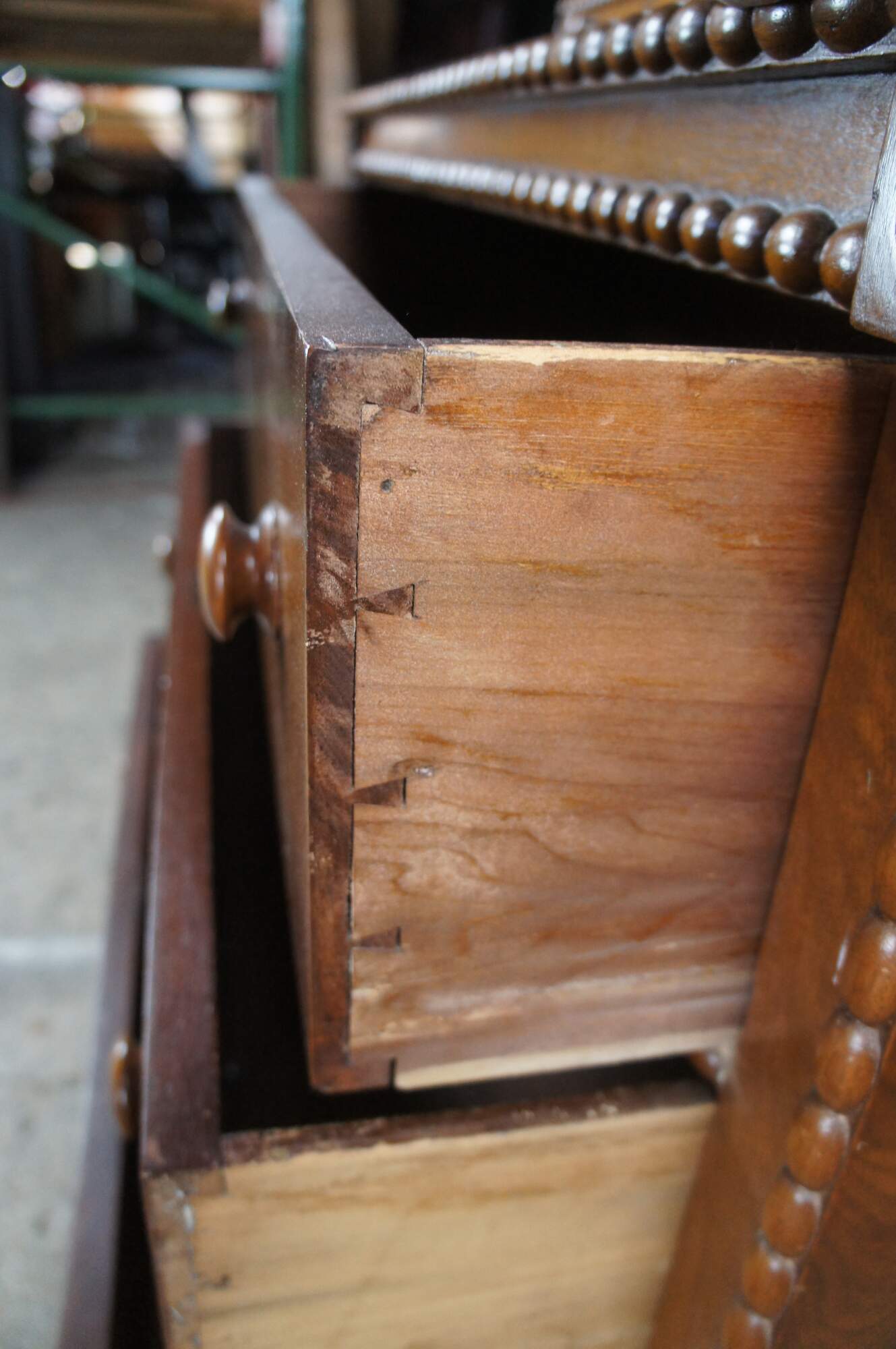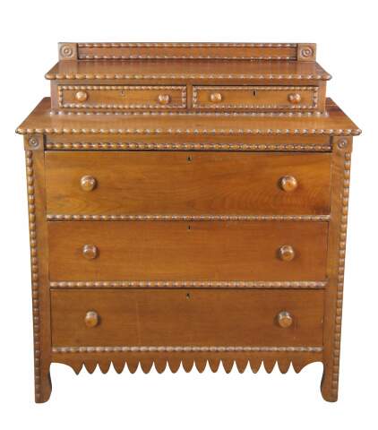 Antique Victorian stepback dresser / chest of drawers. Made of walnut featuring Arts & Crafts styling with five hand dovetailed drawers framed by long spool style beads and lower sawtooth edge. One of the upper glove box drawers has been modified with a divided felt liner for jewelry.