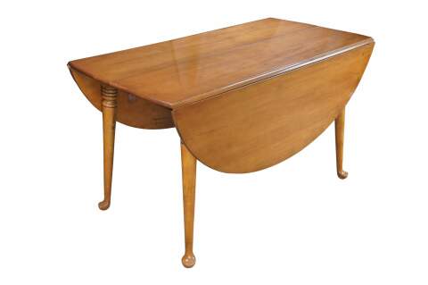 Mid century Early American Colonial style extendable country farmhouse drop leaf dining table. Made of maple featuring long turned legs with Queen Anne pad foot. Includes to leaves. Rike-Kumler Co, Dayton Ohio. Fact 460, style 825-55, Maple.