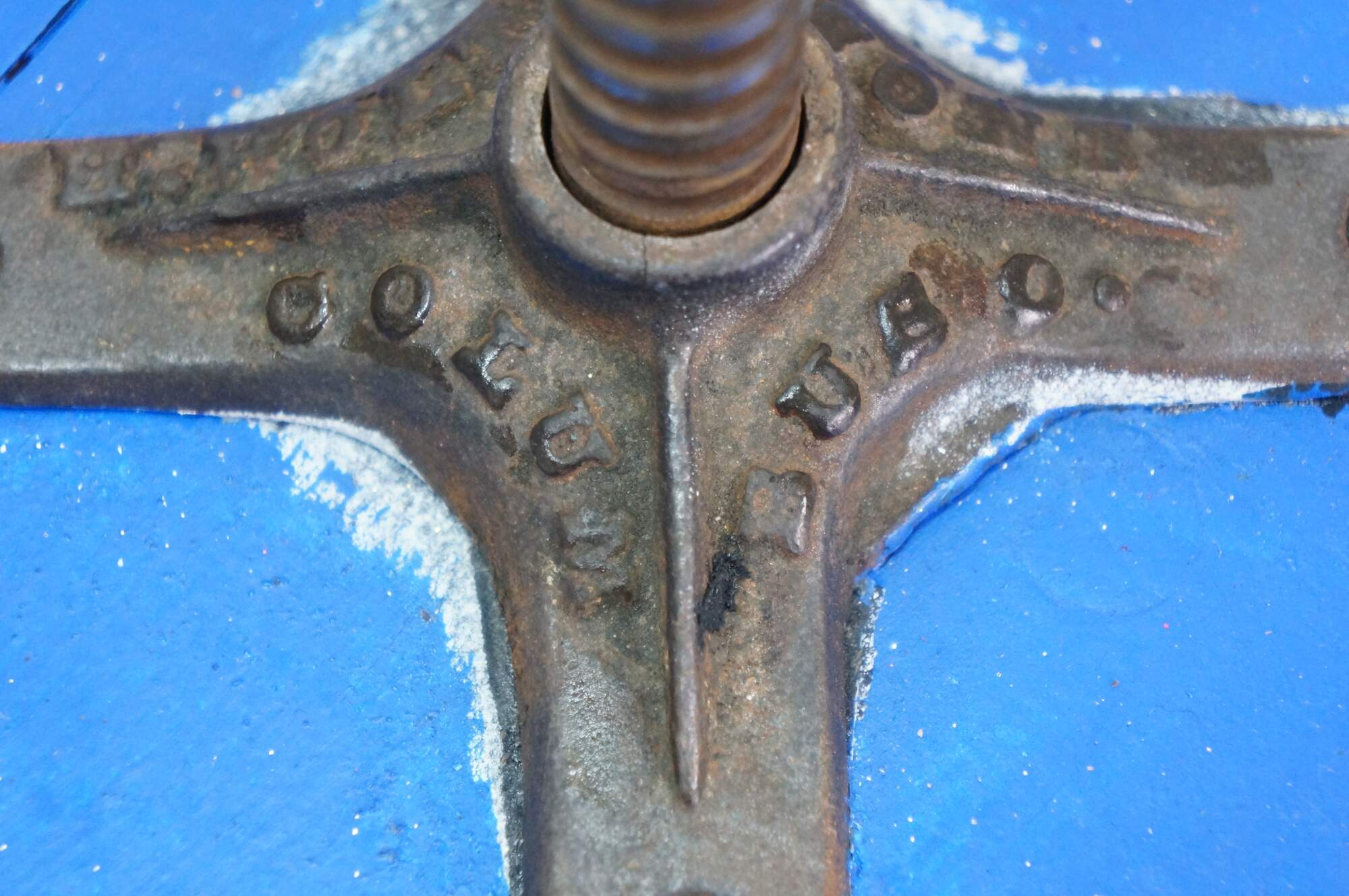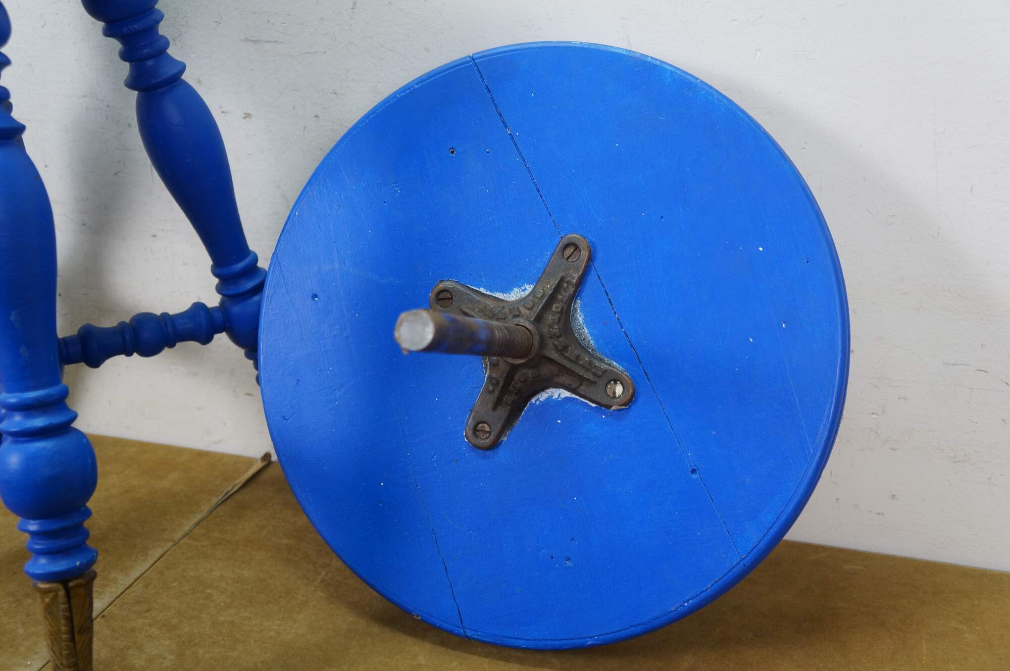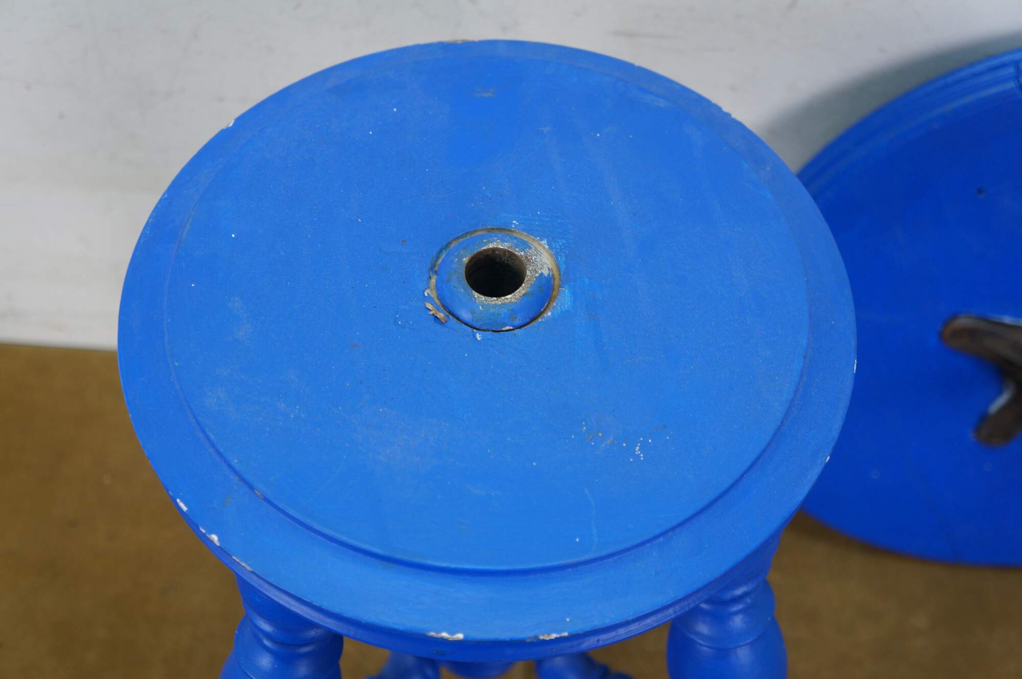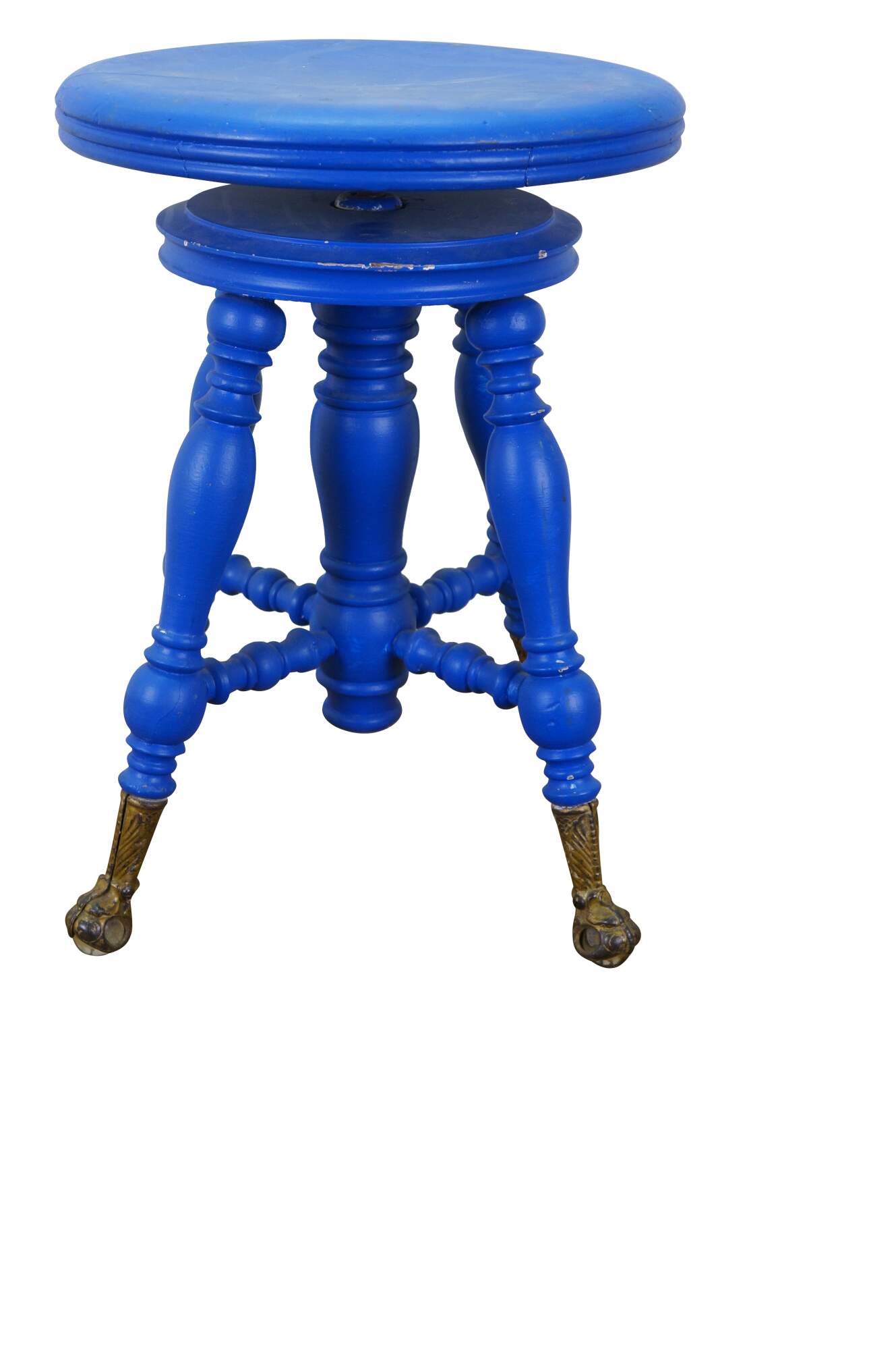 Late 19th century Victorian era piano stool - round top with turned stretchers and legs, capped with patterned brass claw feet clutching glass balls. Originally height would have been adjustable by turning the top on the center screw. Painted bright blue. Made by H. Holtzman & Sons of Columbus, Ohio.