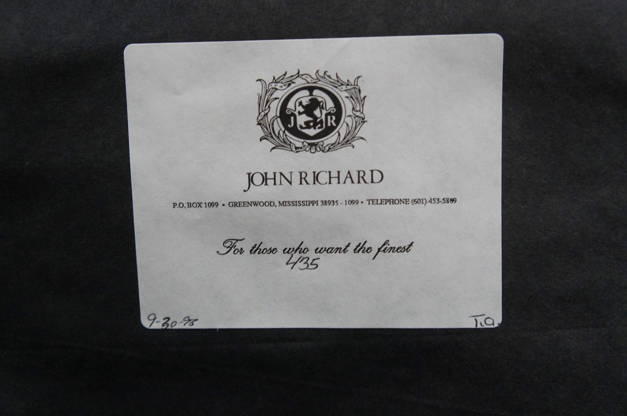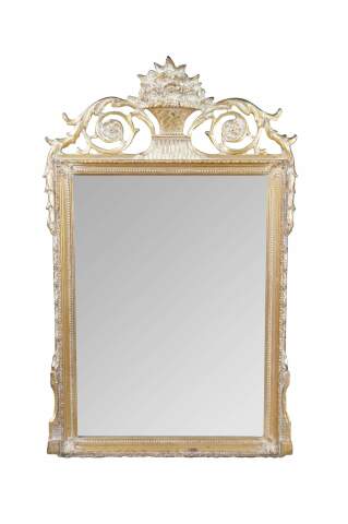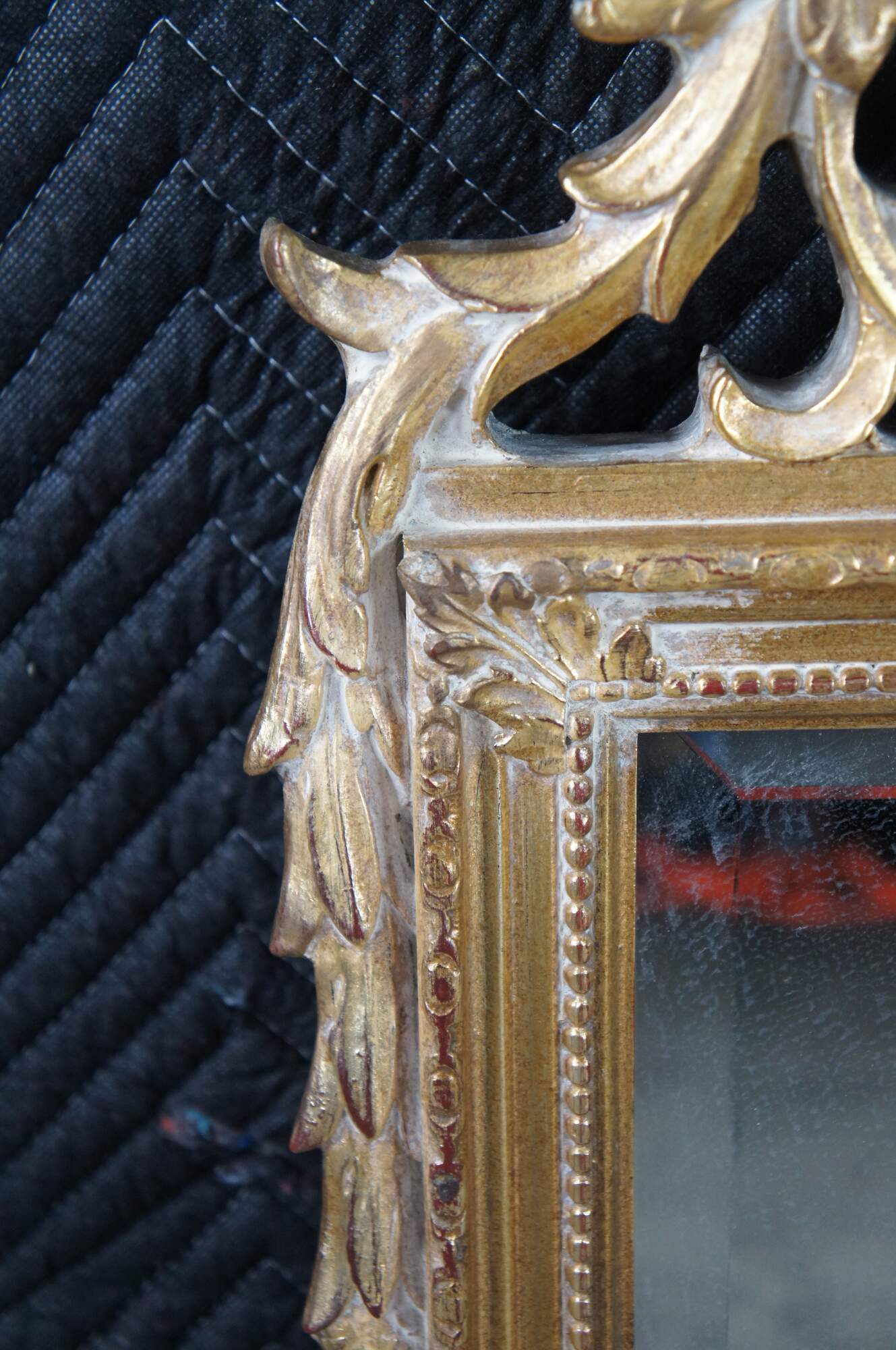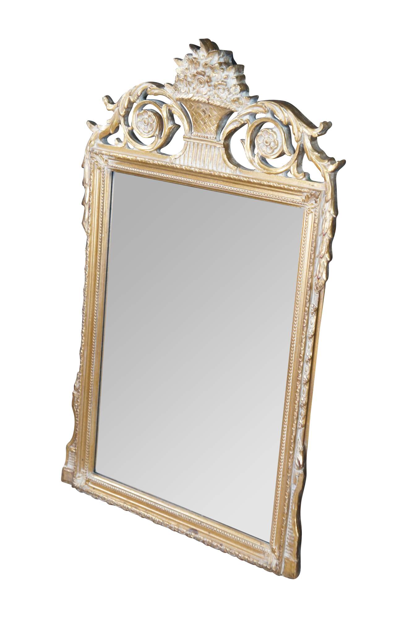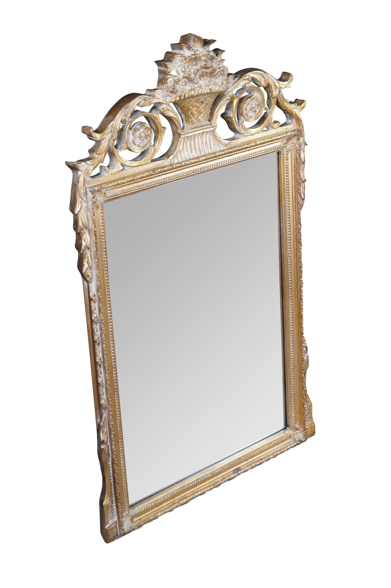Late 20th Century Louis XVI Style Mirror by John Richards. Features a rectangular giltwood frame with beveled glass plate. The crown showcases a woven basket with flowers flanked by scrolling acanthus leaf. The mirror is bordered by beading and an egg and dart pattern. Marked John Richard along the backside 'For Those Who Want The Finese' #435, 1998