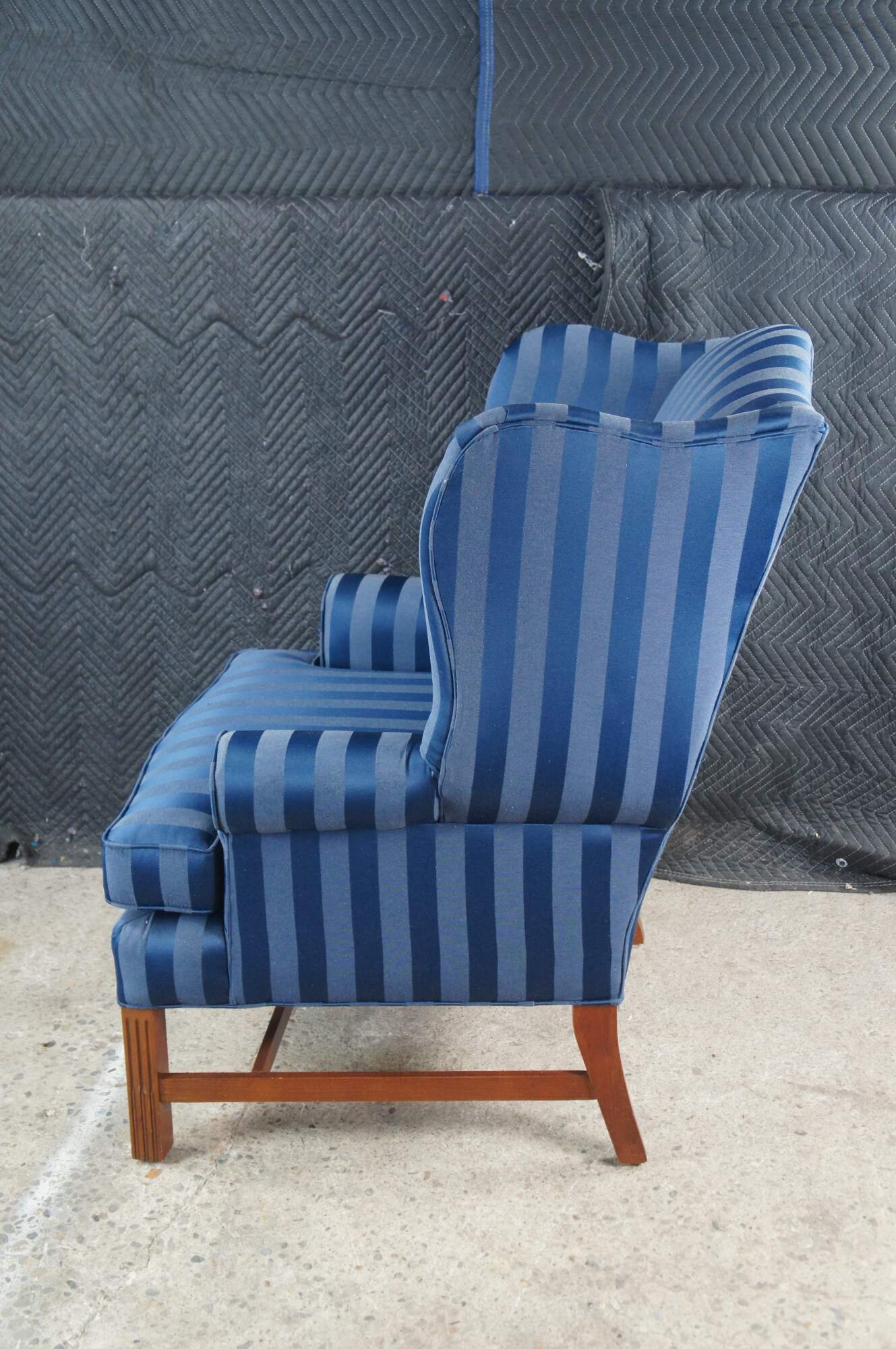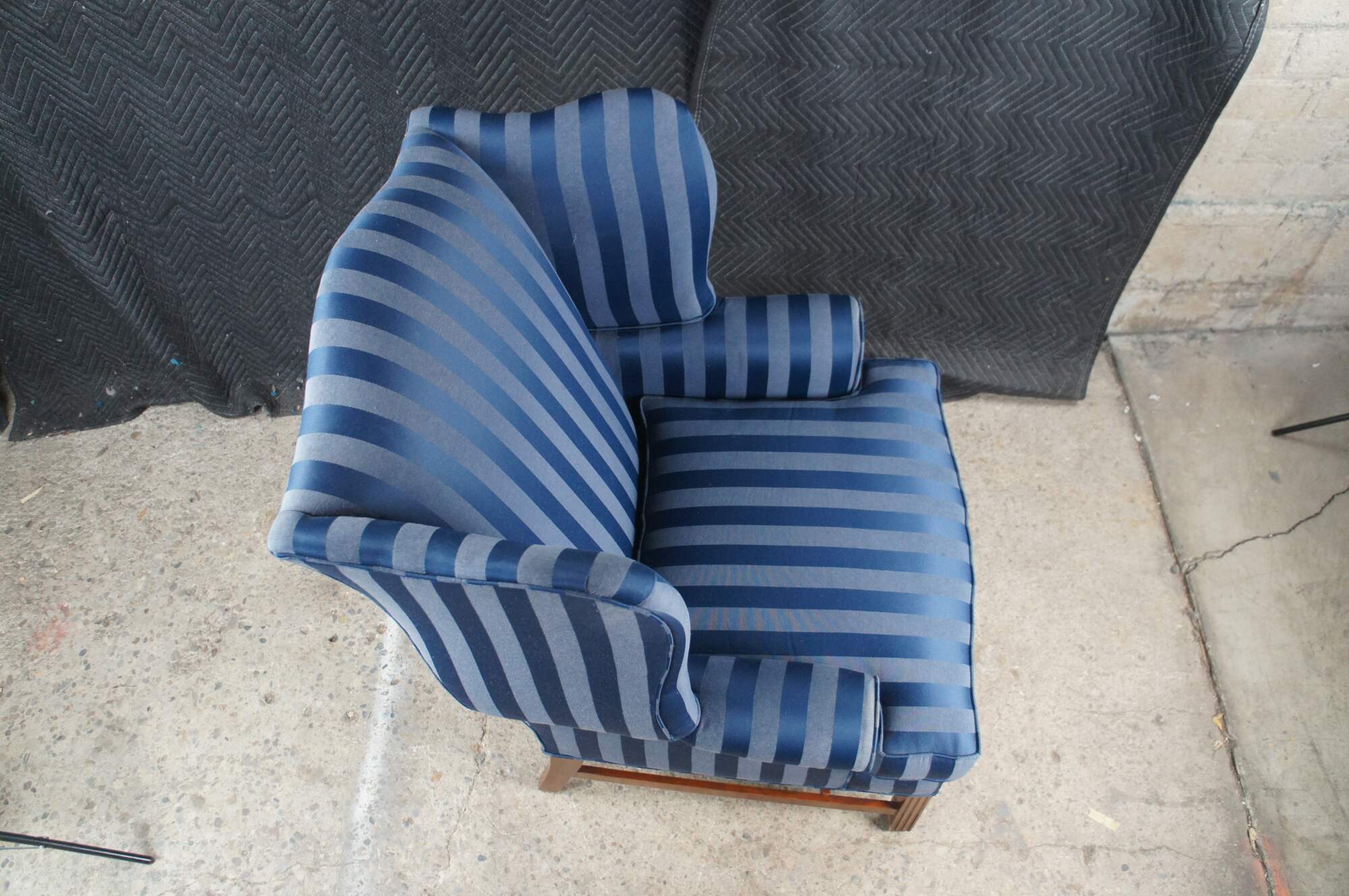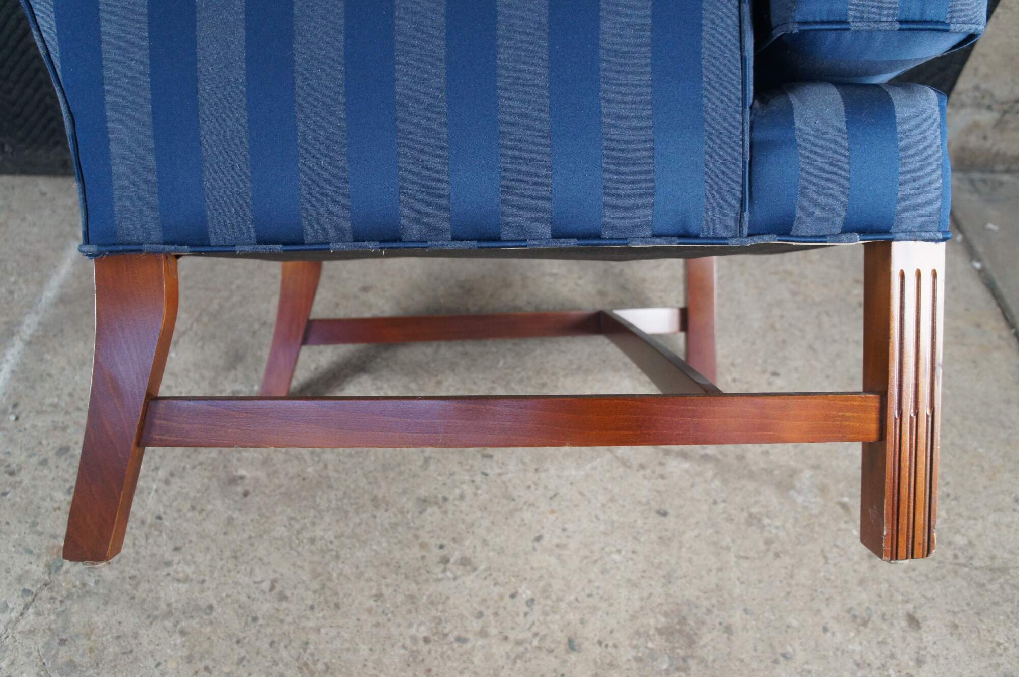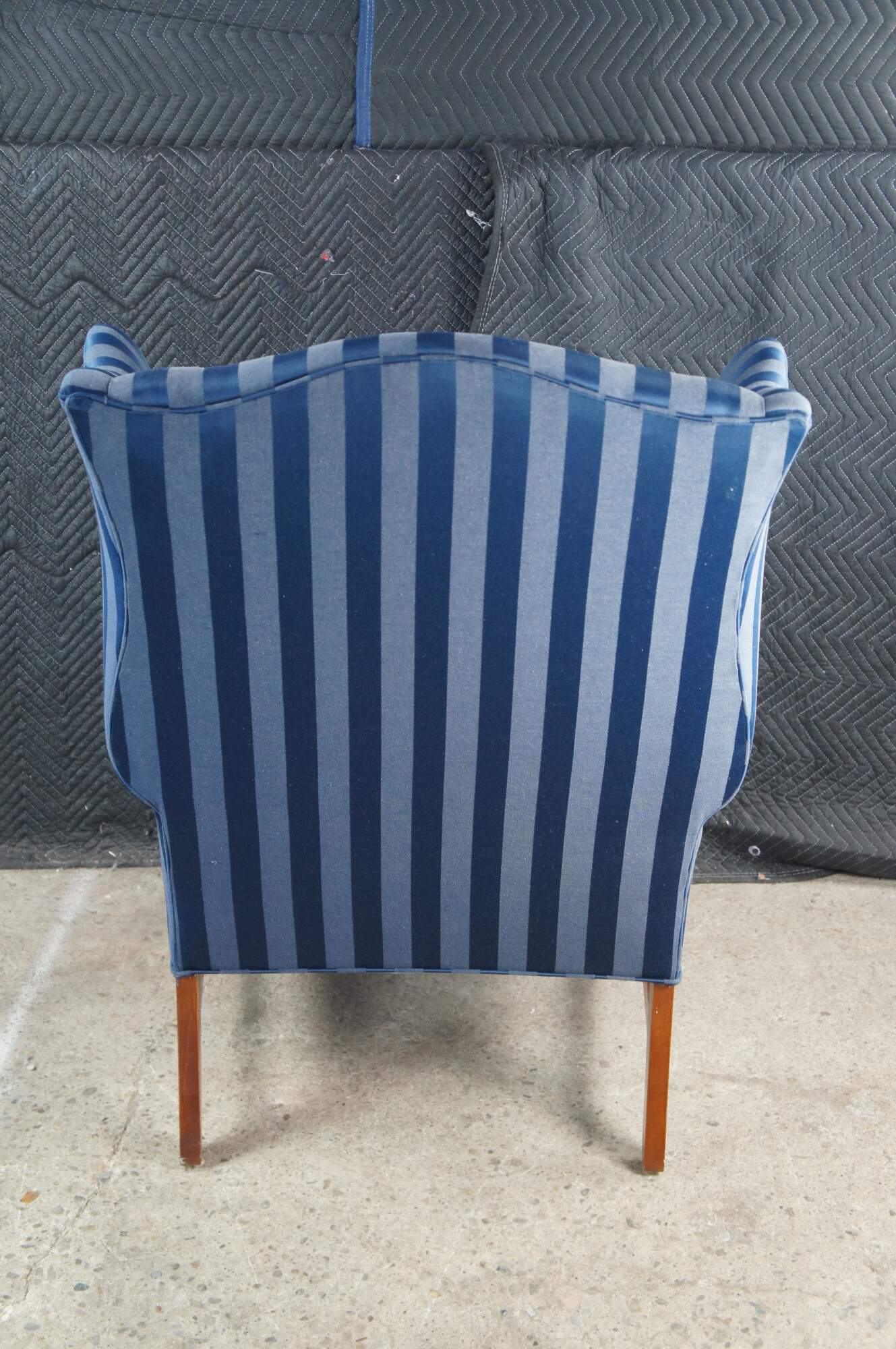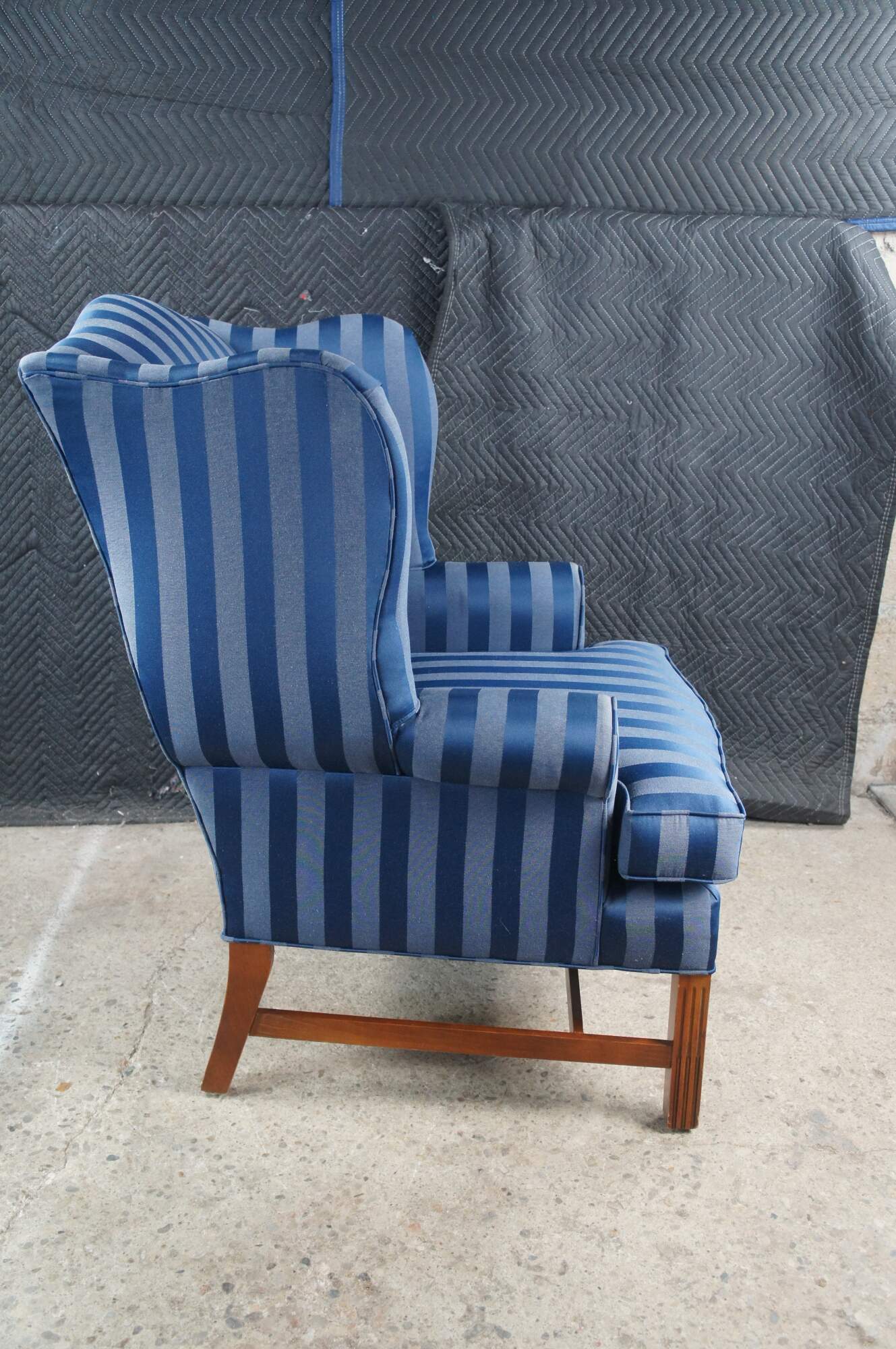 Vintage Fairfield Chair Company library fireside wingback armchair featuring serpentine Chippendale styling with blue striped upholstery and fluted legs.