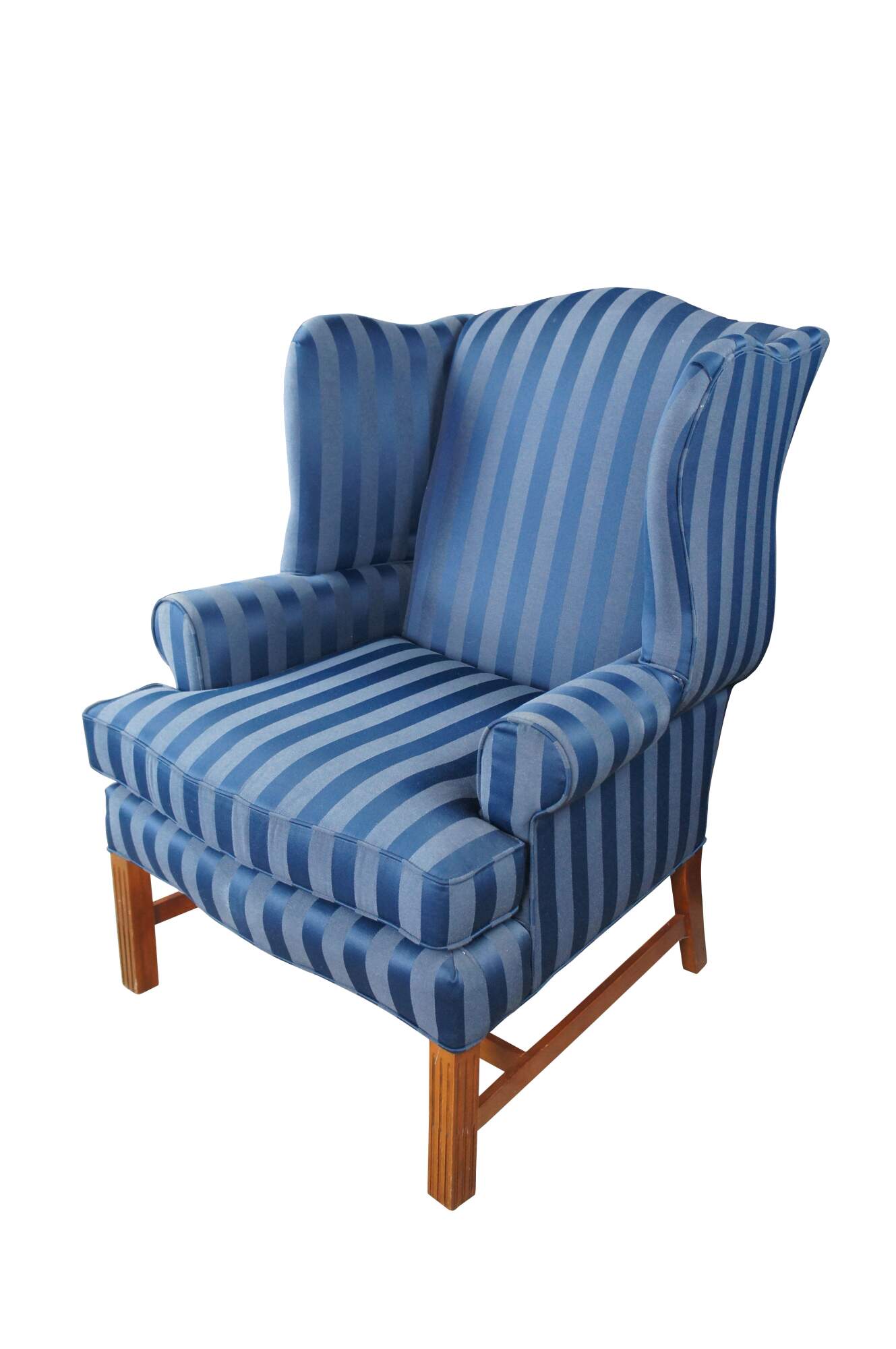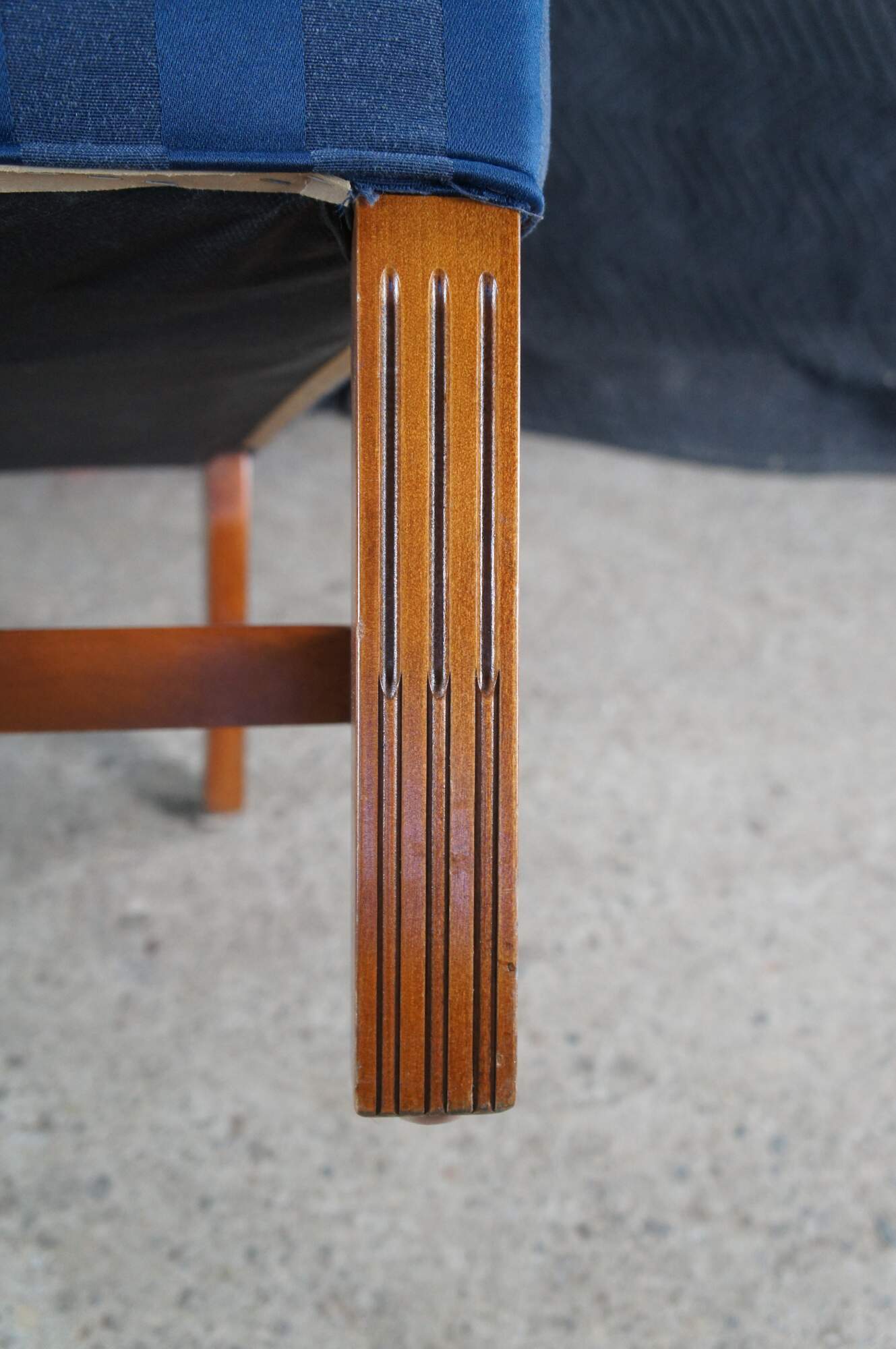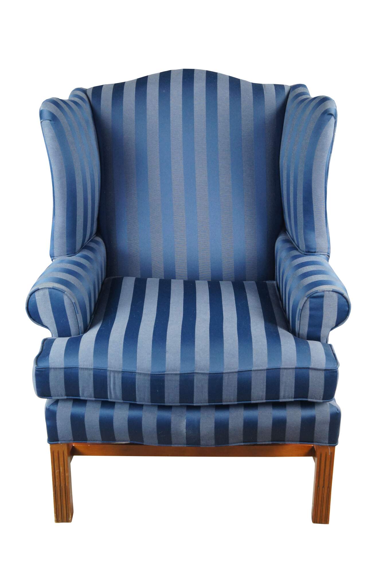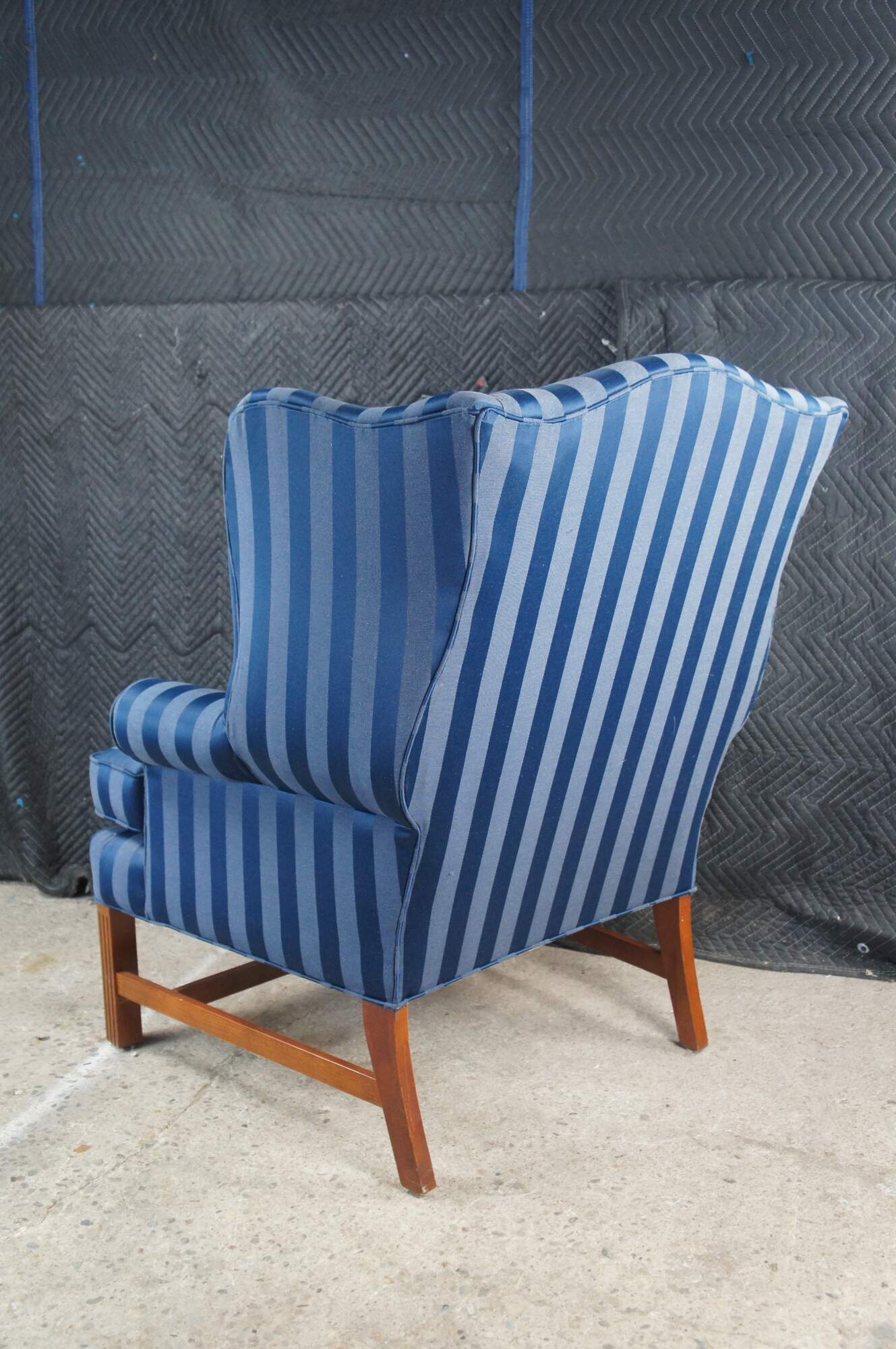 Vintage Fairfield Chair Company library fireside wingback armchair featuring serpentine Chippendale styling with blue striped upholstery and fluted legs.