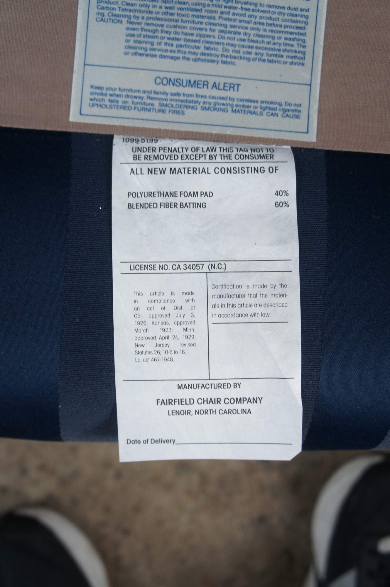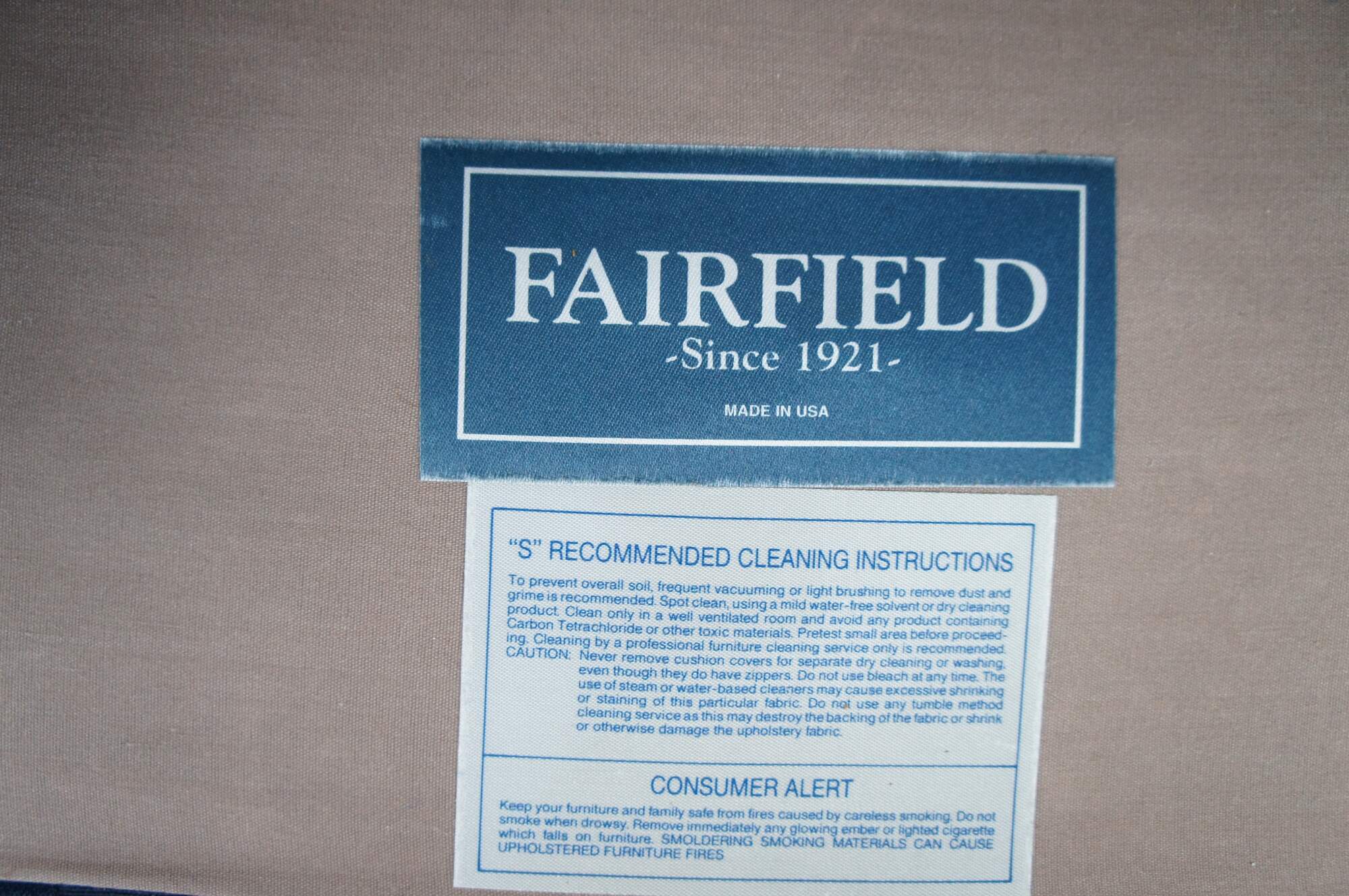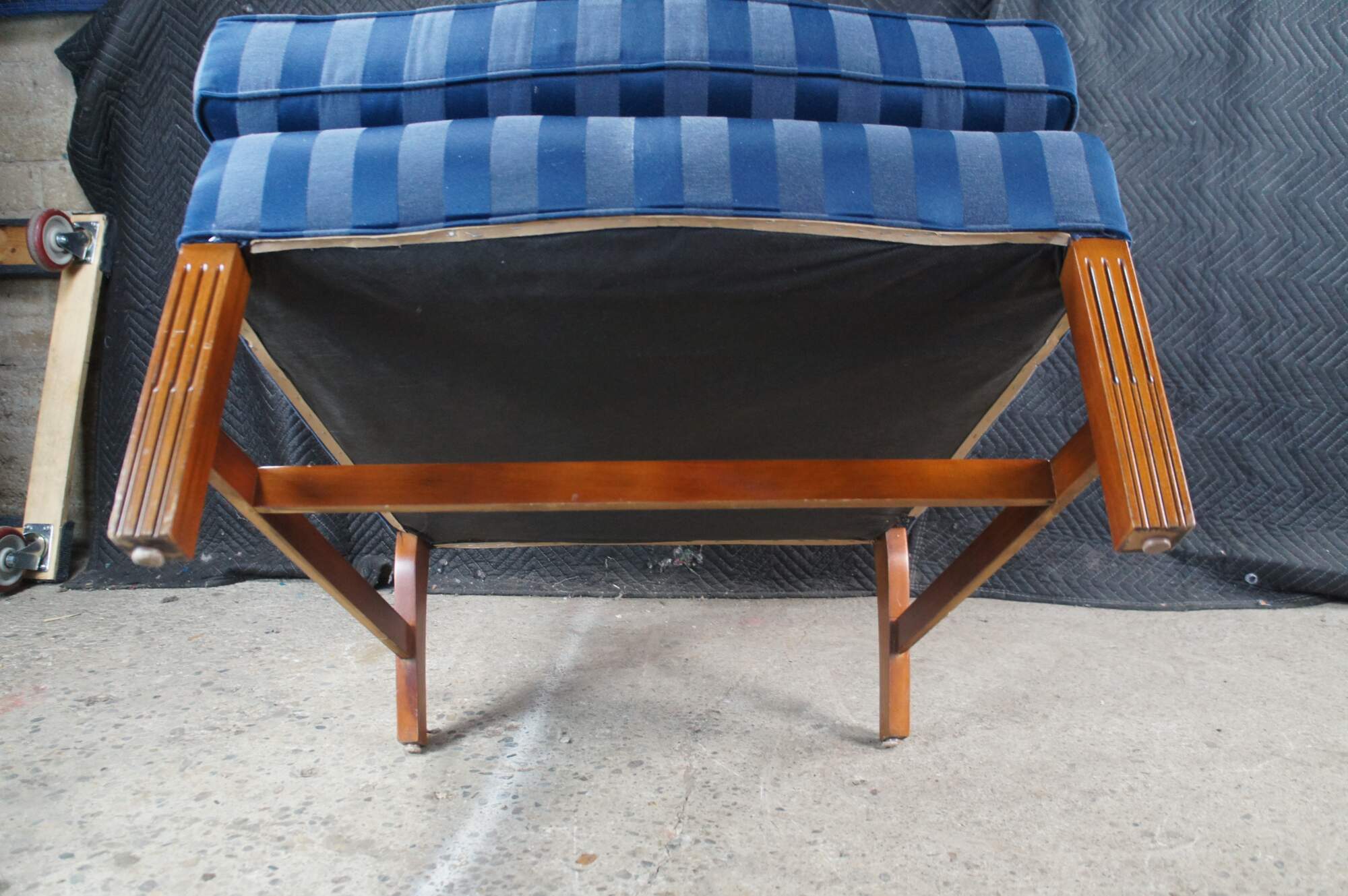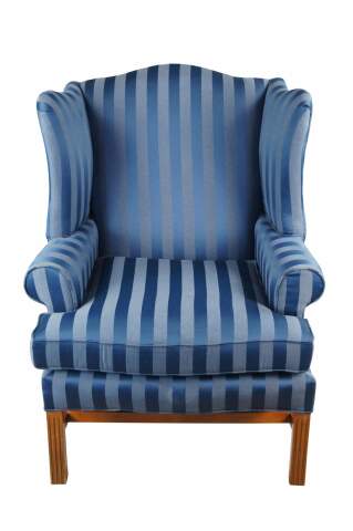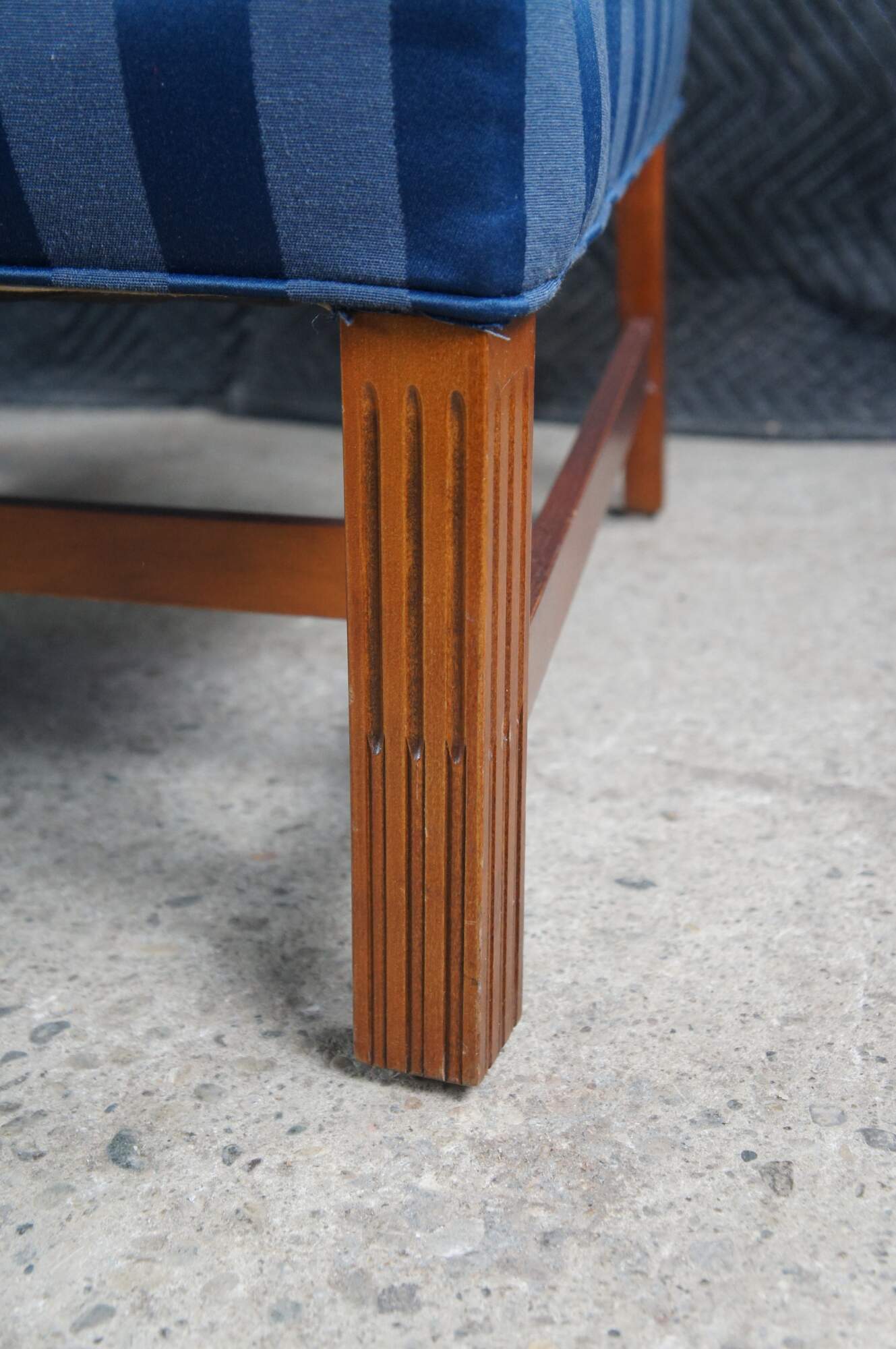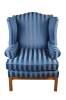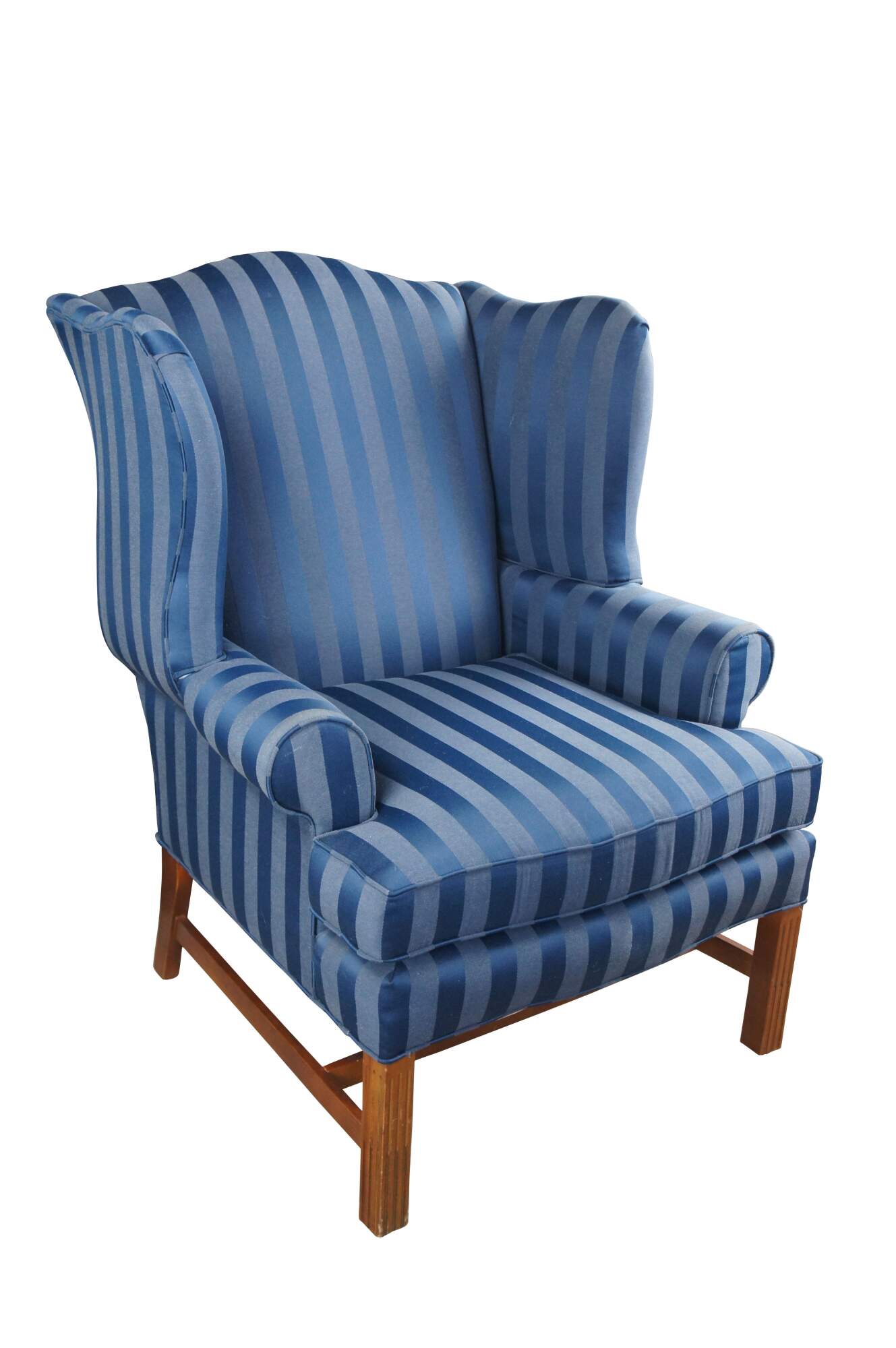 Vintage Fairfield Chair Company library fireside wingback armchair featuring serpentine Chippendale styling with blue striped upholstery and fluted legs.