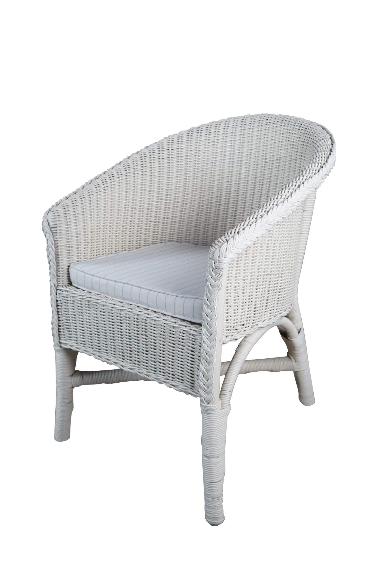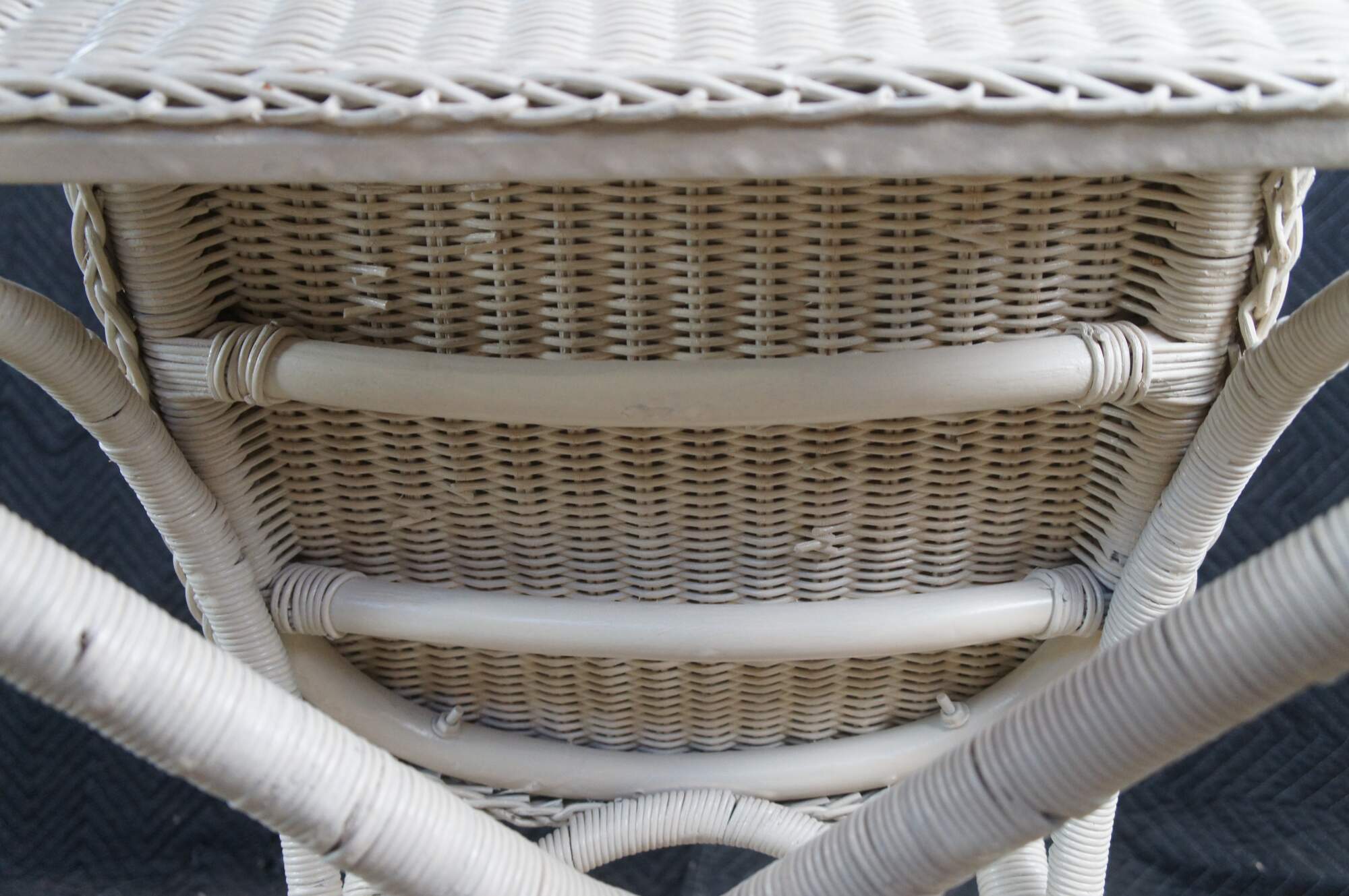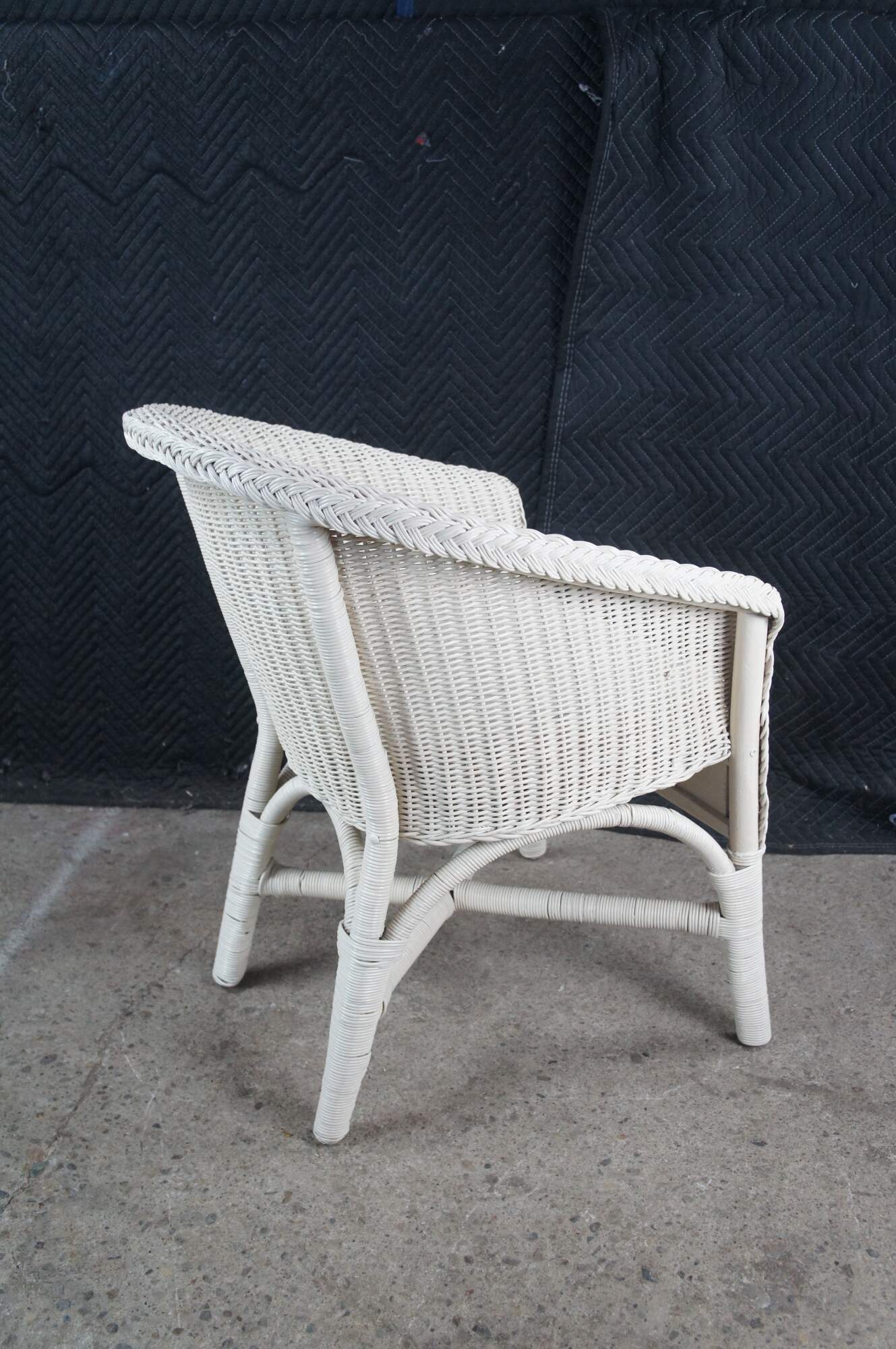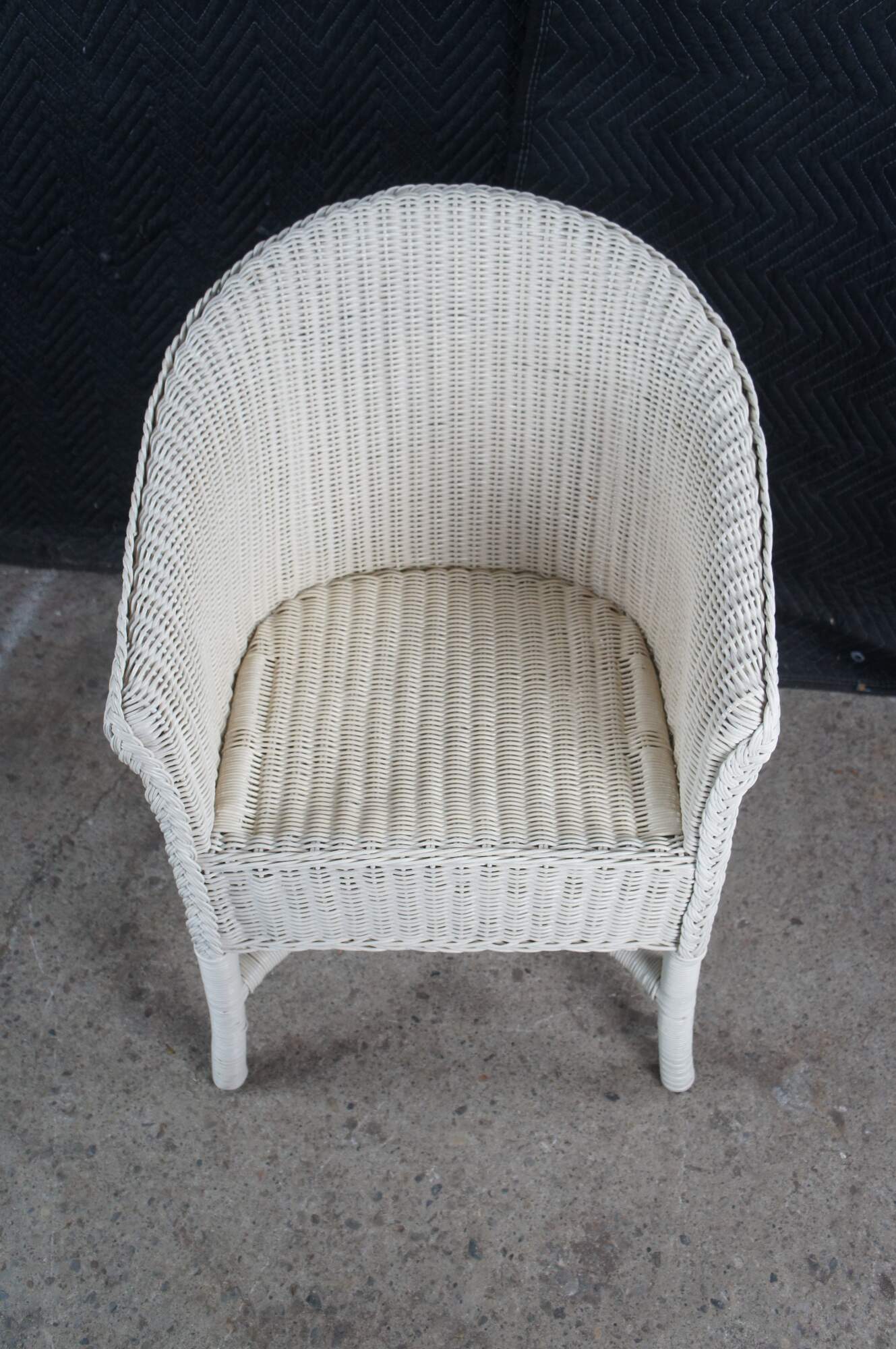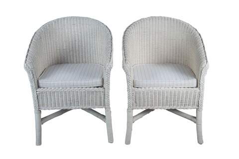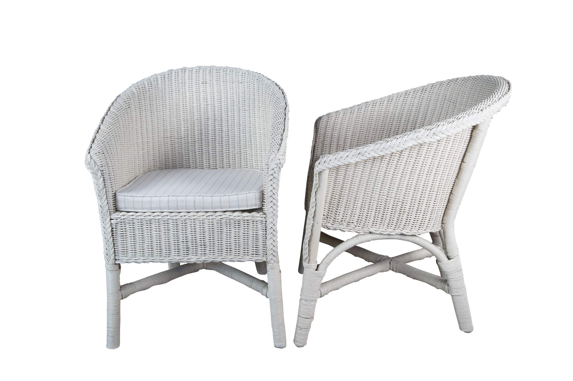 Two vintage white wicker arm chairs featuring a woven and braided design with sloped arms and striped seat cushions.
