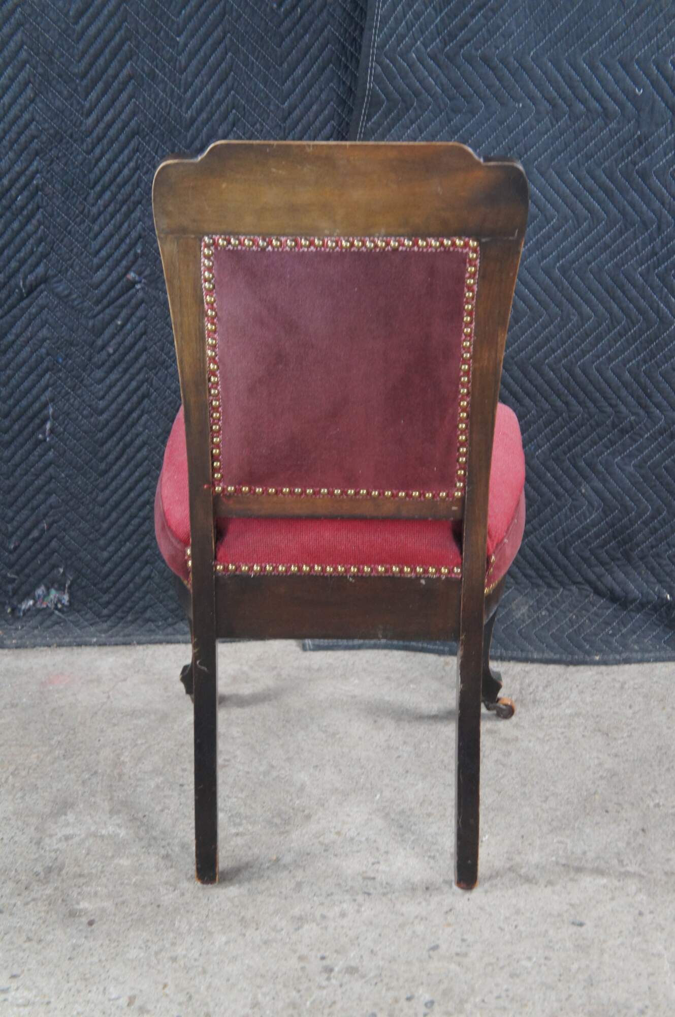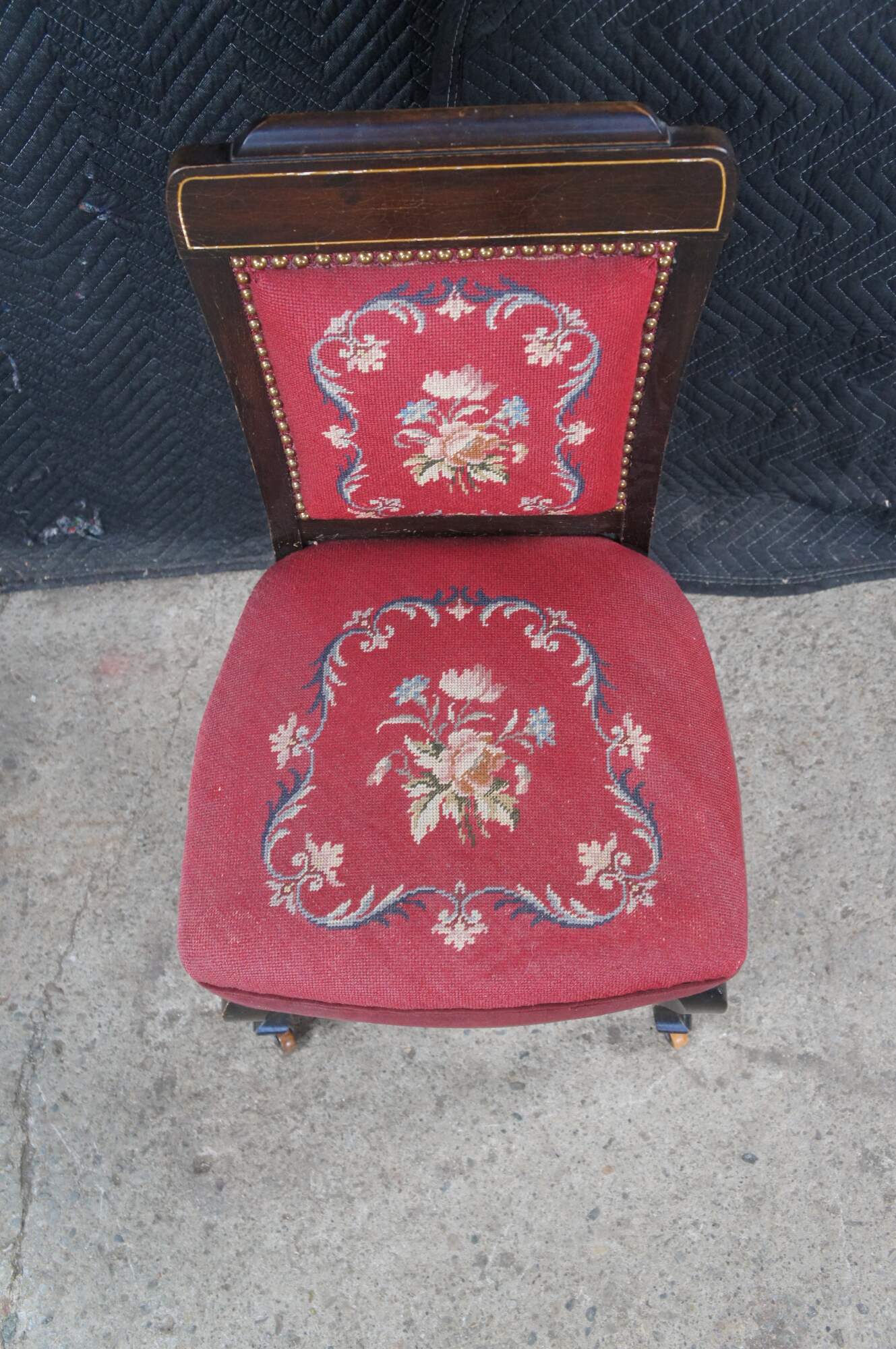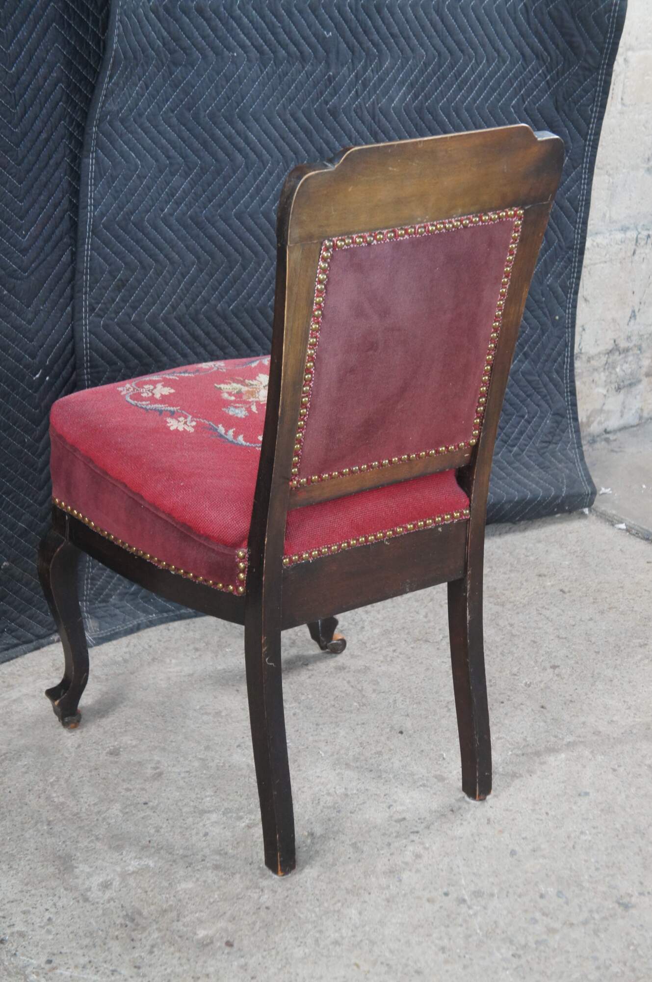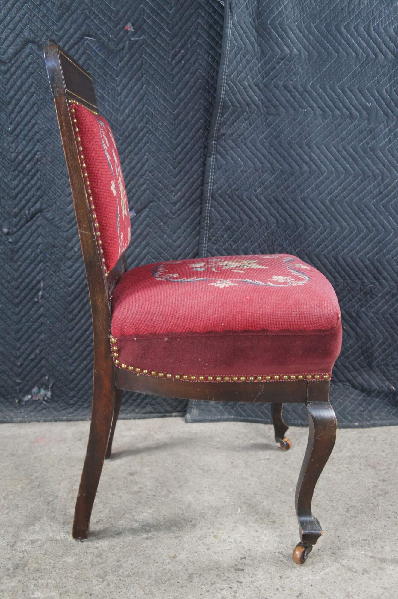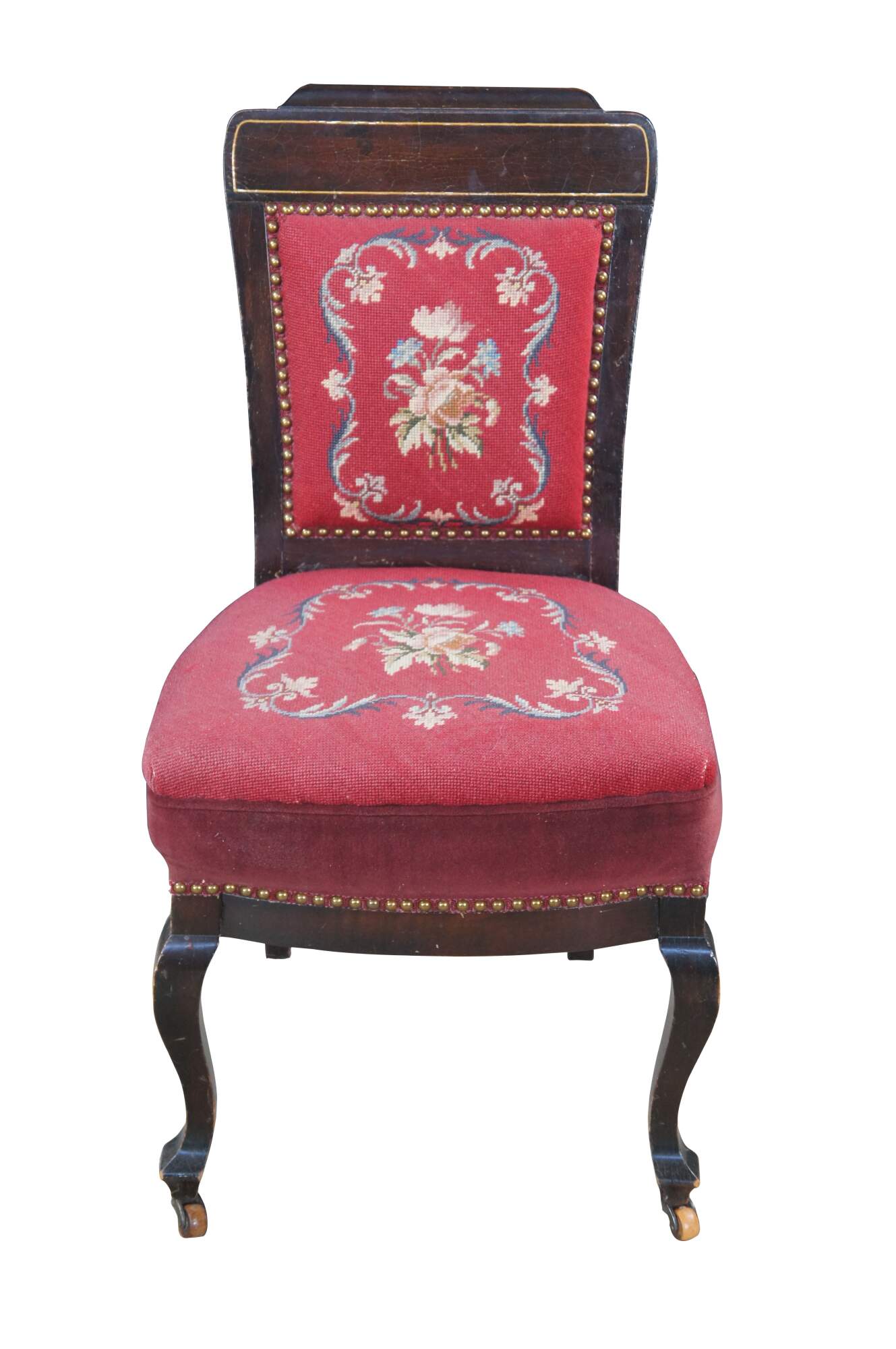 Antique English Edwardian vanity / desk / parlor side chair. Made of mahogany featuring a Neoclassical floral needlepoint design with nailhead trim and serpentine front legs with castors.