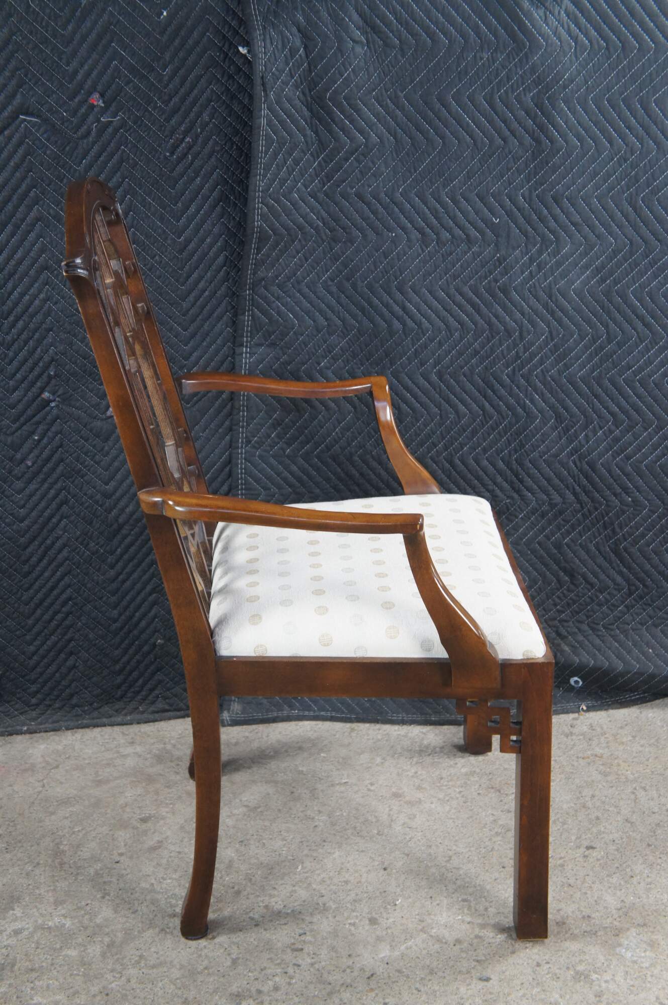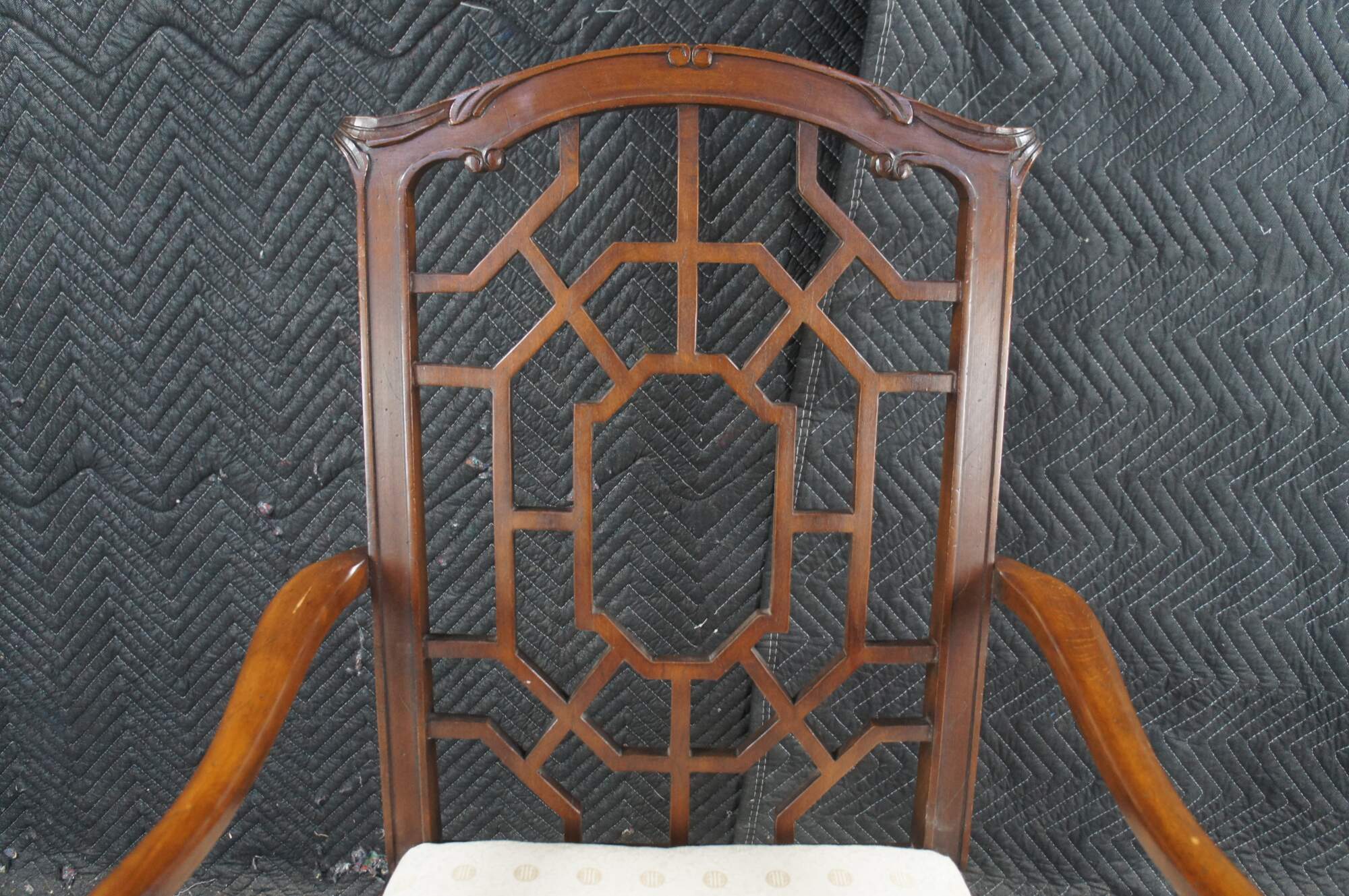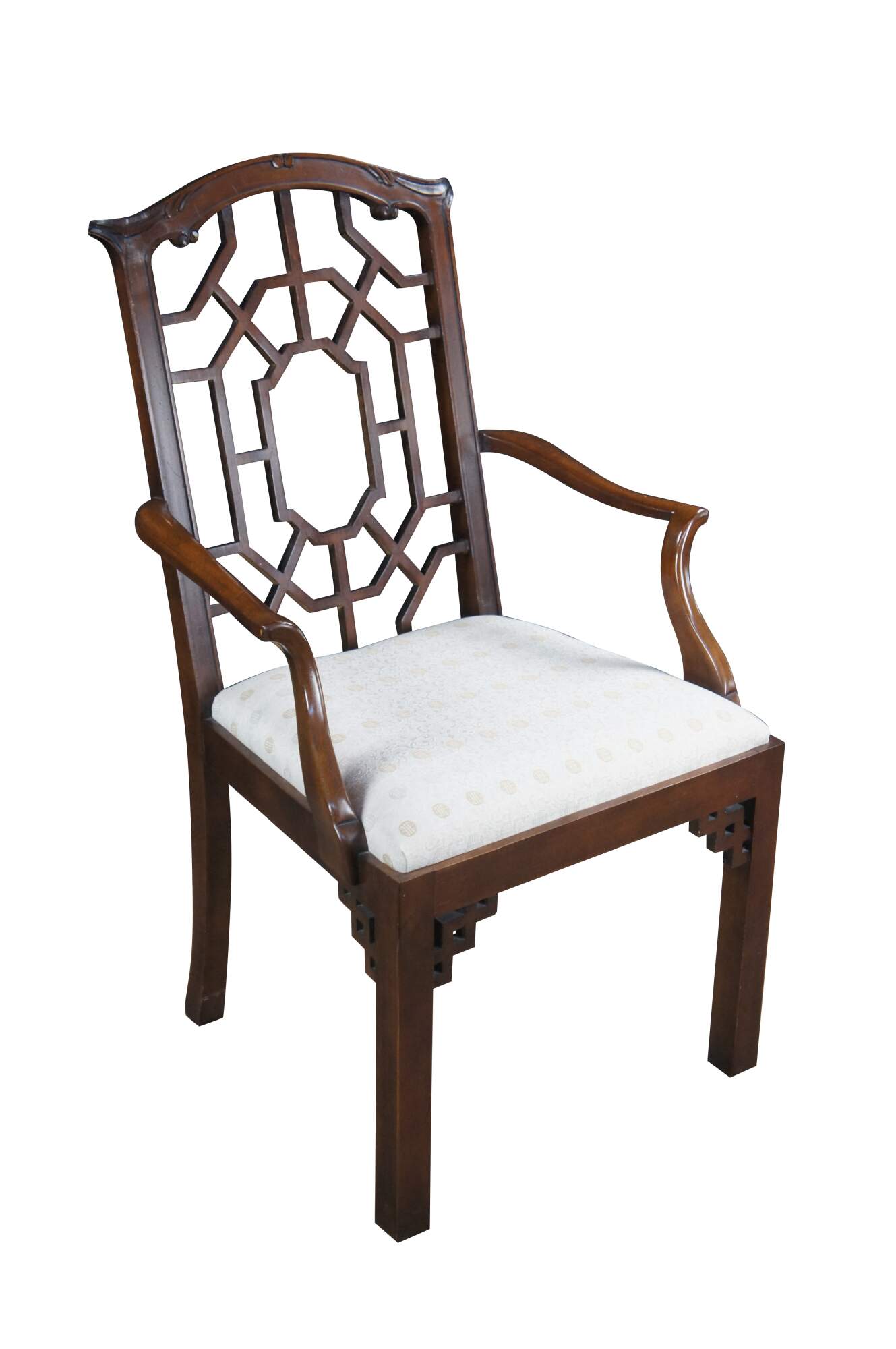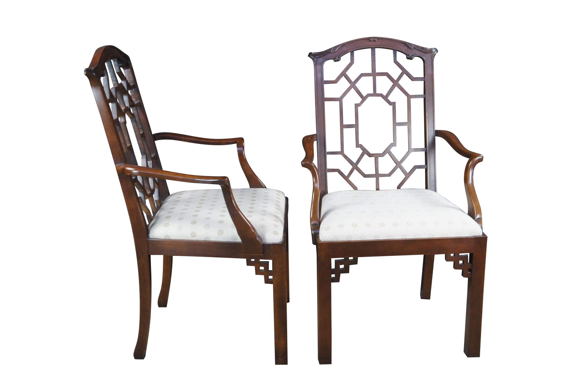Two vintage Hekman dining chairs. Made from mahogany featuring Chinese Chippendale styling with fretwork backs and serpentine arms. Hekman, Grand Rapids Michigan, 6-3146.