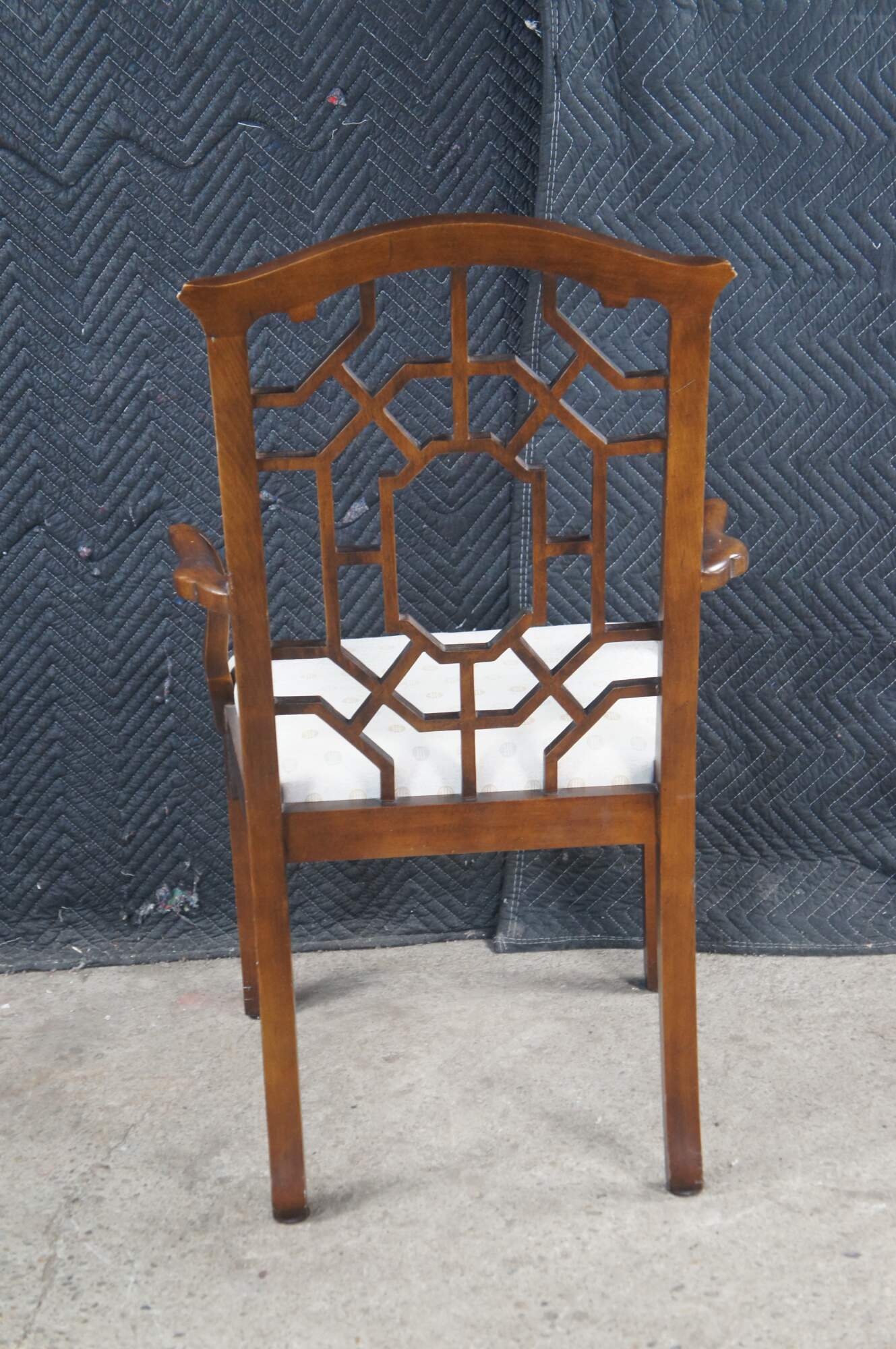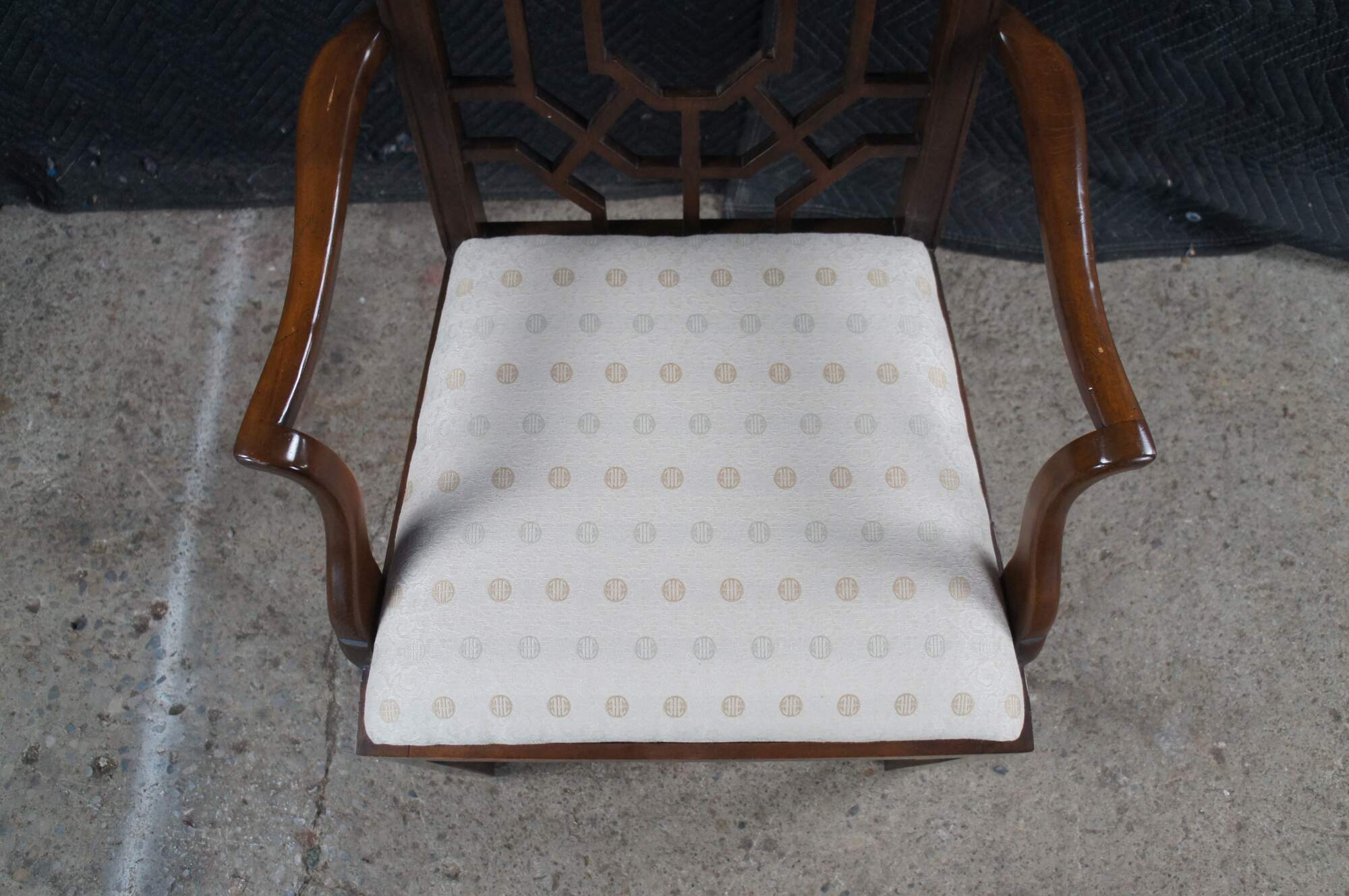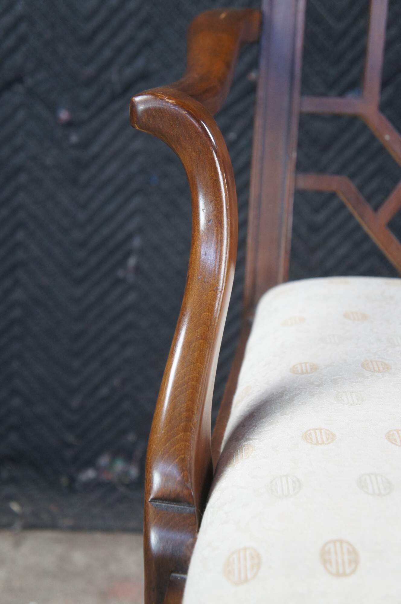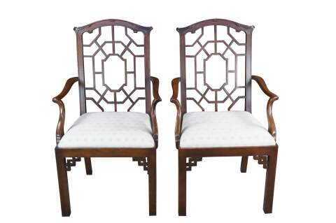 Two vintage Hekman dining chairs. Made from mahogany featuring Chinese Chippendale styling with fretwork backs and serpentine arms. Hekman, Grand Rapids Michigan, 6-3146.
