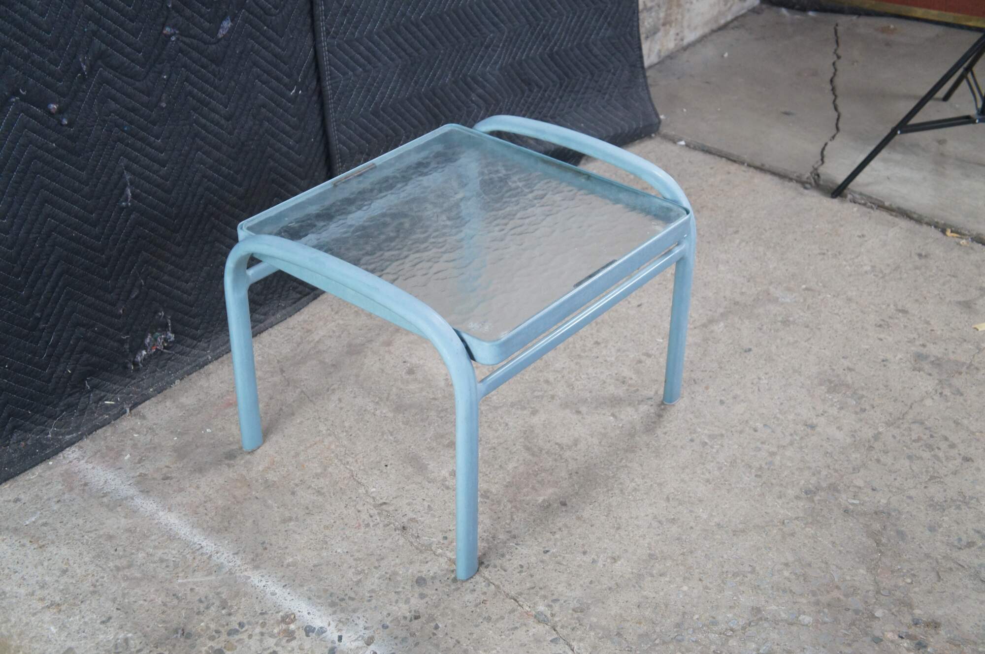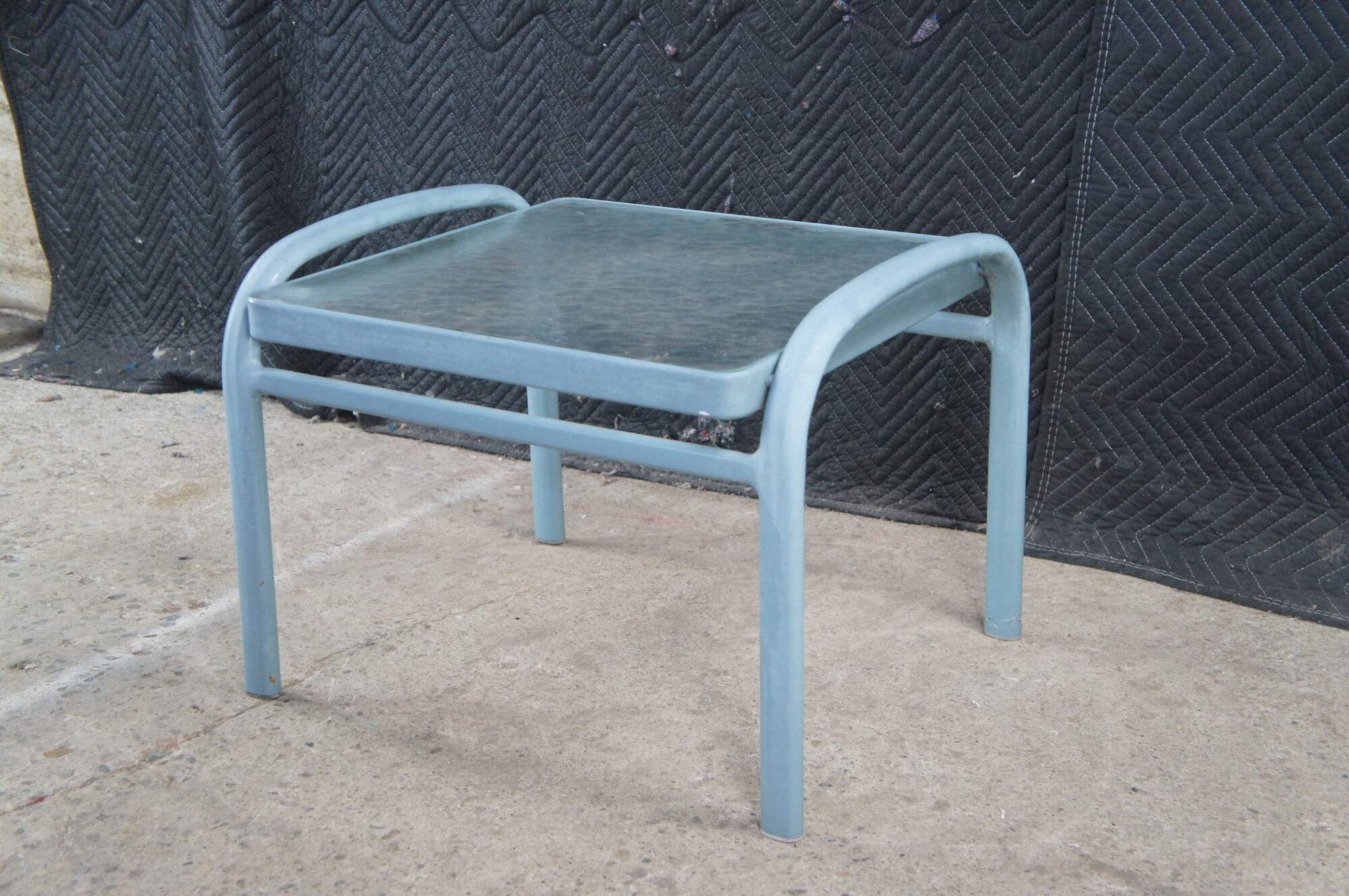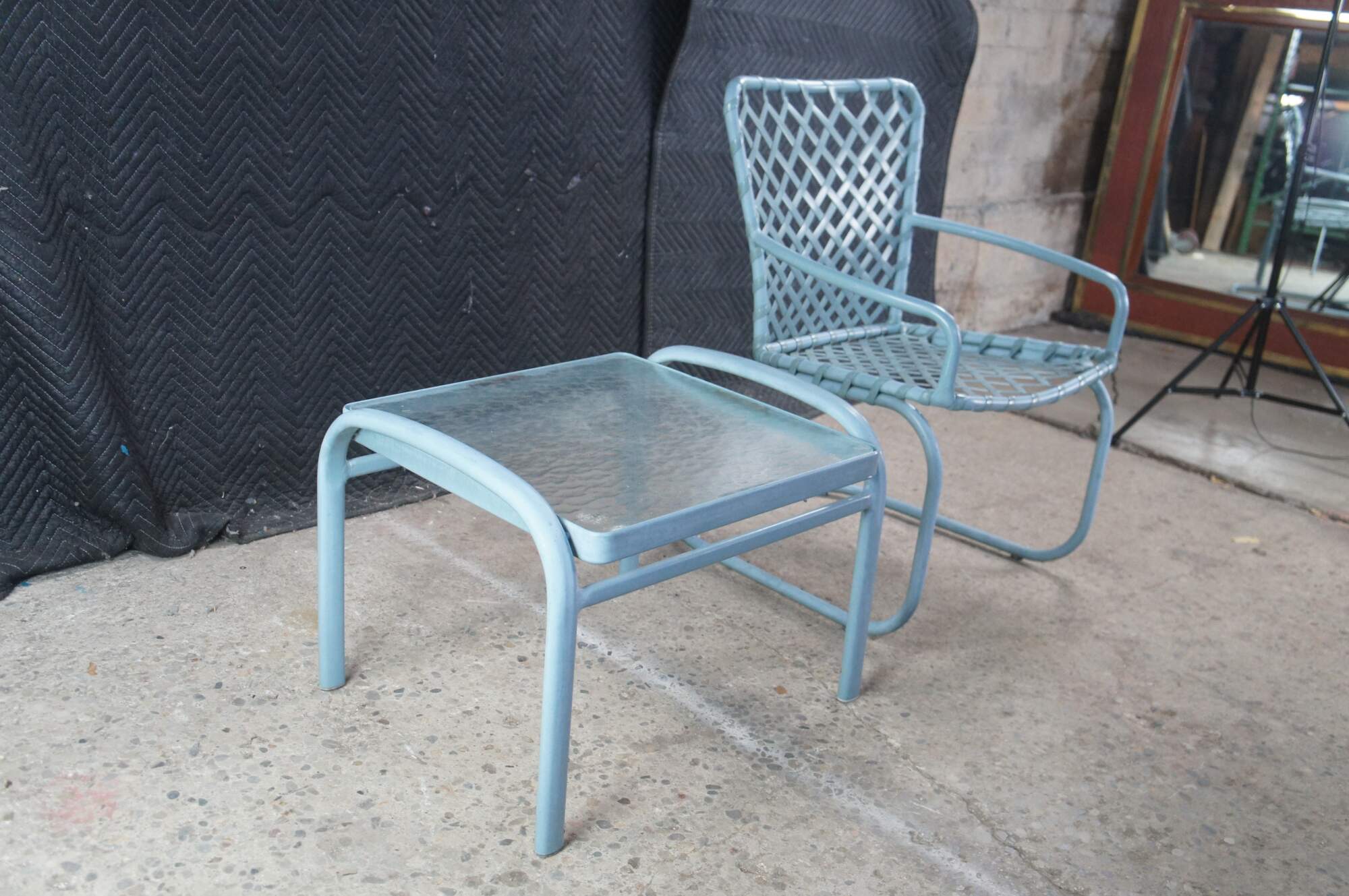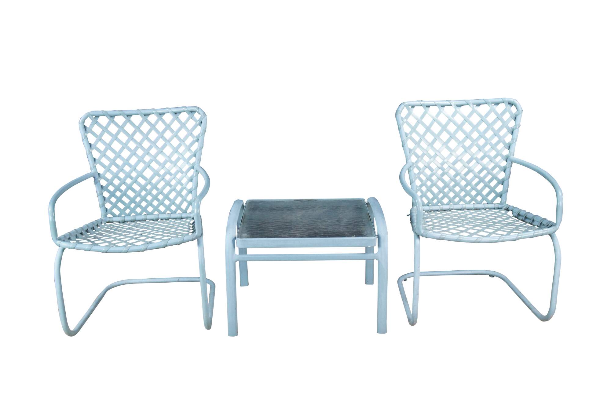 Mid century modern Brown Jordan Tamiami outdoor patio / pool lounge set. Made with sturdy aluminum tube frames and original vinyl lace. Includes two arm chairs and side table with glass top. 752369A.