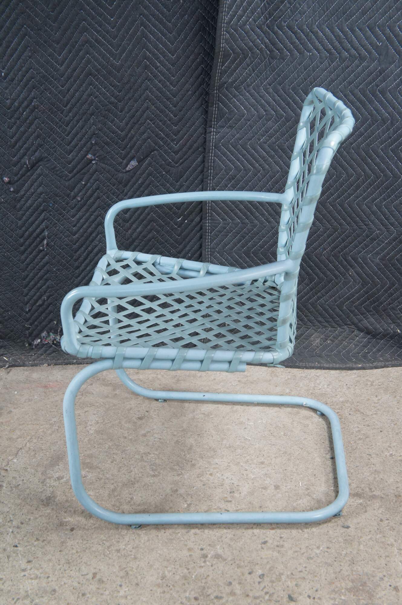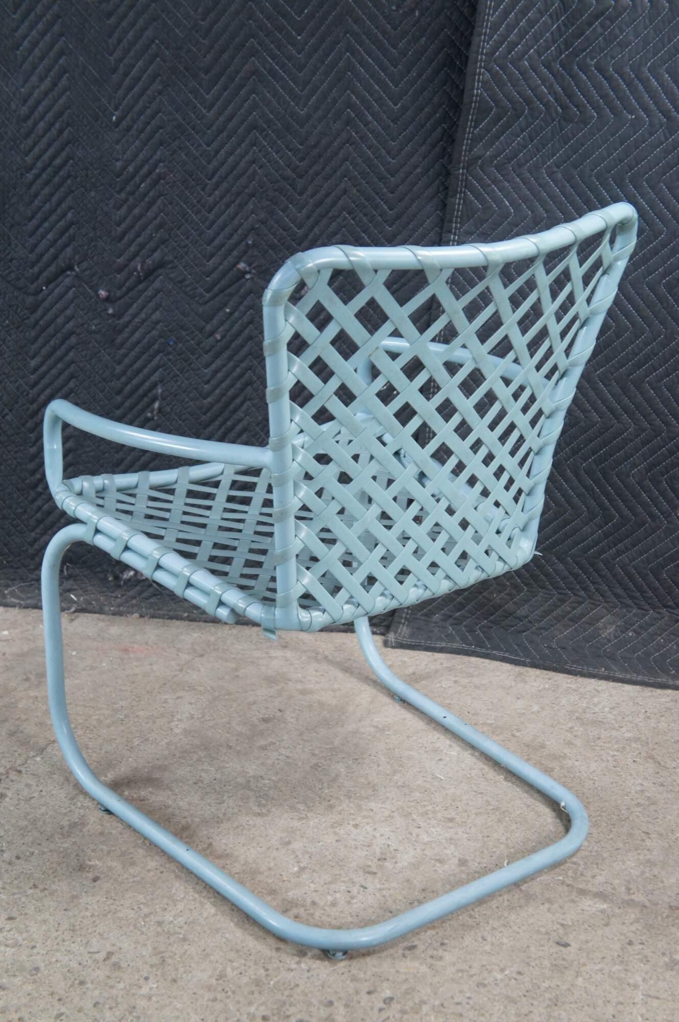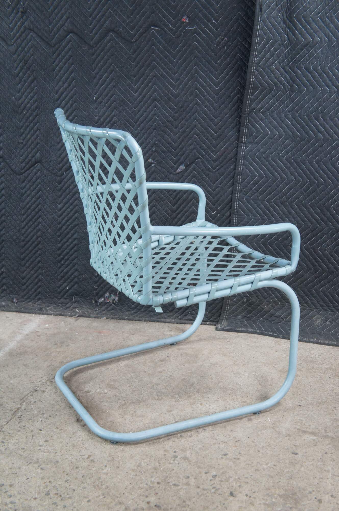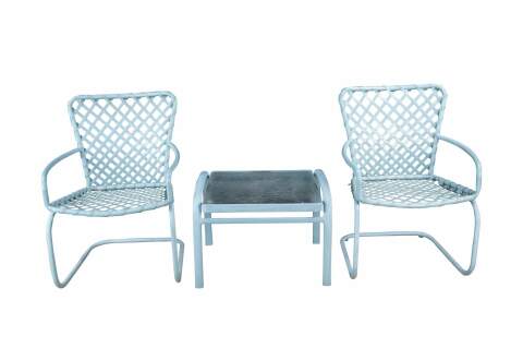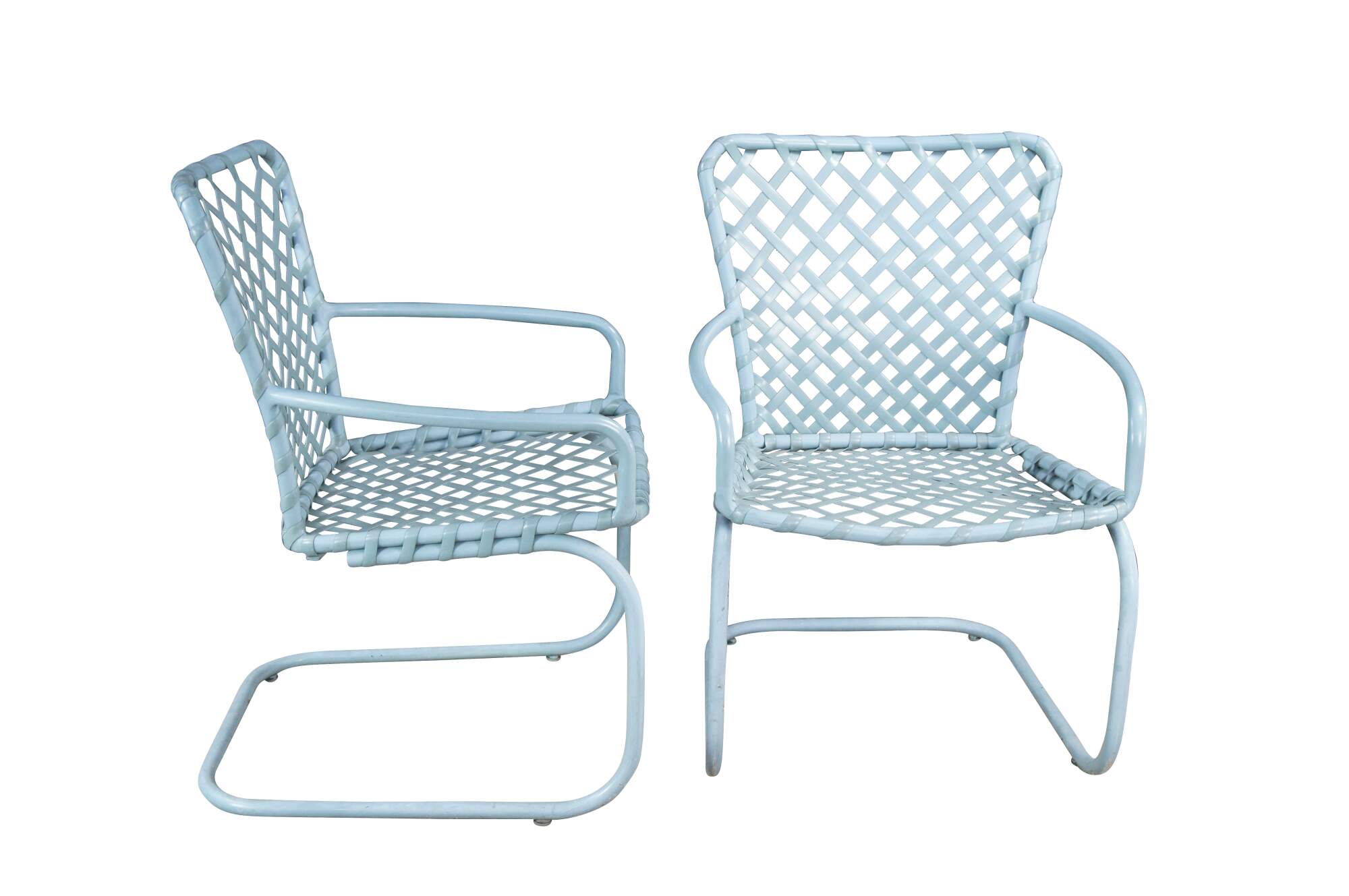 Mid century modern Brown Jordan Tamiami outdoor patio / pool lounge set. Made with sturdy aluminum tube frames and original vinyl lace. Includes two arm chairs and side table with glass top. 752369A.
