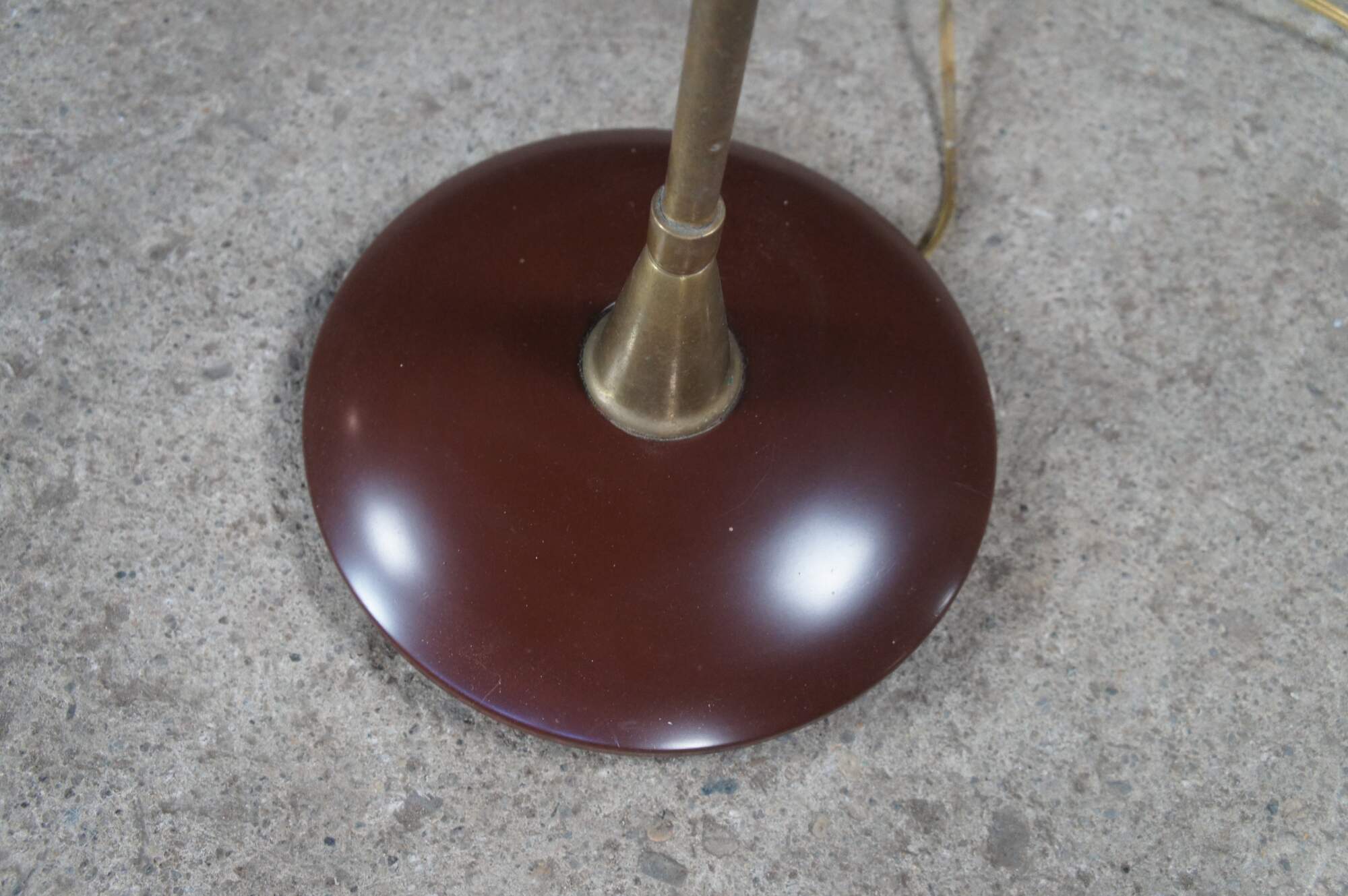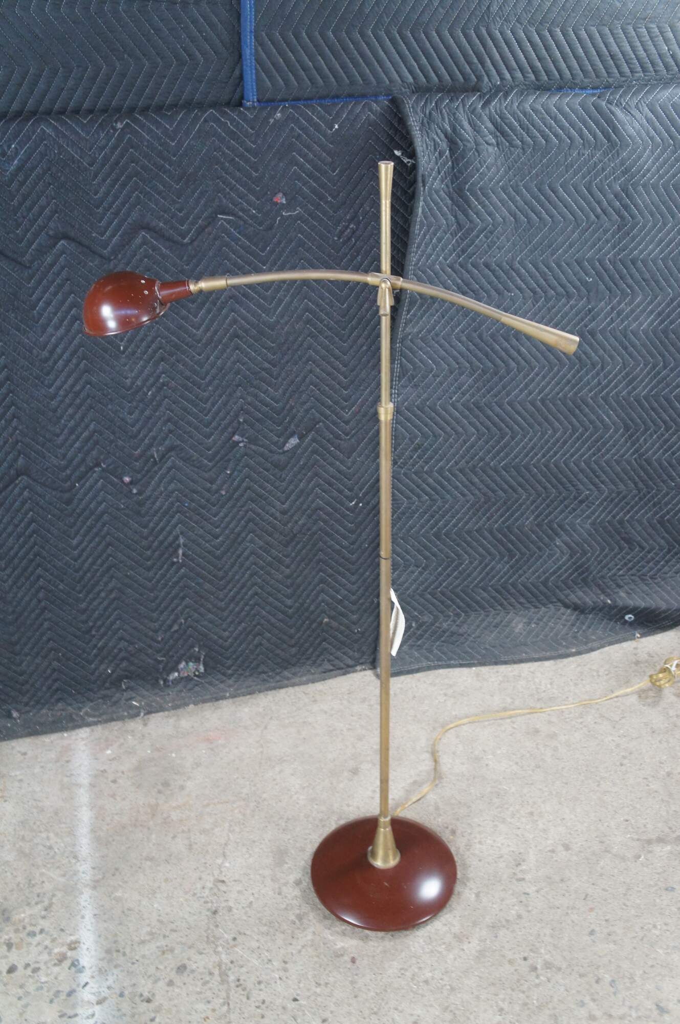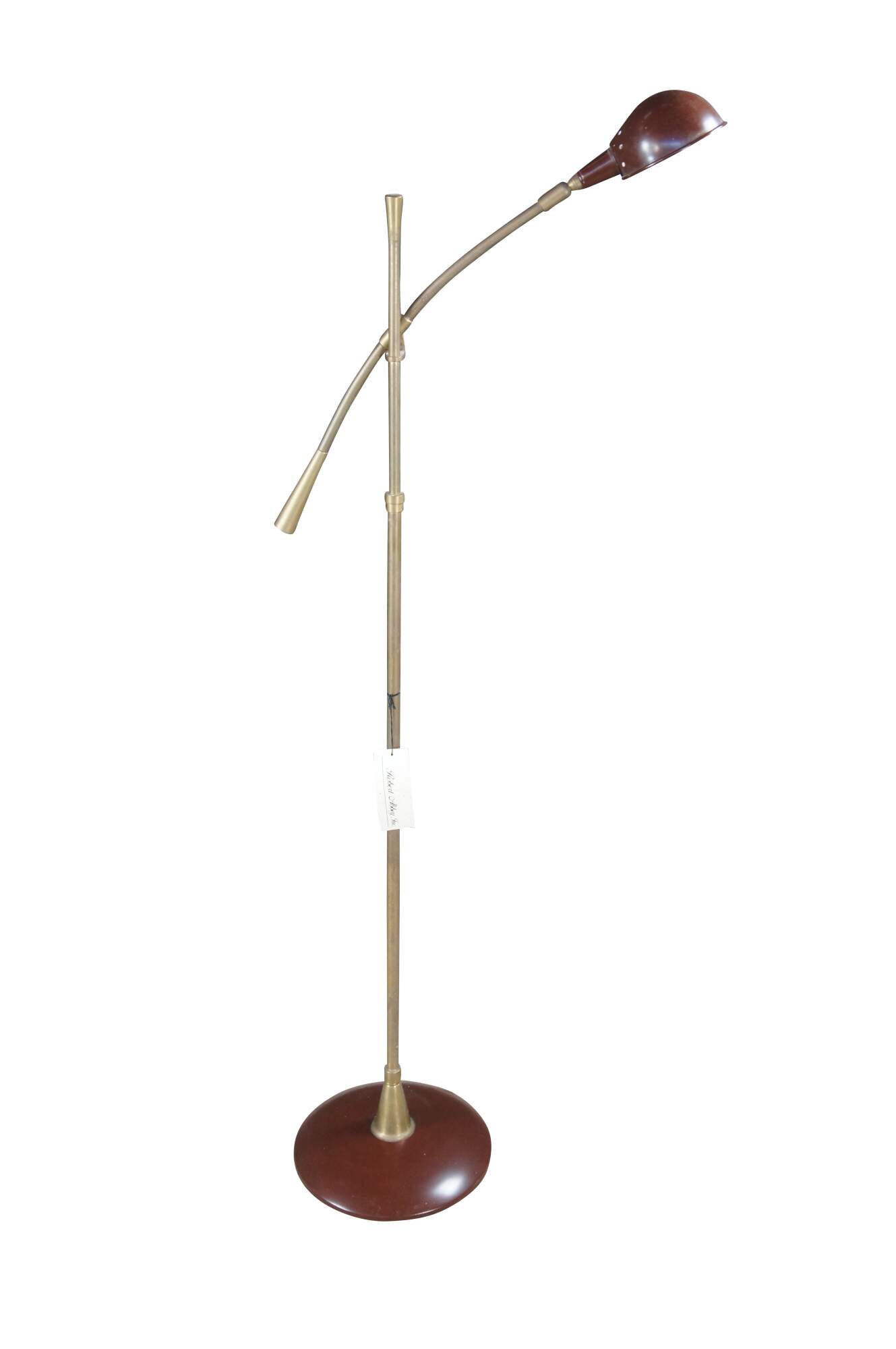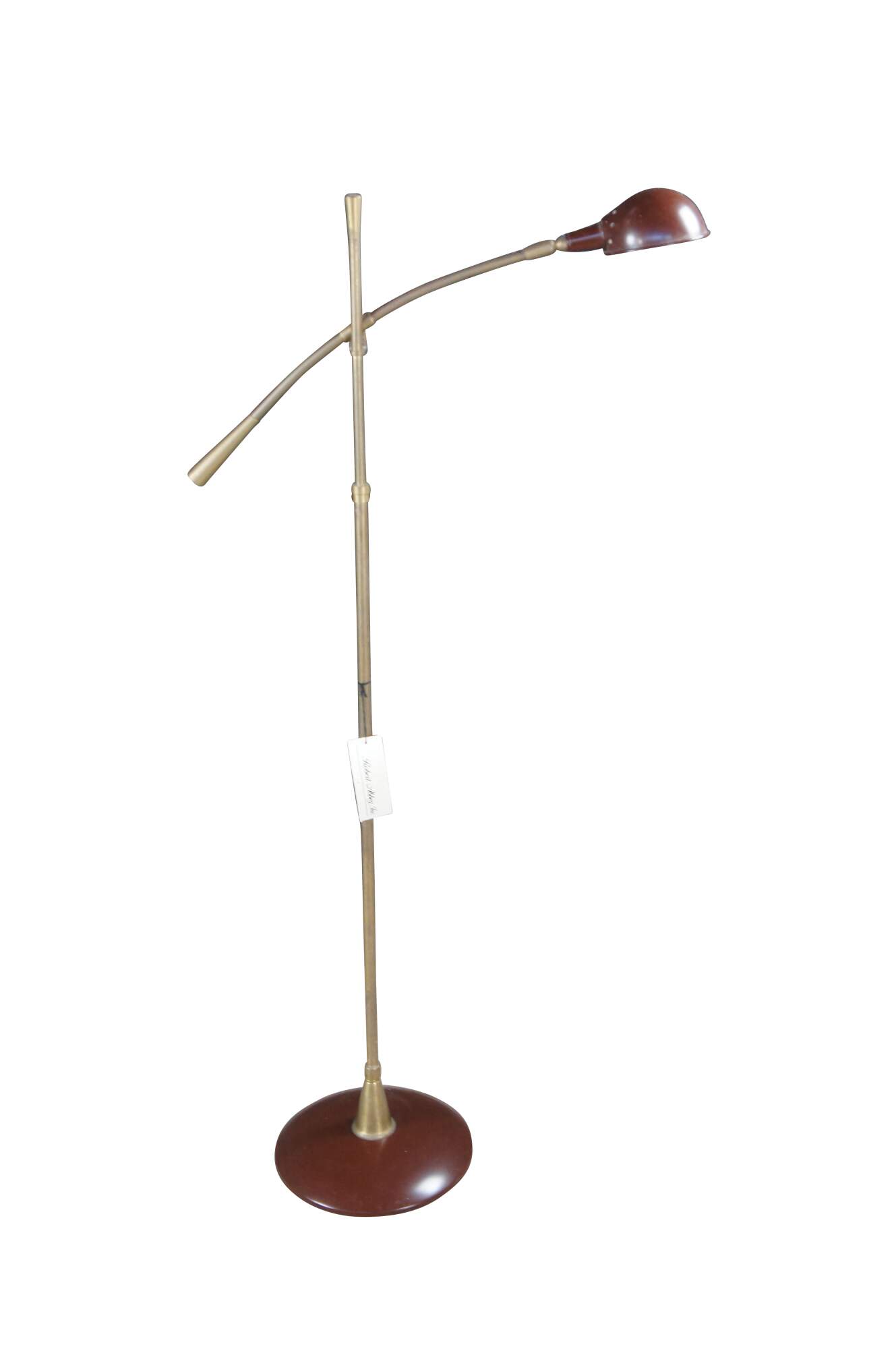 Rare vintage Robert Abbey industrial brass pharmacy / library / reading floor lamp featuring an adjustable swing arm with enameled base and shade.