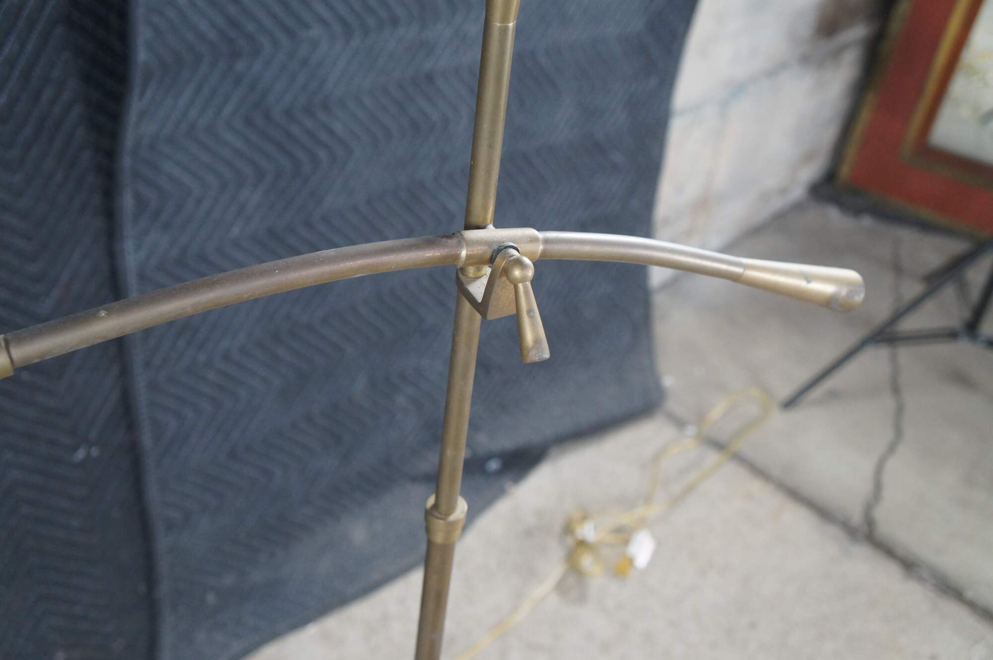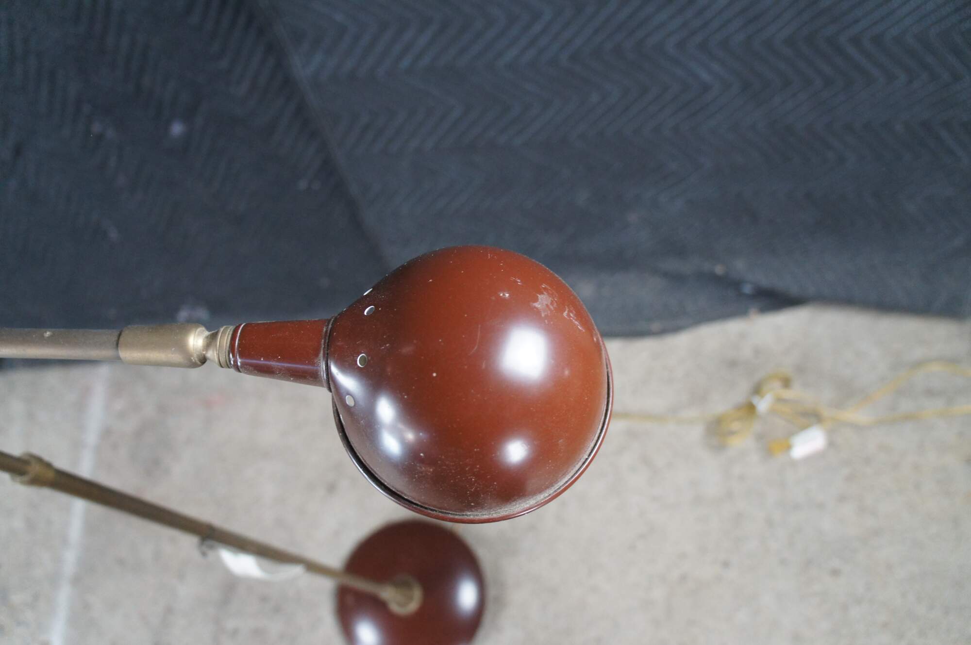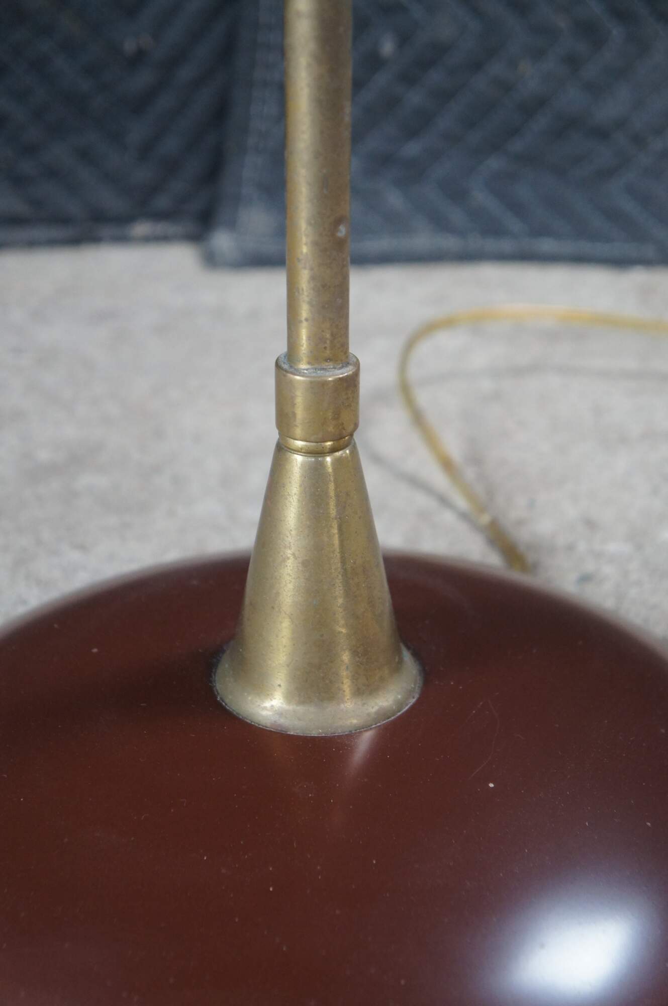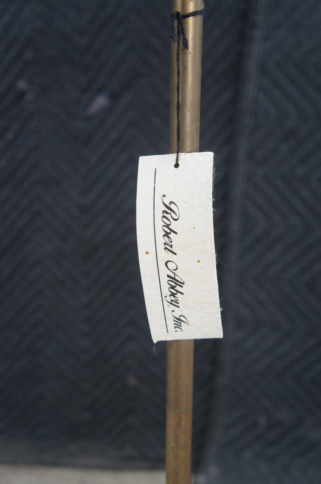 Rare vintage Robert Abbey industrial brass pharmacy / library / reading floor lamp featuring an adjustable swing arm with enameled base and shade.