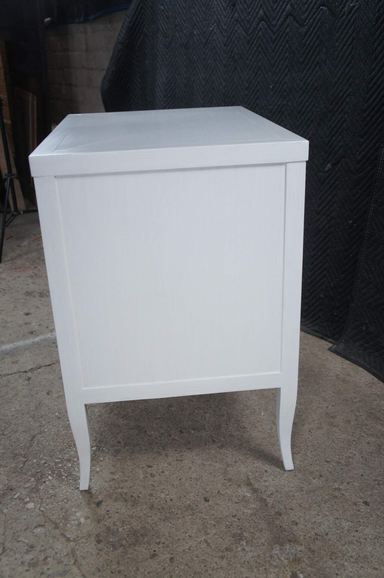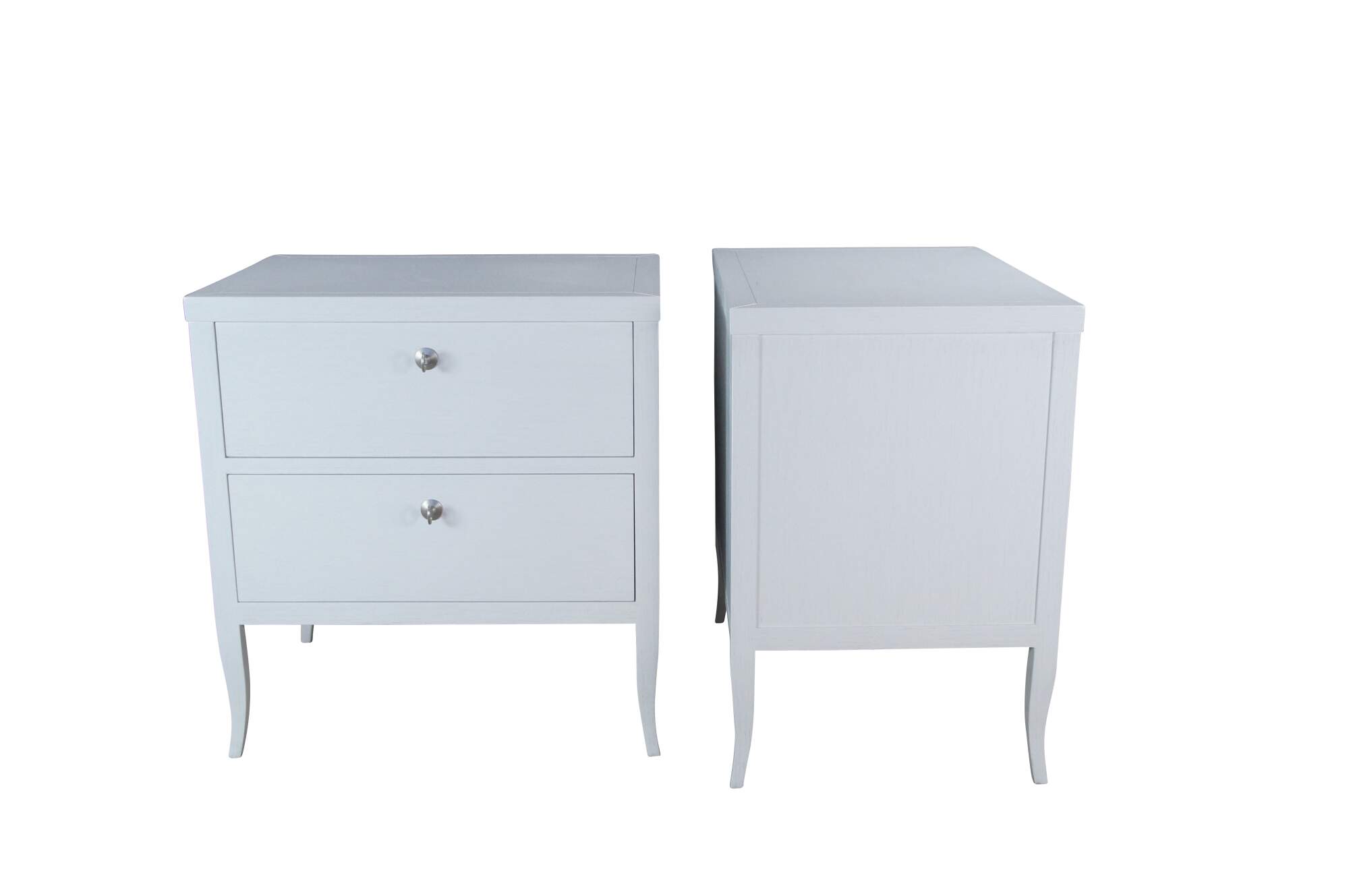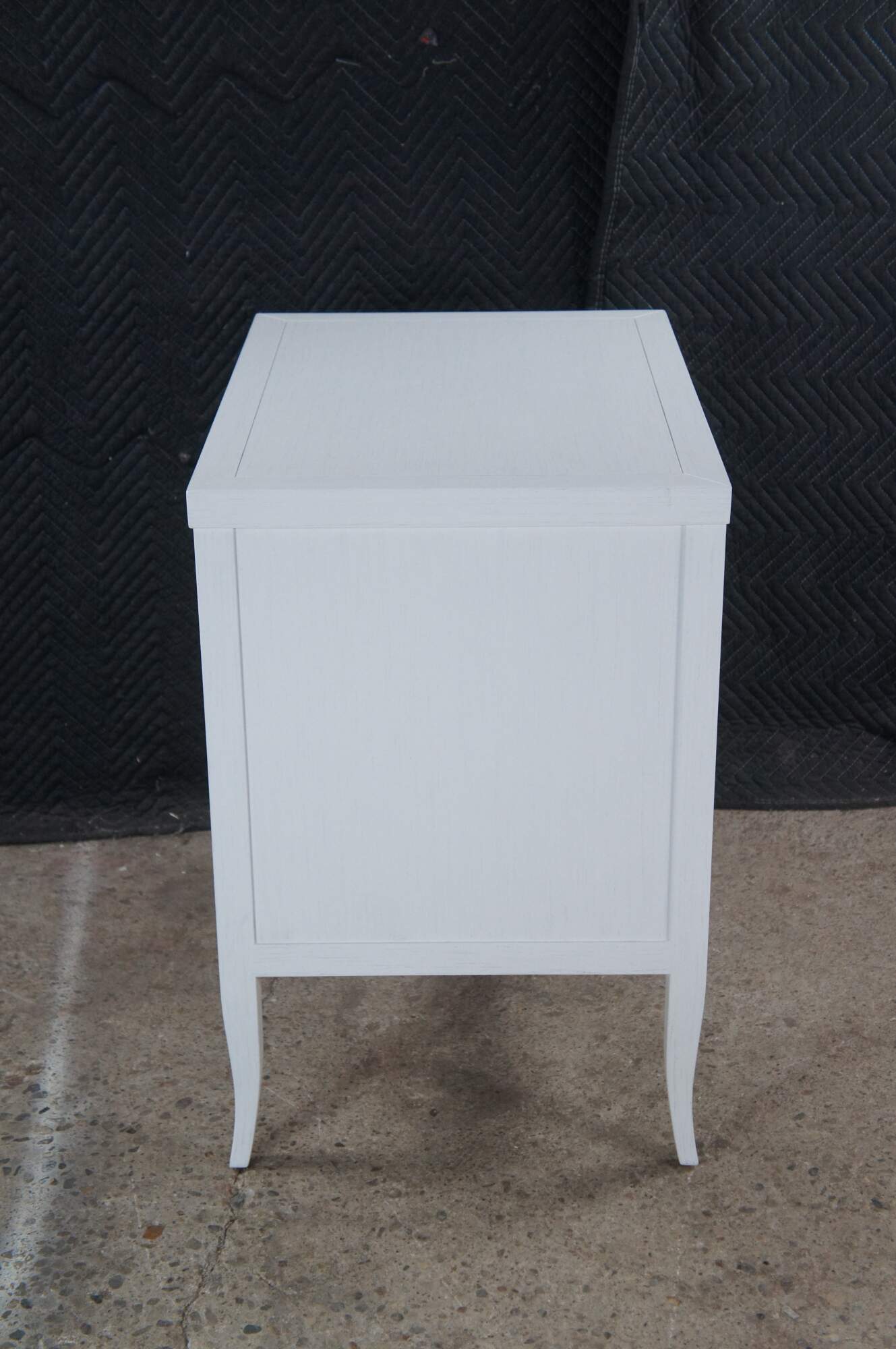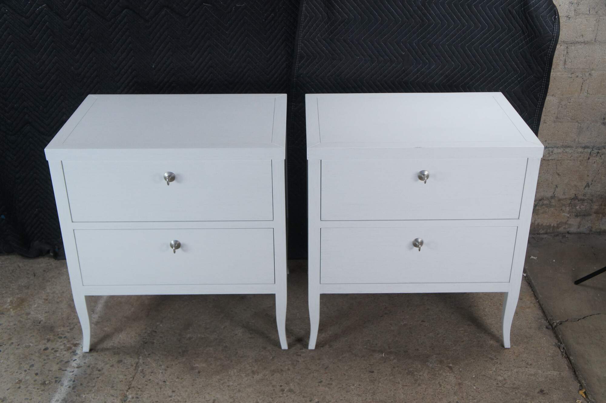 Two vintage Tobi Fairley for Woodbridge Furniture Petite Sarah Bedside Chests. Finish number 62, Carrara white, TF407-62. A lovely handy storage chest ideal for bedside is inspired by 18th century French originals. A rectangular framed top is elevated by squared posts flanking a pair of ample storage drawers.