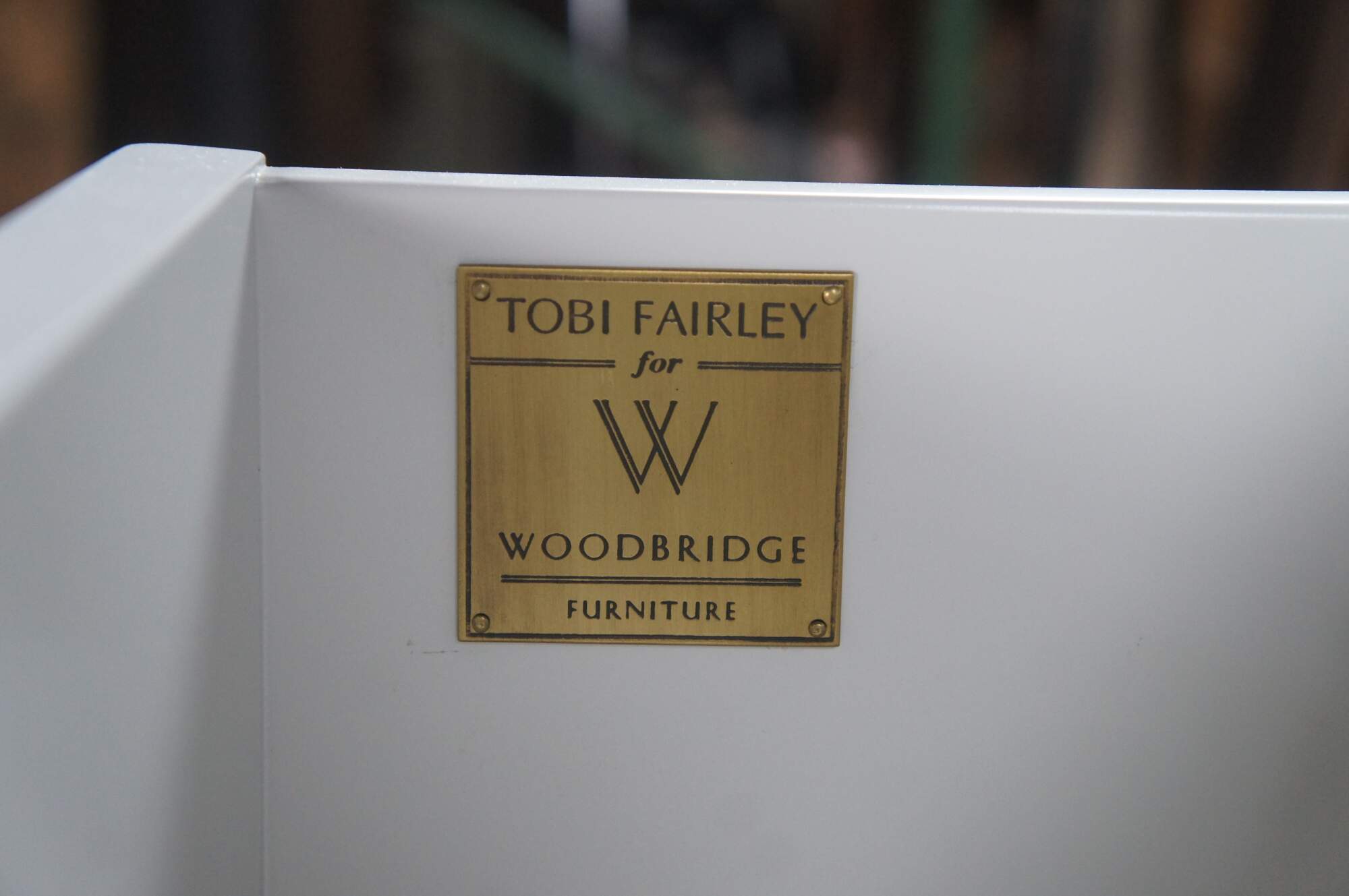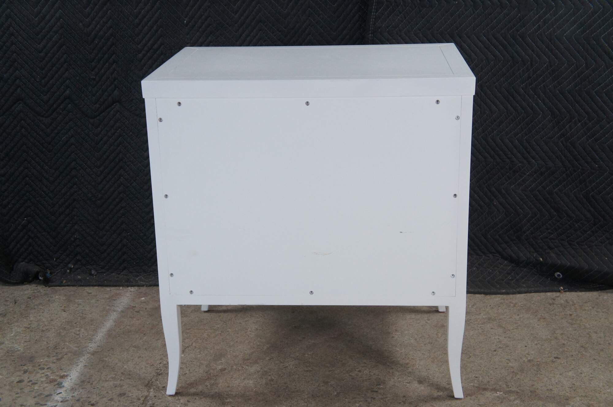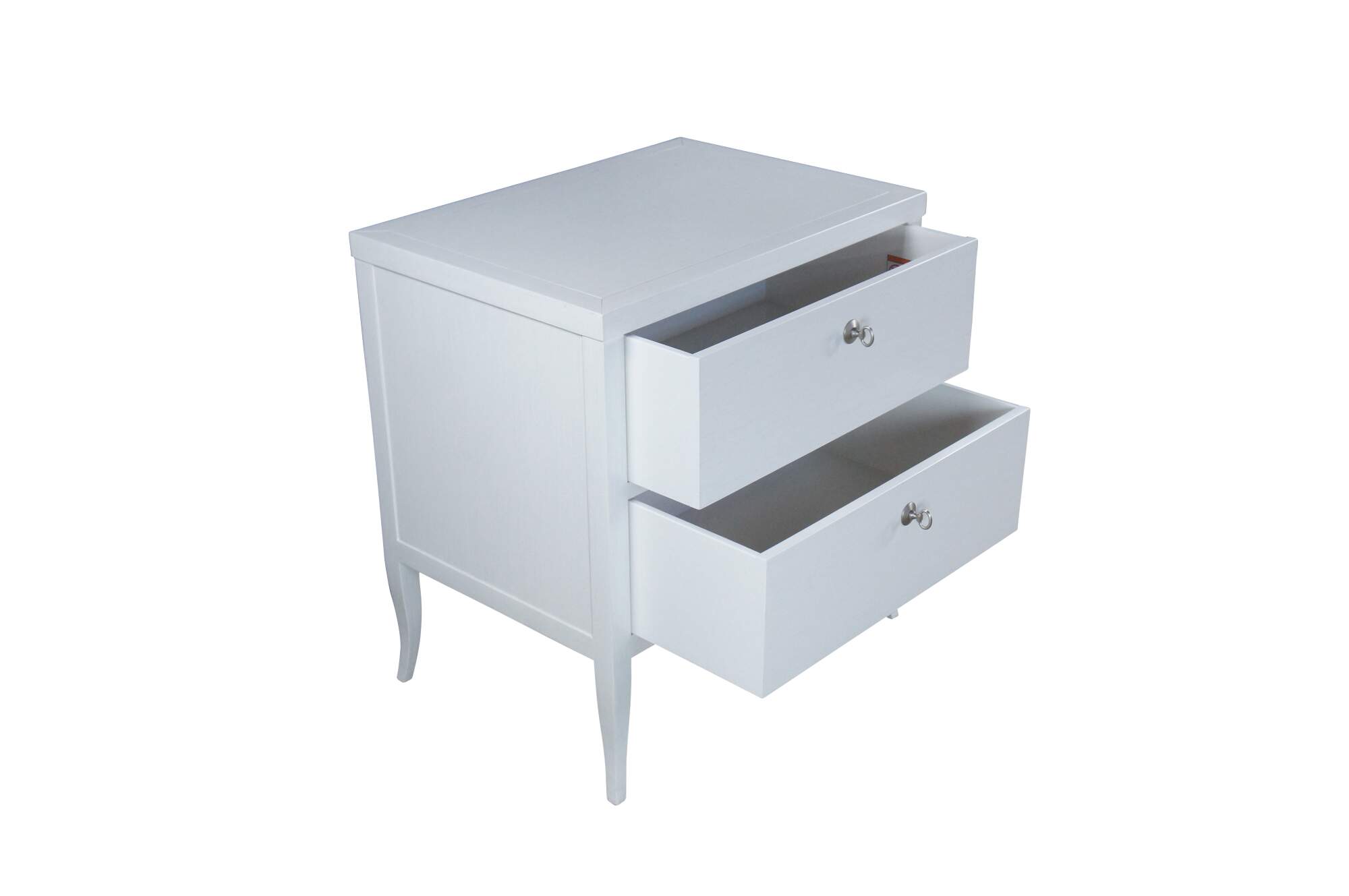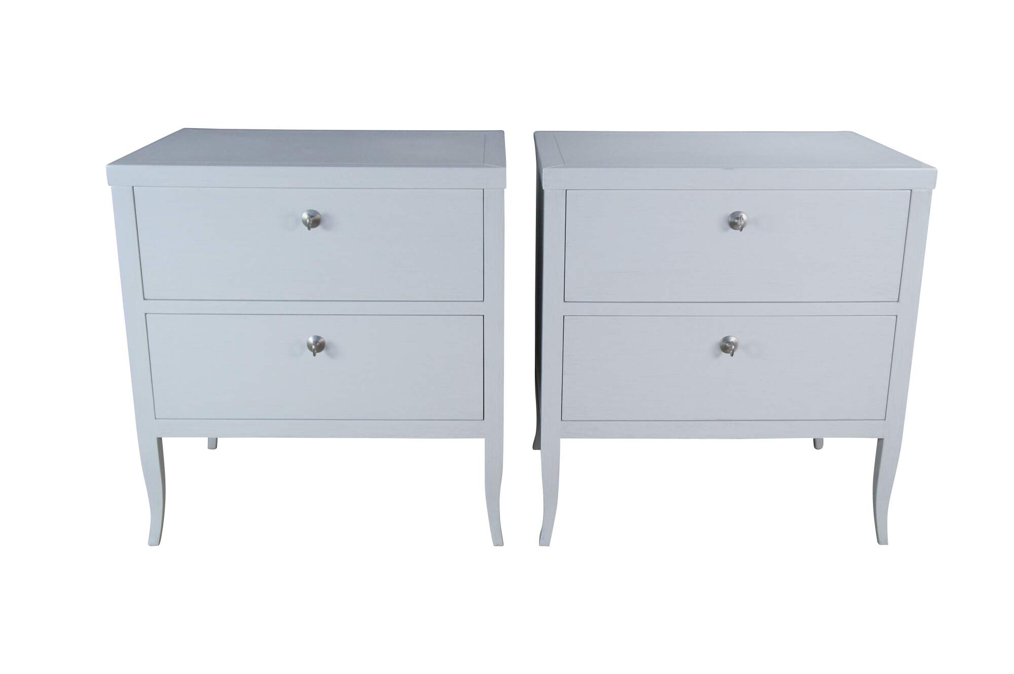 Two vintage Tobi Fairley for Woodbridge Furniture Petite Sarah Bedside Chests. Finish number 62, Carrara white, TF407-62. A lovely handy storage chest ideal for bedside is inspired by 18th century French originals. A rectangular framed top is elevated by squared posts flanking a pair of ample storage drawers.
