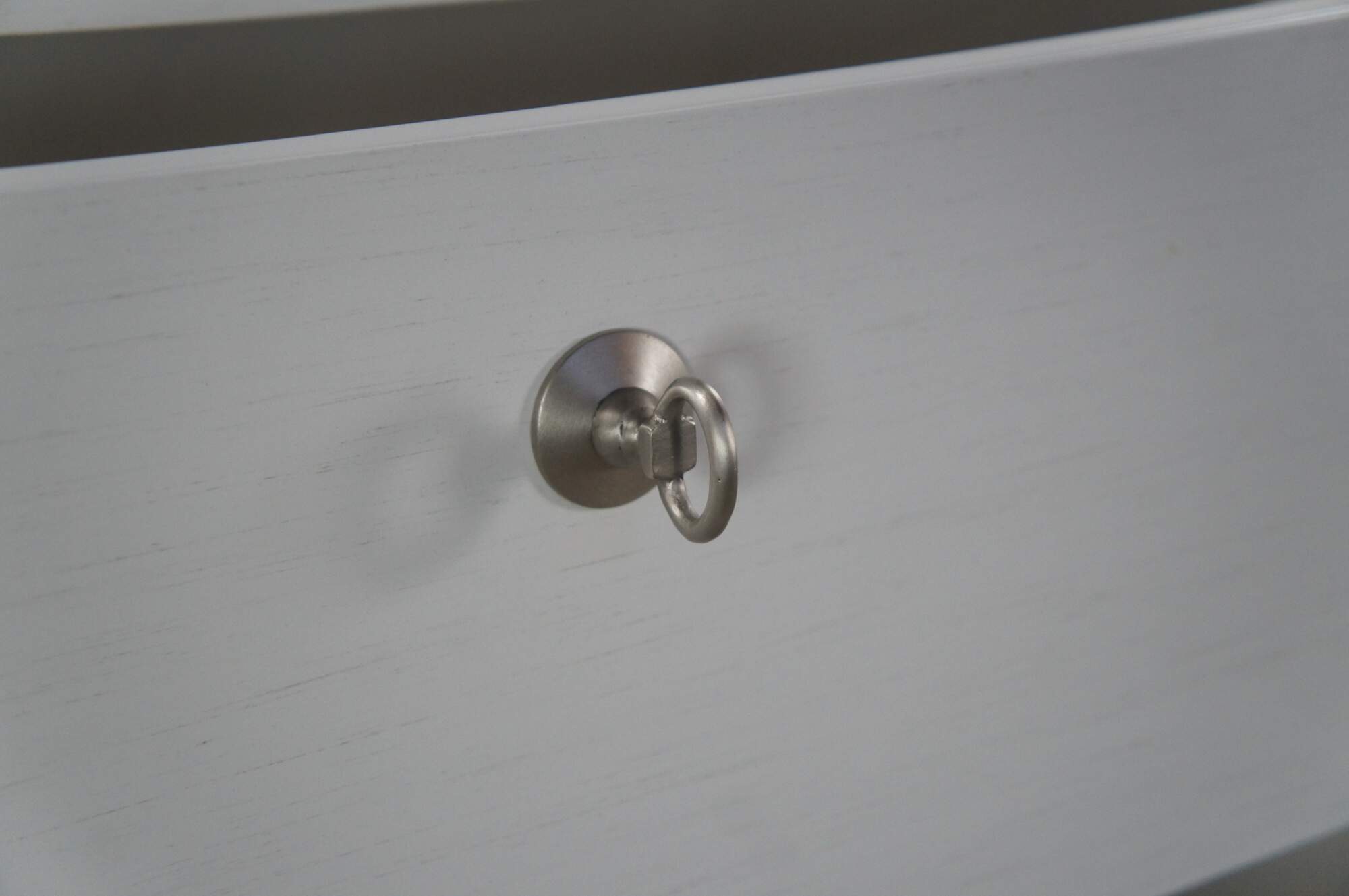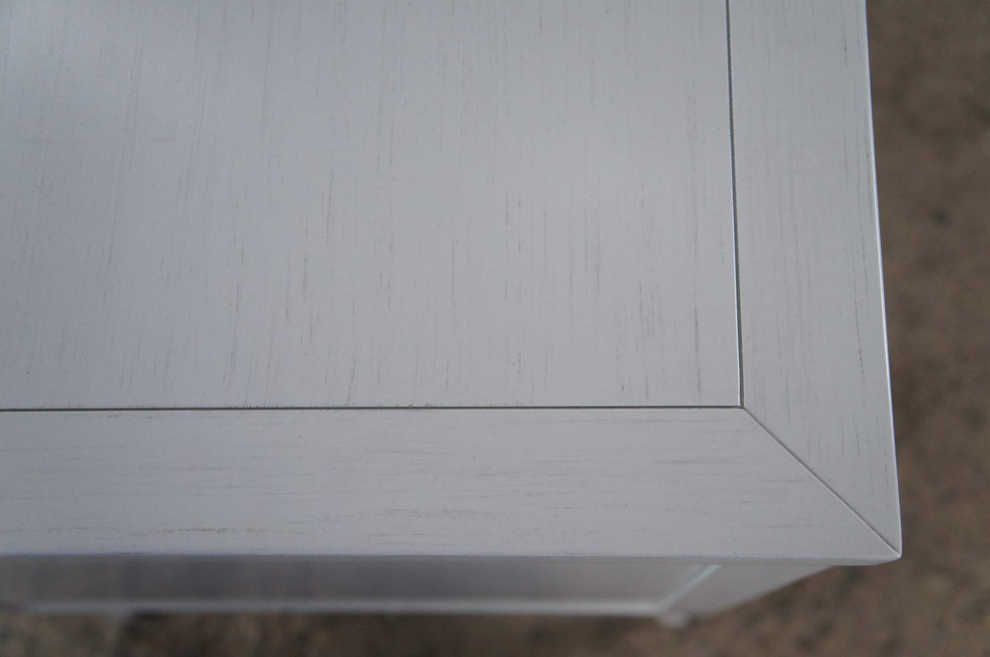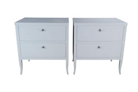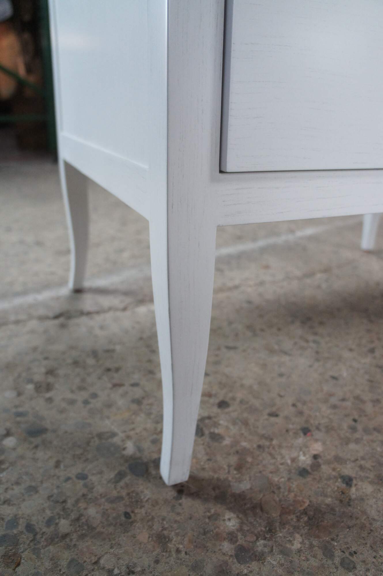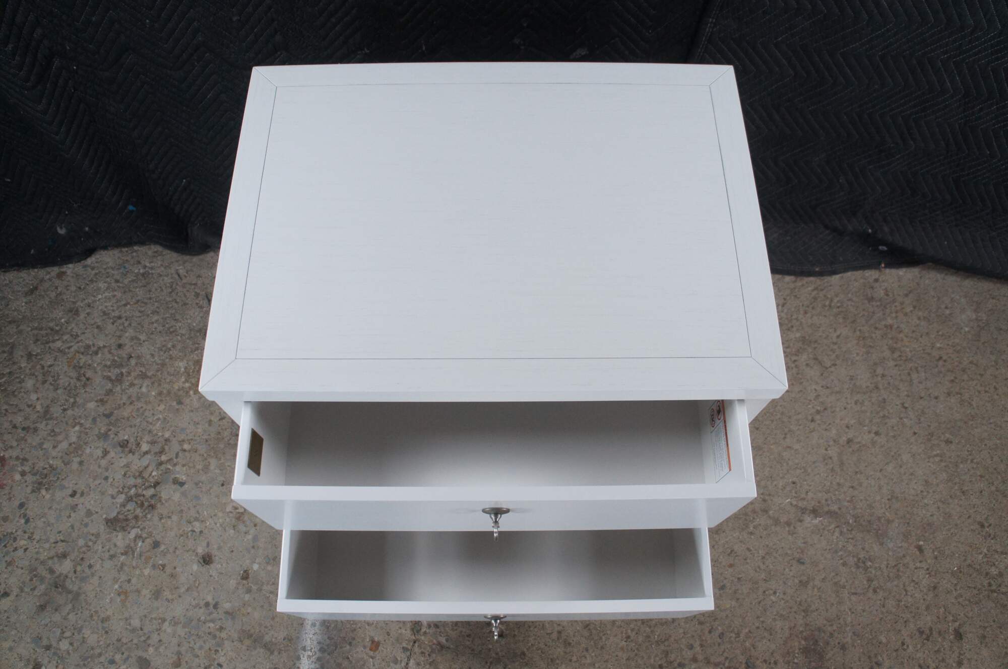 Two vintage Tobi Fairley for Woodbridge Furniture Petite Sarah Bedside Chests. Finish number 62, Carrara white, TF407-62. A lovely handy storage chest ideal for bedside is inspired by 18th century French originals. A rectangular framed top is elevated by squared posts flanking a pair of ample storage drawers.