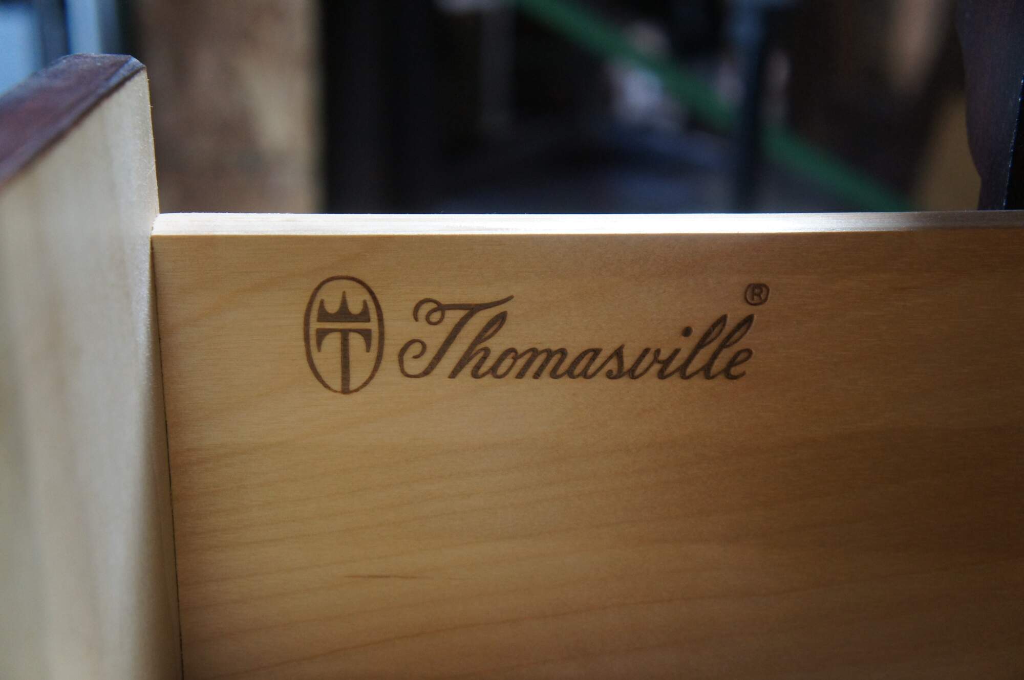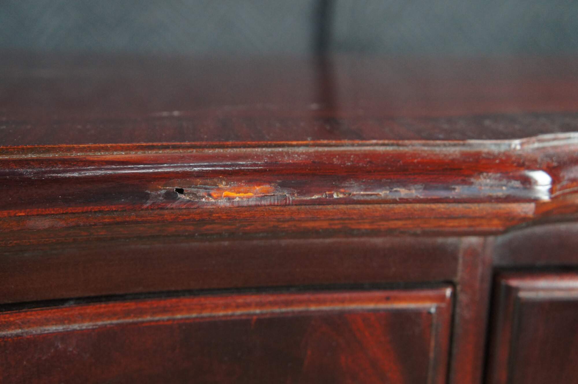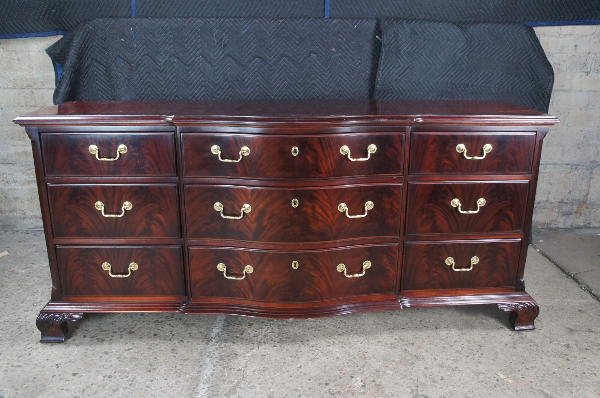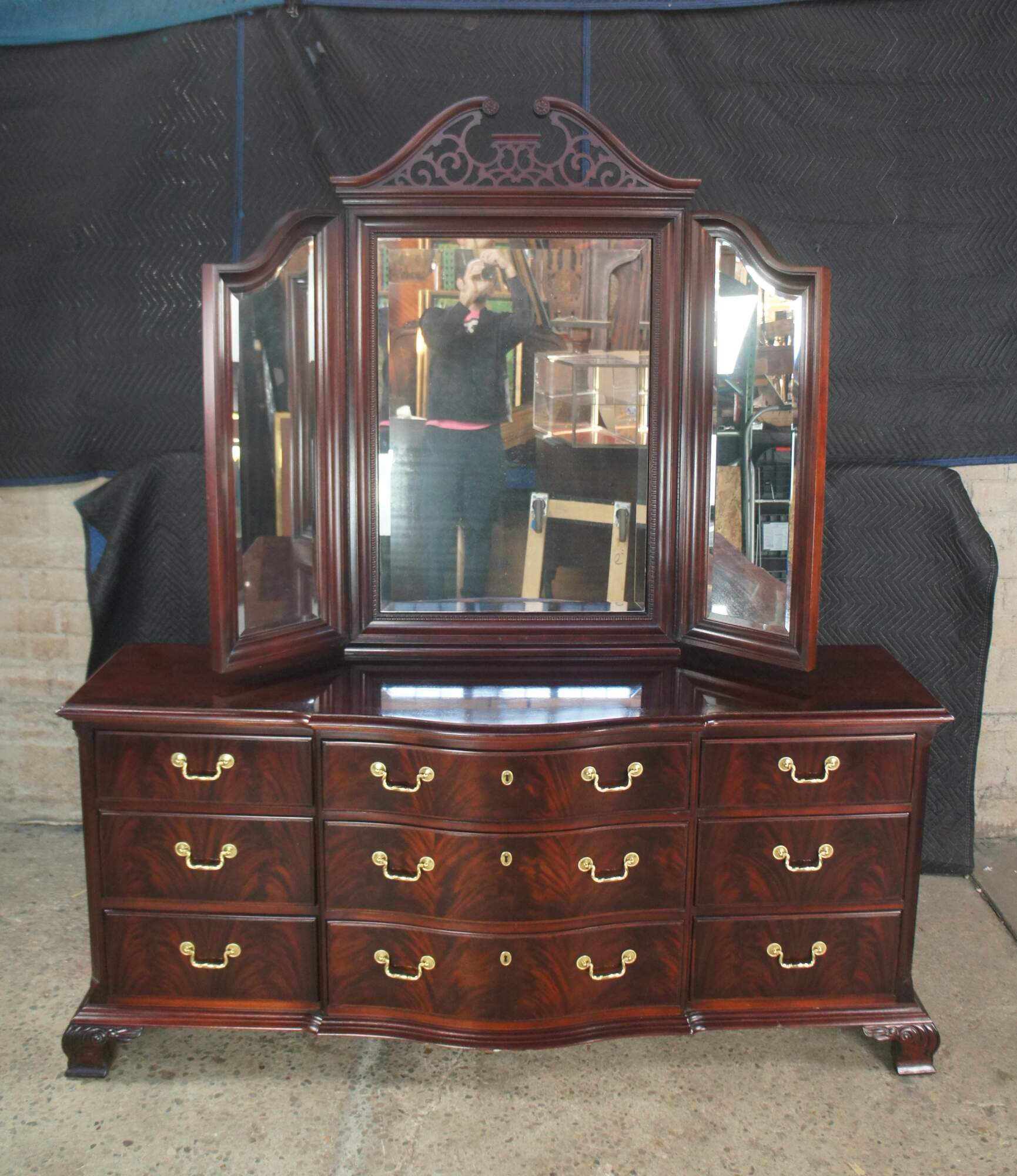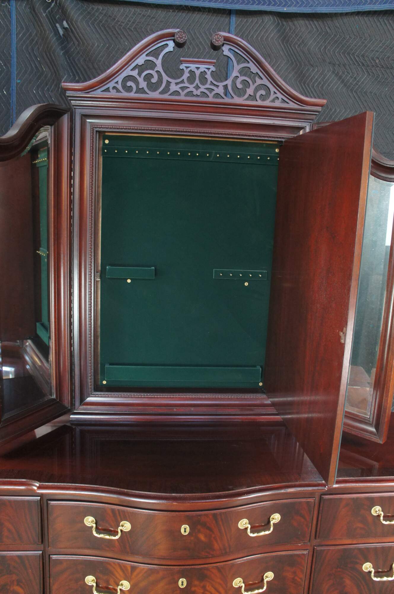 Vintage Thomasville 18th century collection flame mahogany nine drawer bow front dresser with trifold mirror and hidden jewelry storage. The central mirror opens to reveal storage.